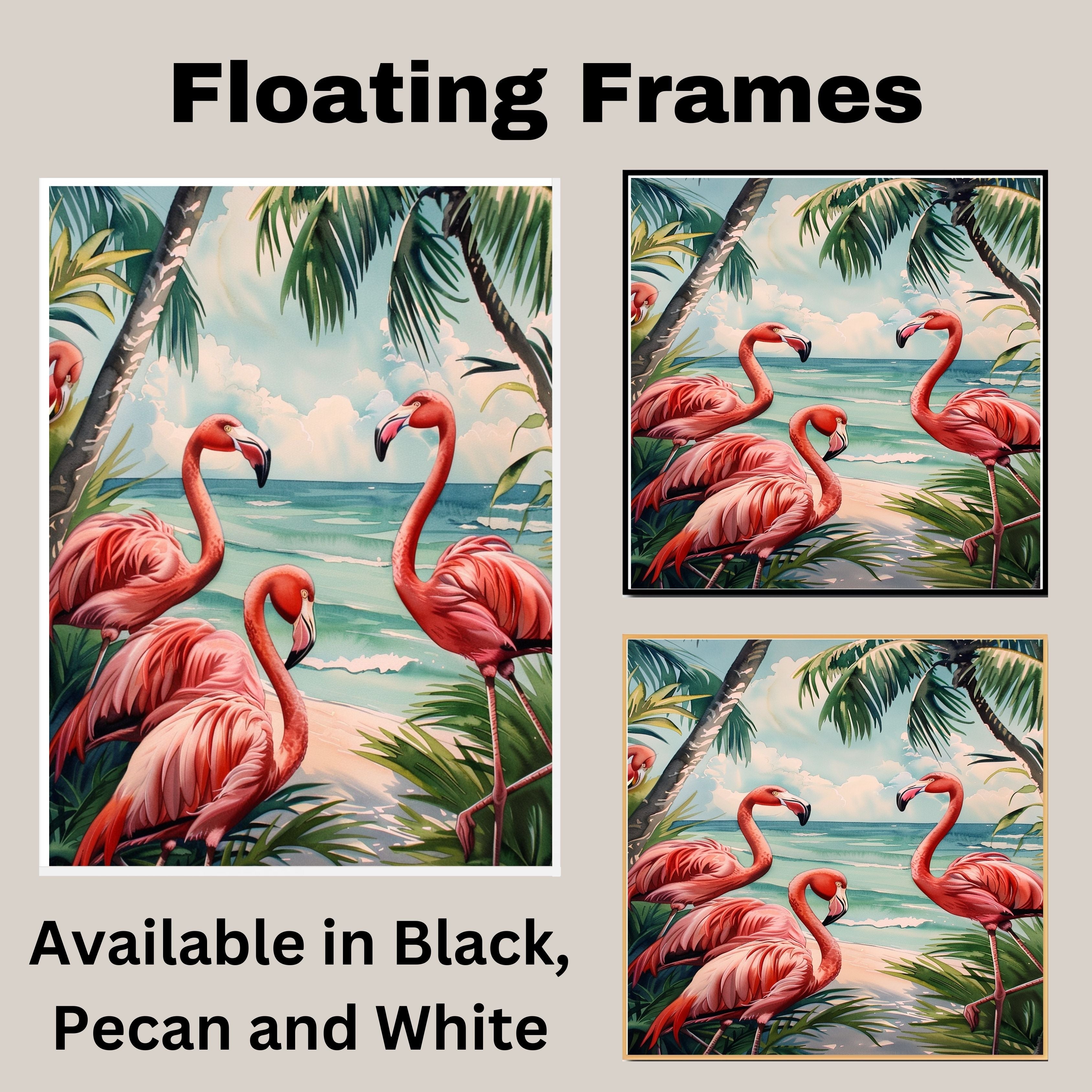 1.5" Thick Floating Framed Canvas: Available in Black, Pecan, and White Grain. Durable shrink-resistant frame. Comes with easy-to-install hanging kits, ready for immediate display.