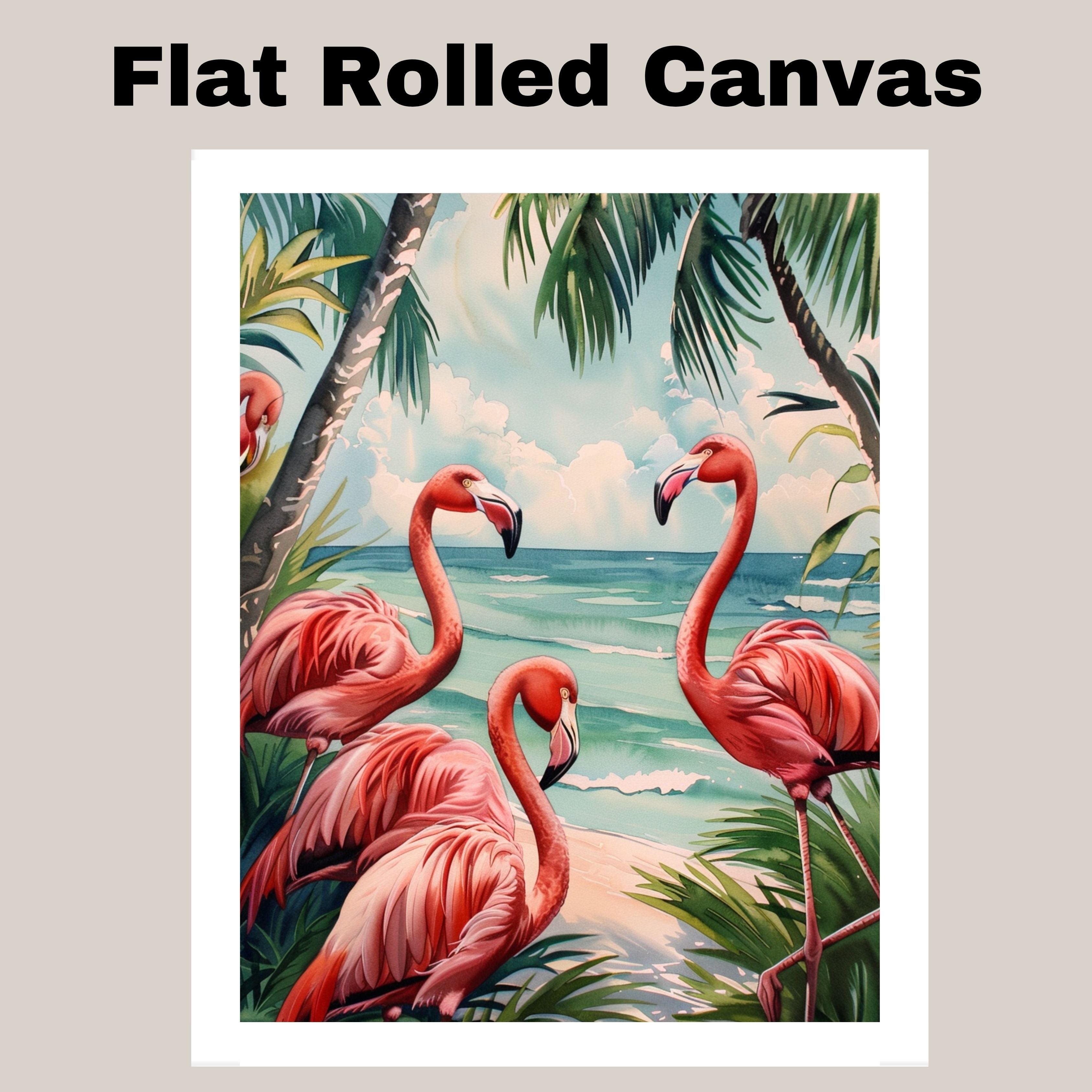 Tropical Flamingos on Beach with Palm Trees and Ocean Waves in Watercolor Illustration Art Print on Ready to Hang 1.5" Thick Canvas Wrap, Floating Framed Canvas, Flat Rolled Canvas