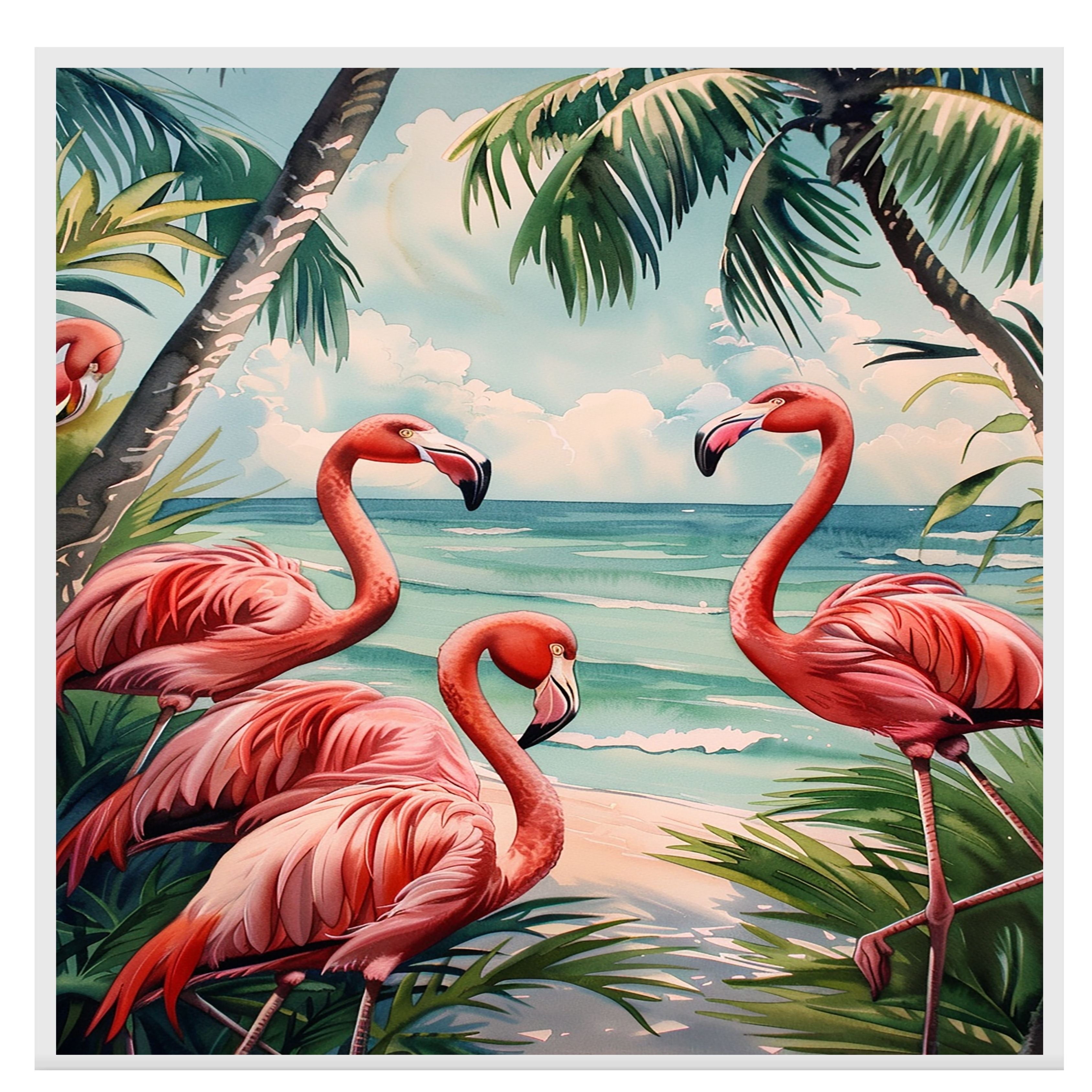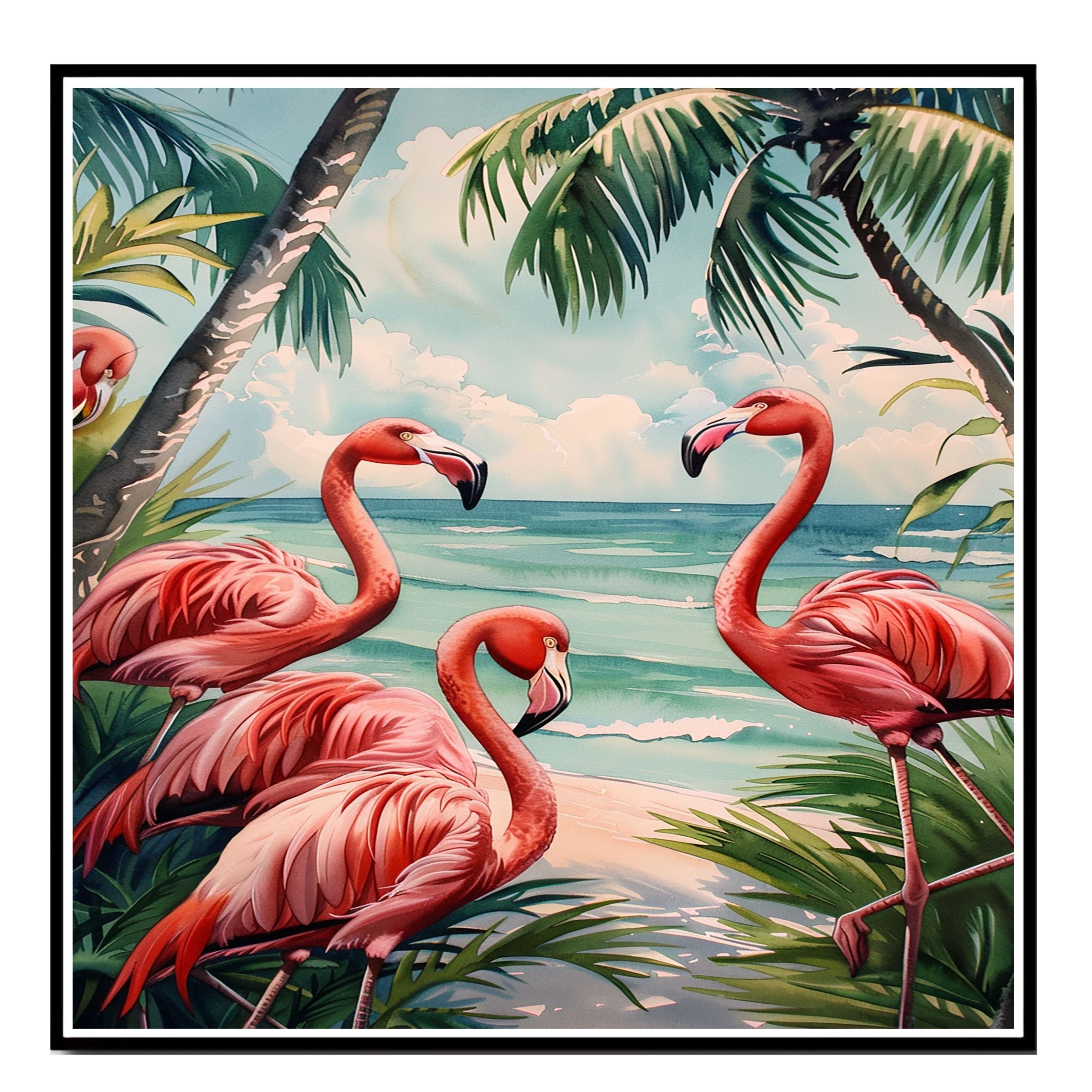 Capture the serene beauty of the tropics with this stunning watercolor art of pink flamingos by the ocean, surrounded by lush palm trees. This beach-inspired illustration brings a vibrant and exotic touch to any room, perfect for lovers of nature and coastal scenes.