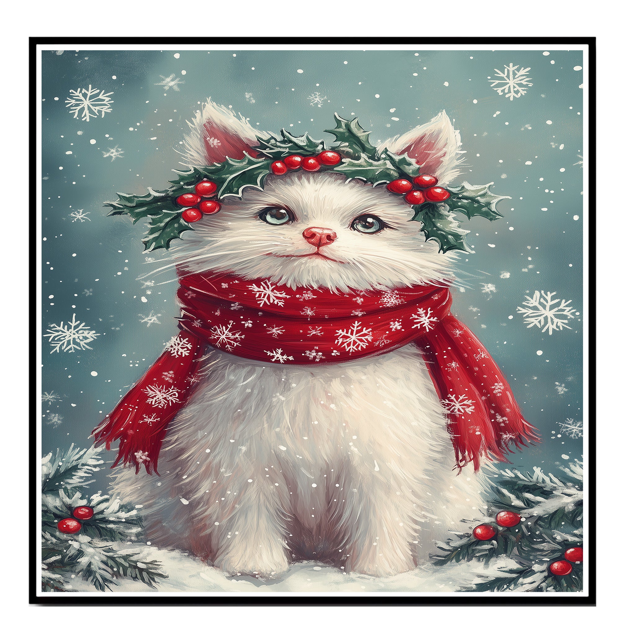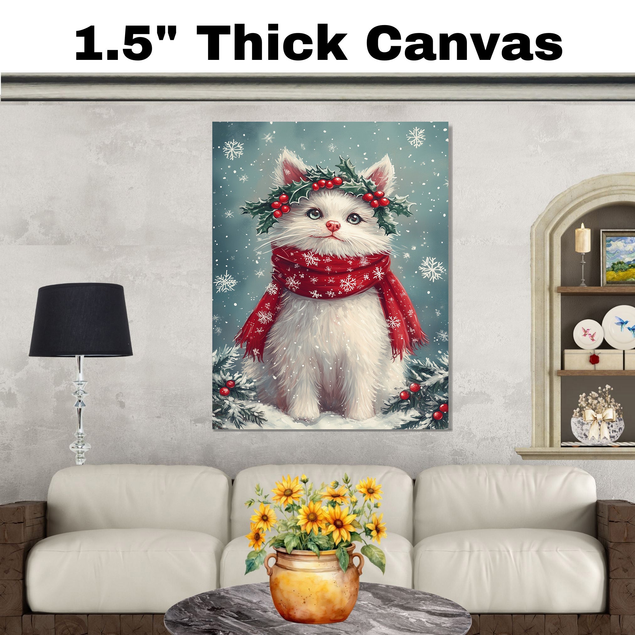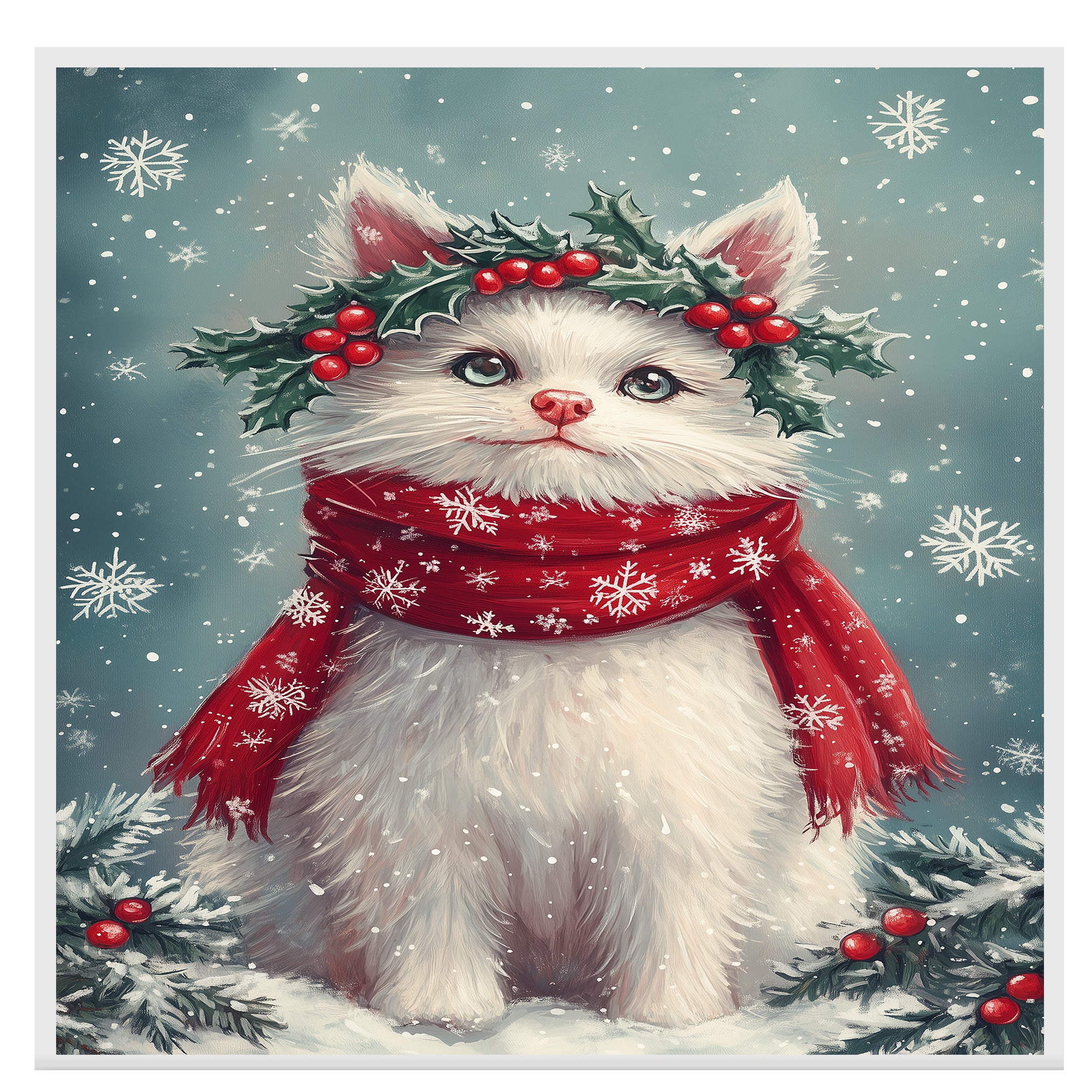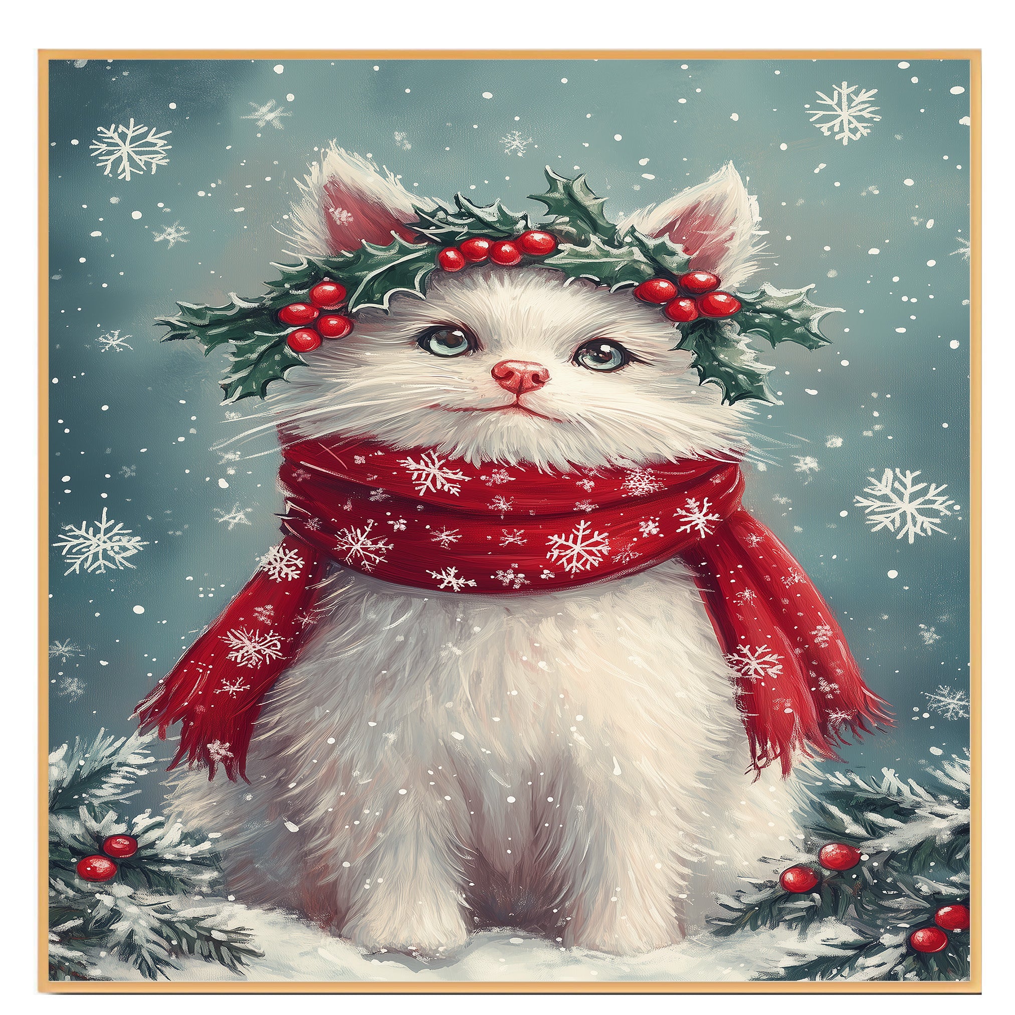 Turkish Angora Cat Christmas Wall Art with Red Scarf and Holly Wreath for Winter Snow Festive Puppy Holiday Artwork on Flat Rolled, Framed or Wrapped Canvas