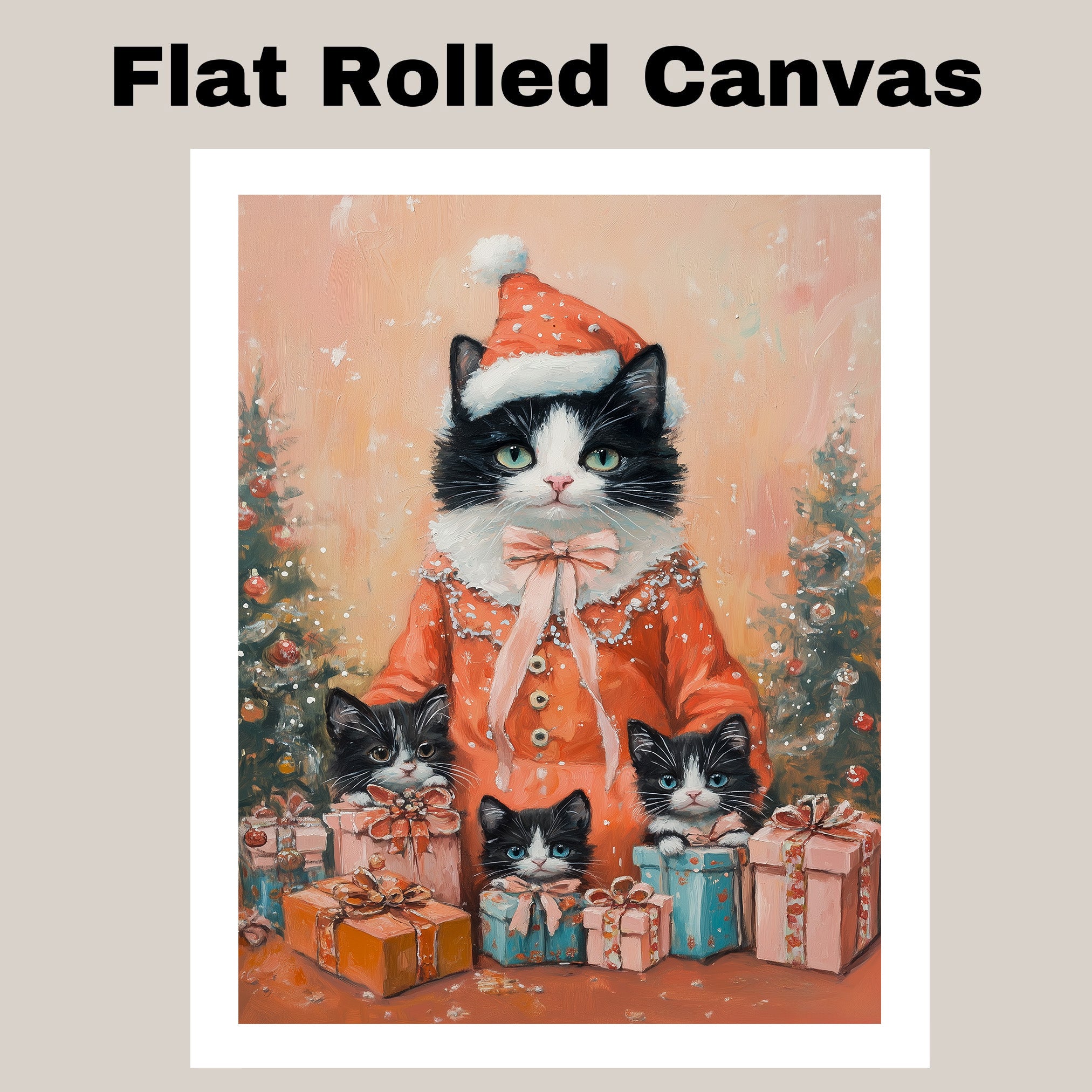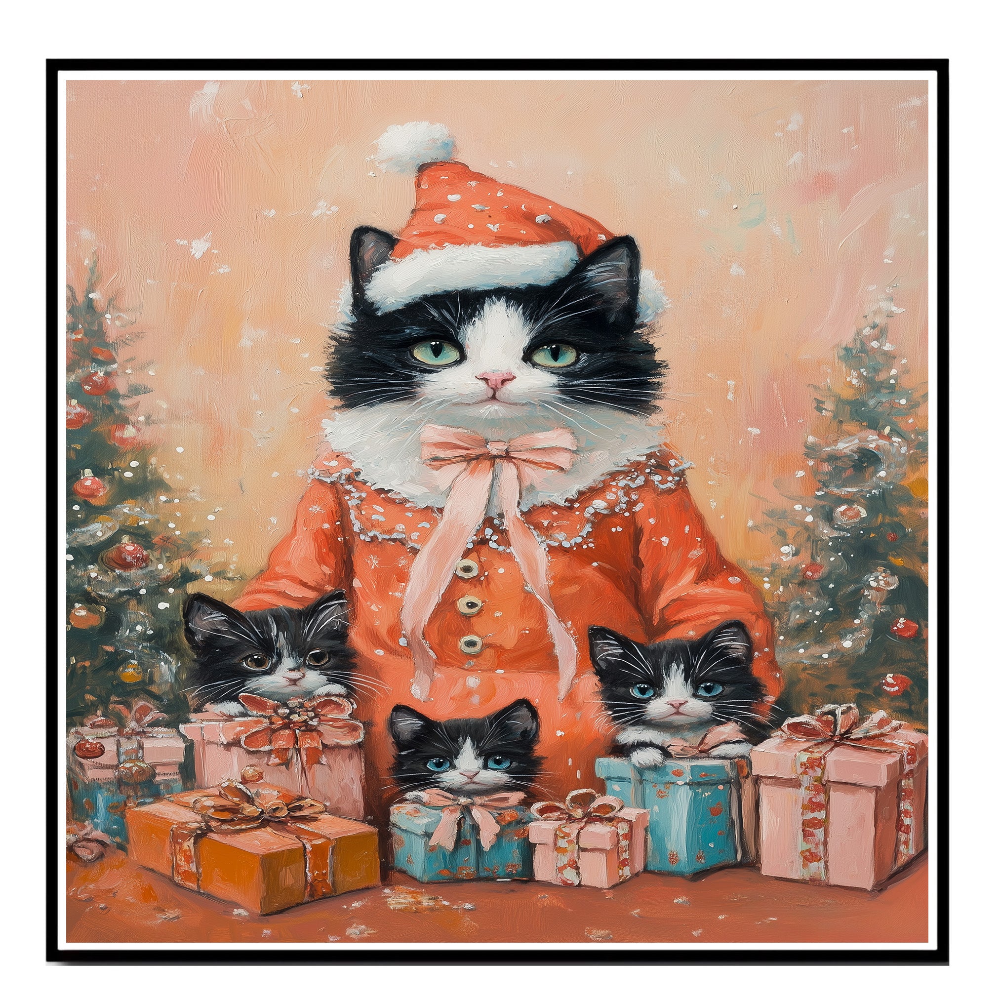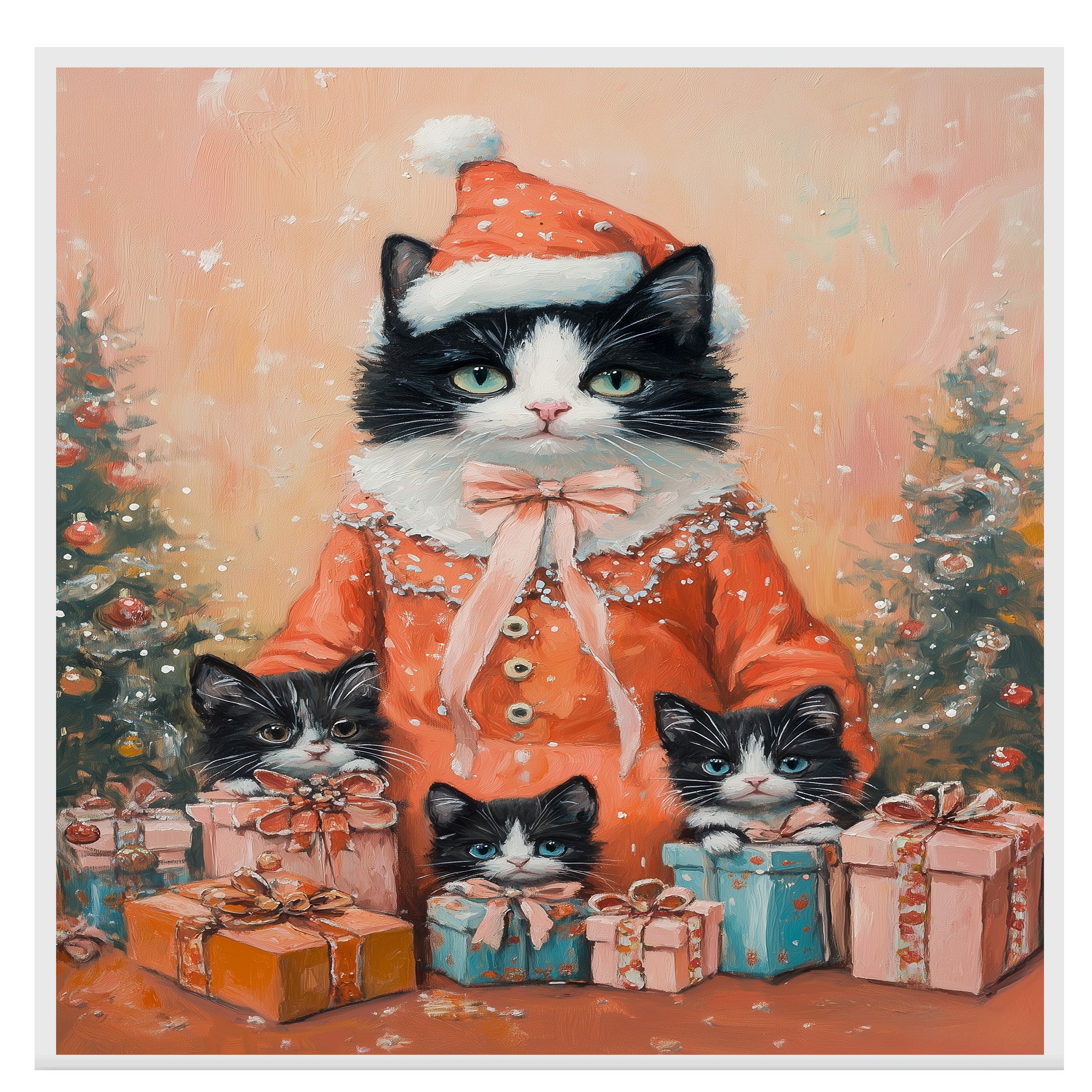 Add a soft and cozy charm to your holiday decor with this heartwarming artwork of a tuxedo cat family dressed in matching lavender pajamas. Surrounded by Christmas trees and presents, this scene is ideal for cat lovers and festive winter spaces.