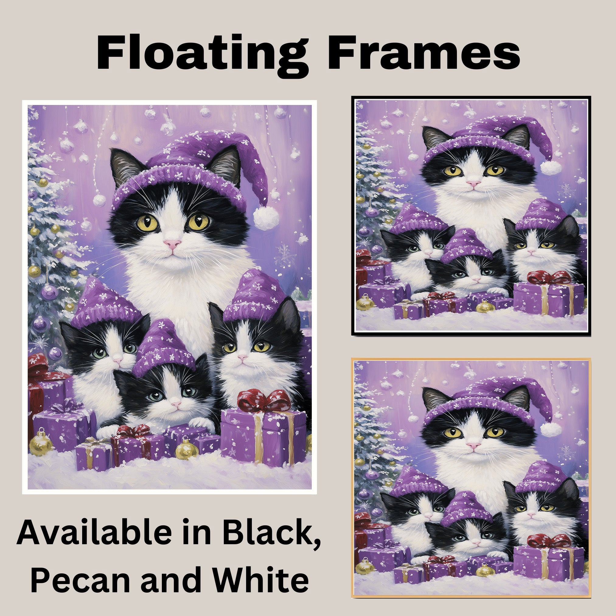 1.5" Thick Floating Framed Canvas: Available in Black, Pecan, and White Grain. Durable shrink-resistant frame. Comes with easy-to-install hanging kits, ready for immediate display.
