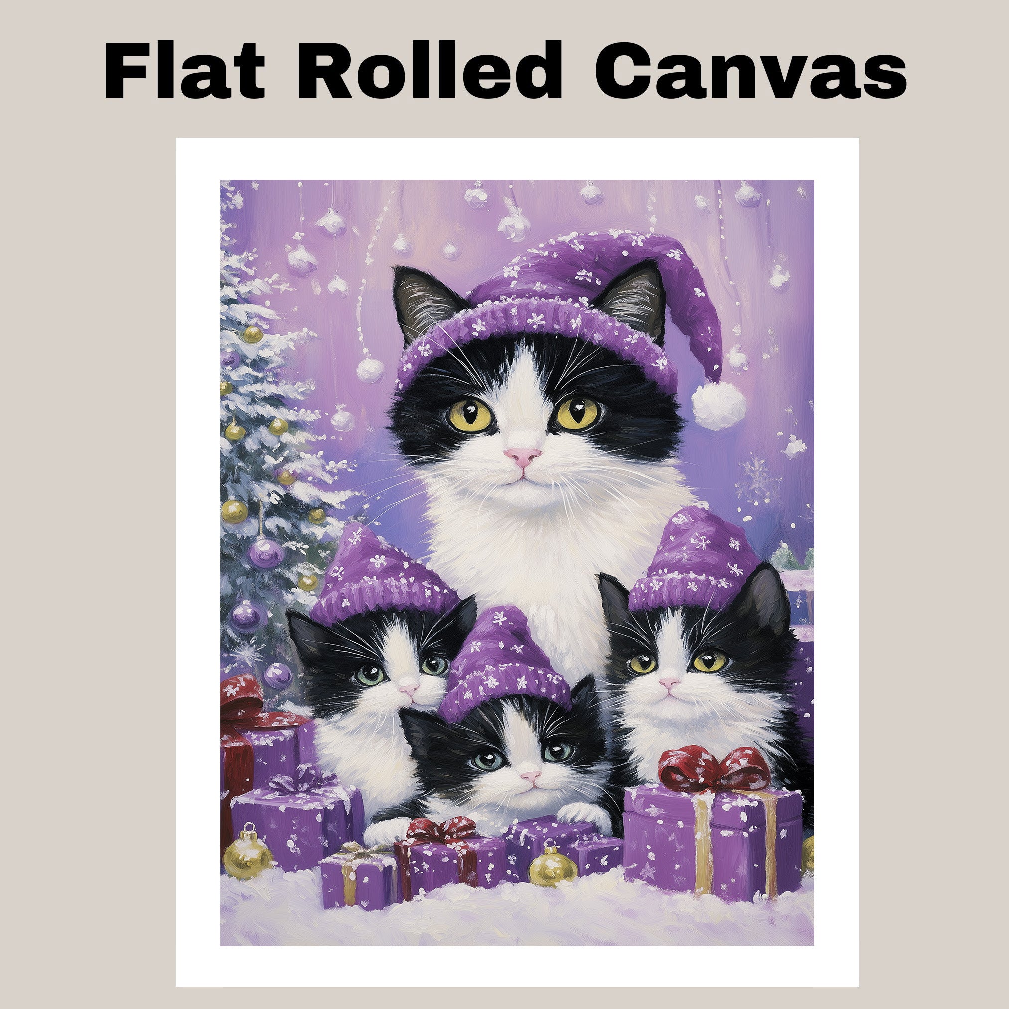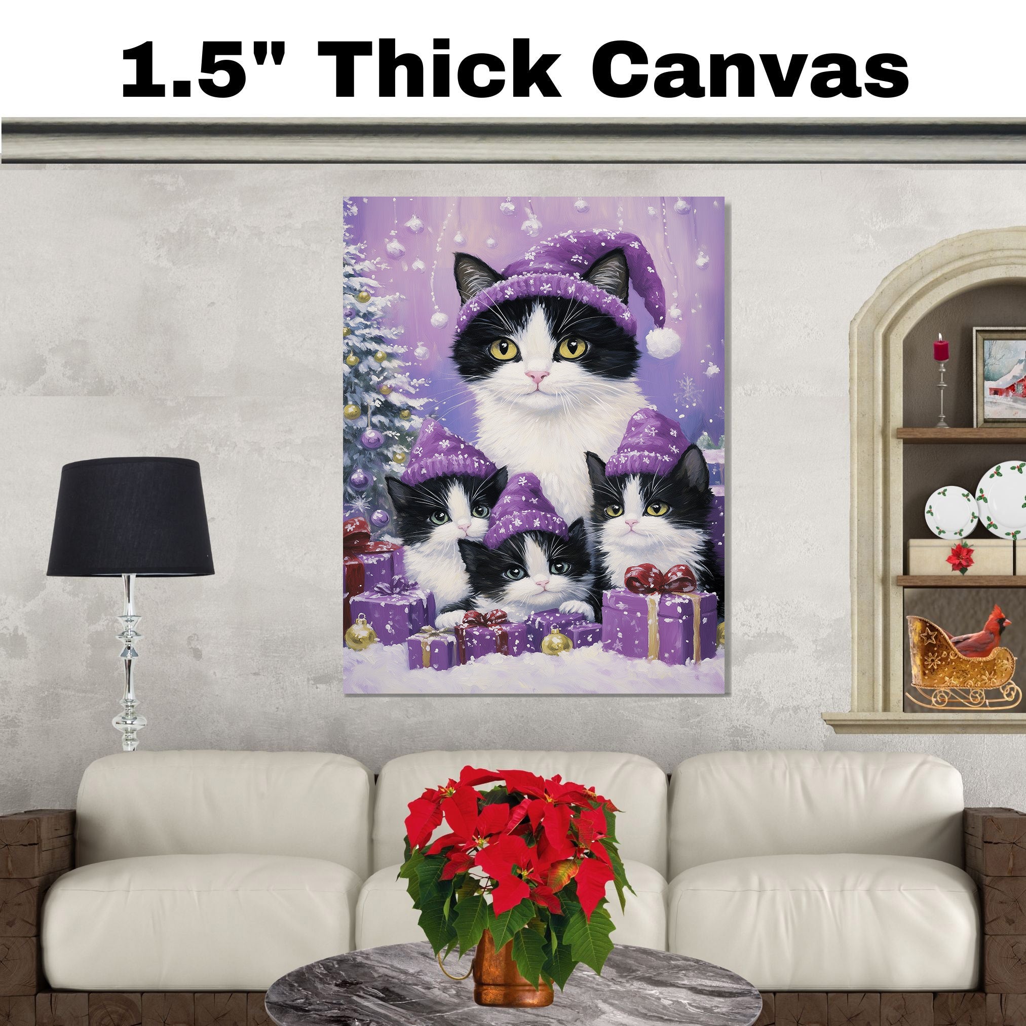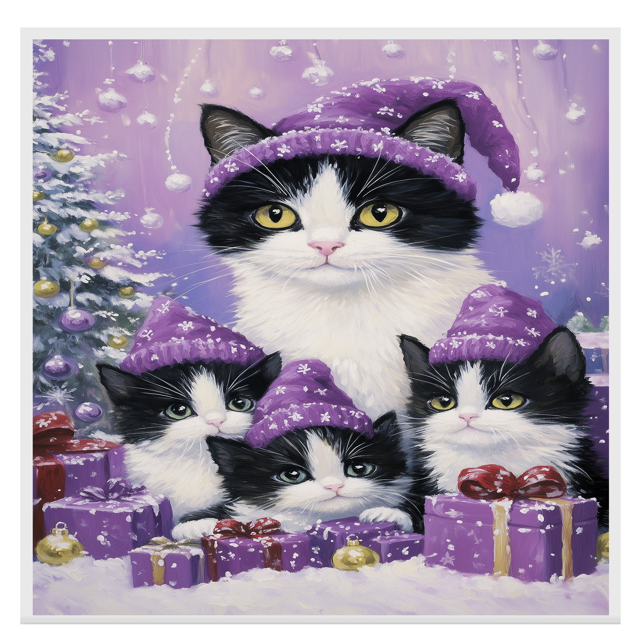 Snuggle into the holiday season with this cozy artwork of a tuxedo cat family dressed in matching...