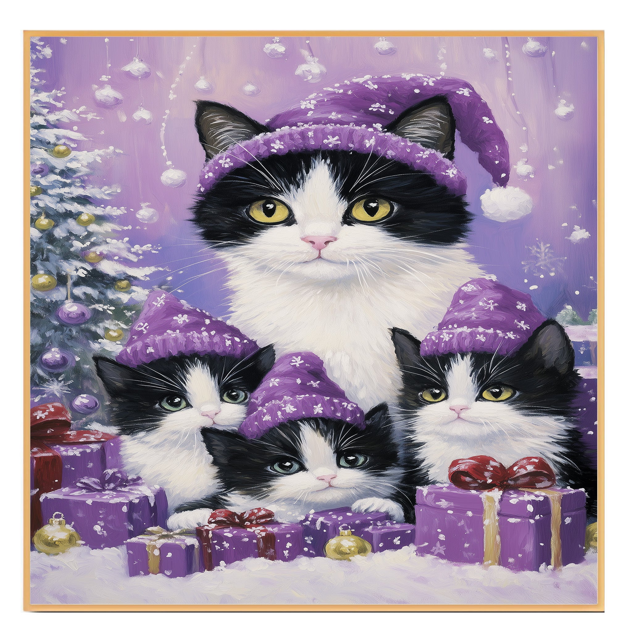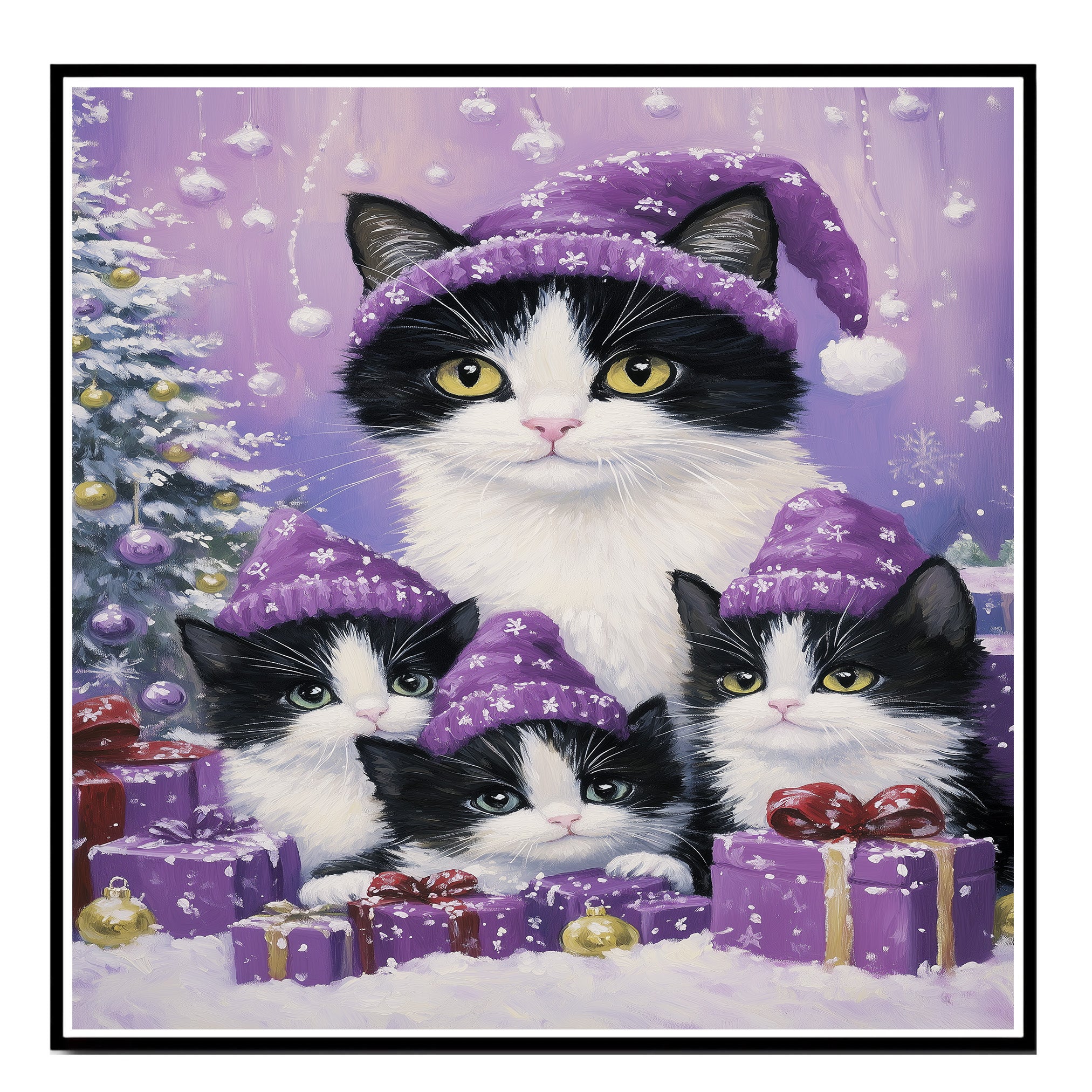 Snuggle into the holiday season with this cozy artwork of a tuxedo cat family dressed in matching pink pajamas and hats, standing beside glowing Christmas trees and festive presents. Perfect for cat lovers and whimsical holiday-themed decor.