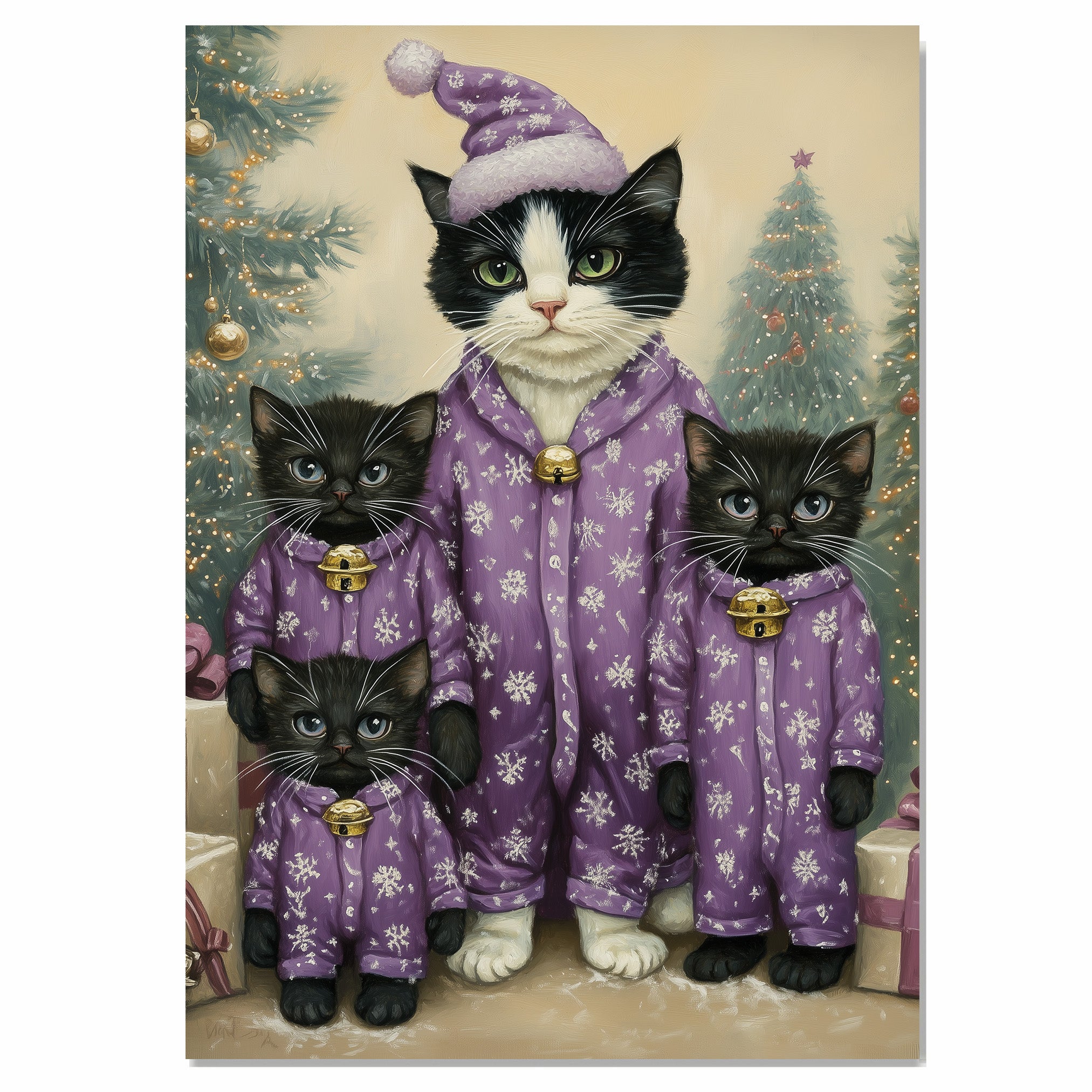 This delightful Christmas artwork features a tuxedo cat family dressed in purple snowflake pajamas with bells, standing...