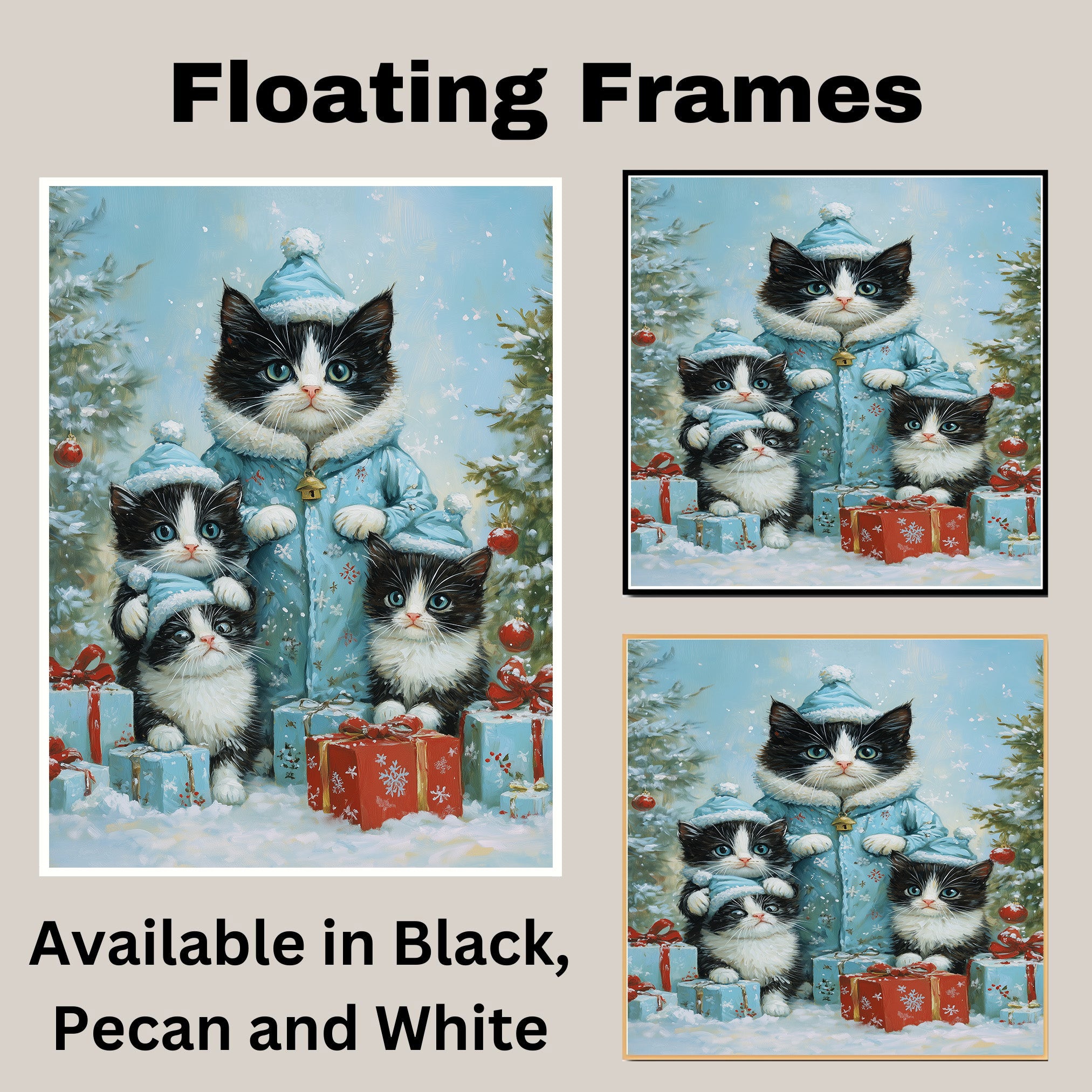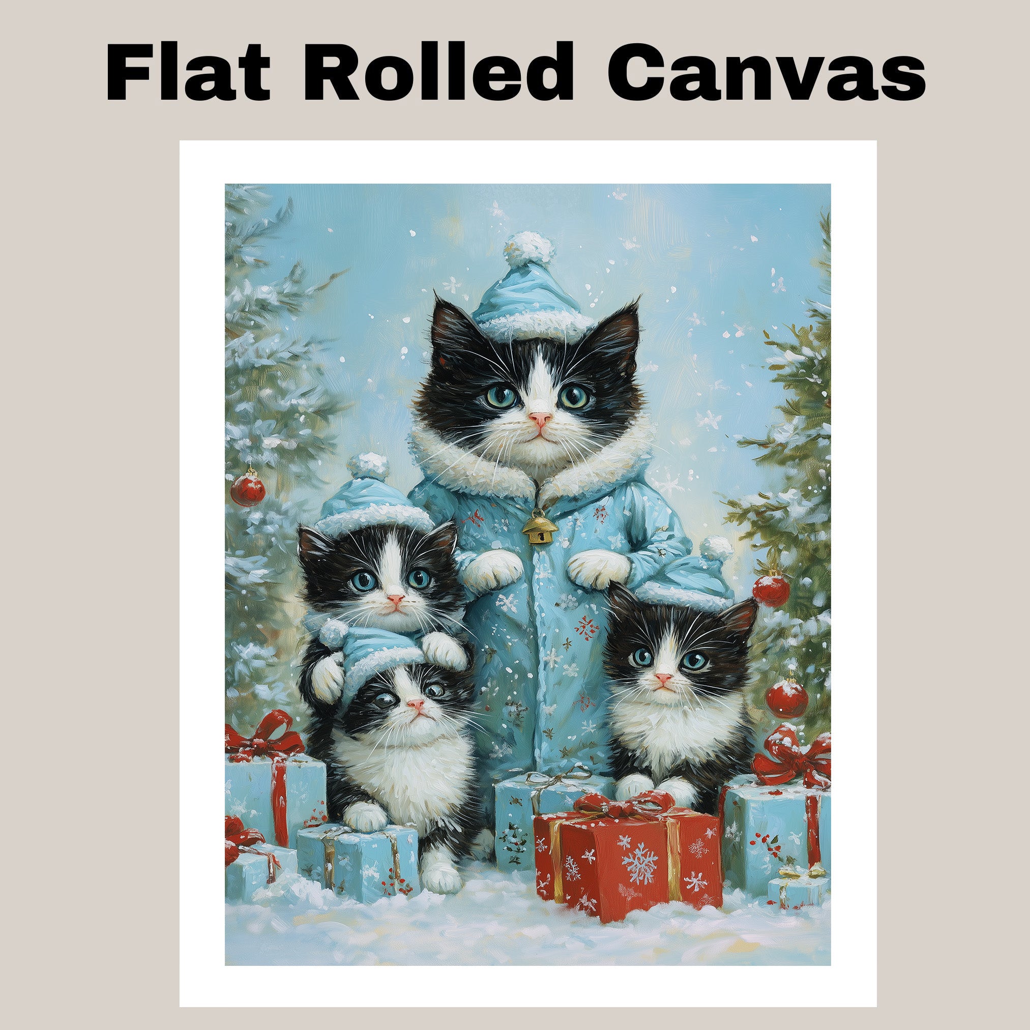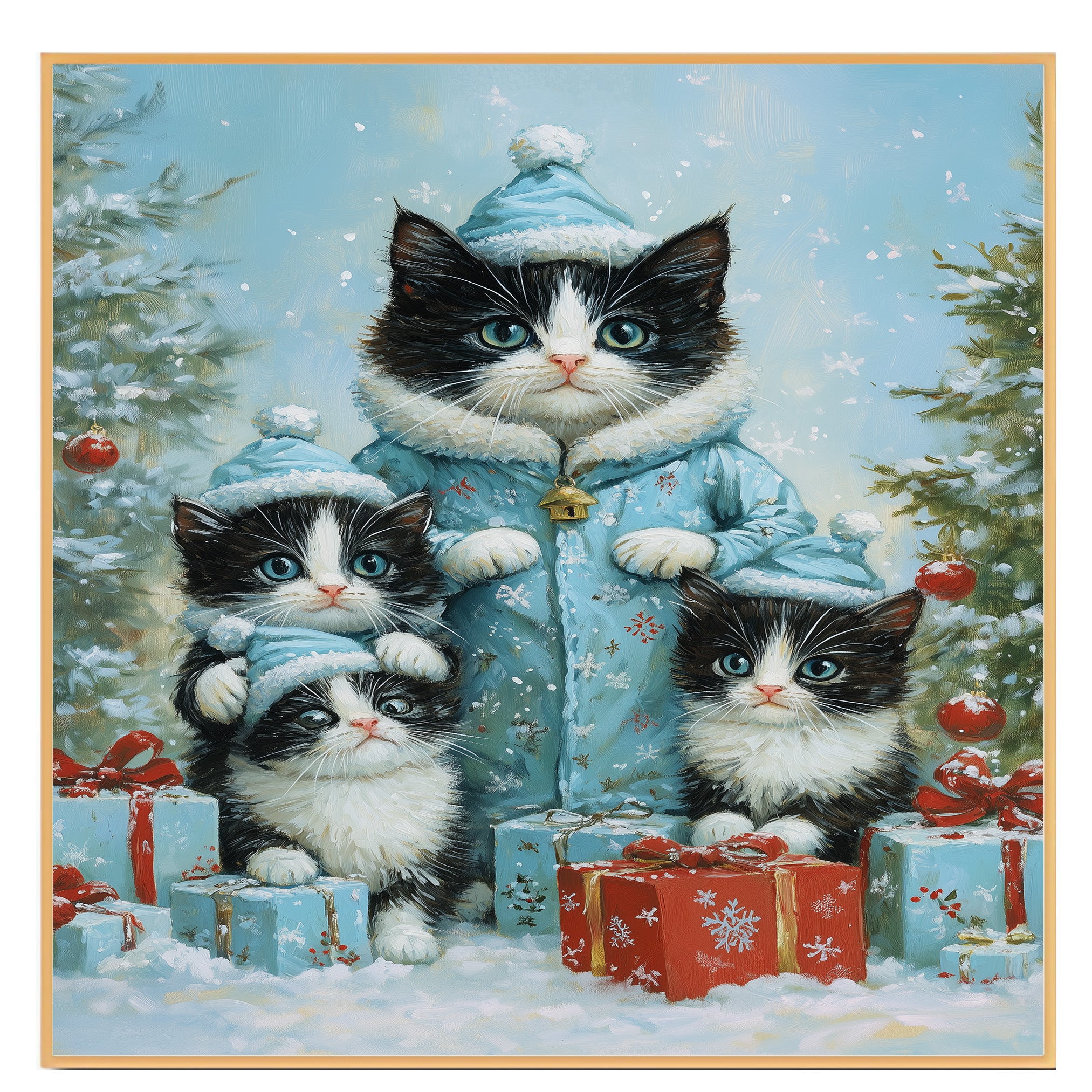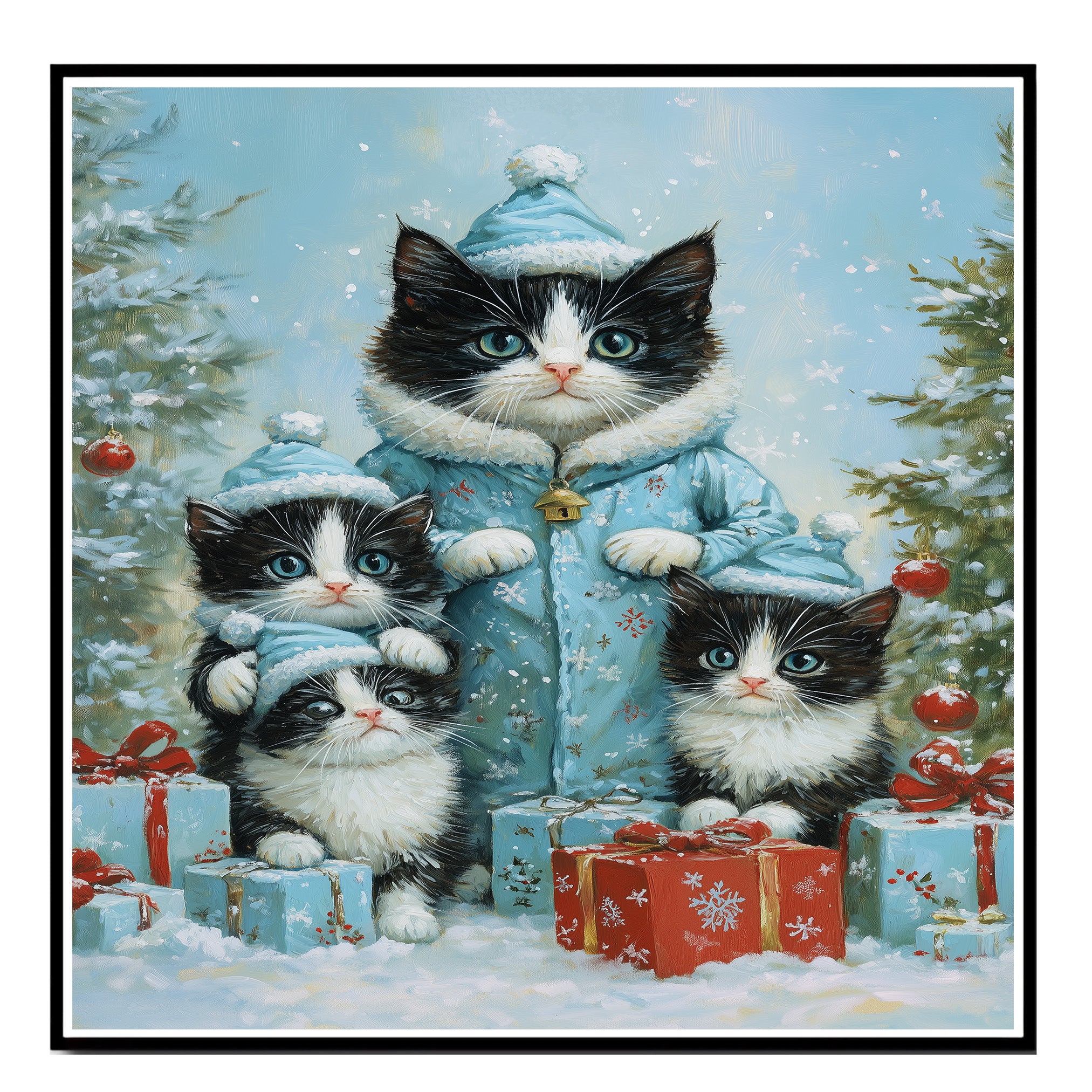 Delight in this whimsical holiday scene featuring a tuxedo cat family in matching purple winter hats. Surrounded by snow-covered gifts, golden ornaments, and Christmas trees, this cozy artwork is perfect for festive decor and cat enthusiasts.