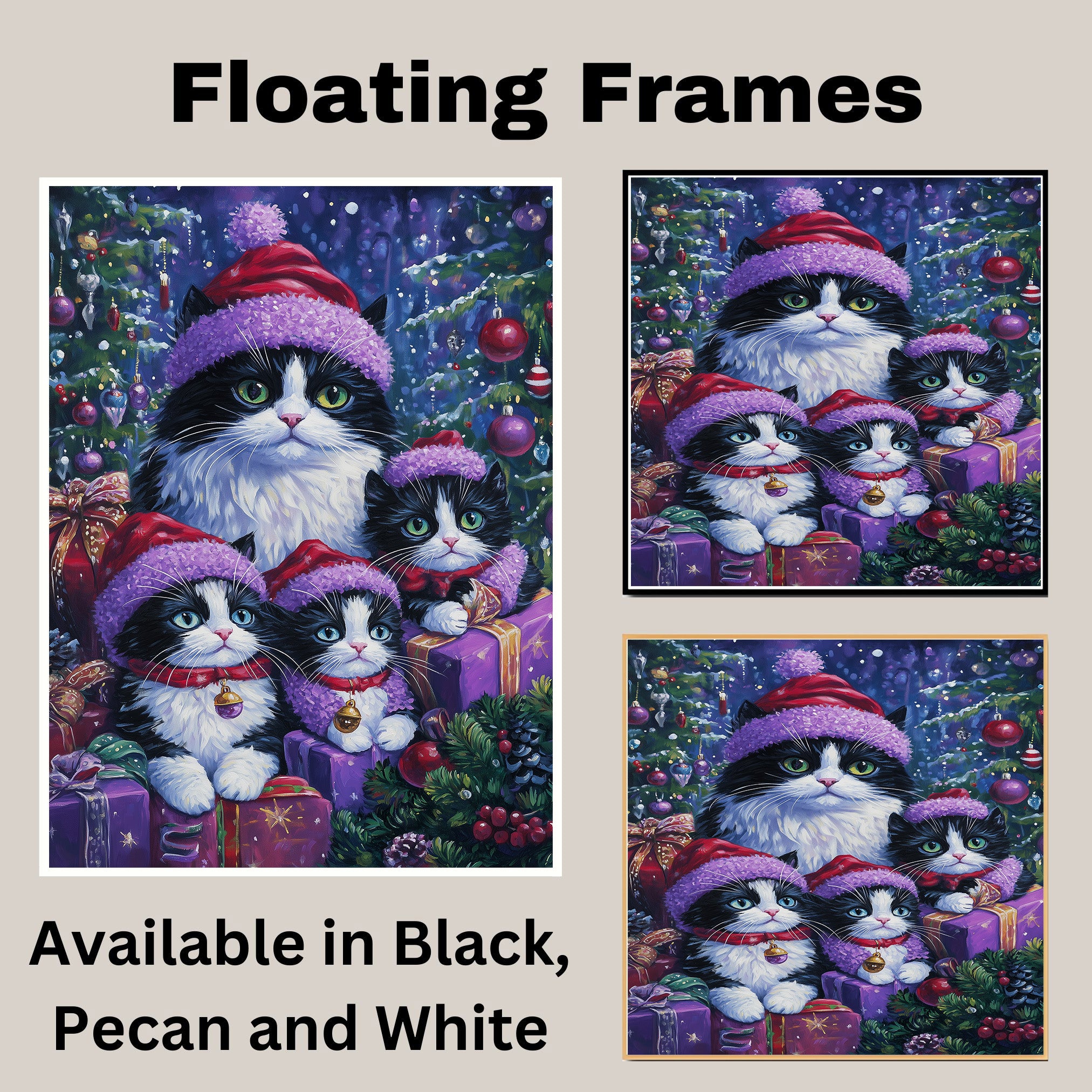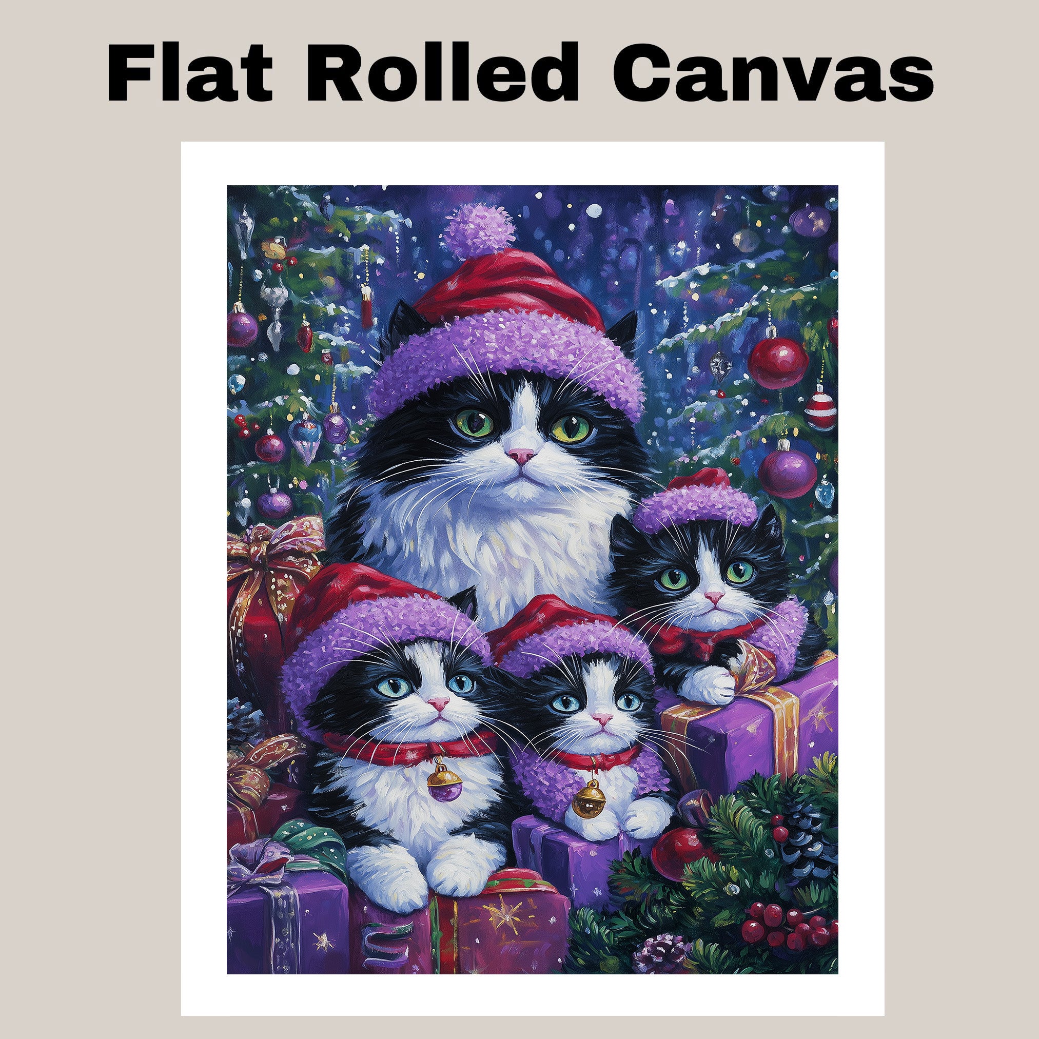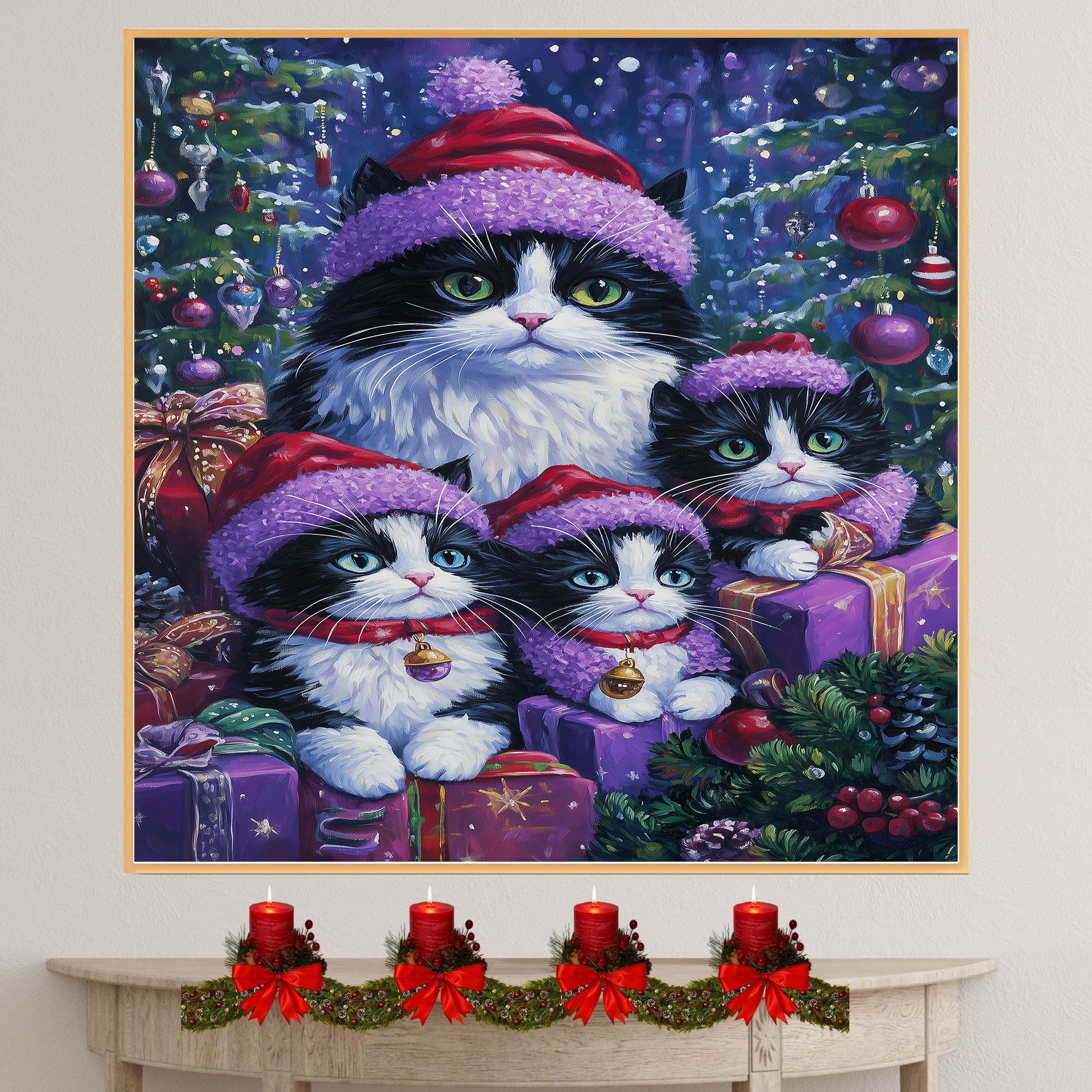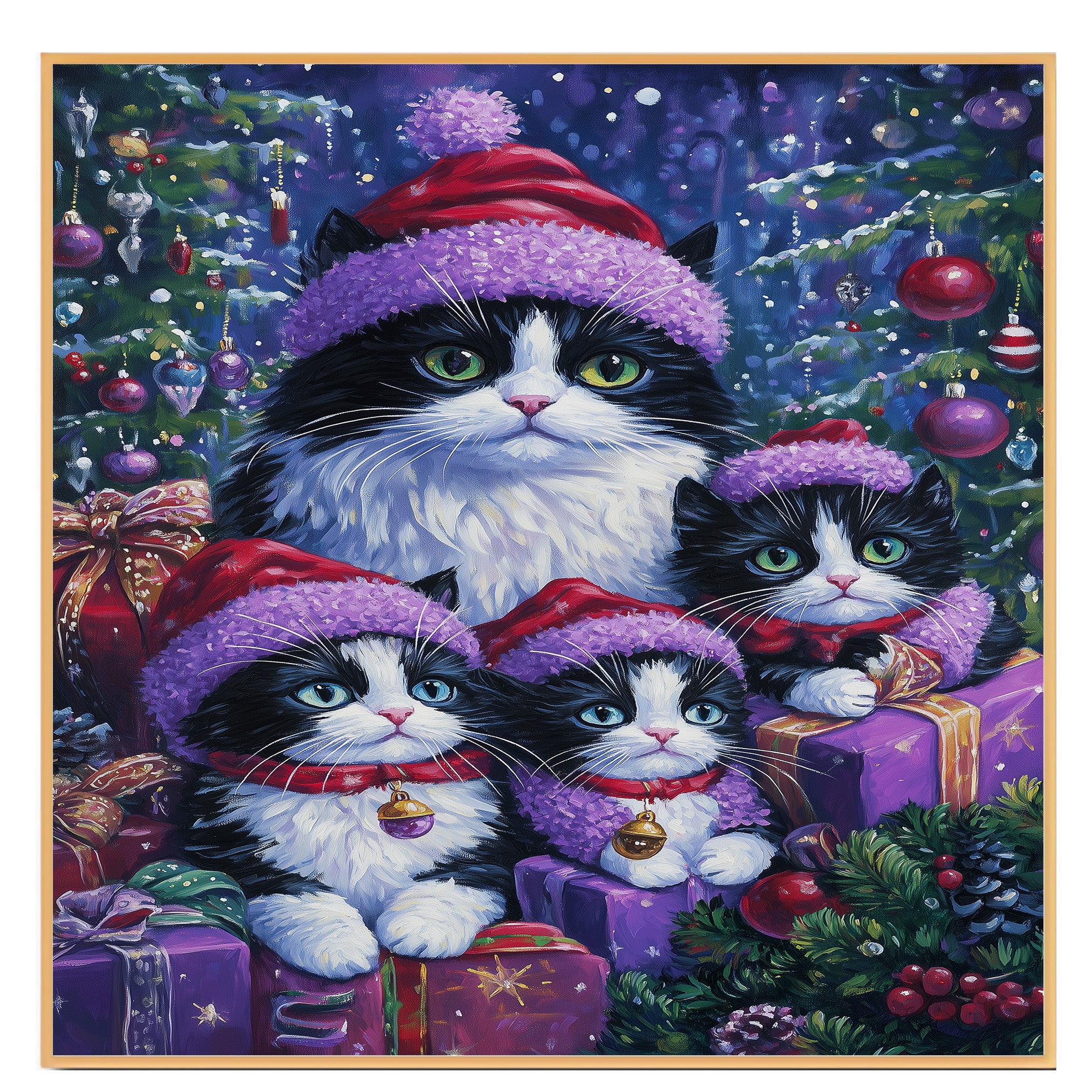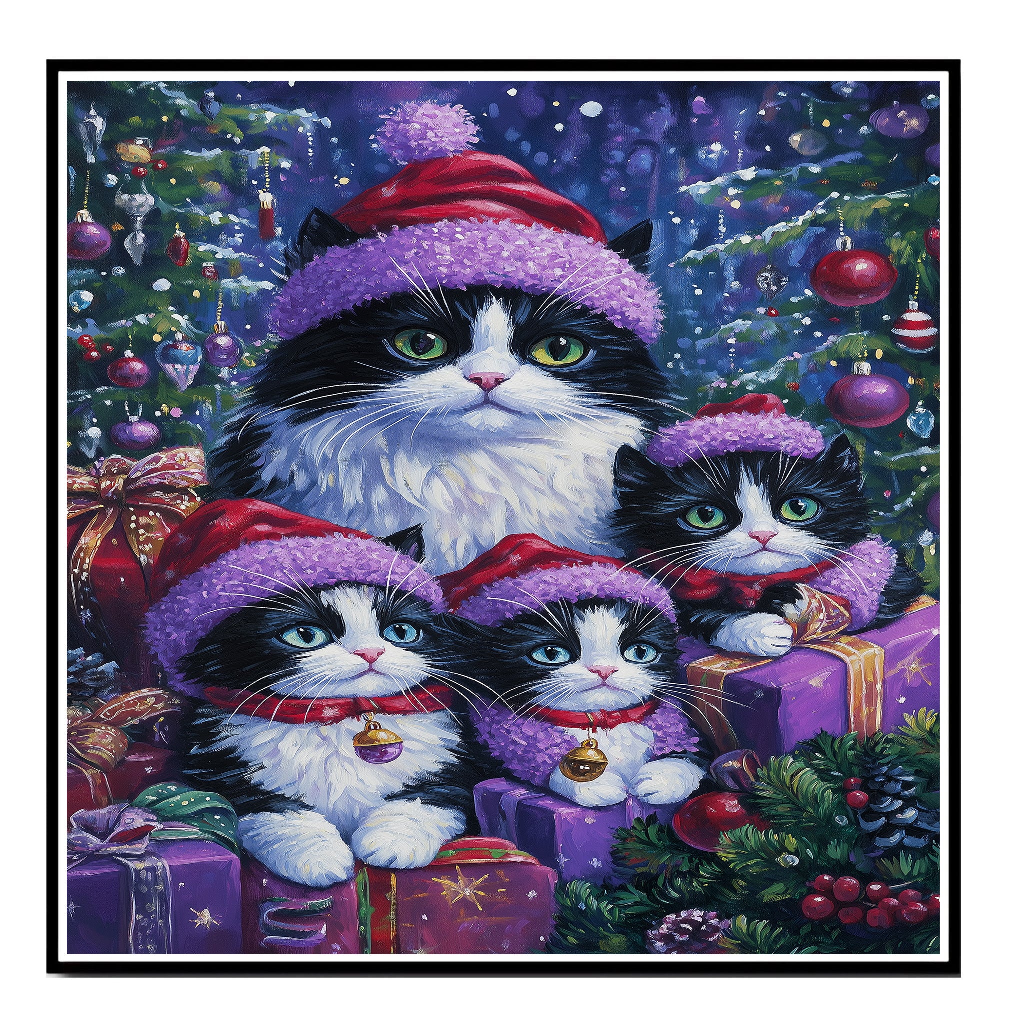 This vibrant holiday artwork features a tuxedo cat family dressed in red and purple Santa hats with bells, surrounded by sparkling gift boxes, ornaments, and festive Christmas trees. A bold and joyful seasonal piece perfect for cat lovers and holiday homes.