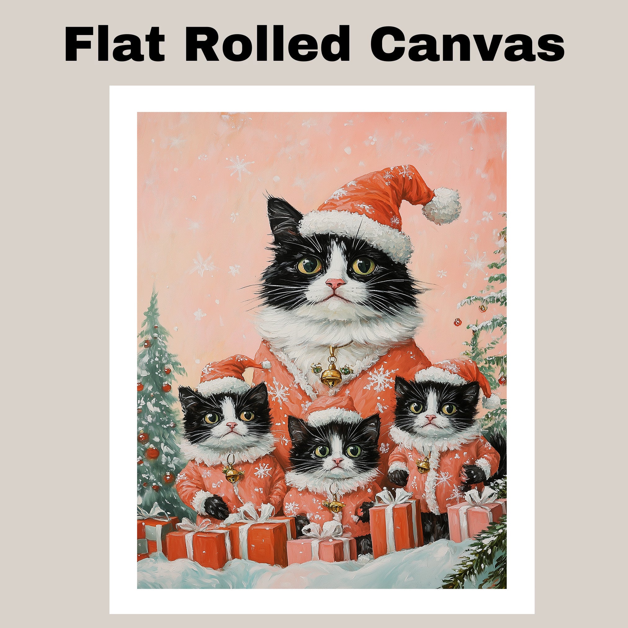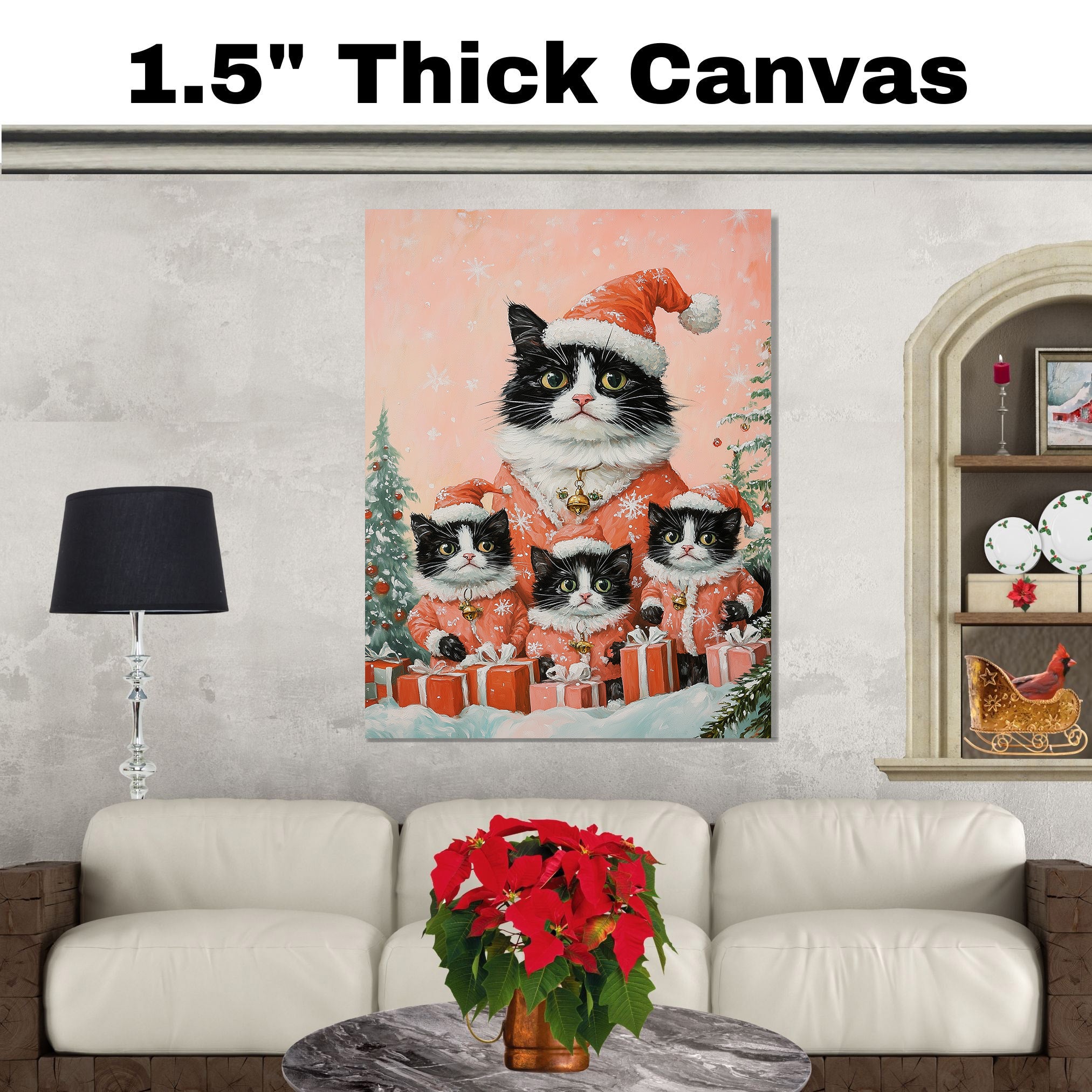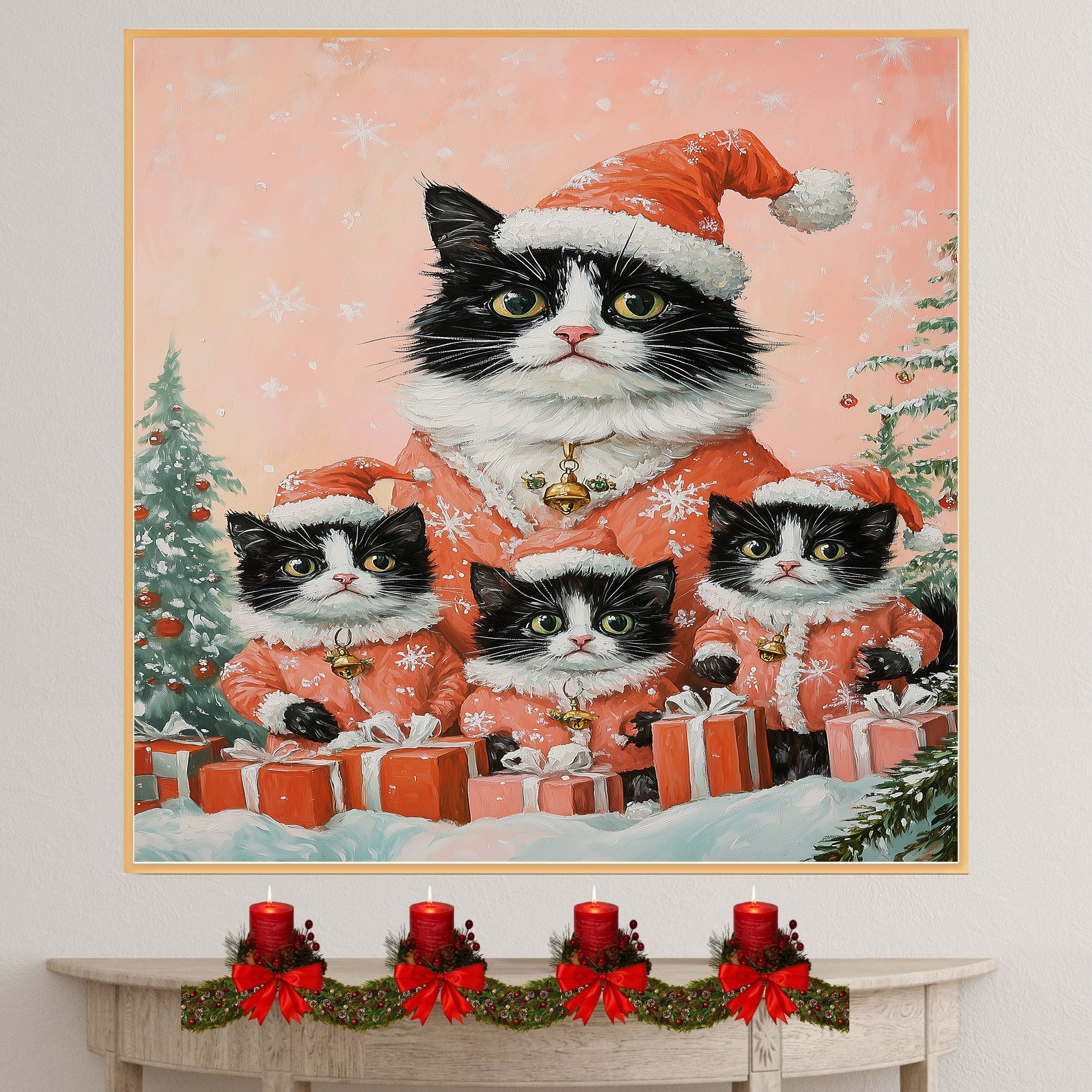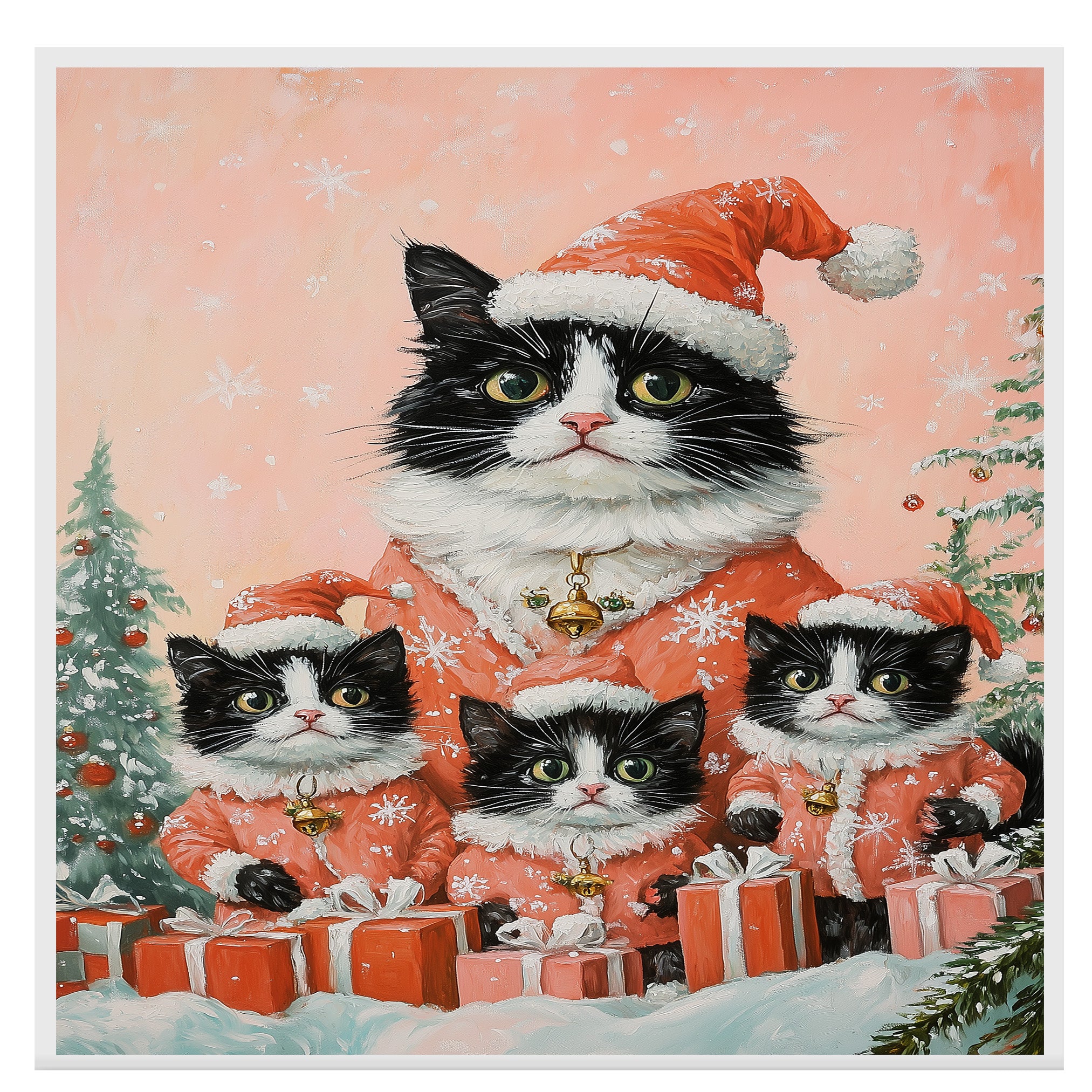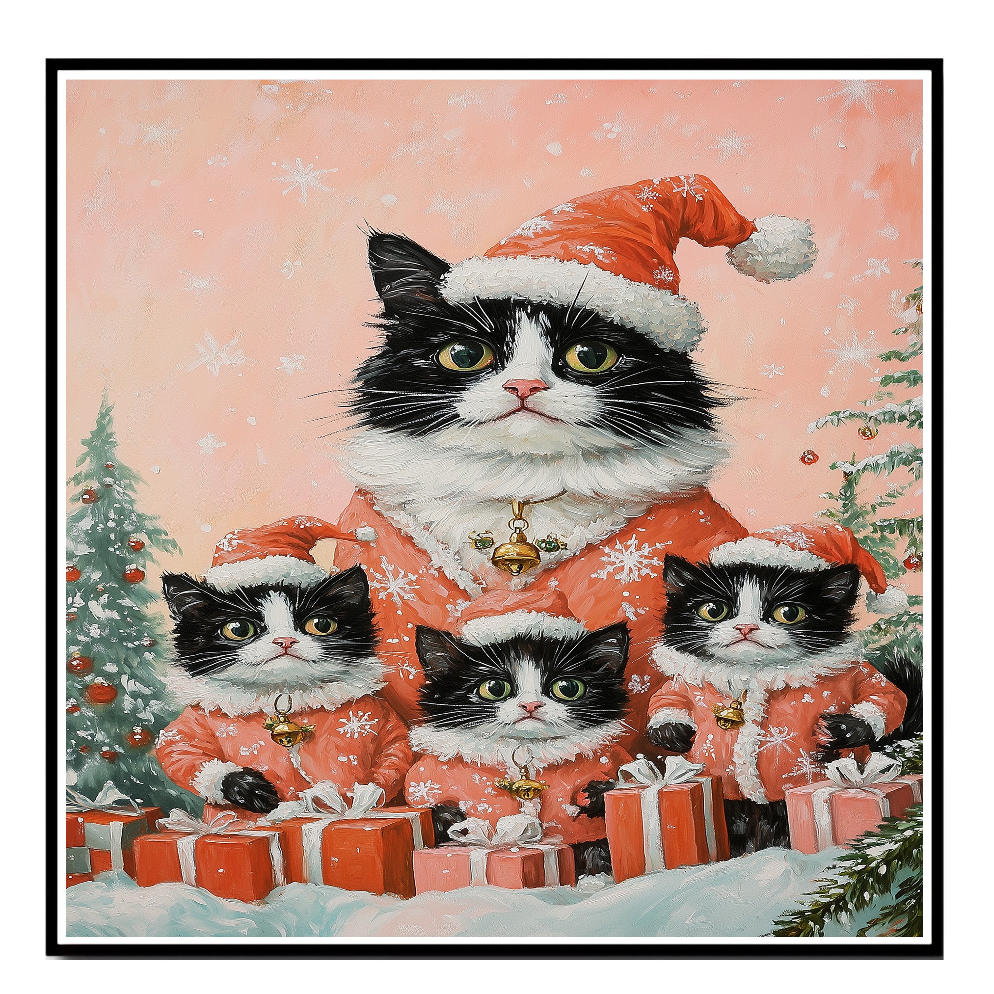 Add holiday cheer to your space with this delightful artwork of a tuxedo cat family in red Santa outfits, surrounded by wrapped presents and snowy Christmas trees. A heartwarming and festive piece perfect for cat lovers and seasonal celebrations.