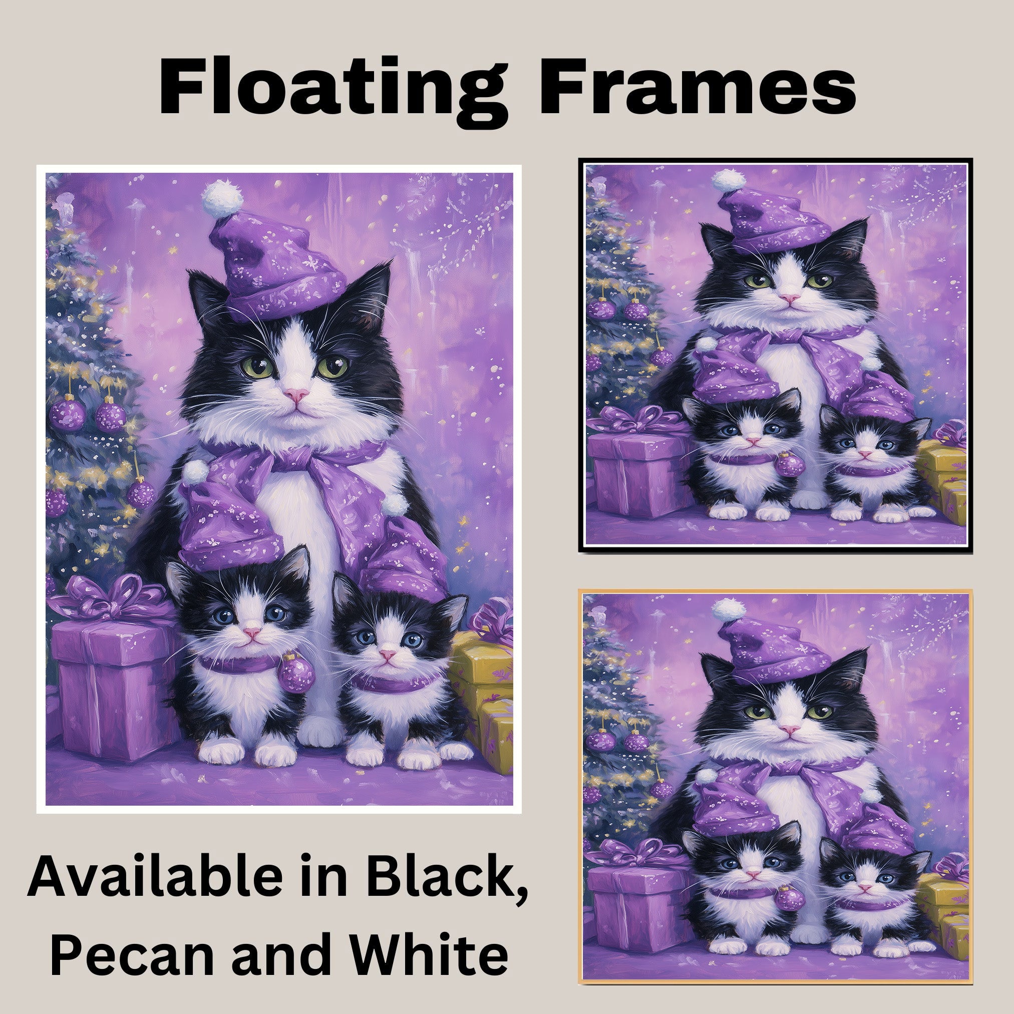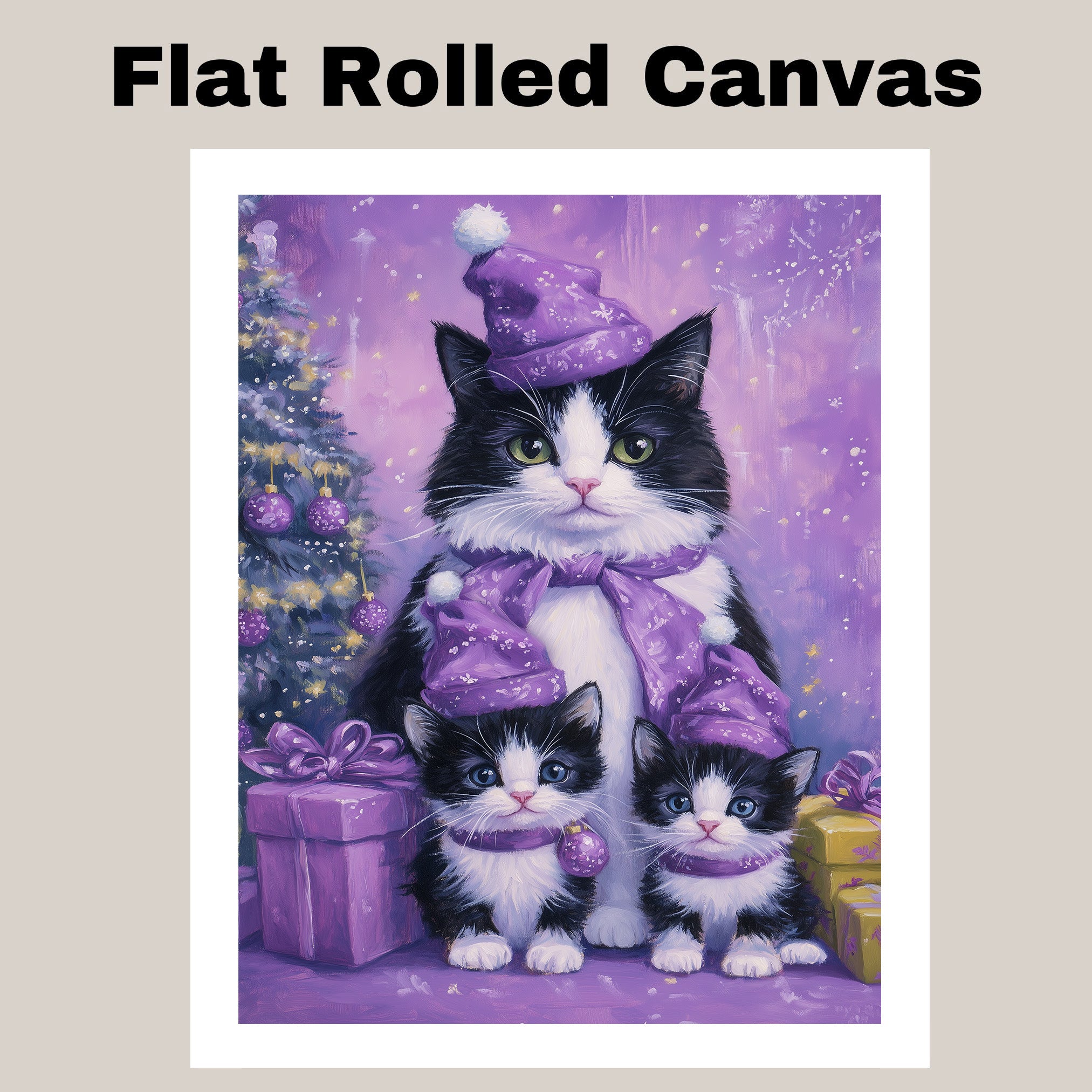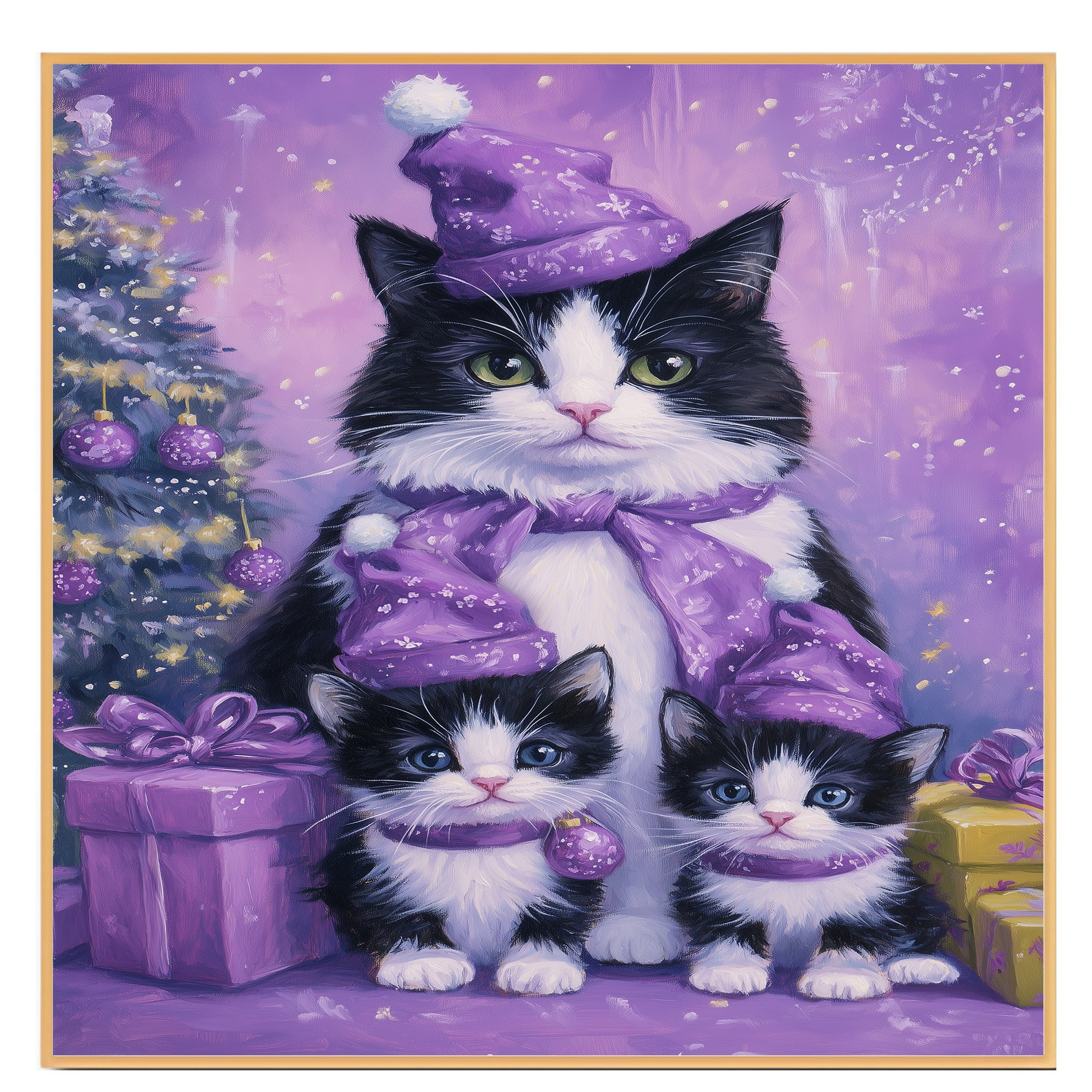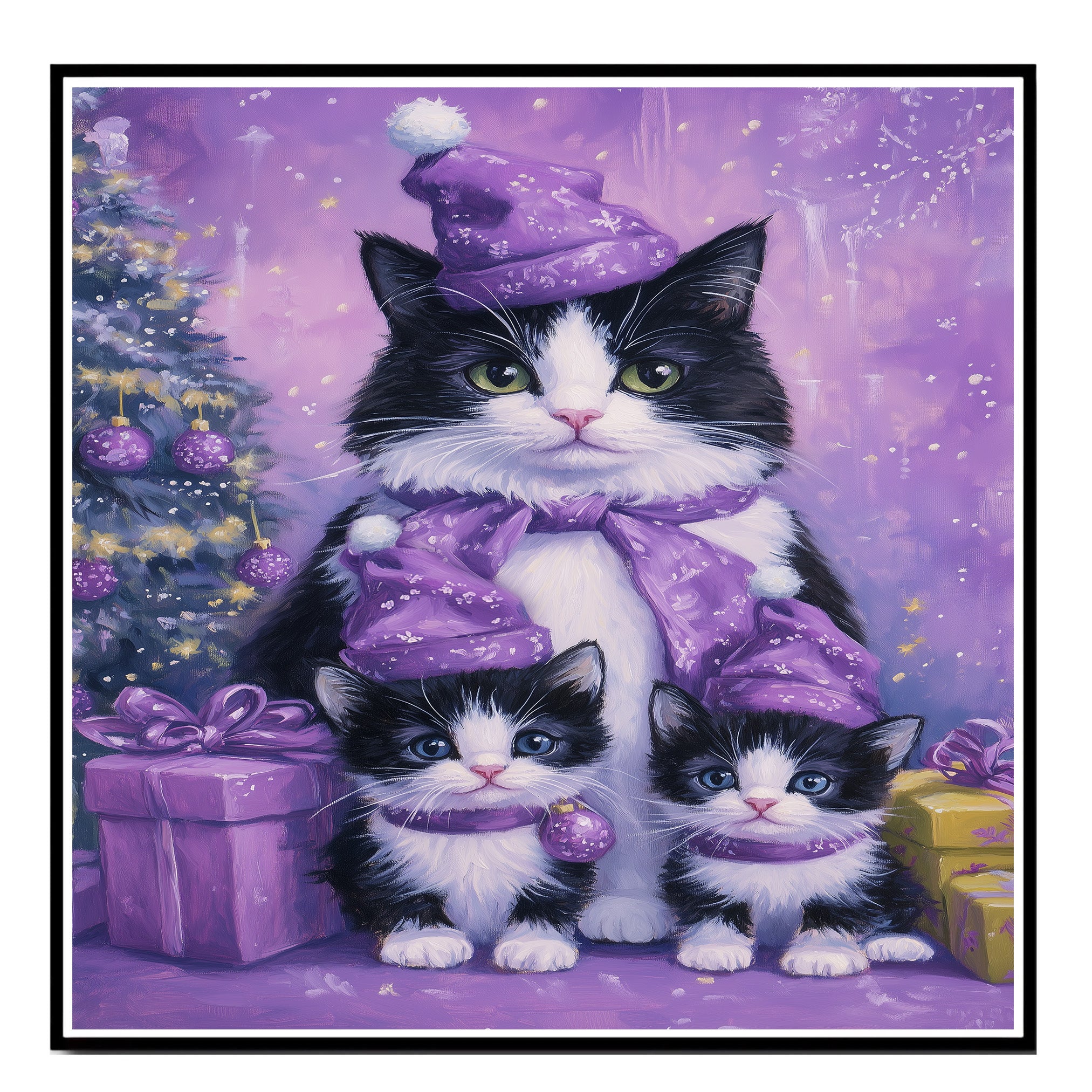 Celebrate the holidays with this cheerful artwork featuring a tuxedo cat family dressed in bright yellow capes with star patterns and red Santa hats. Surrounded by festive gift boxes and a decorated Christmas tree, it’s the perfect holiday piece for cat lovers.