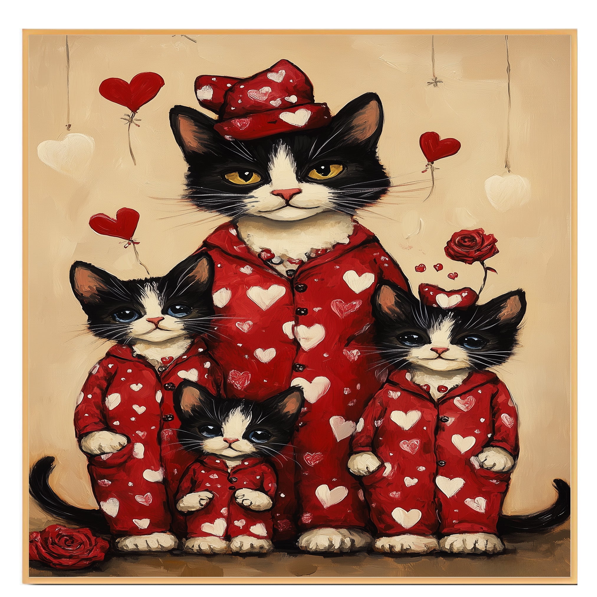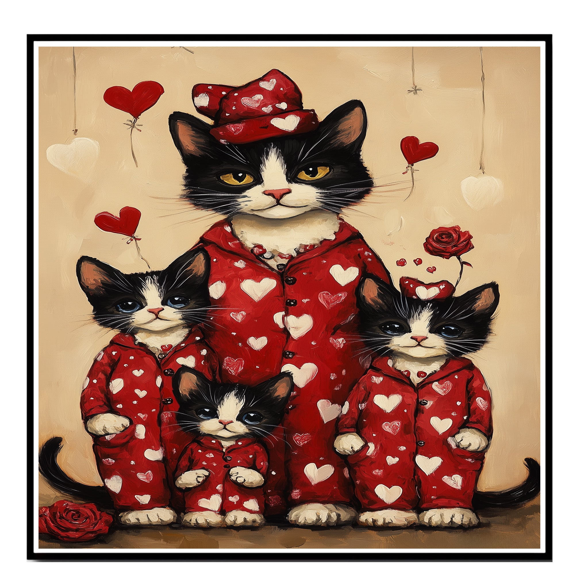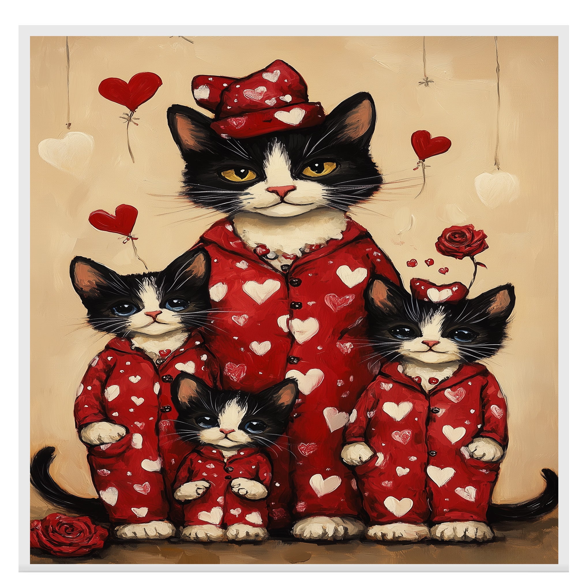 Celebrate love and family with this delightful painting featuring a tuxedo cat mother and her kittens dressed in matching red heart pajamas. Surrounded by floating hearts and a single rose, this charming piece radiates warmth and affection. Perfect for cat lovers or cozy home decor.