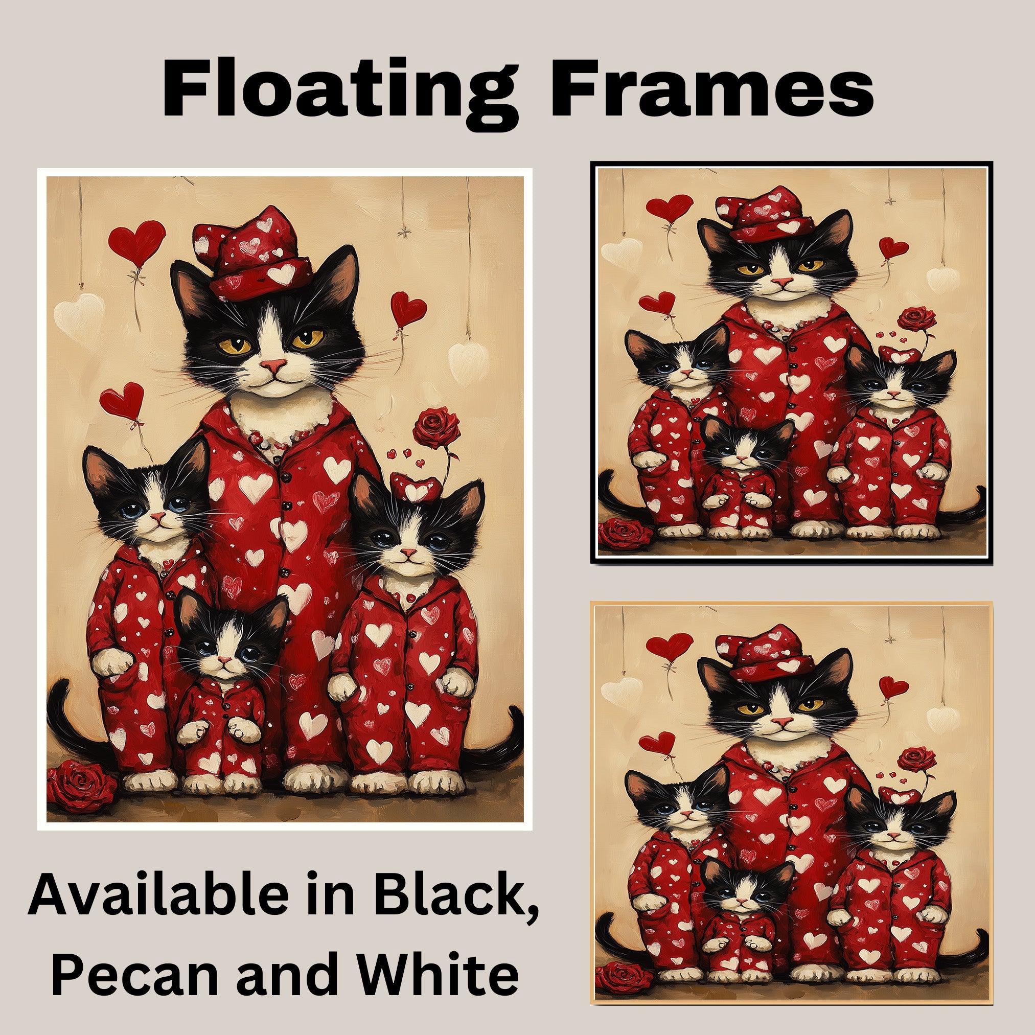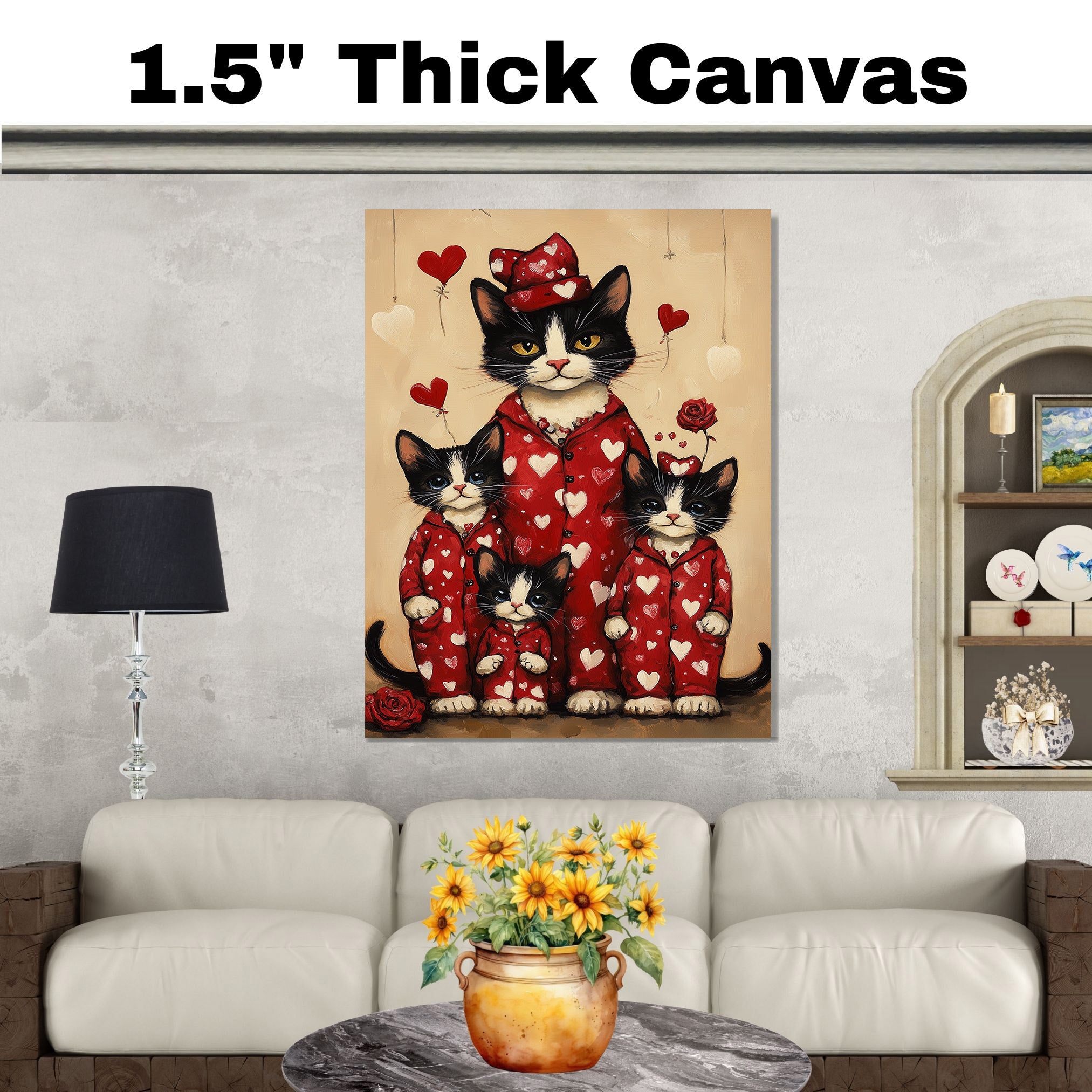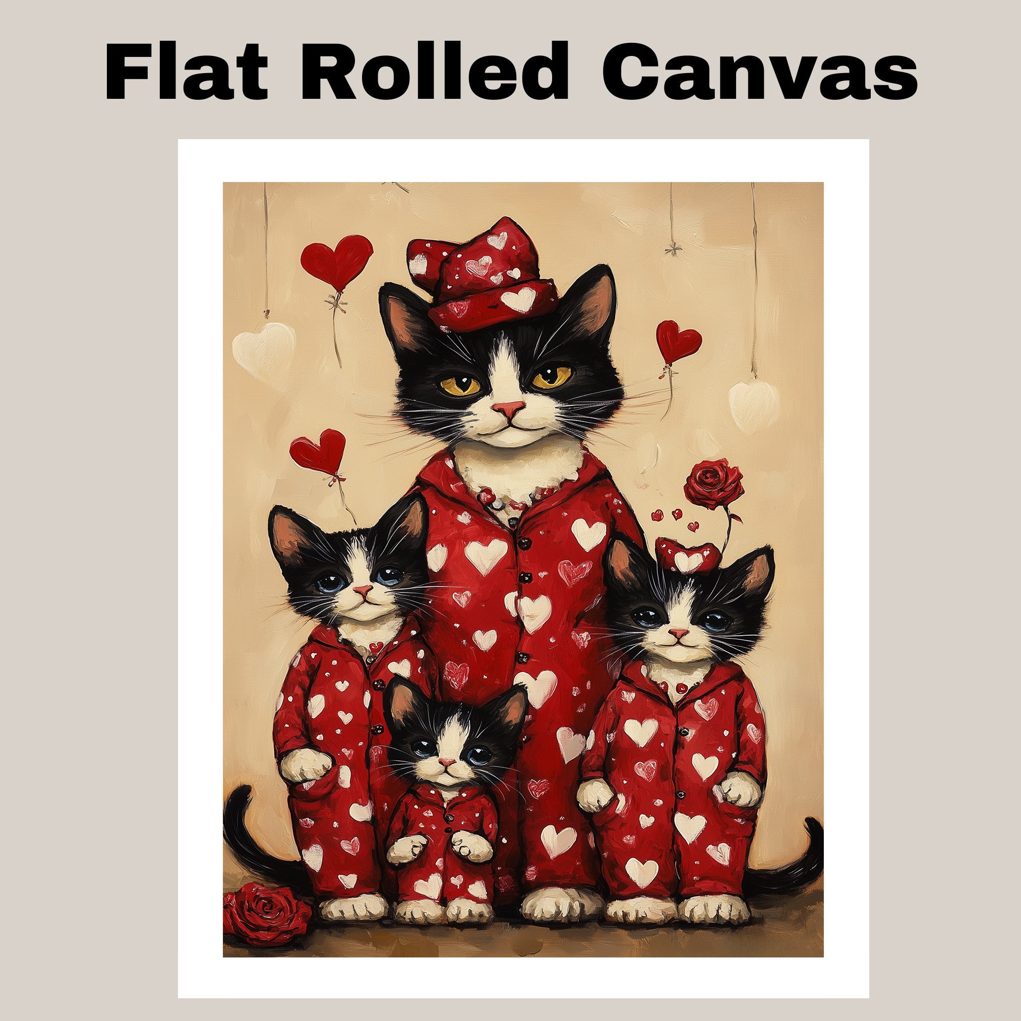 Celebrate love and family with this delightful painting featuring a tuxedo cat mother and her kittens dressed in matching red heart pajamas. Surrounded by floating hearts and a single rose, this charming piece radiates warmth and affection. Perfect for cat lovers or cozy home decor.
