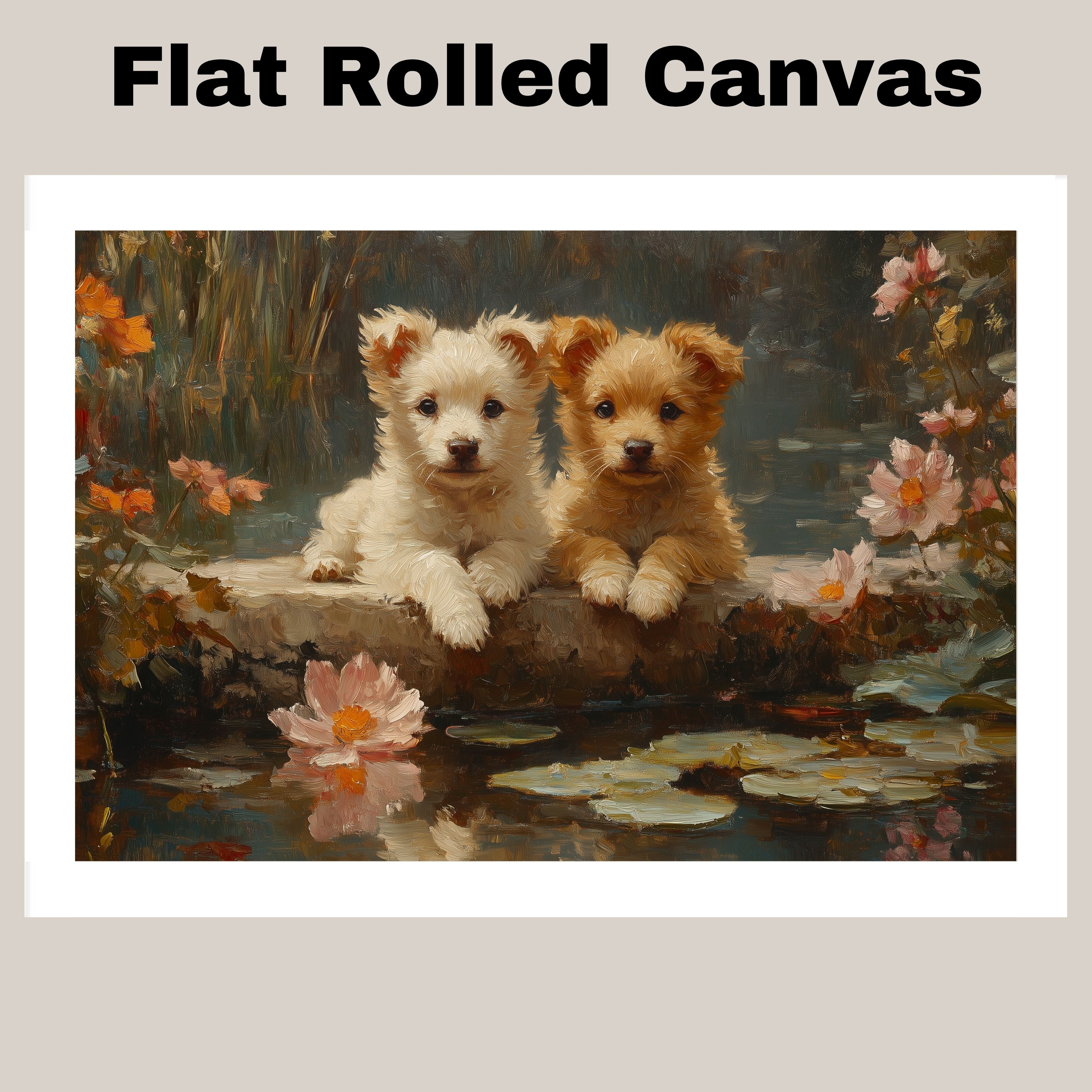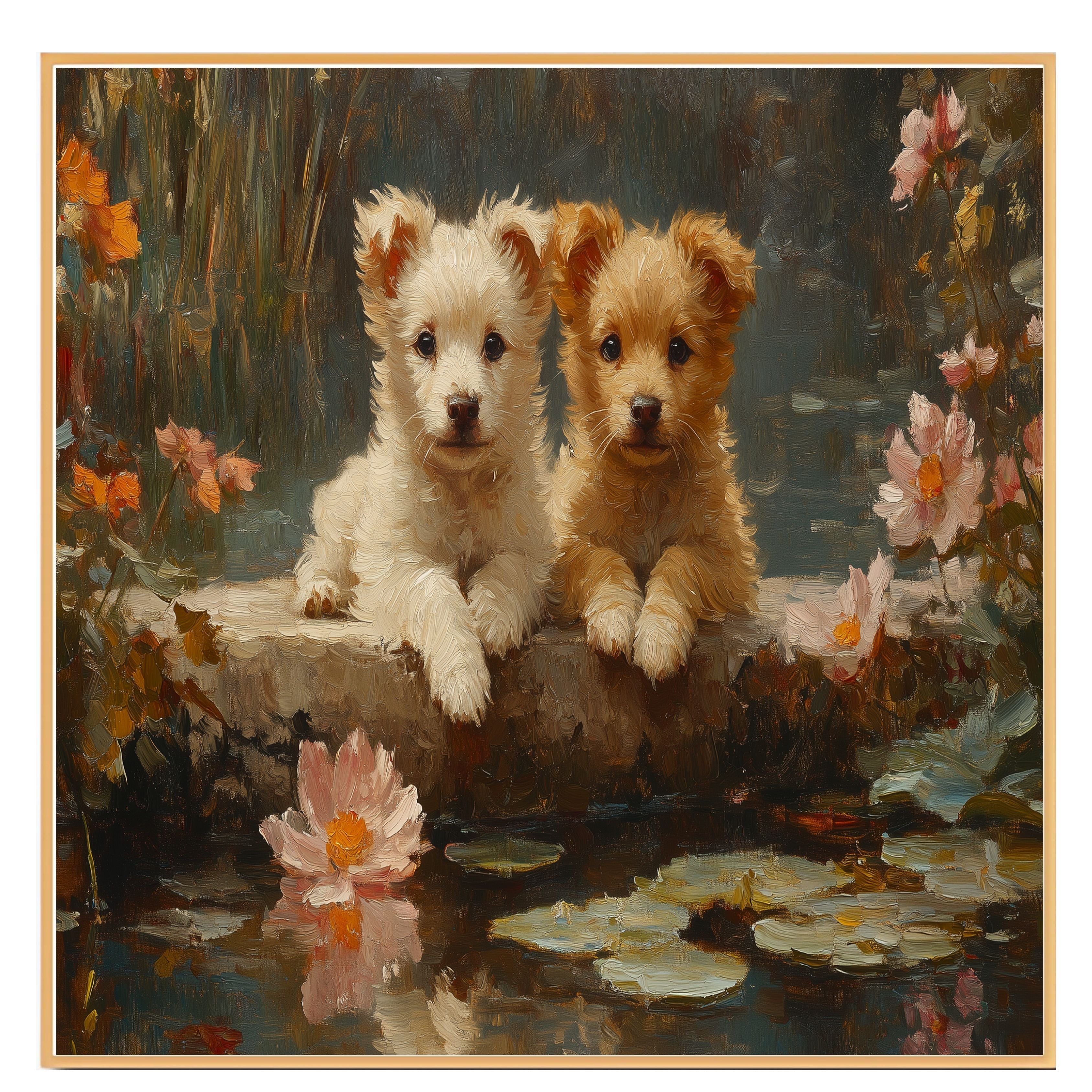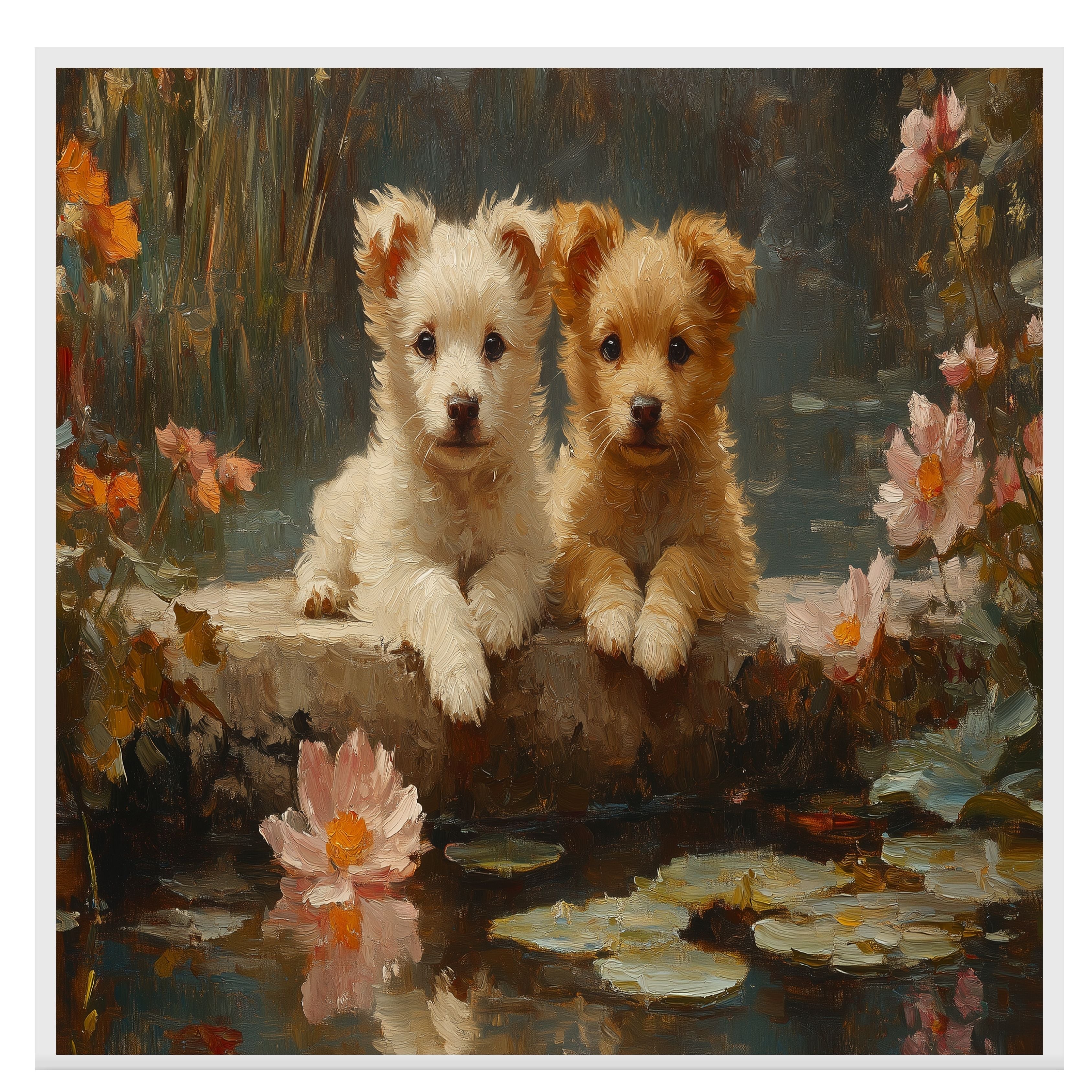 Bring joy to your space with this heartwarming impressionist-style artwork featuring two fluffy puppies resting by a serene pond surrounded by water lilies and blooming flowers. The soft brushstrokes and nature-inspired colors create a calming, lovable scene perfect for pet lovers or nature enthusiasts. Ideal for brightening up any room with warmth and charm.