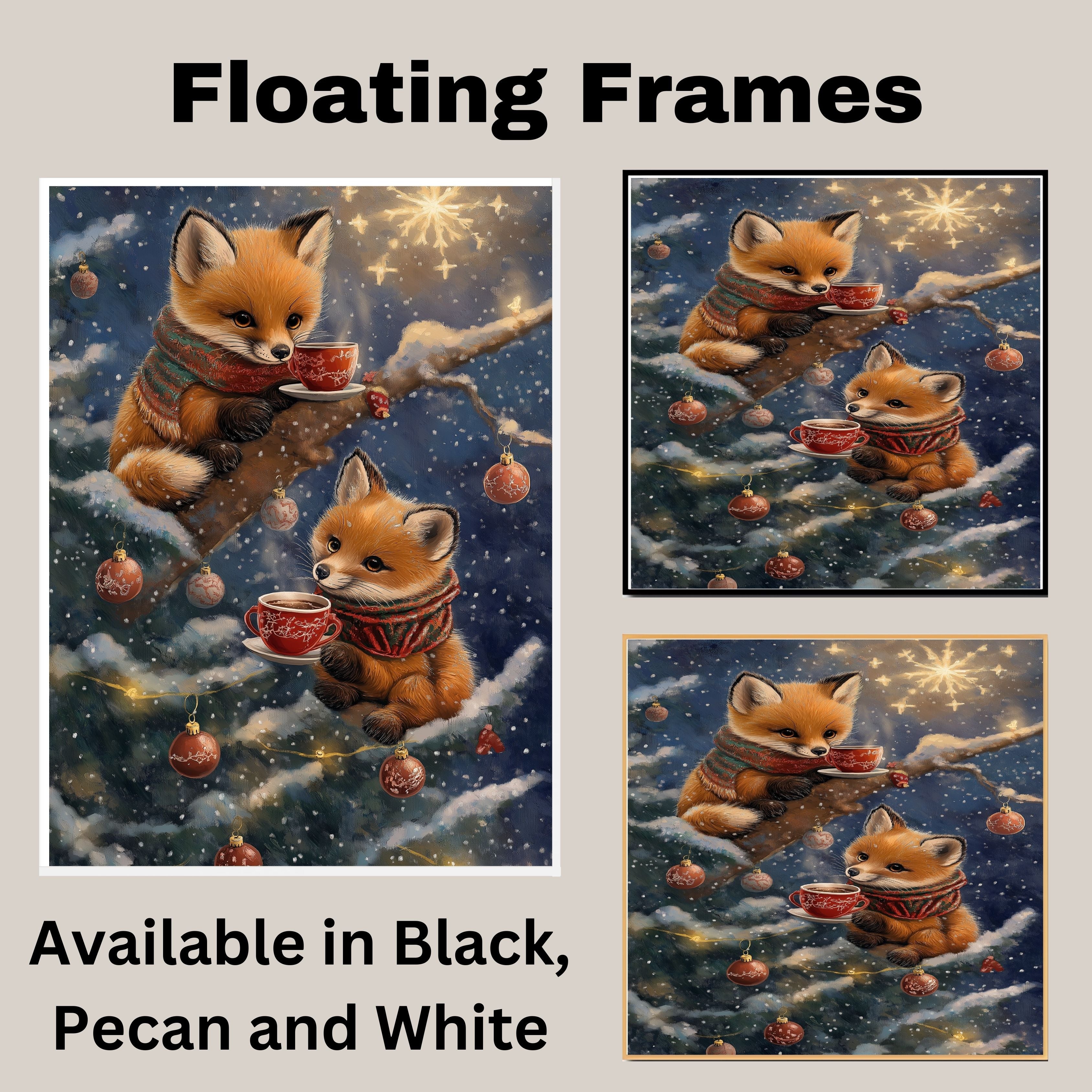 Two Baby Foxes in Scarves Drinking Cocoa on Tree Branch Surrounded by Ornaments and Snowflakes in Winter Night Scene Holiday Art Print for Seasonal Decor on Ready to Hang 1.5" Thick Canvas Wrap, Floating Framed Canvas, Flat Rolled Canvas