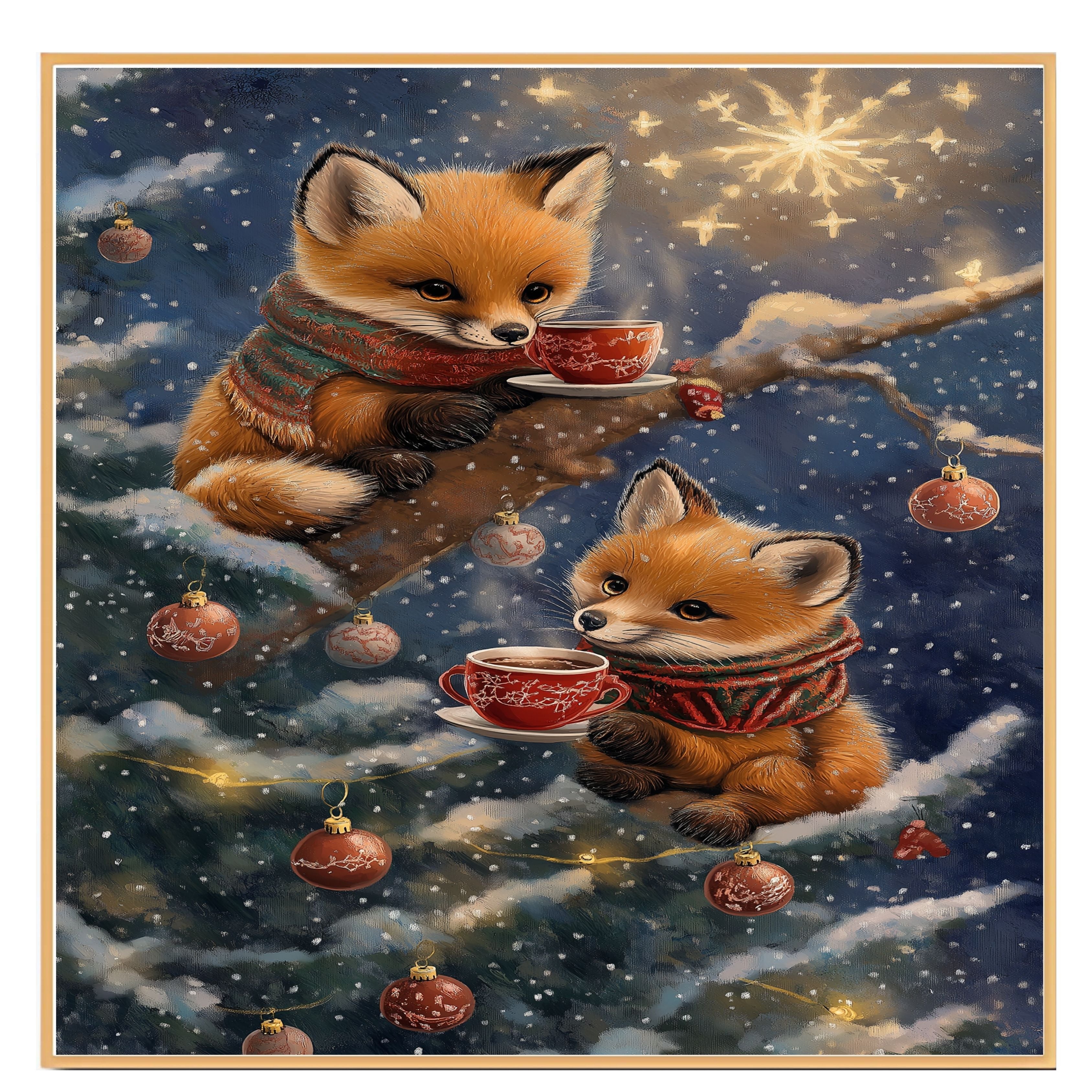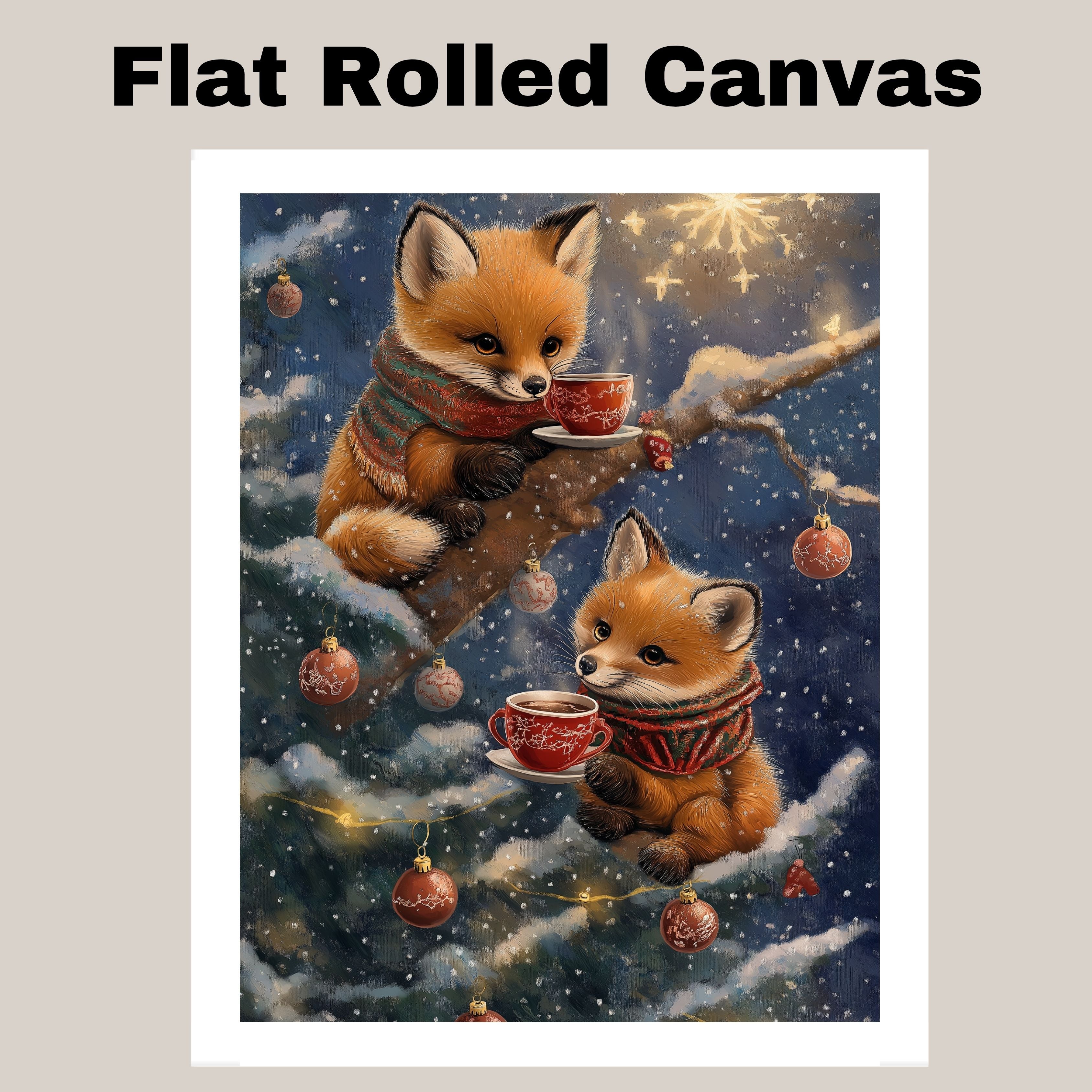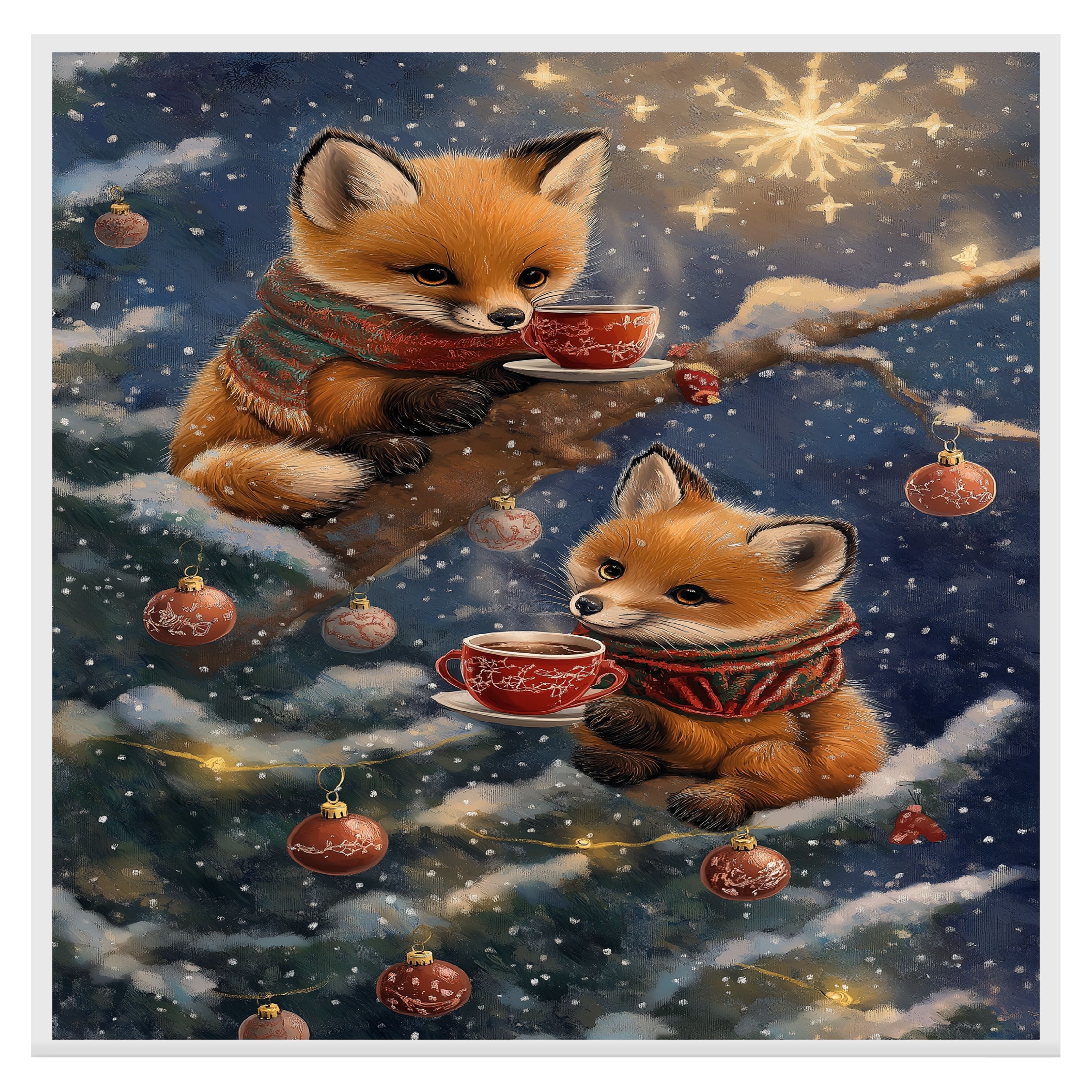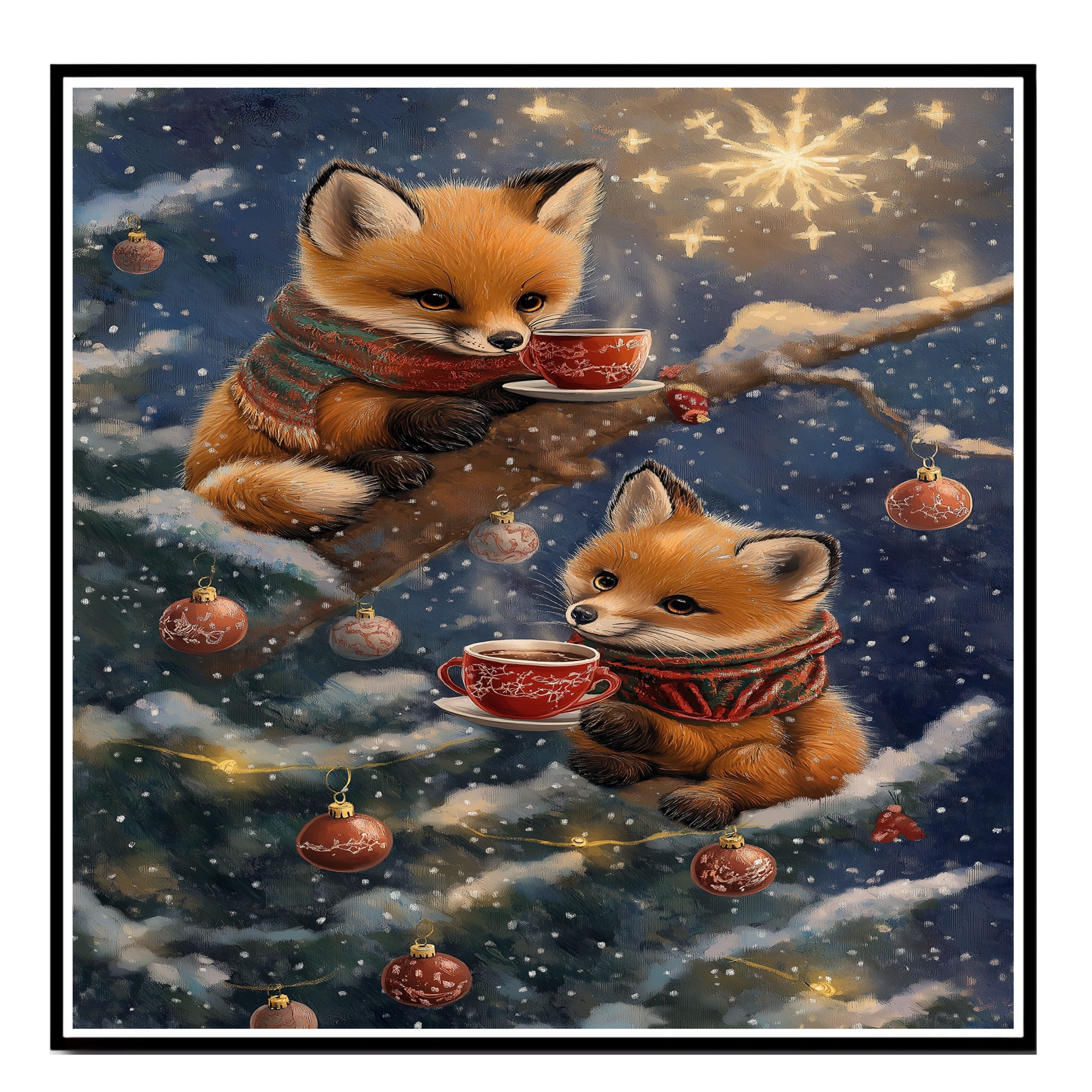 Capture the warmth of the holidays with this charming art print featuring two baby foxes cozied up in scarves, sipping cocoa while perched on a snowy tree branch. Set against a softly lit winter sky with glowing snowflakes and ornaments, this piece radiates peace and festive charm. Ideal for holiday-themed nurseries, woodland decor, or seasonal wall displays, this print brings a sense of cozy wonder to any space.