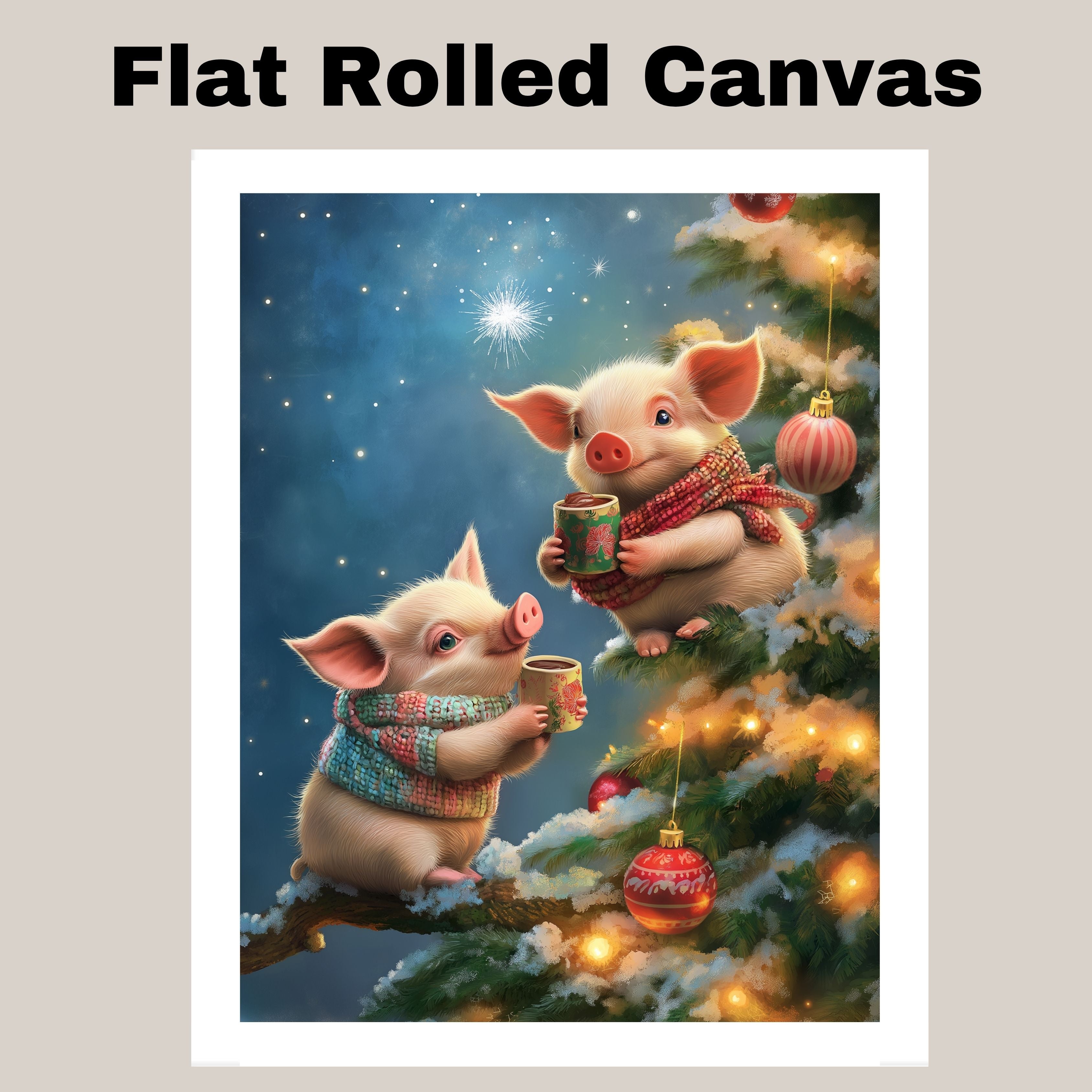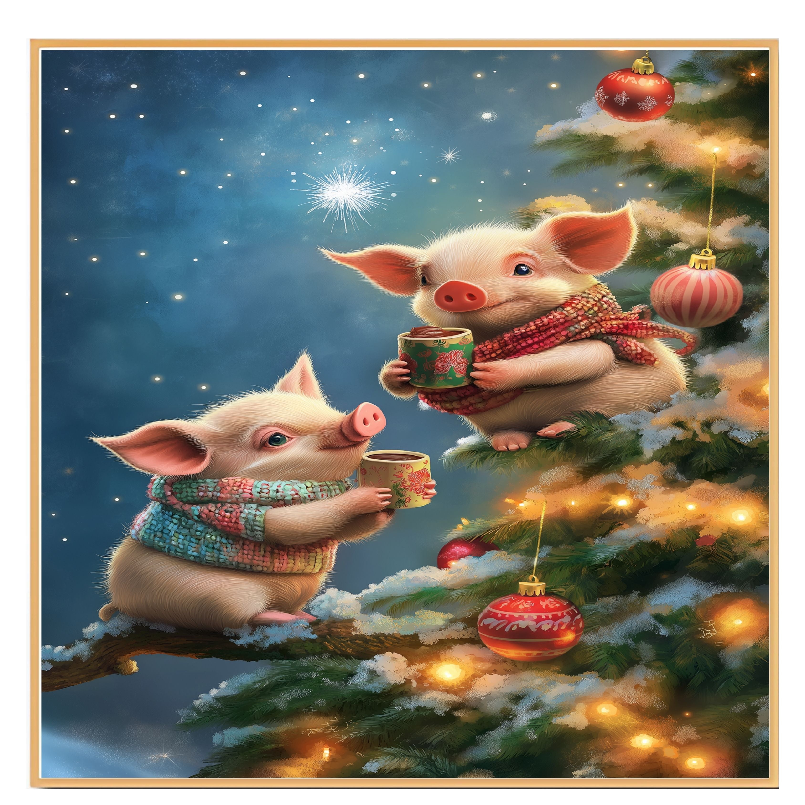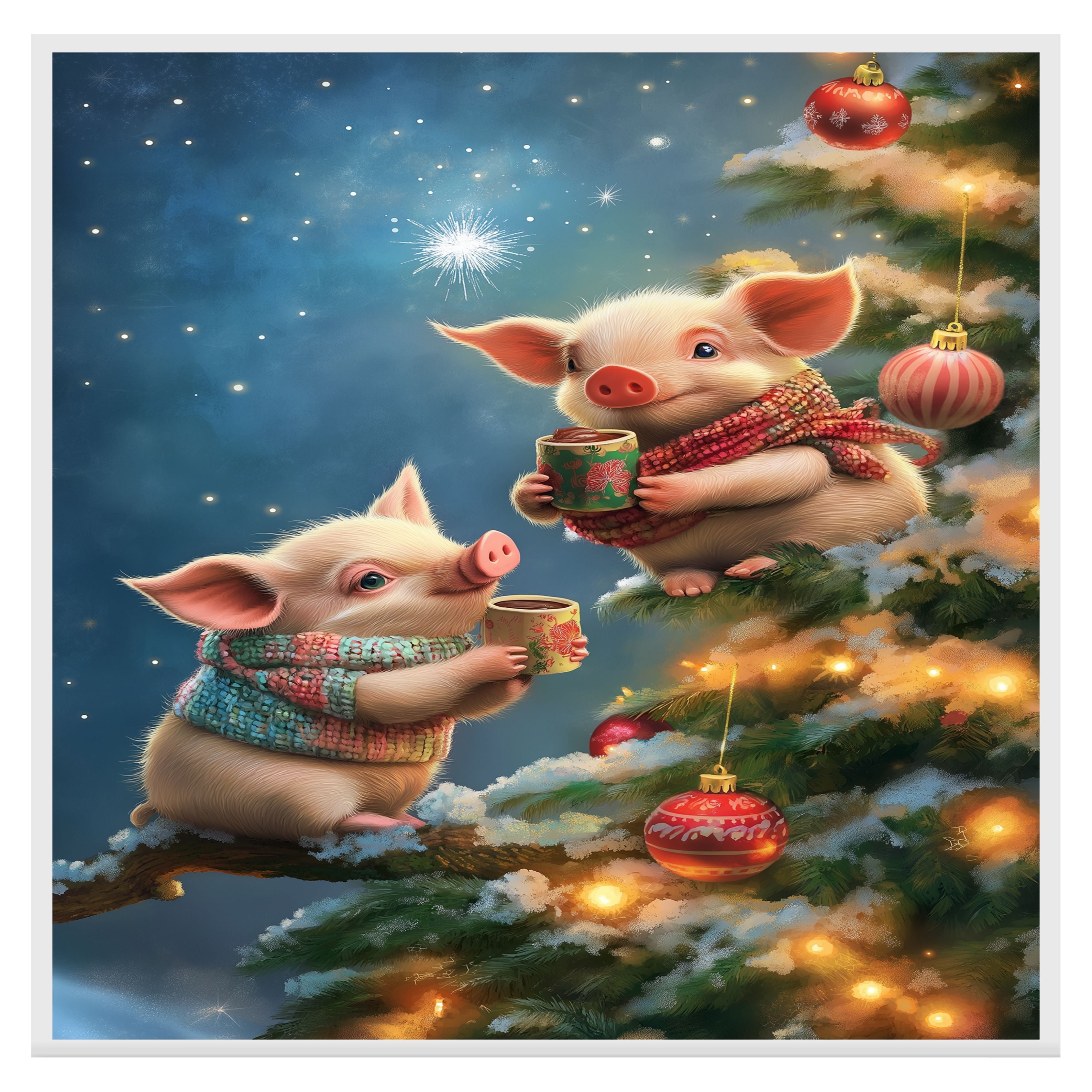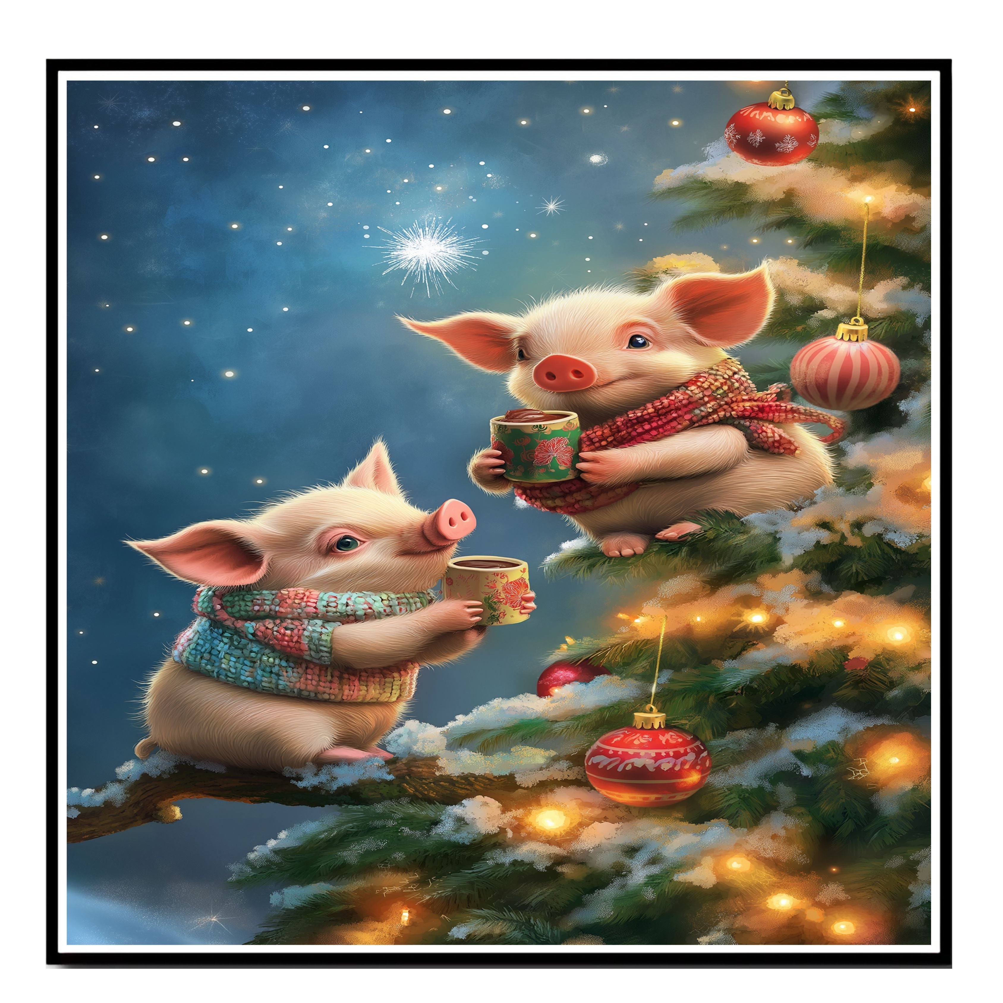 Celebrate the warmth of the season with this delightful Christmas art print featuring two baby piglets nestled in a snow-covered Christmas tree, sipping cocoa from festive mugs. Wrapped in colorful scarves and surrounded by glowing lights and ornaments, this heartwarming scene brings cozy charm to any nursery, children's room, or holiday wall display. A perfect gift for animal lovers and fans of whimsical winter decor.