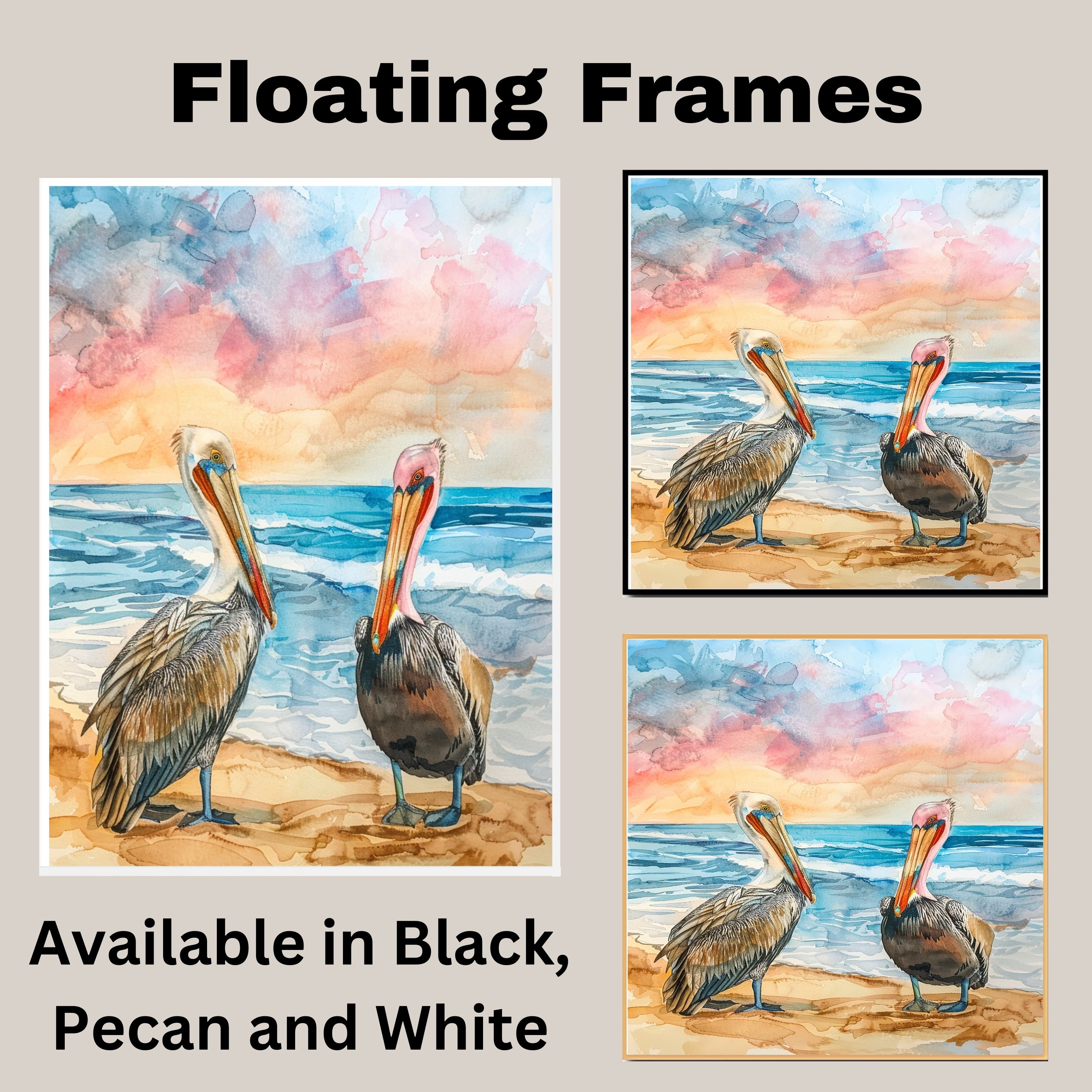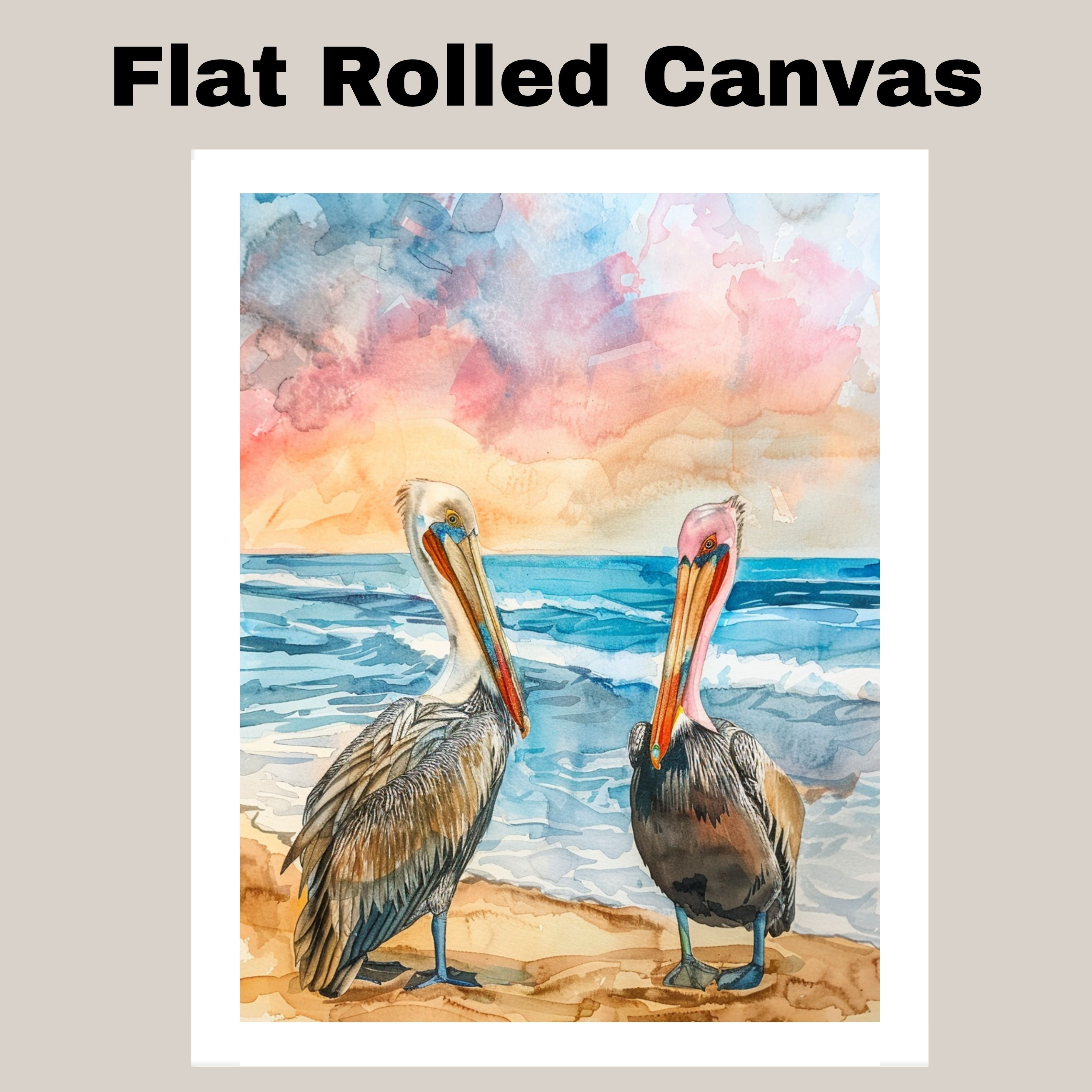 Two Colorful Pelicans on Sandy Beach with Gentle Ocean Waves and Sunset Sky in Vibrant Watercolor Illustration on Ready to Hang 1.5" Thick Canvas Wrap, Floating Framed Canvas, Flat Rolled Canvas