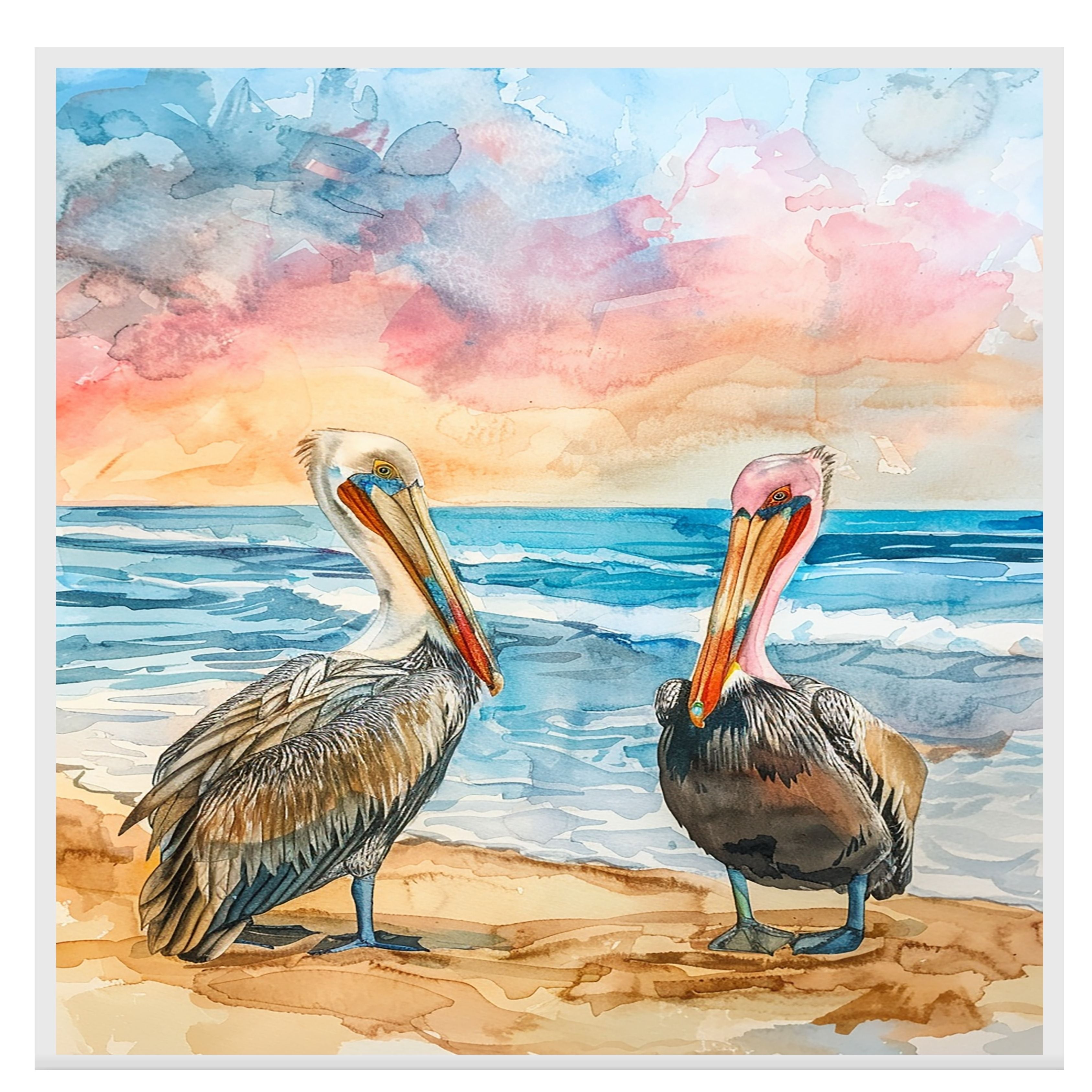 A serene watercolor illustration of two multicolored pelicans standing gracefully on a sandy beach with the ocean behind them. The soft hues of the sunset sky and gentle waves create a peaceful coastal scene. Perfect for ocean lovers and bird art enthusiasts seeking a vibrant yet calming focal point for any space.