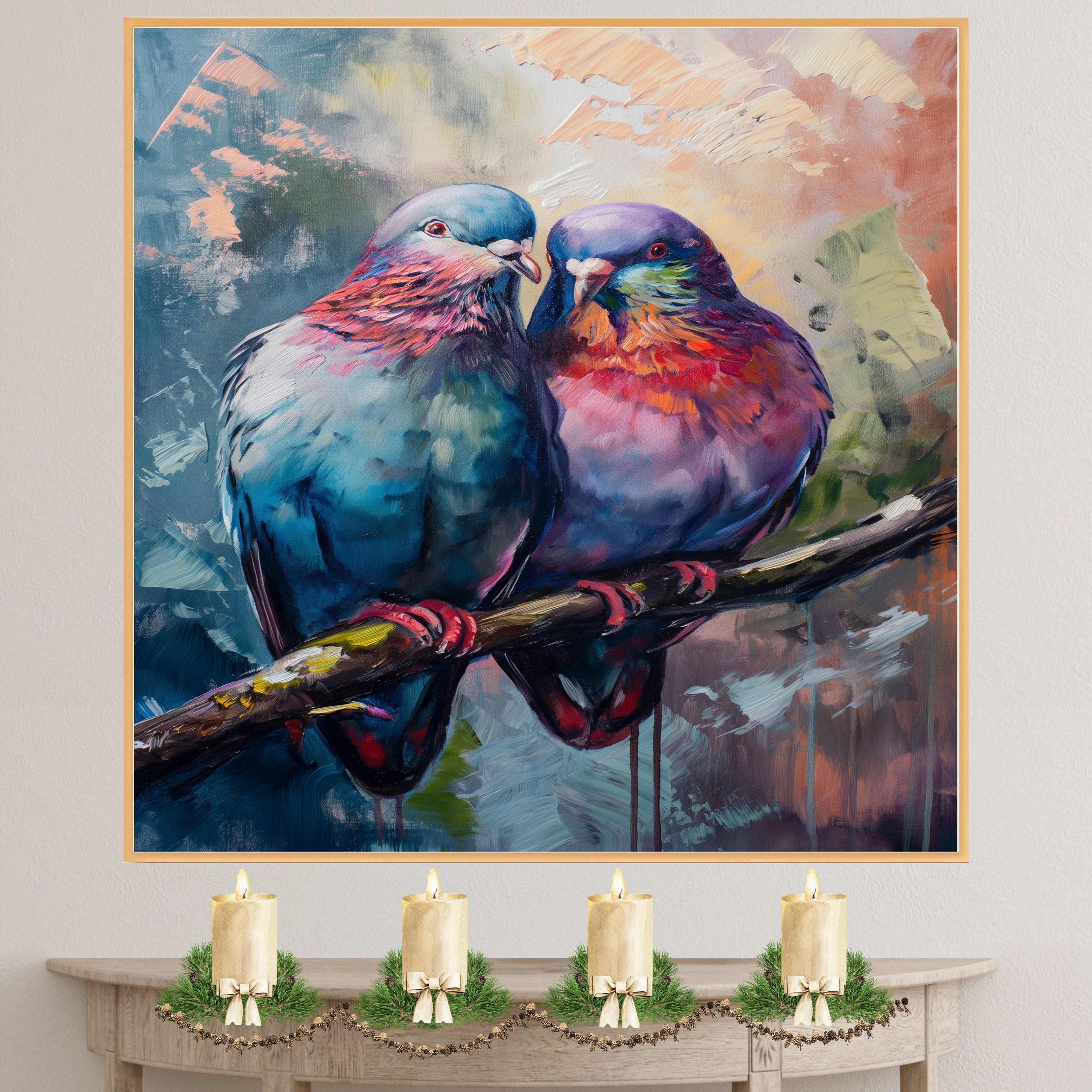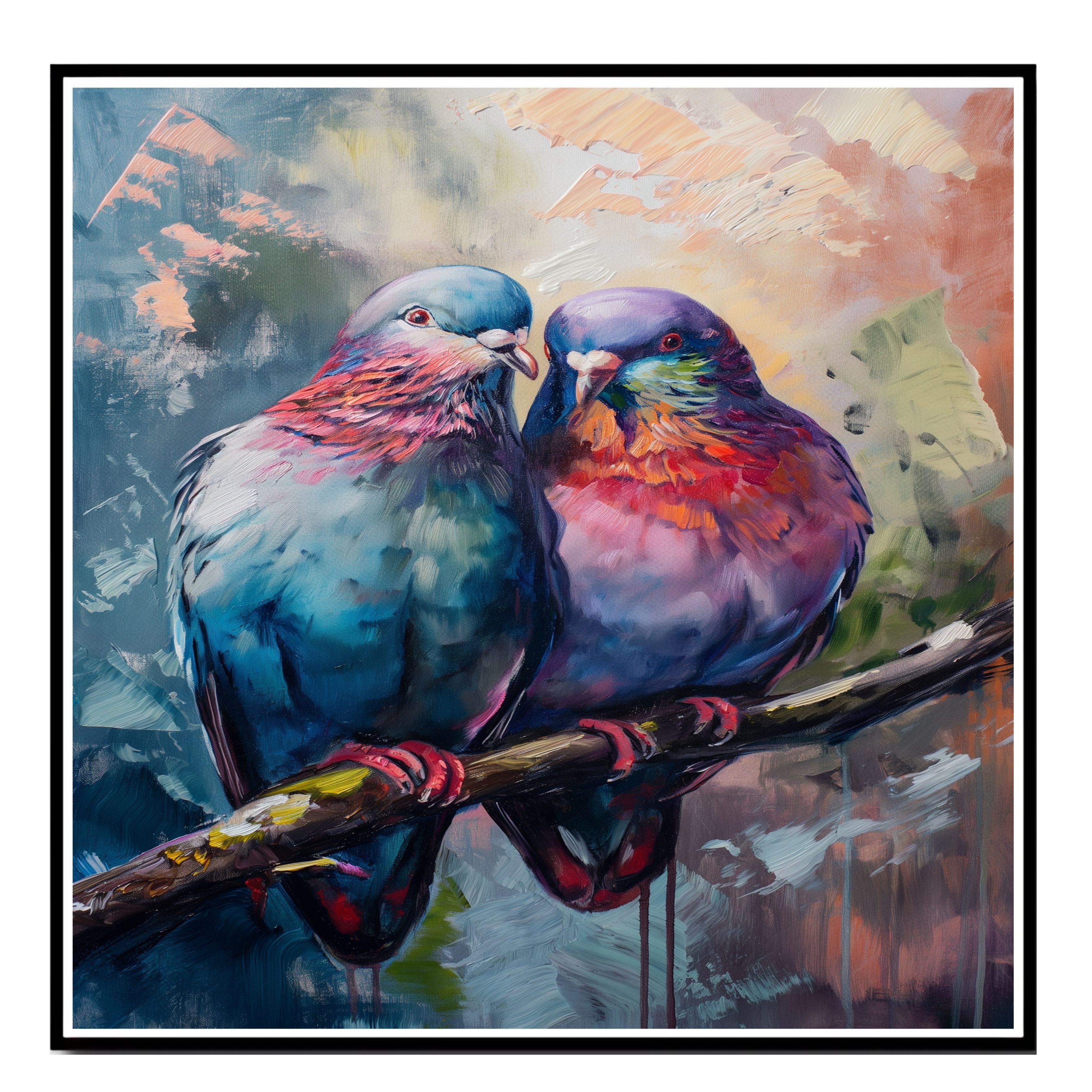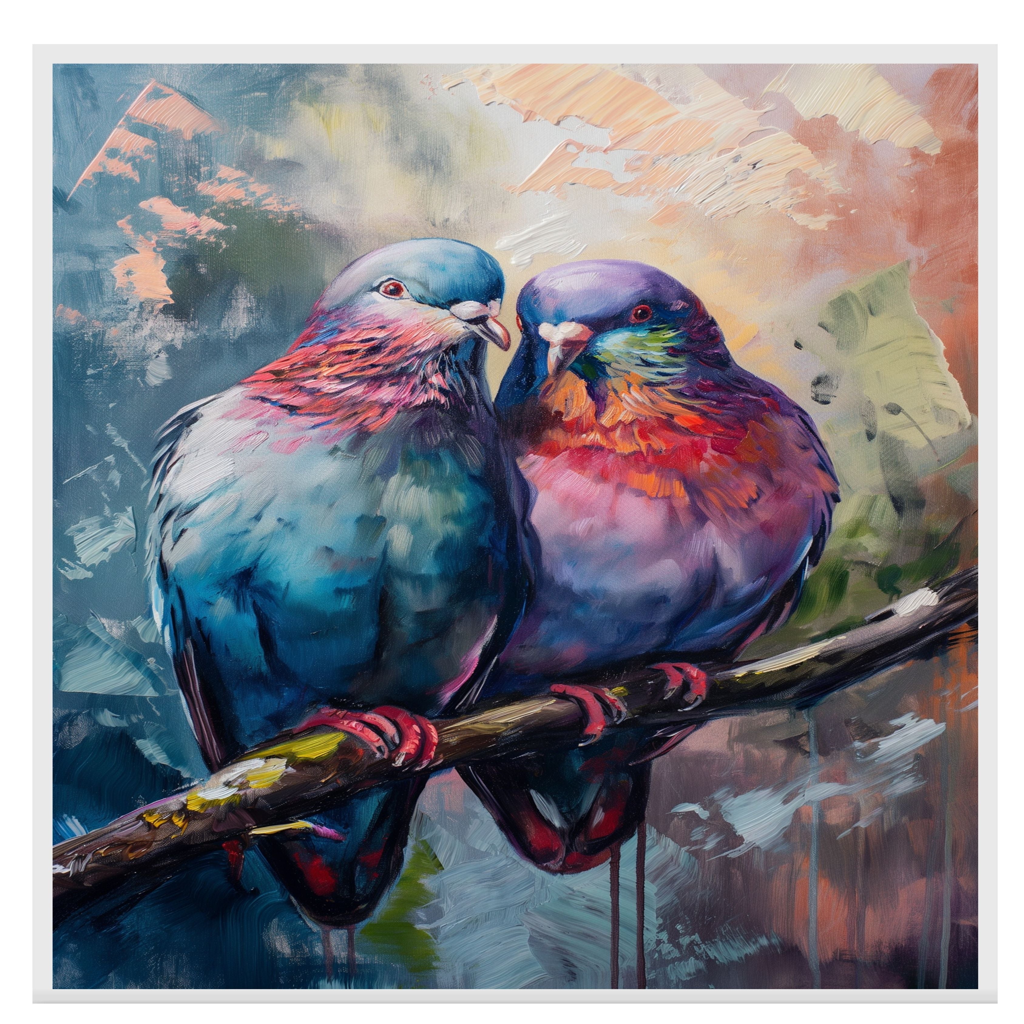 This painting showcases two pigeons perched closely on a branch, their feathers bursting with shades of blue, violet, and crimson. The soft pastel backdrop enhances the vibrancy of their iridescent plumage, reflecting a peaceful bond and striking natural elegance. Perfect for adding a sense of harmony and color to any room, this artwork celebrates nature's detail and the beauty of companionship.