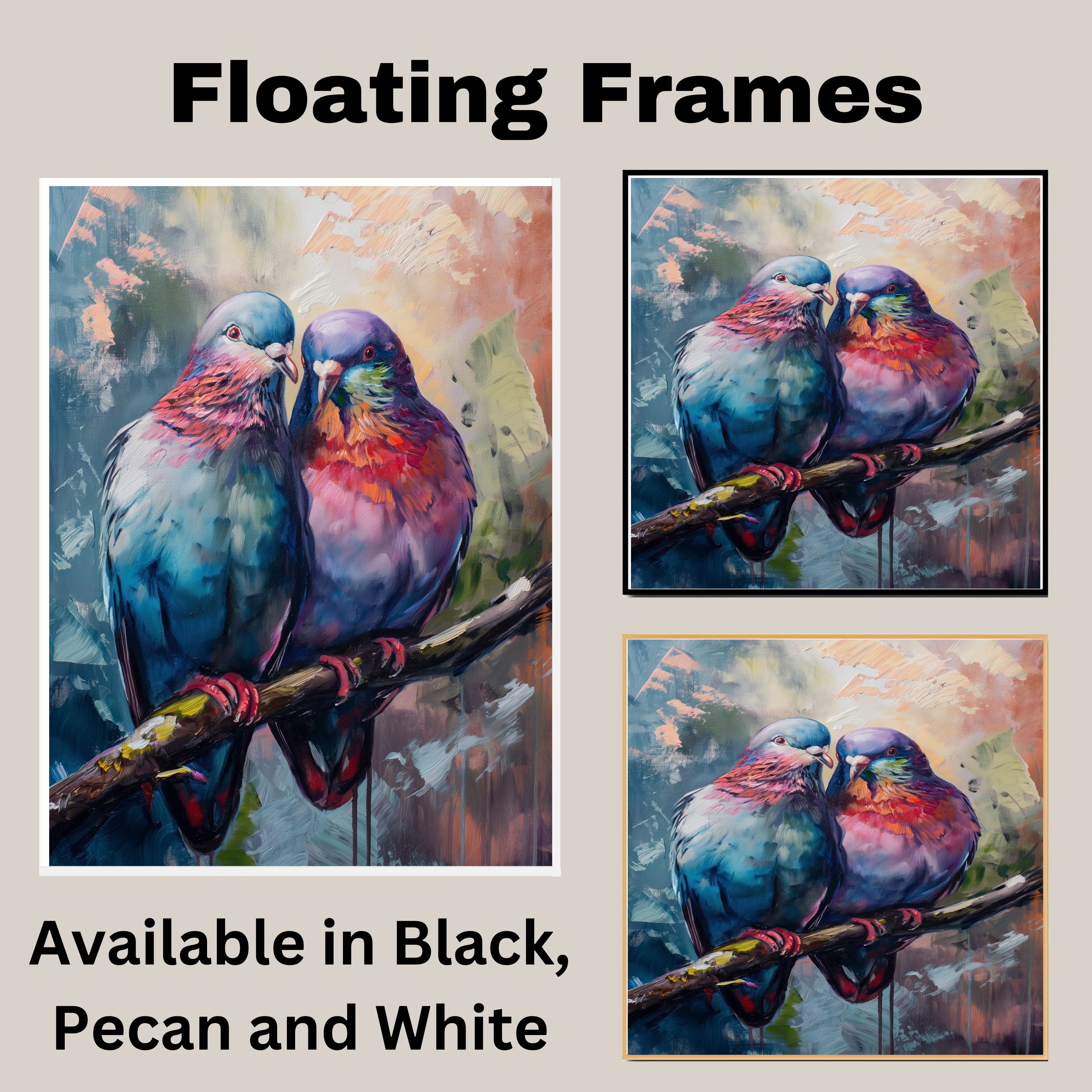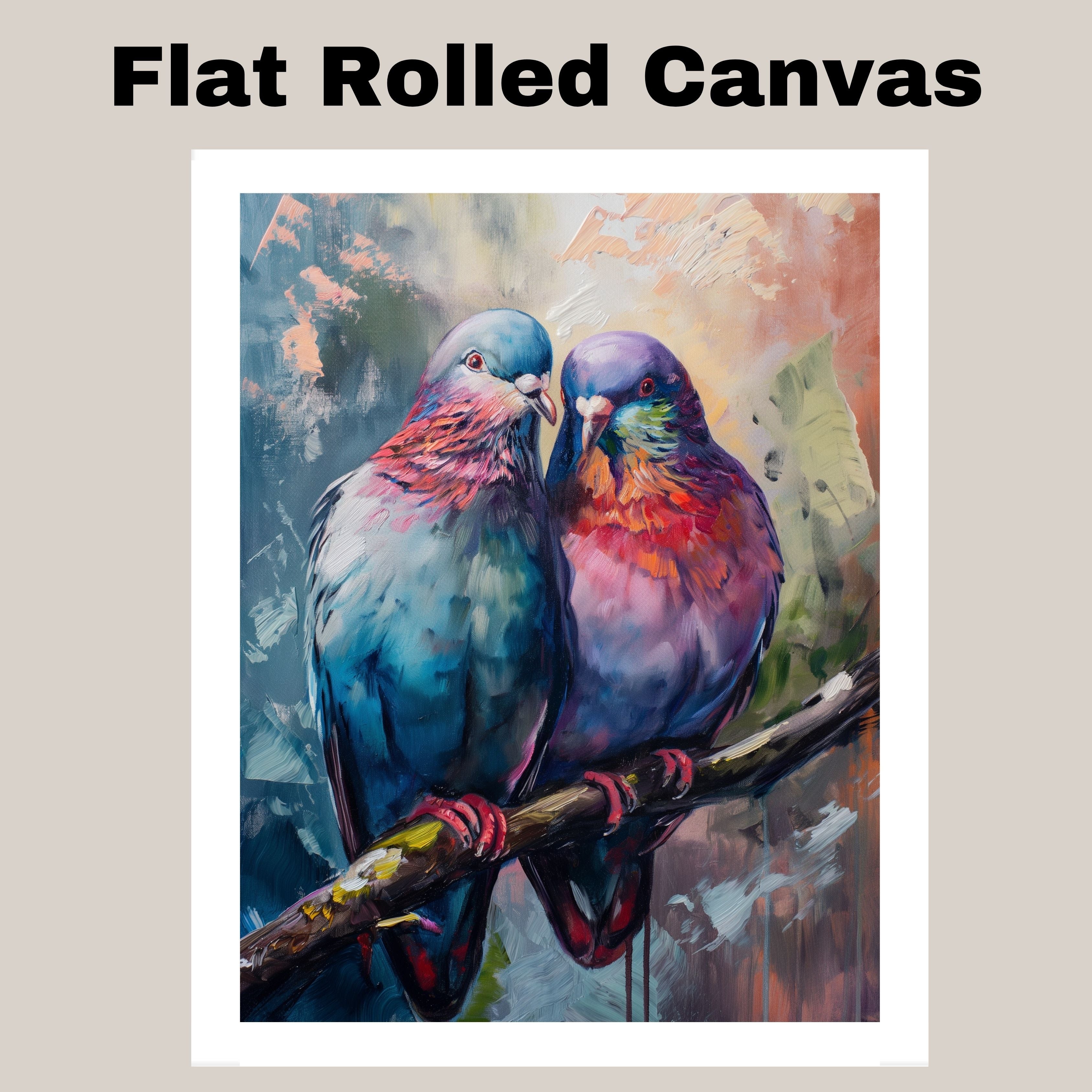 Two Colorful Pigeons Sitting Together on a Branch with Iridescent Feathers in Soft Pastel Background Highlighting Their Unique Plumage and Companionship on Ready to Hang 1.5" Thick Canvas Wrap, Floating Framed Canvas, Flat Rolled Canvas