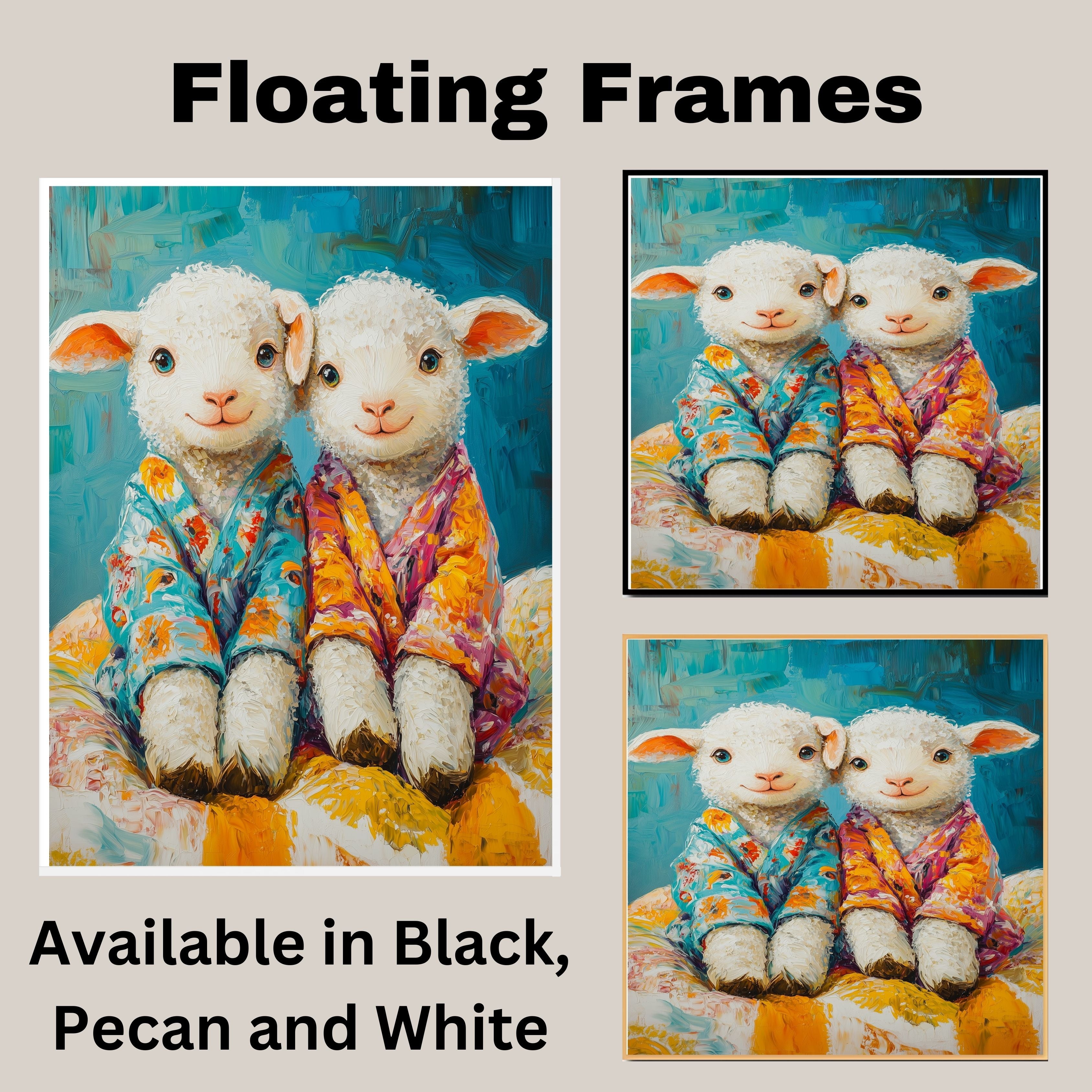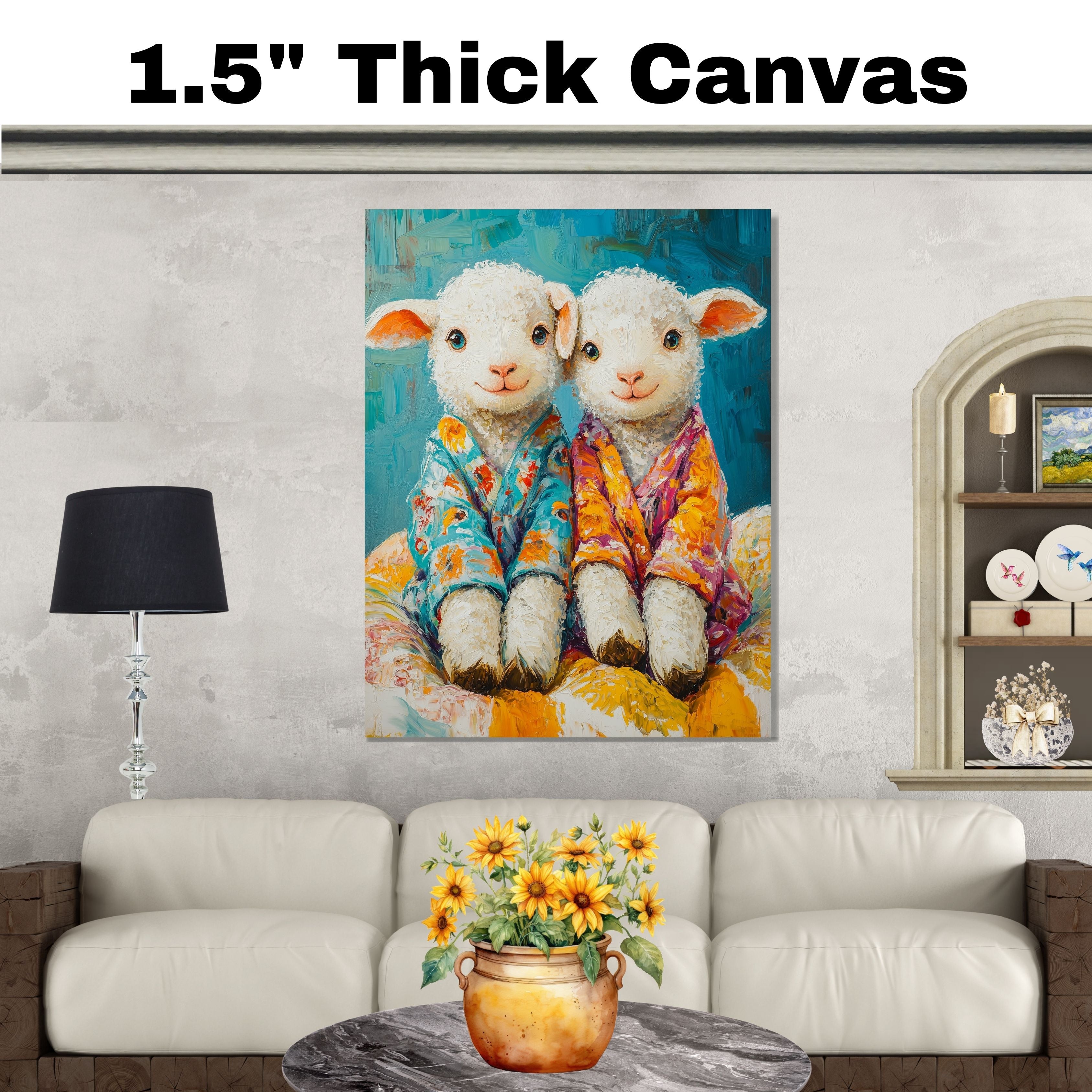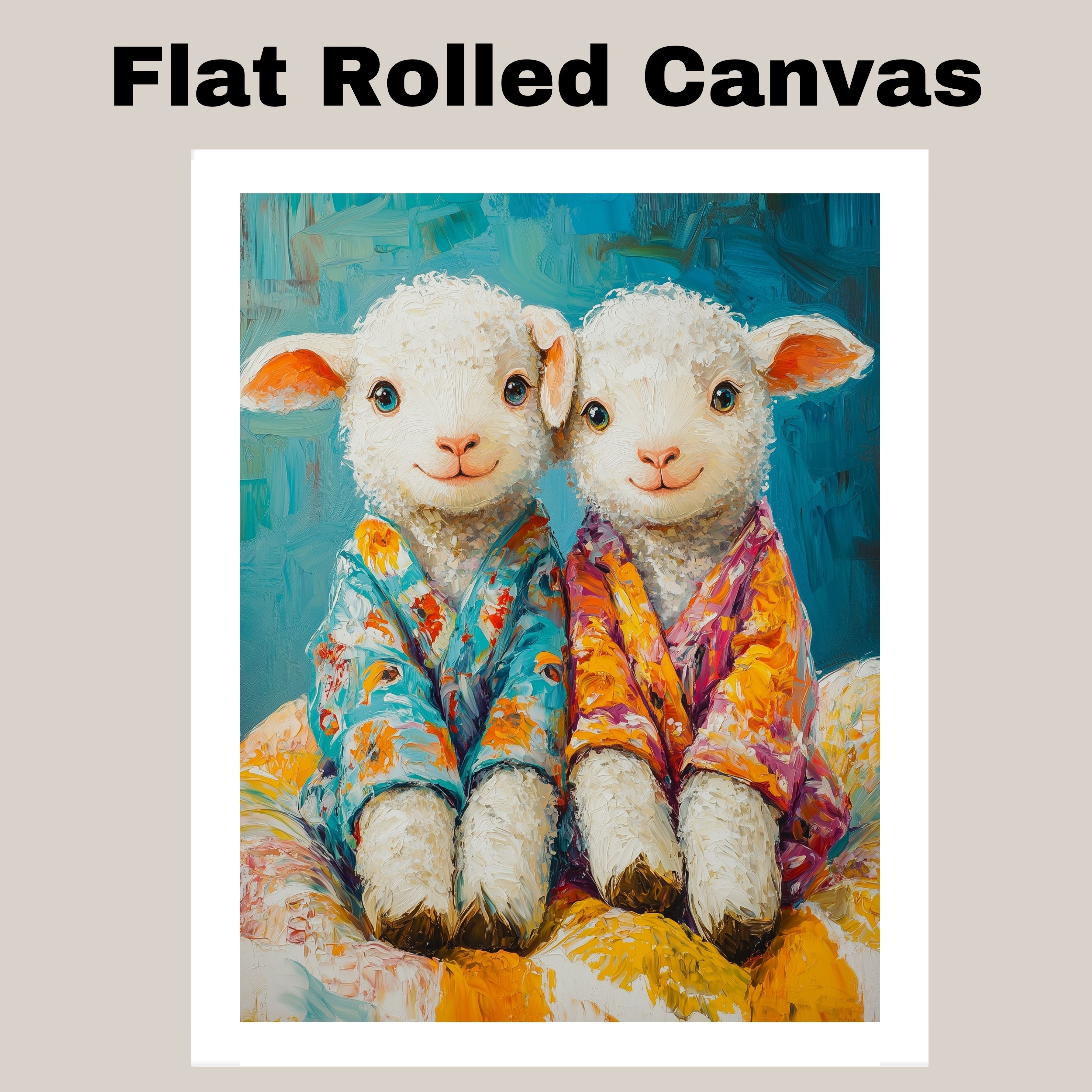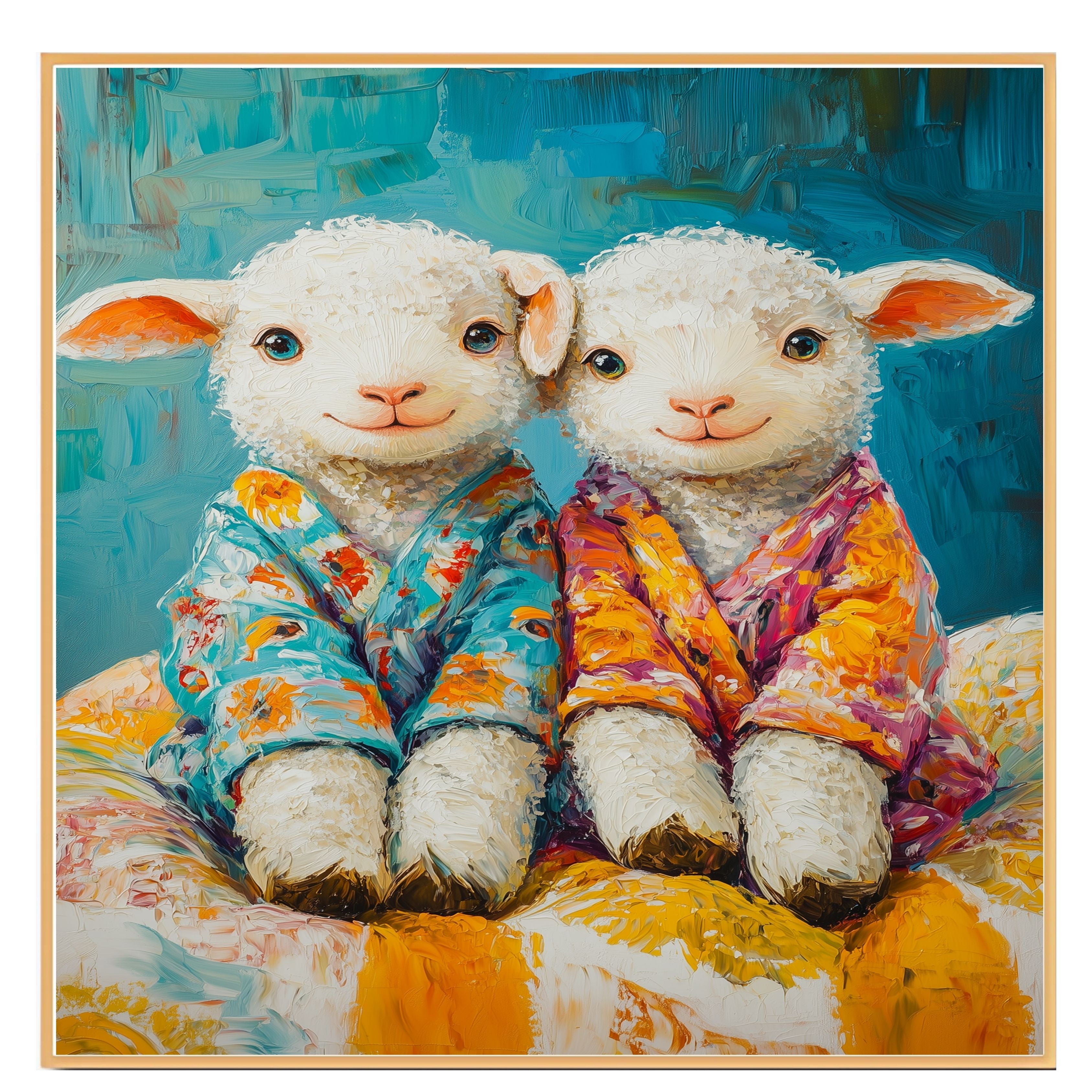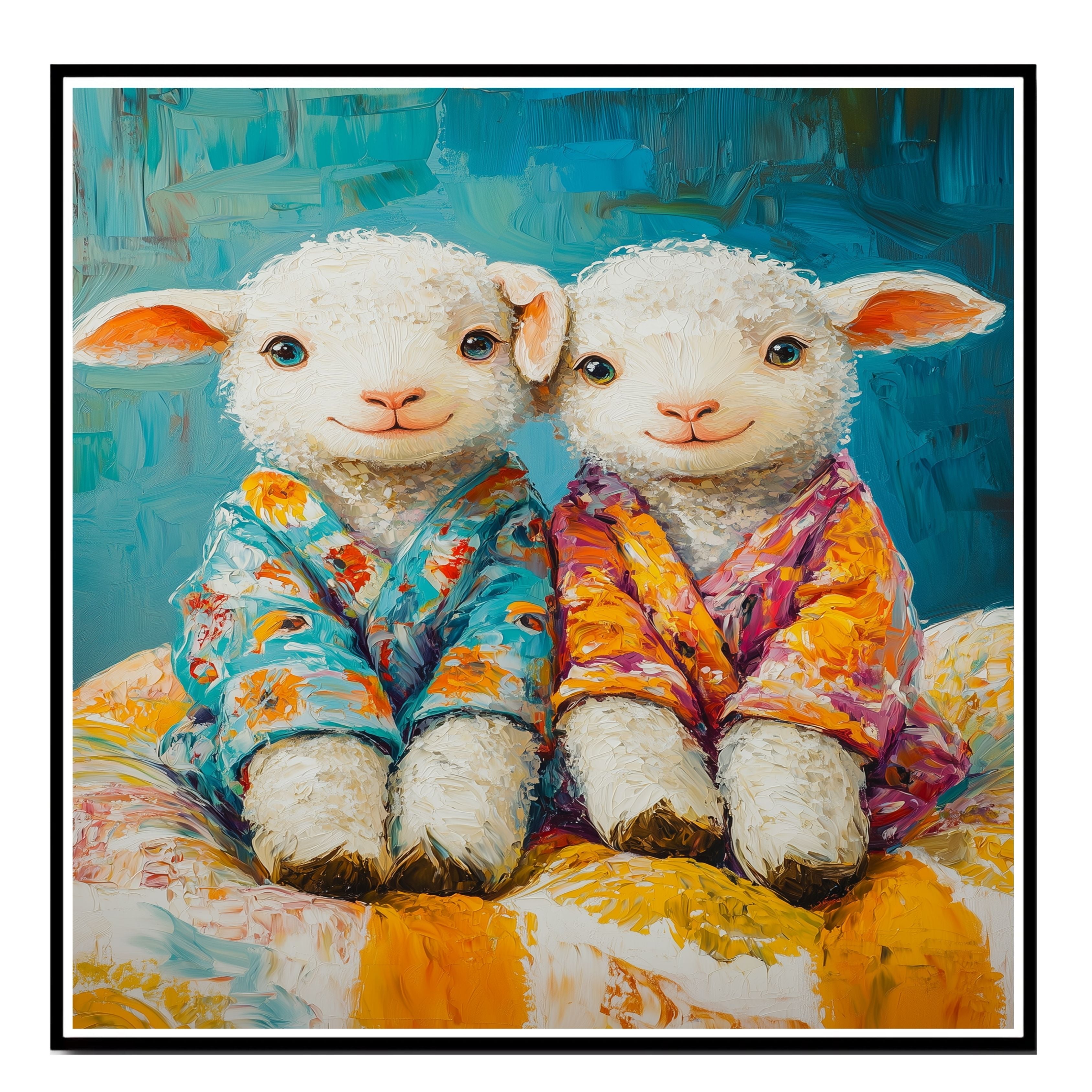 This delightful painting captures two fluffy lambs dressed in cheerful, colorful pajamas, sitting side by side in a heartwarming pose. With expressive eyes and soft, textured brushwork, this print is ideal for nurseries, children's spaces, or anyone who loves farm animals with a whimsical twist. A perfect gift or decor accent for spring, Easter, or any room needing a little warmth and joy.