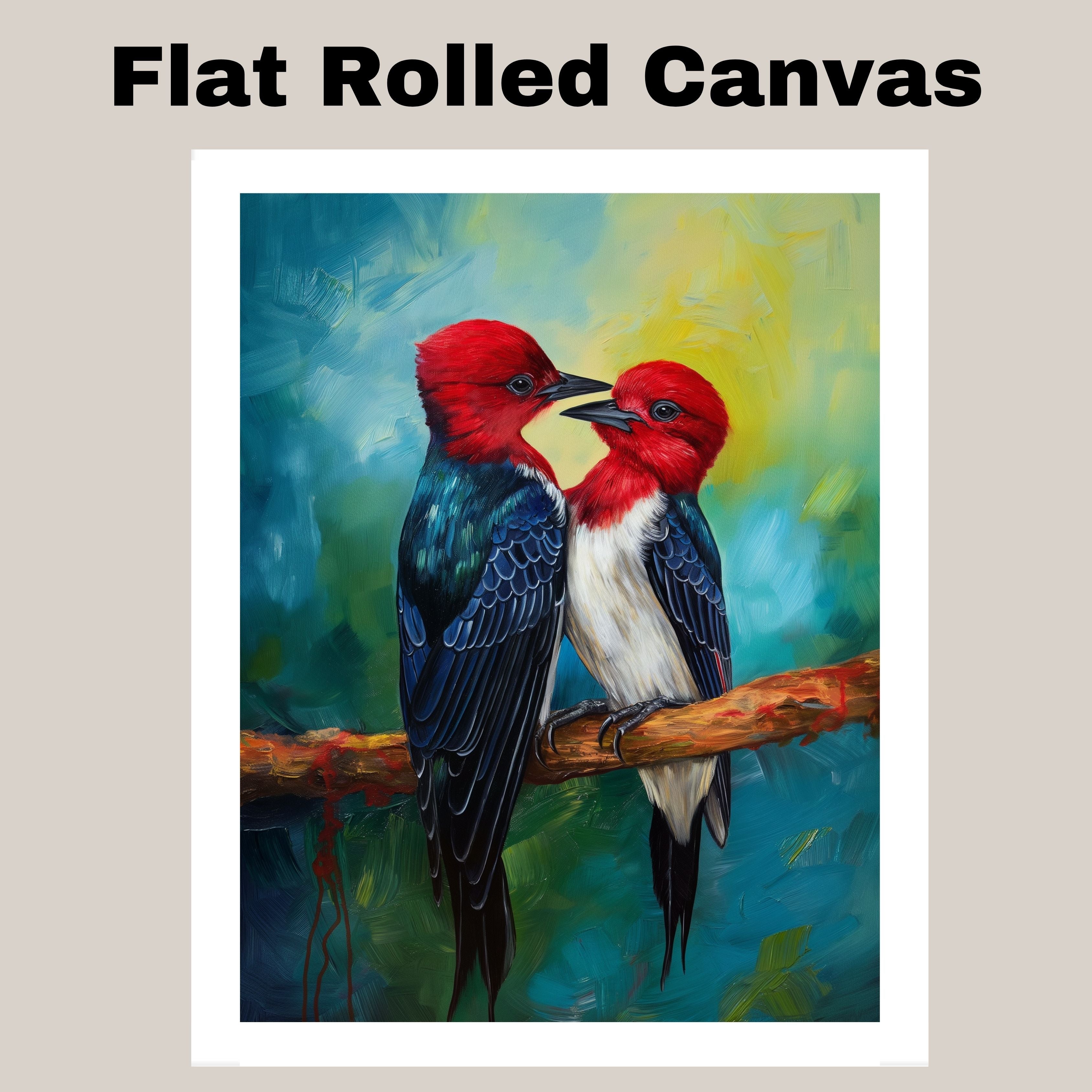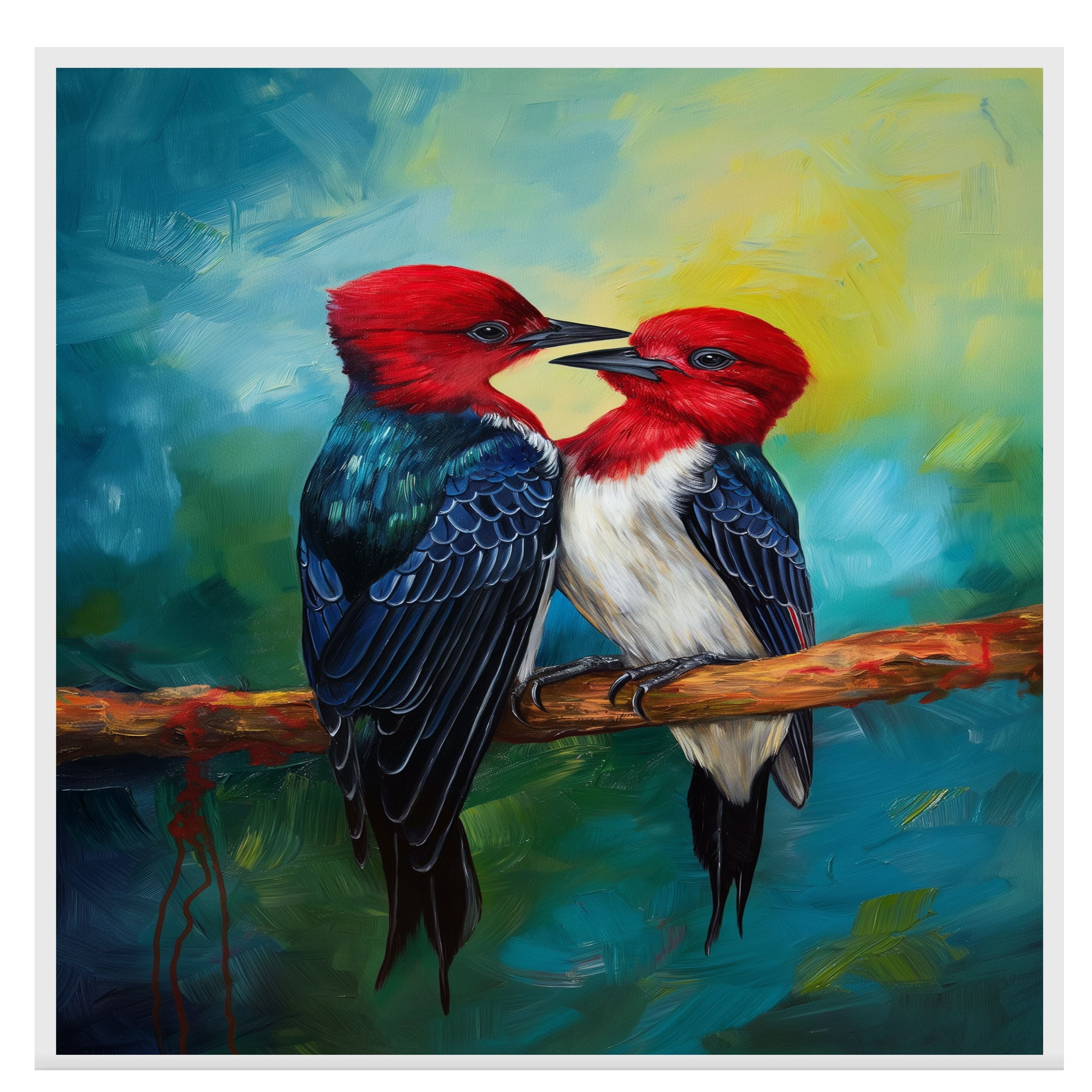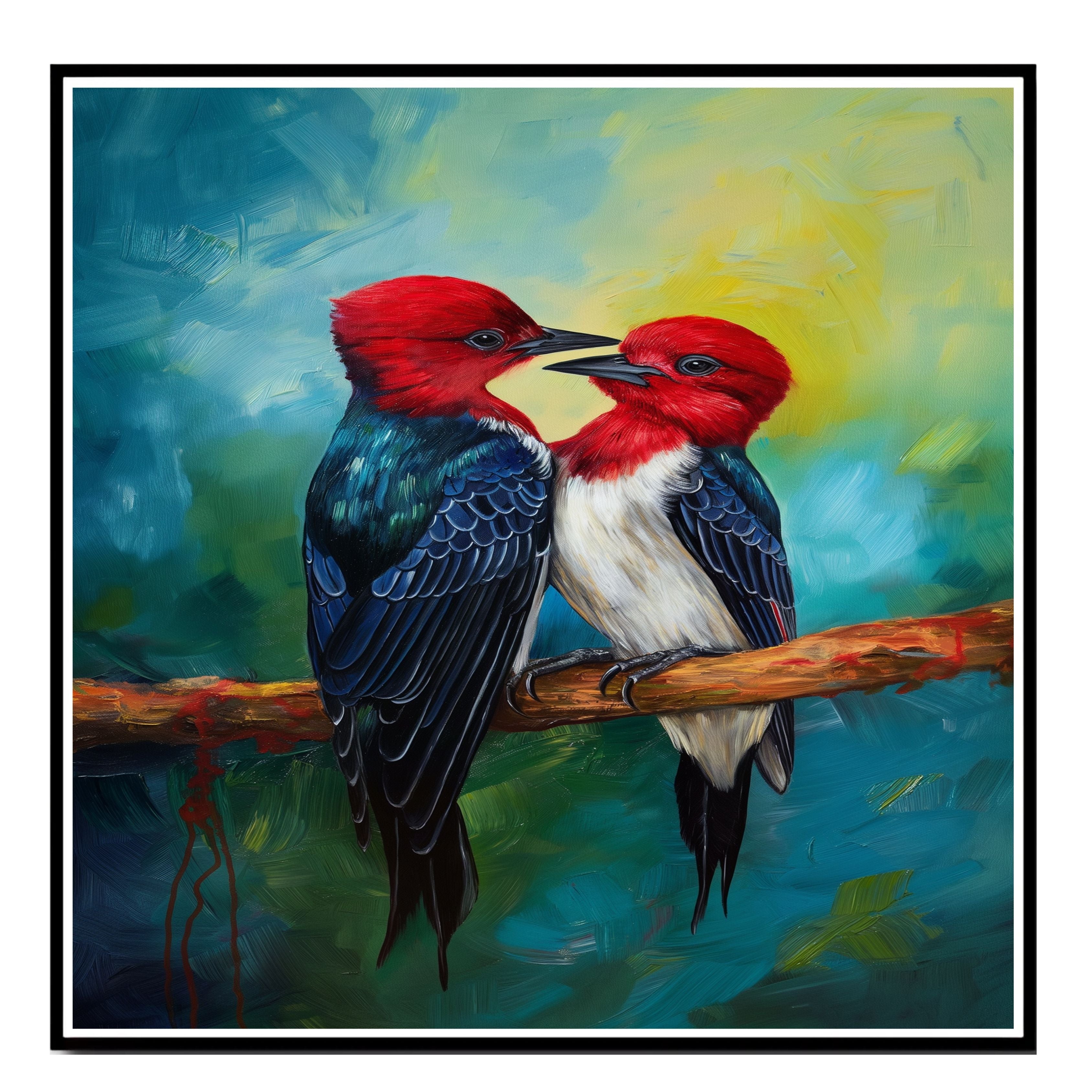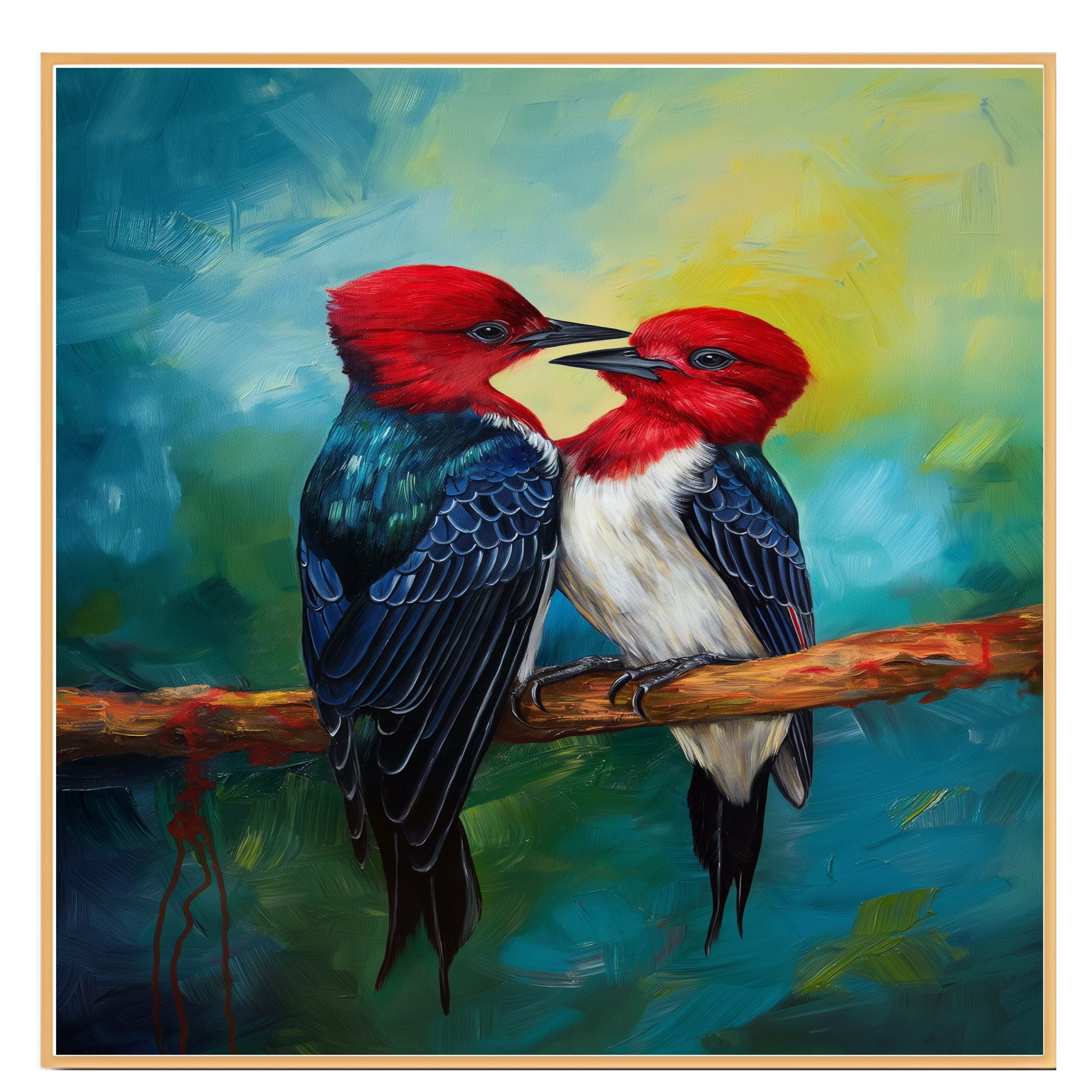 This striking painting captures two red-headed birds perched tenderly on a branch, set against a lush green and blue backdrop. Their vivid red heads and navy-blue feathers contrast beautifully with the serene background, creating a romantic and visually compelling scene. A perfect choice for bird enthusiasts or anyone seeking a vibrant nature-inspired piece to elevate their living space.