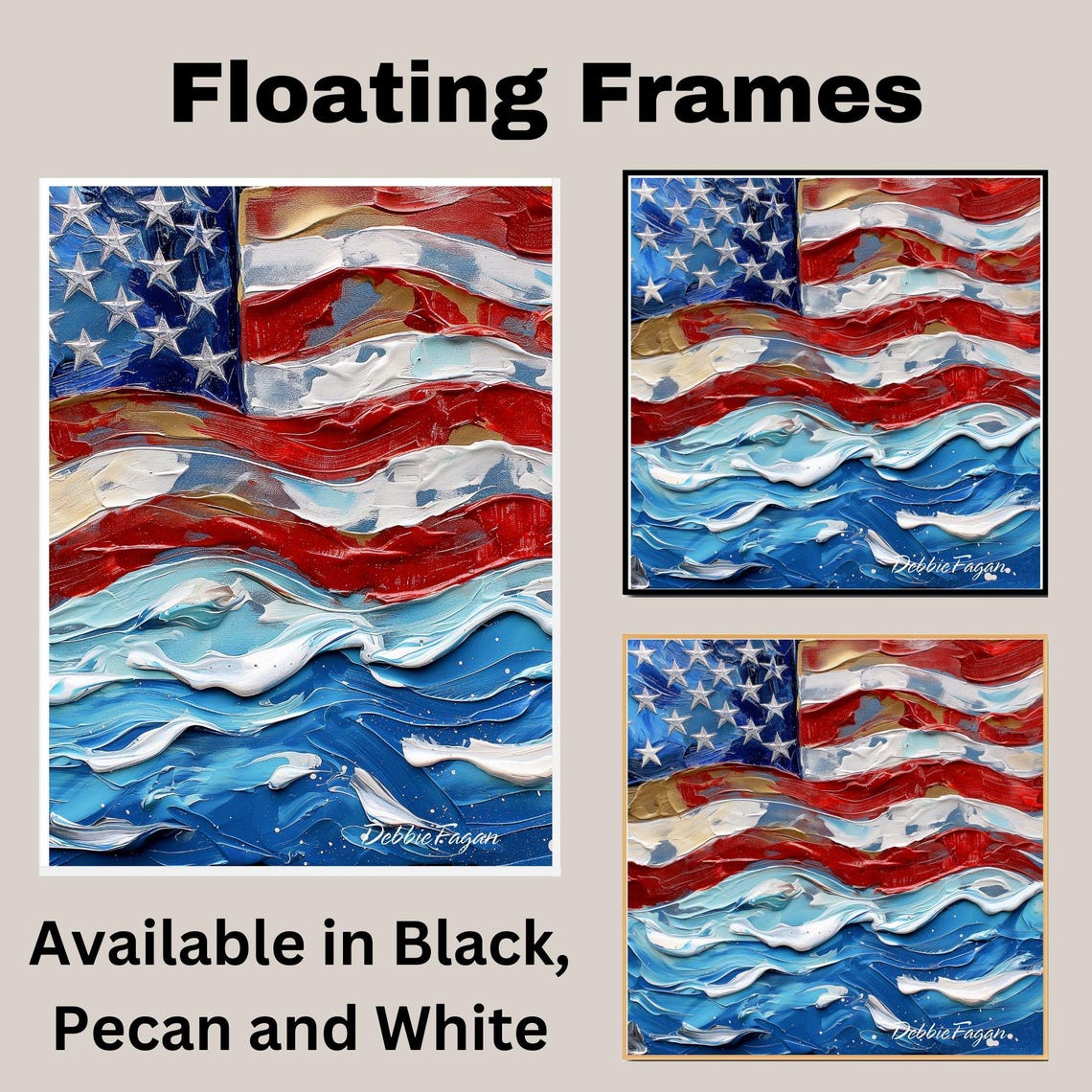 1.5" Thick Floating Framed Canvas: Available in Black, Pecan, and White Grain. Durable shrink-resistant frame. Comes with easy-to-install hanging kits, ready for immediate display.