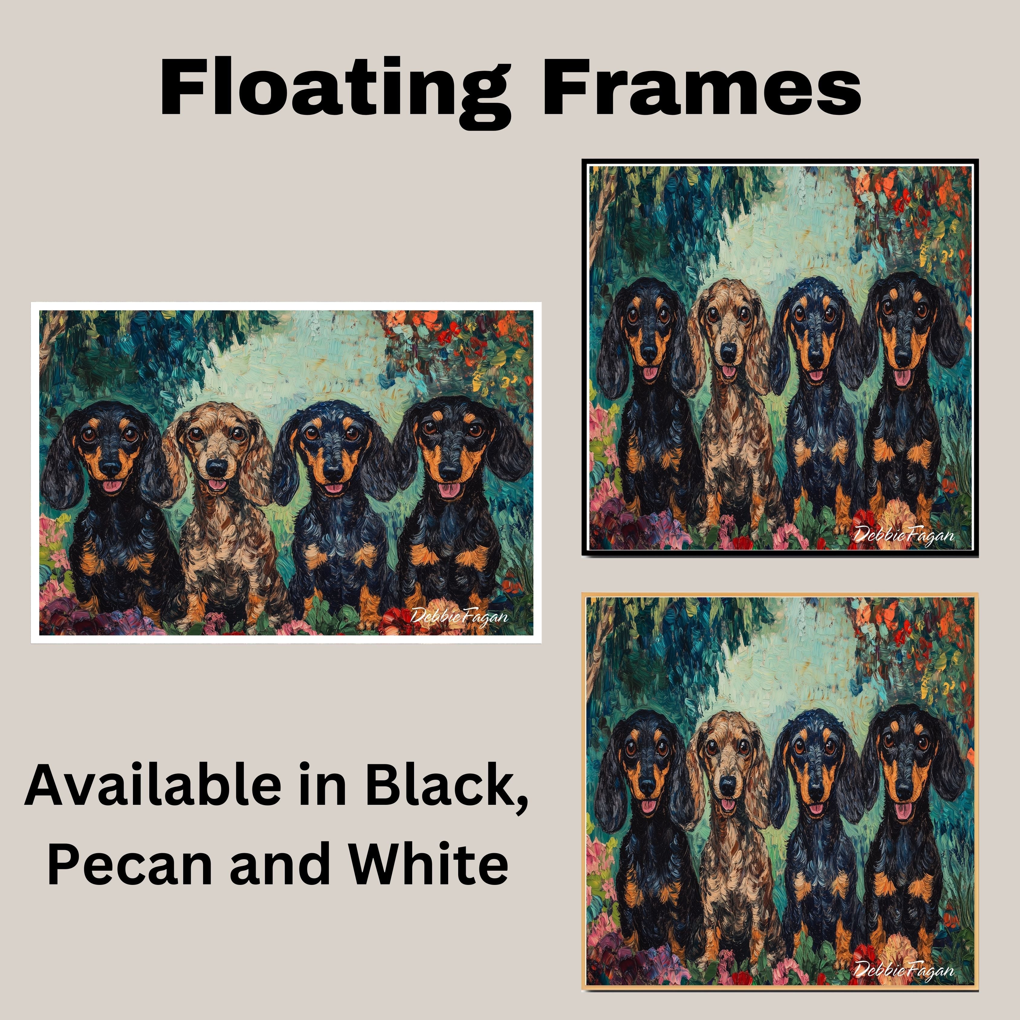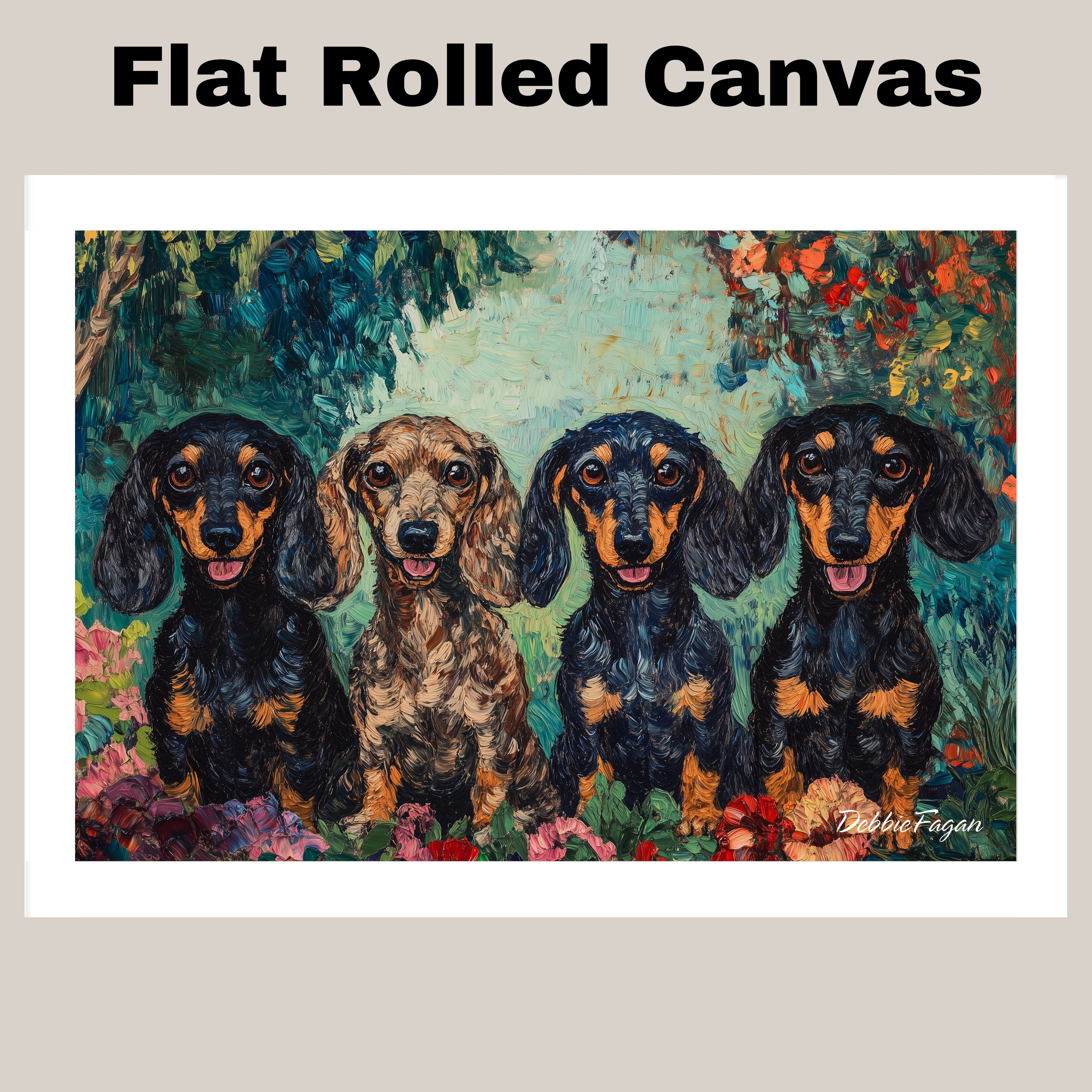 Van Gogh-Style Canvas Painting of Four Dachshund Dogs in a Colorful Floral Garden Setting on Ready to Hang 1.5" Thick Canvas Wrap, Floating Framed Canvas, Flat Rolled Canvas