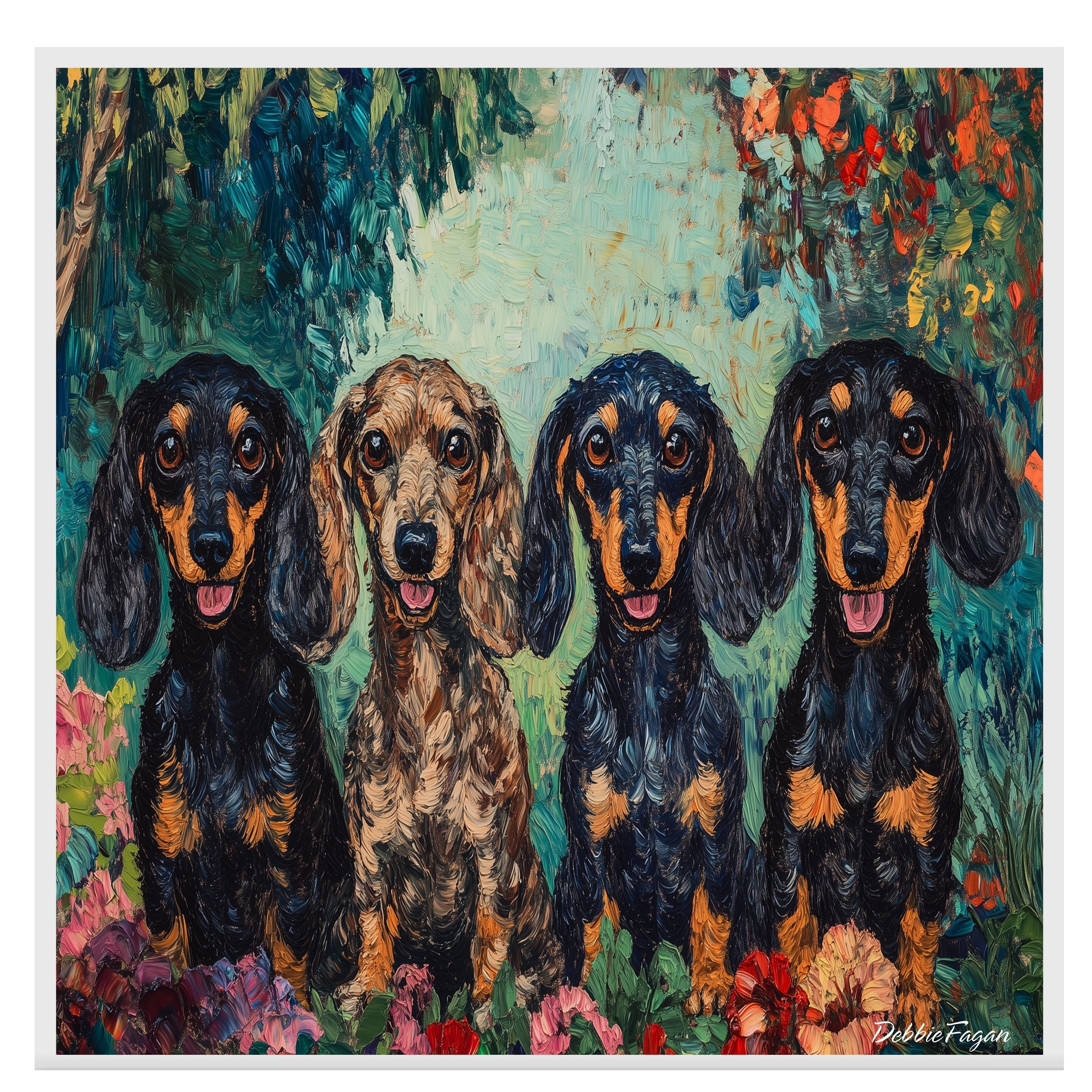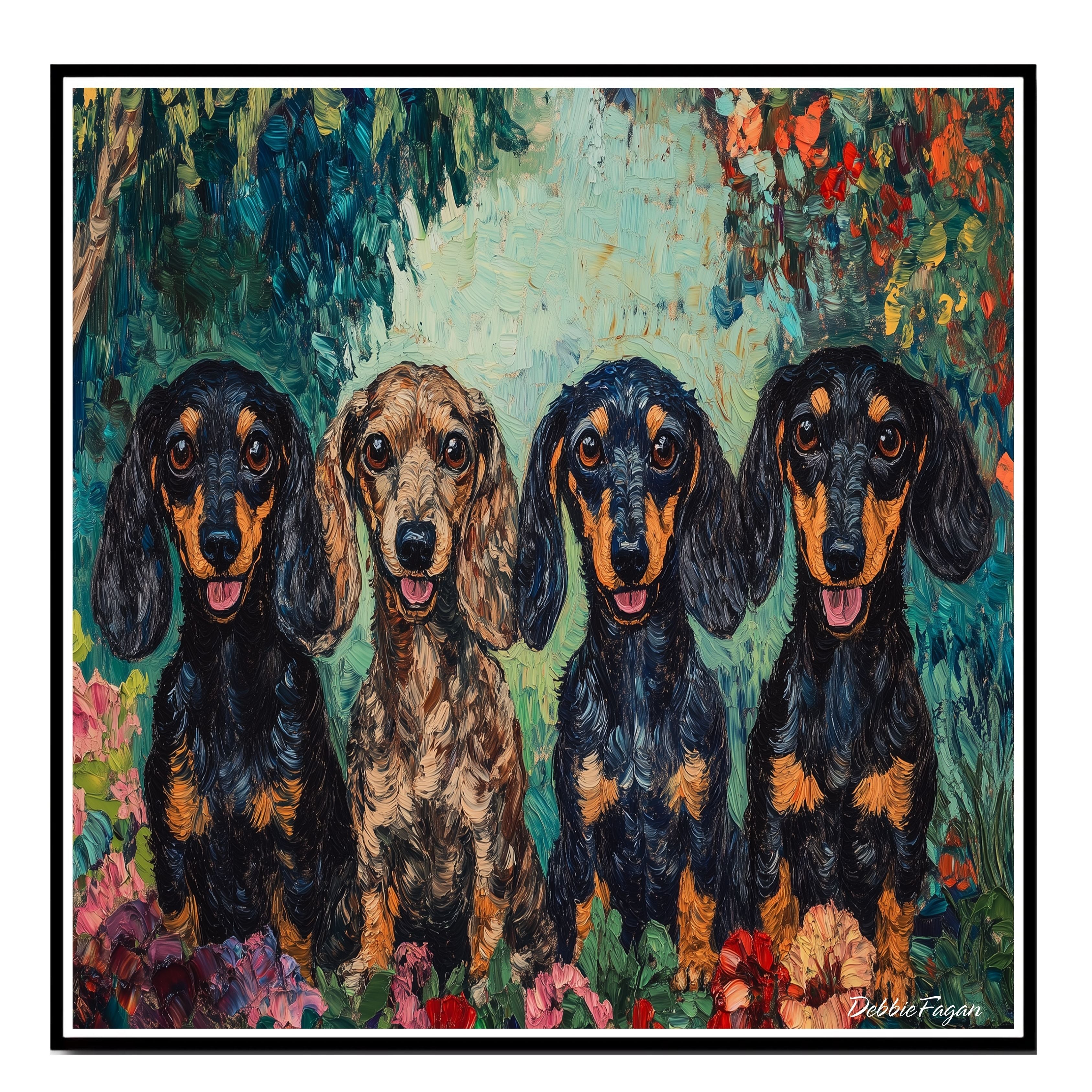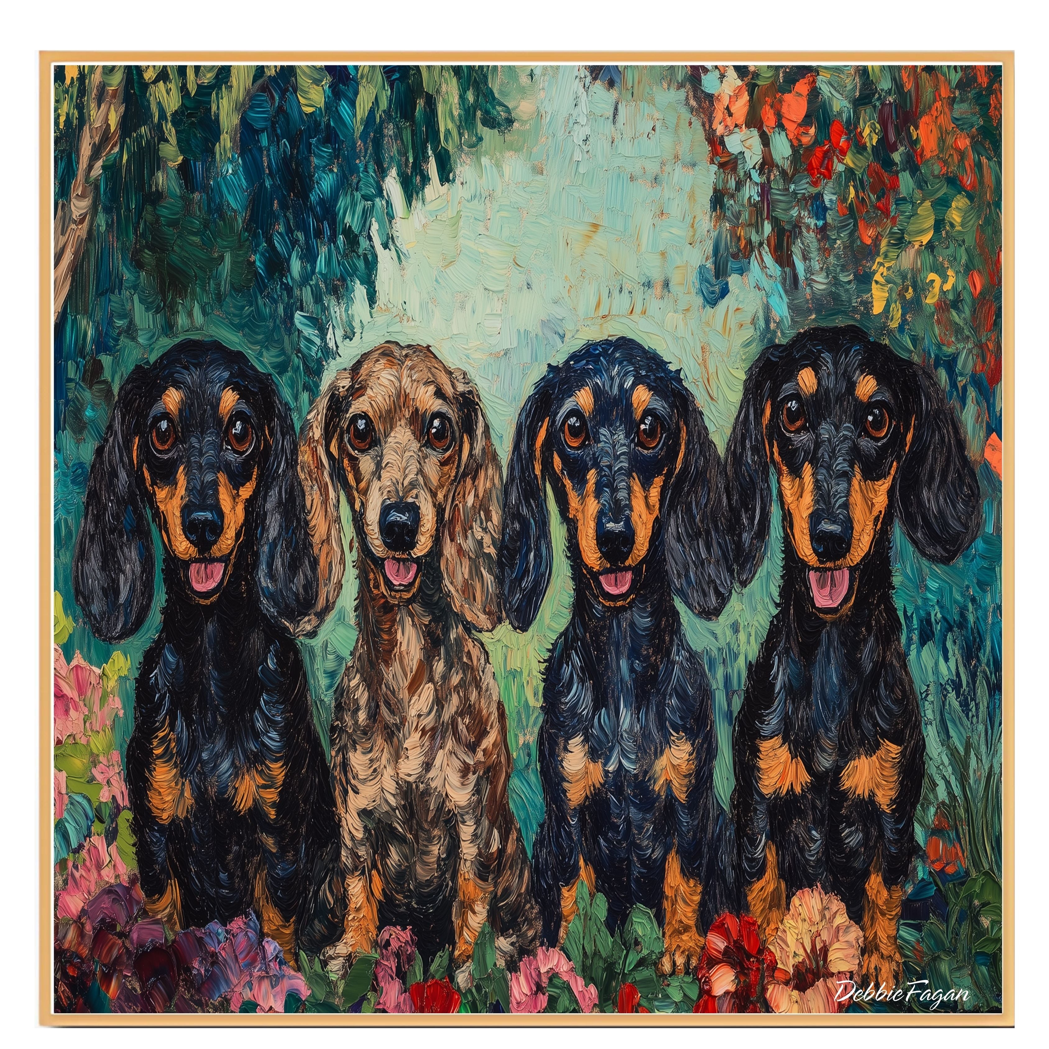 A charming canvas artwork inspired by Van Gogh's bold brushwork, featuring four dachshunds with expressive eyes and playful poses. Surrounded by rich floral textures and swirling background tones, this piece captures the heartwarming spirit of these beloved pups in a vivid painterly style.