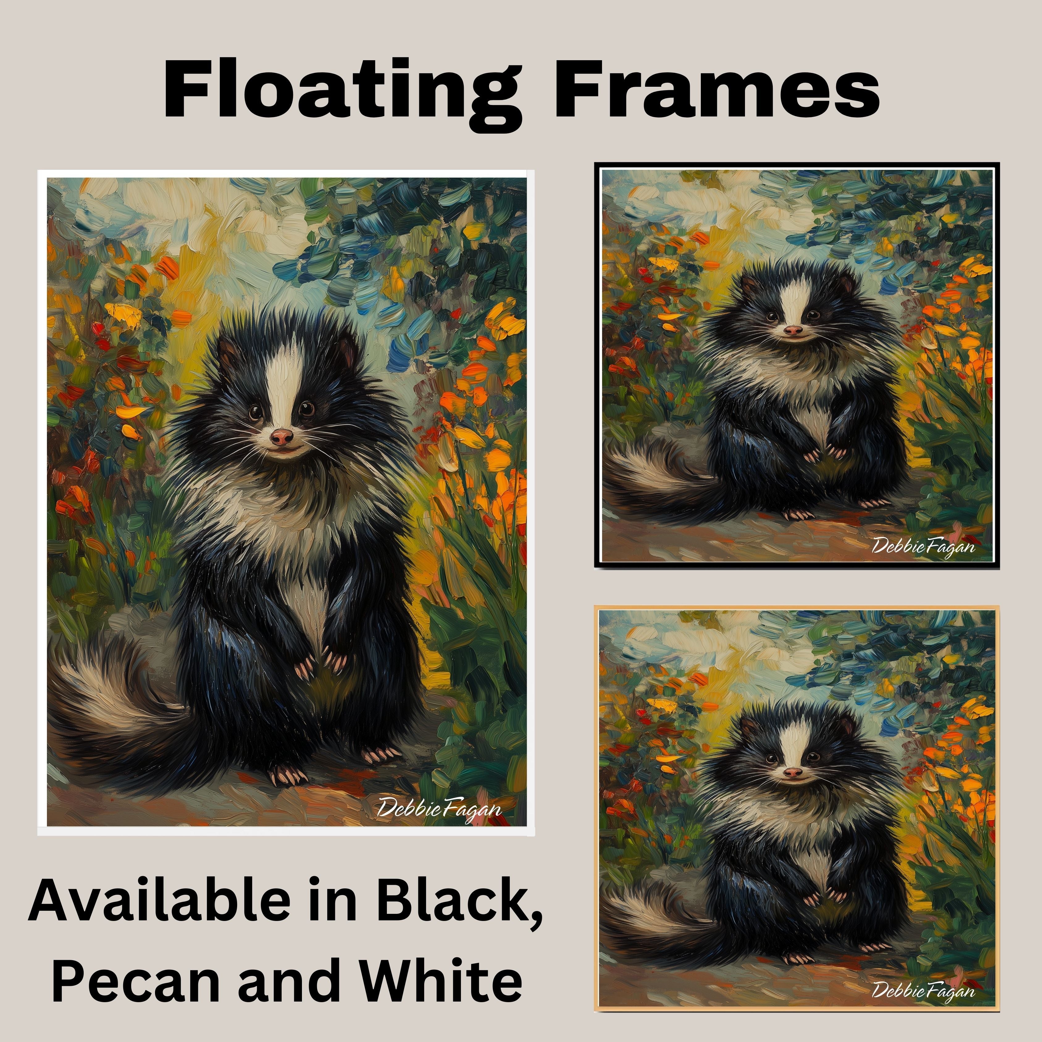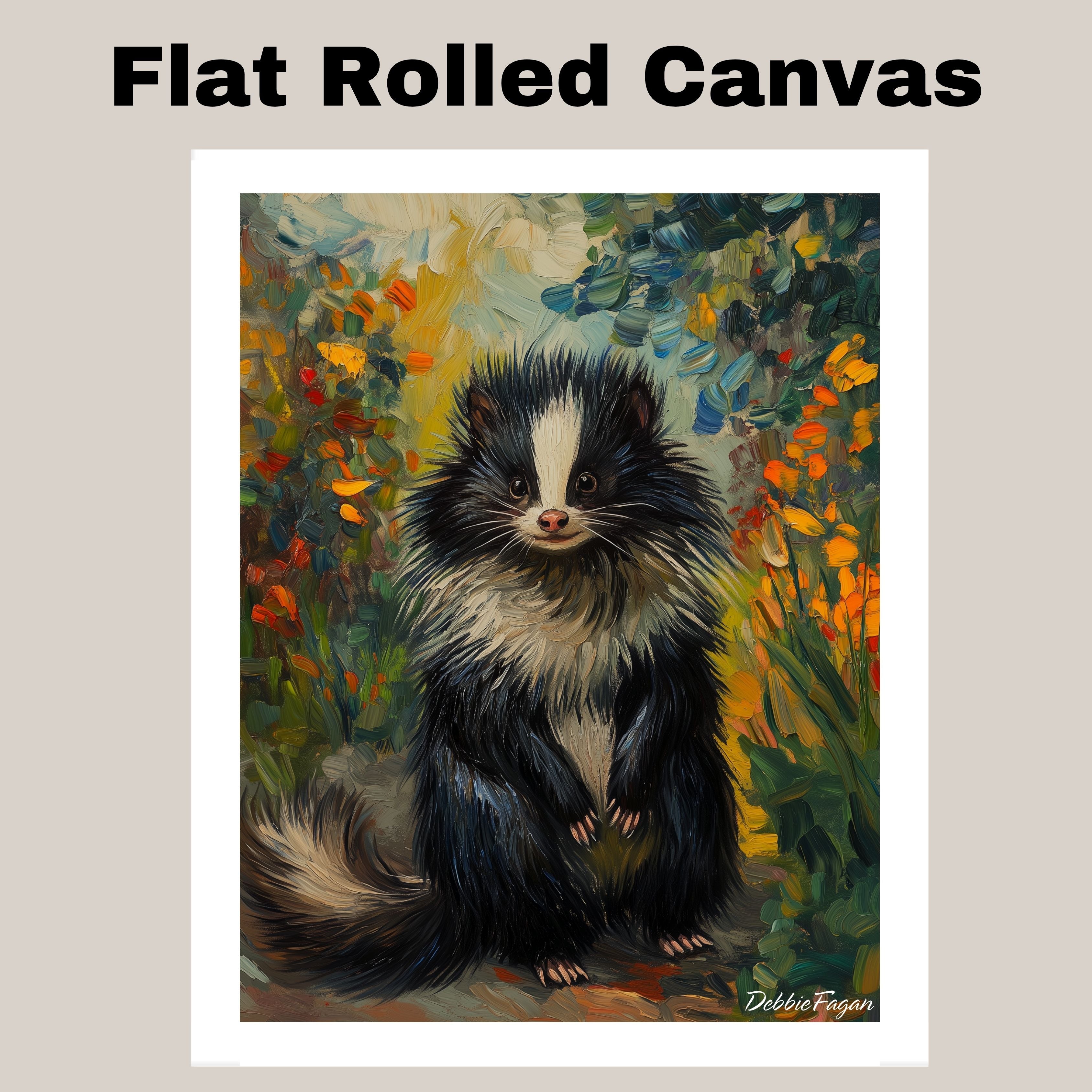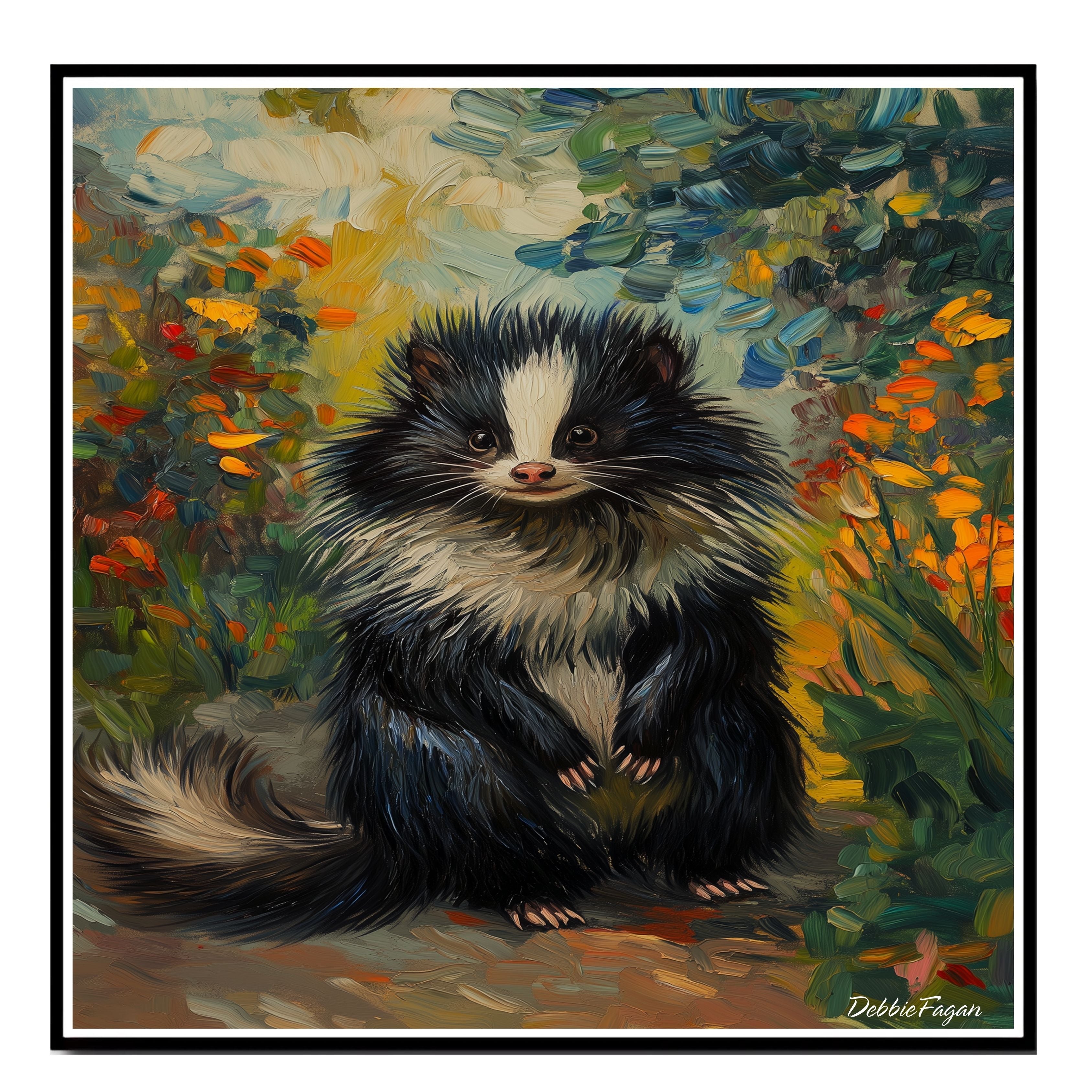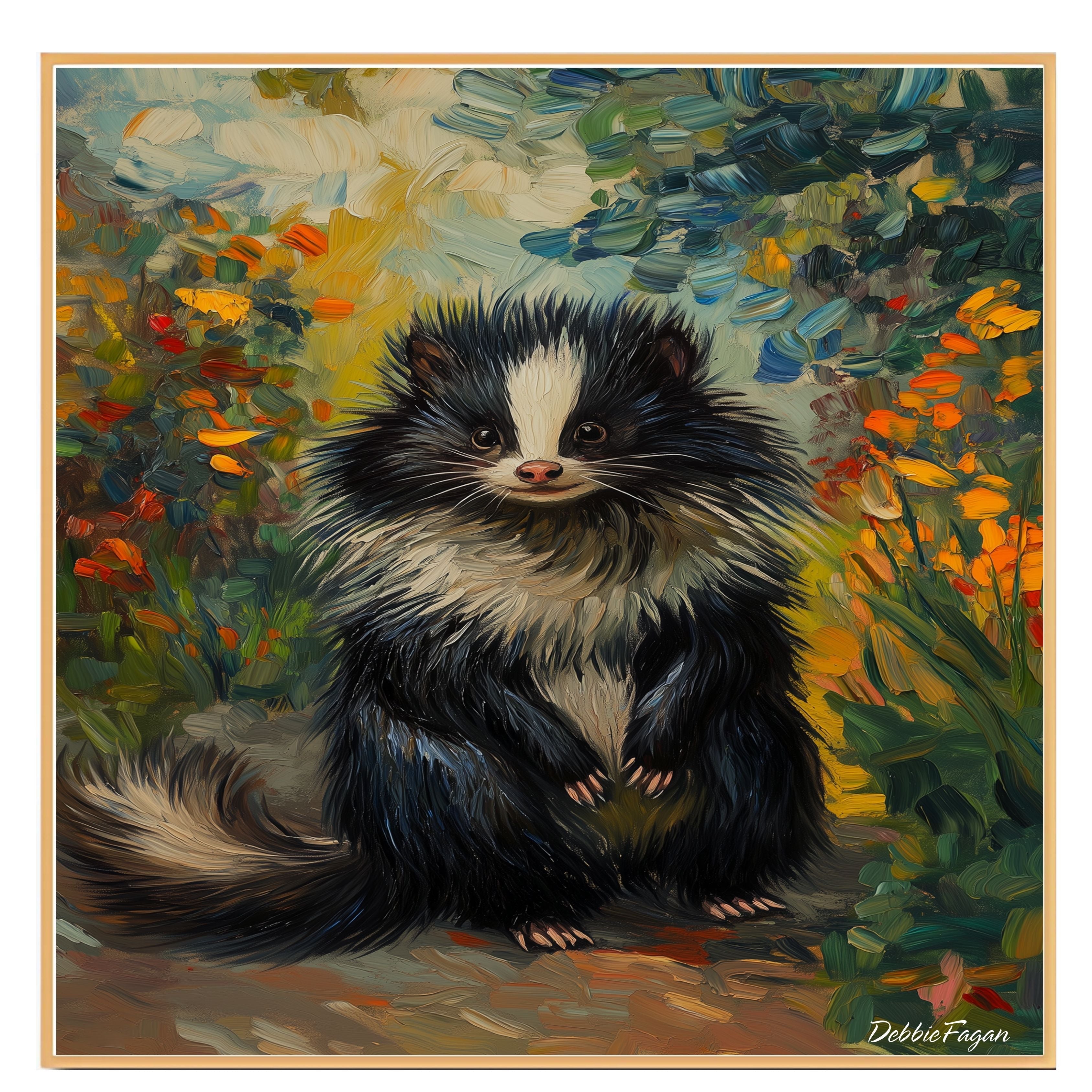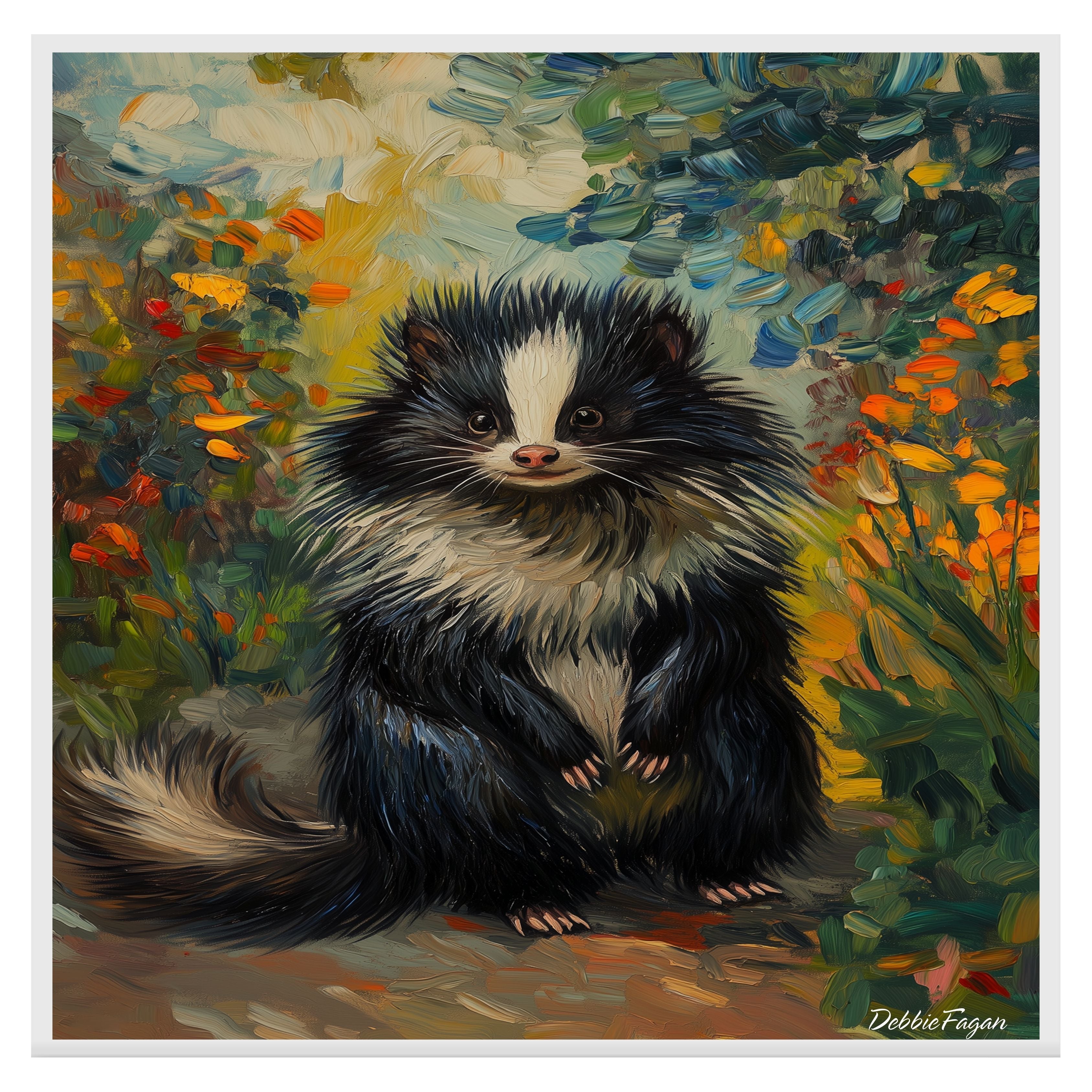 A delightful Van Gogh-inspired canvas featuring a fluffy skunk surrounded by a vibrant floral landscape. This expressive woodland animal artwork is perfect for nature-themed décor and adds whimsy and color to any space.