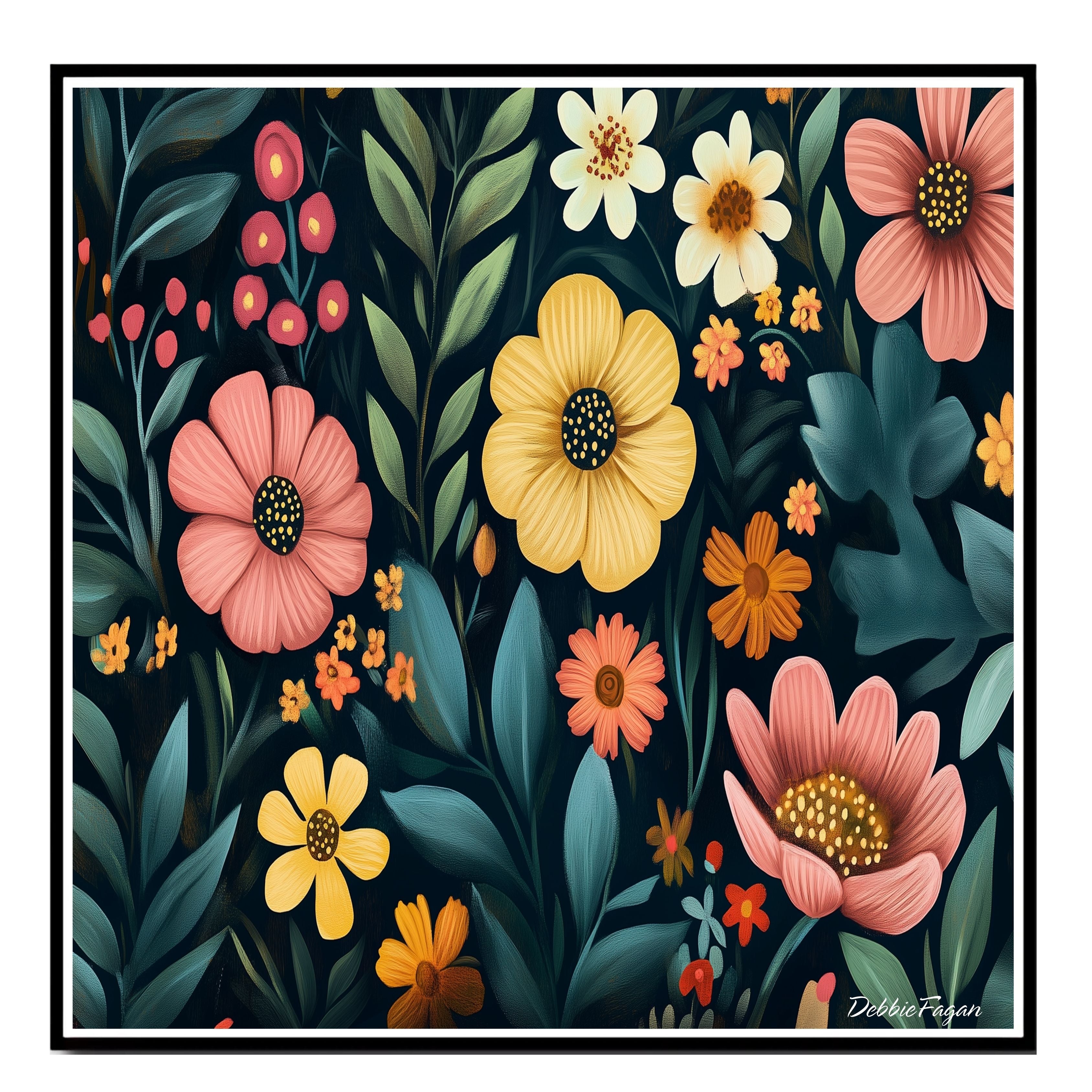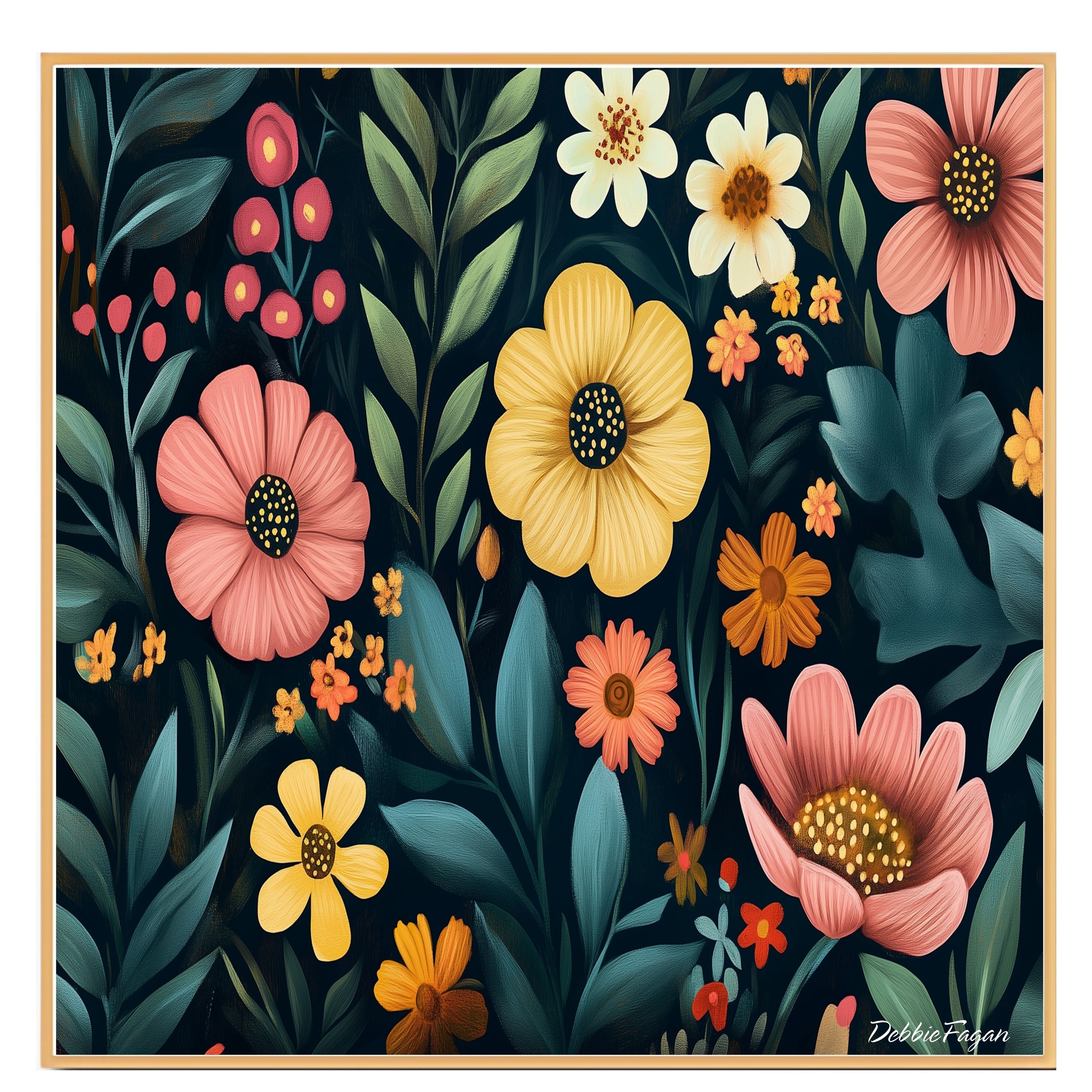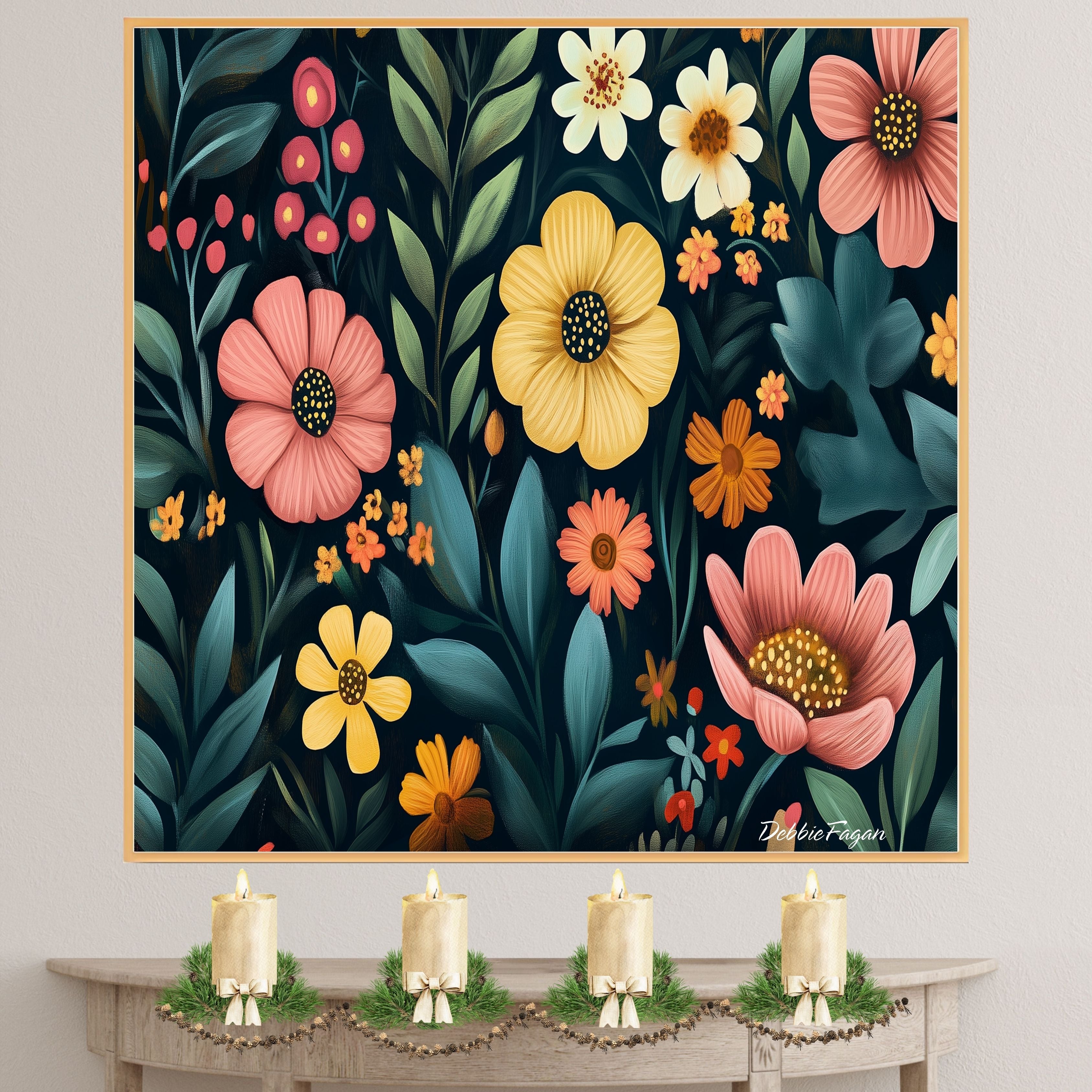 This lively floral canvas showcases a hand-painted folk art style, bursting with pink, yellow, and orange flowers amid rich green foliage. Set against a deep background, the composition radiates charm and warmth, perfect for brightening up any space with nature-inspired artistry.