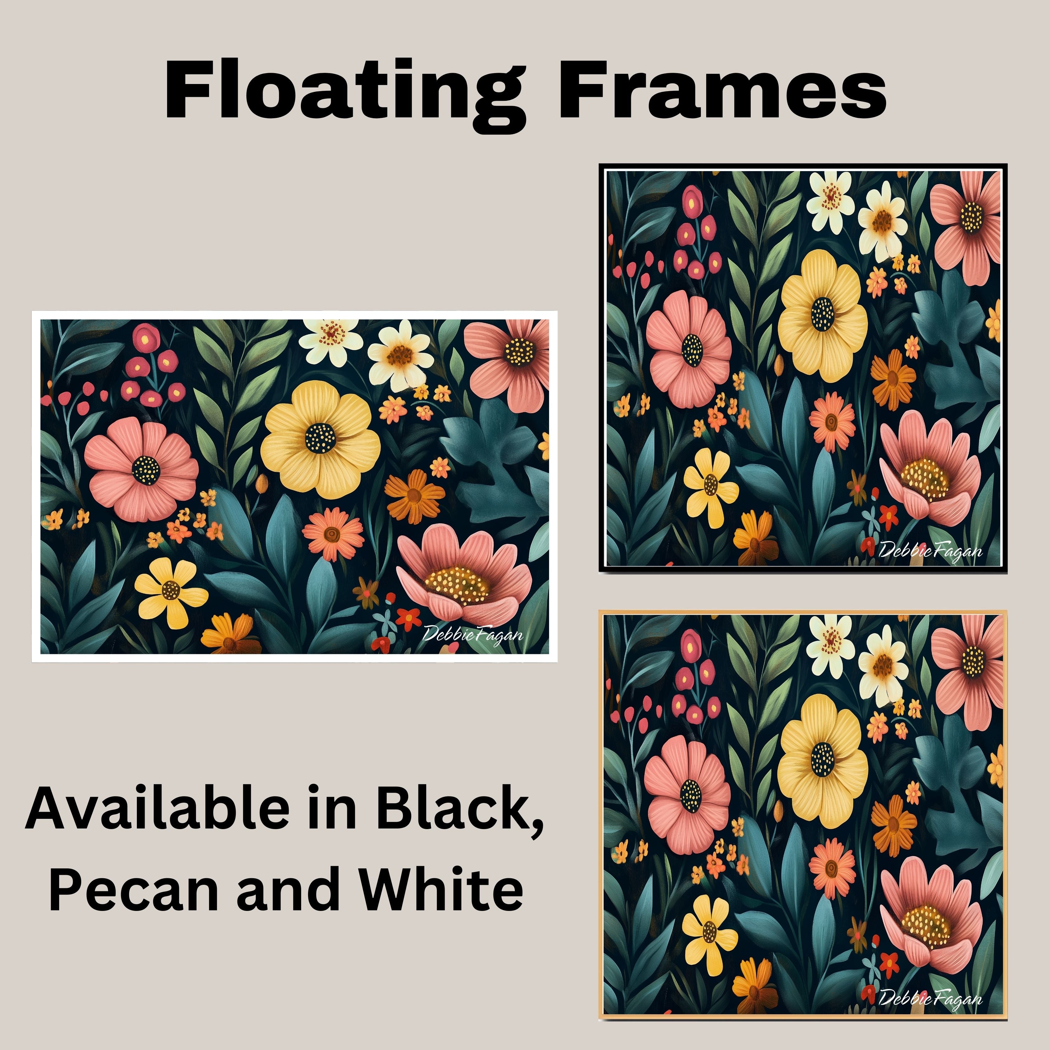 1.5" Thick Floating Framed Canvas: Available in Black, Pecan, and White Grain. Durable shrink-resistant frame. Comes with easy-to-install hanging kits, ready for immediate display.