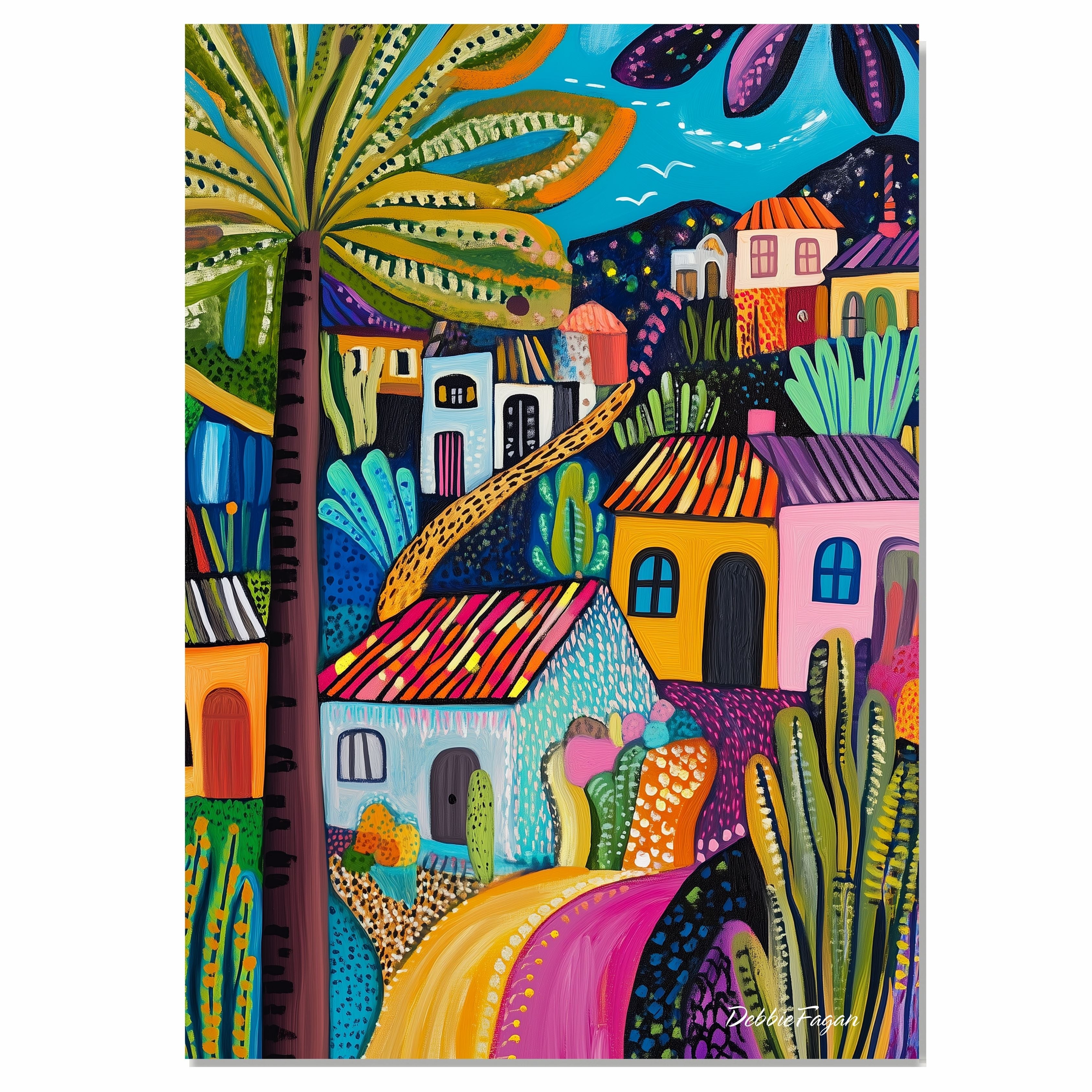 A stunning canvas print bursting with bold colors and playful shapes, this folk art landscape features a vibrant village with cacti, palm trees, and rolling hills. The vivid hues and abstract style bring an energetic and tropical vibe, making it perfect for adding warmth and personality to any space.