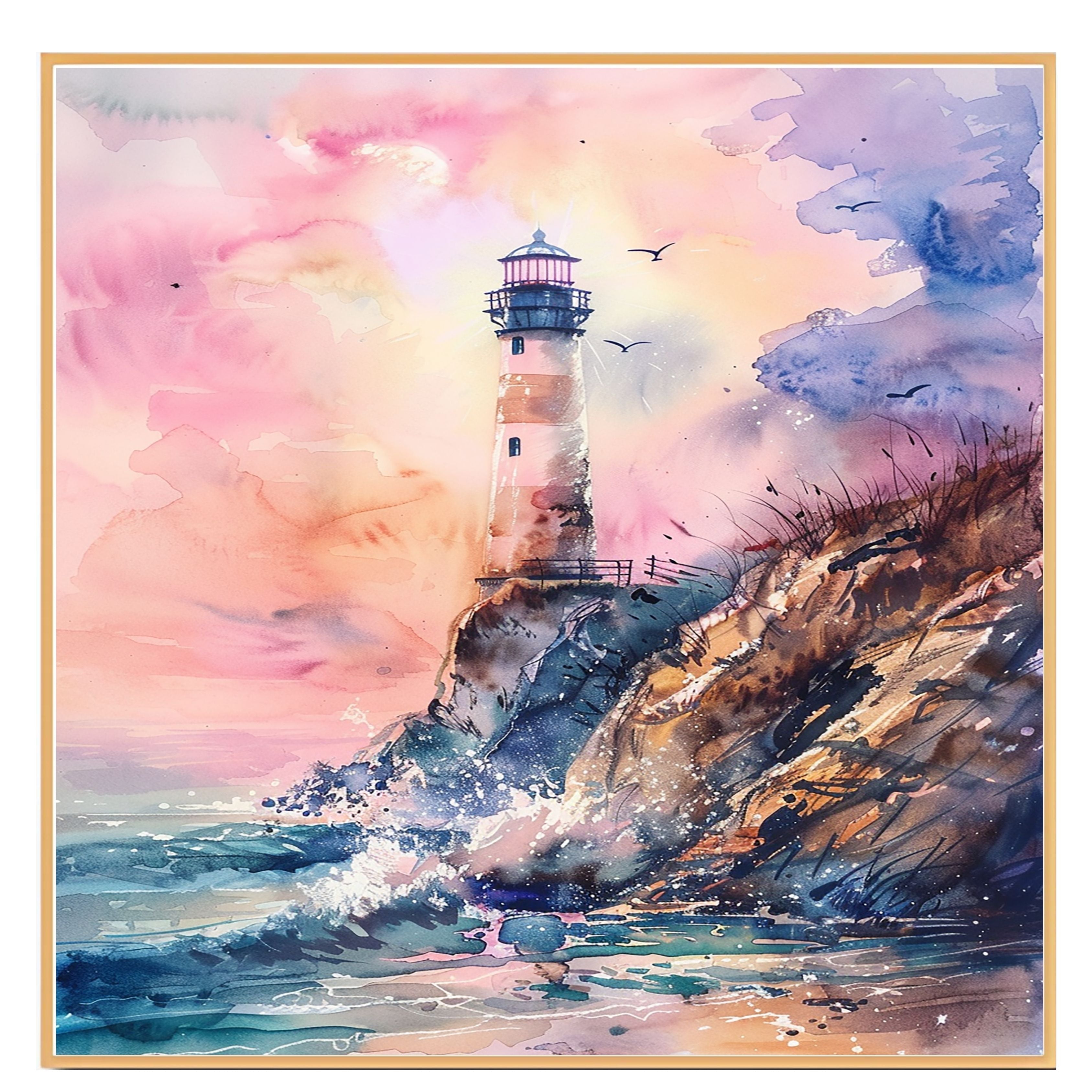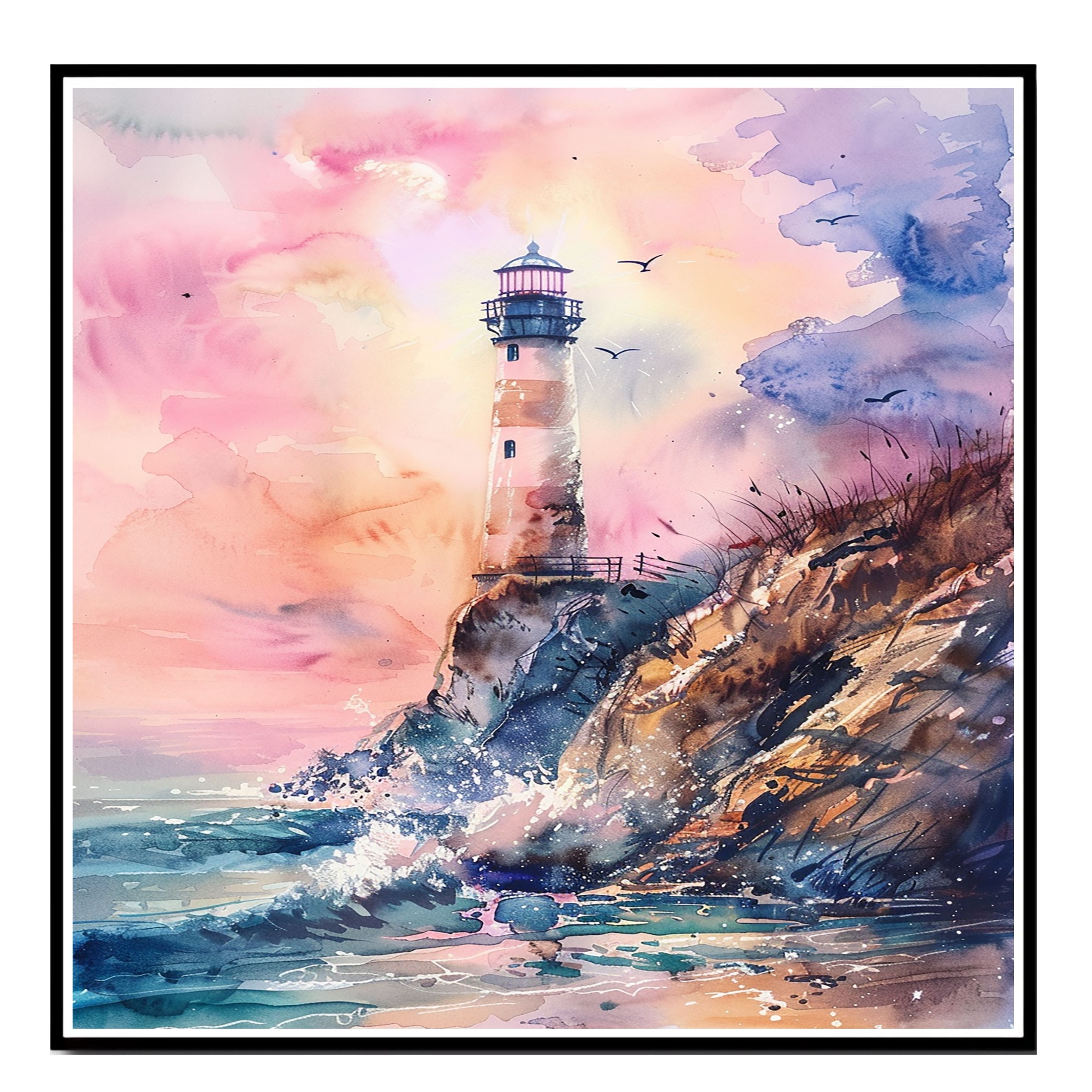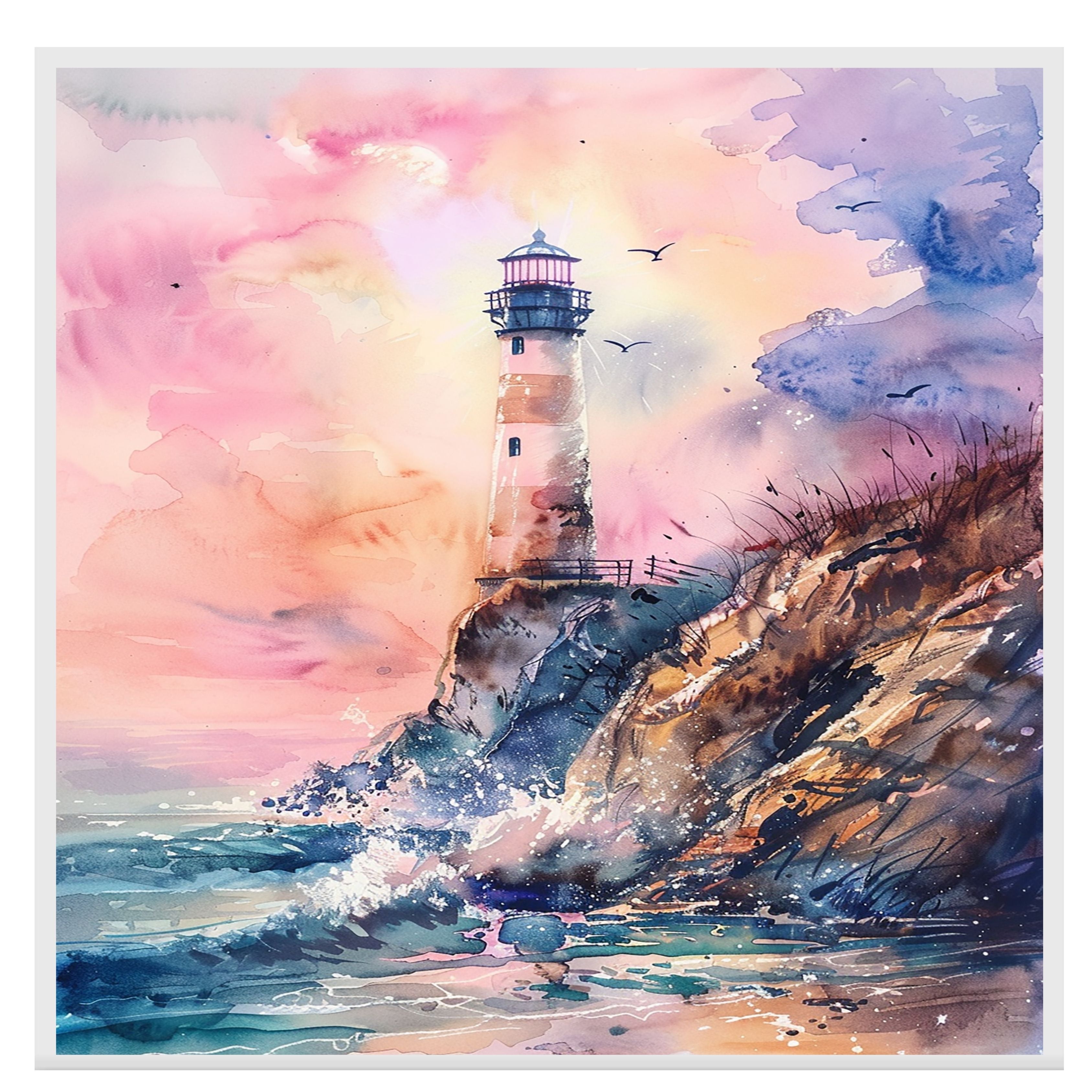 Immerse yourself in the beauty of this watercolor seascape featuring a lighthouse perched high on a rugged cliff, surrounded by crashing waves and soaring seabirds. The dreamy pastel sky and vivid brushwork evoke the power and peace of nature in perfect harmony.