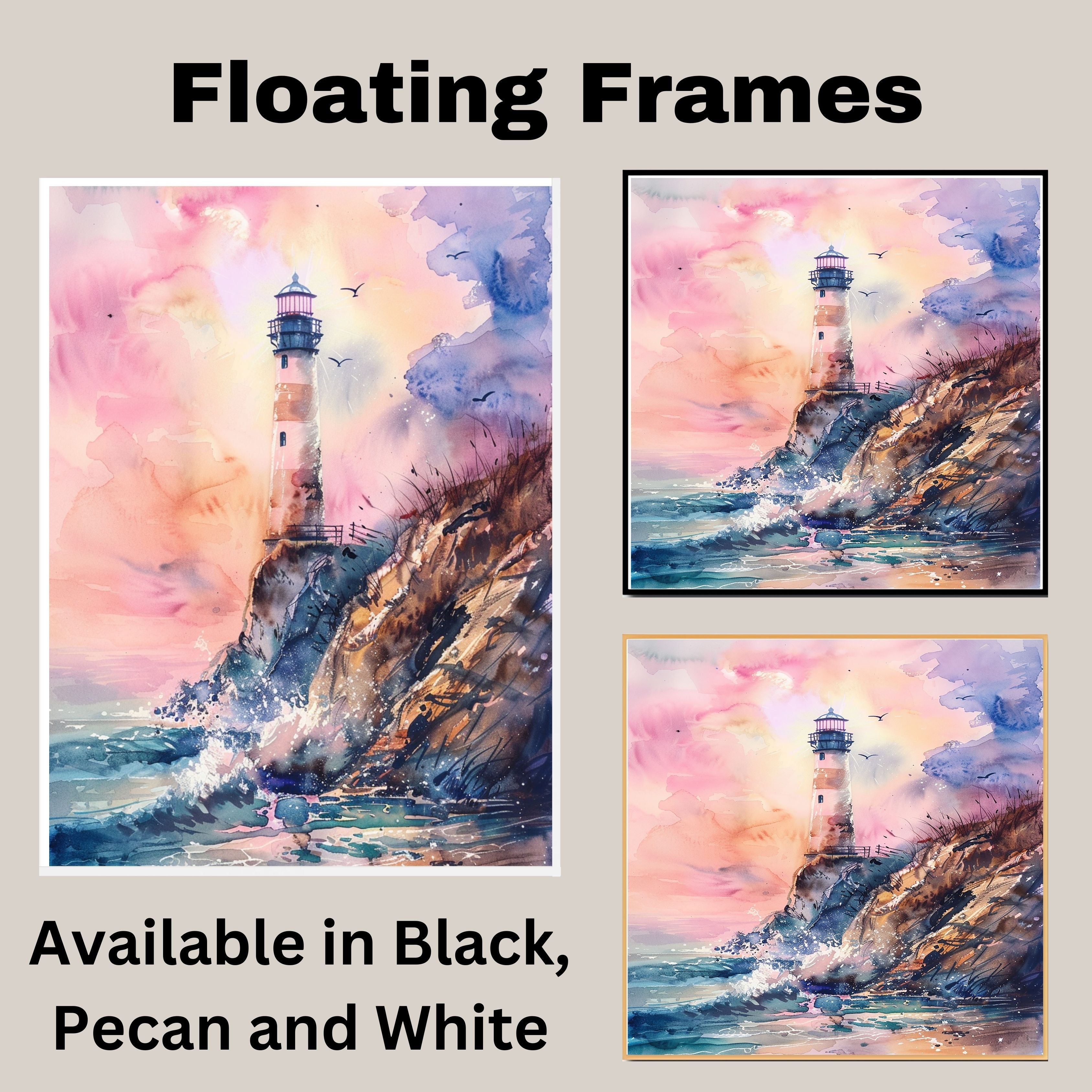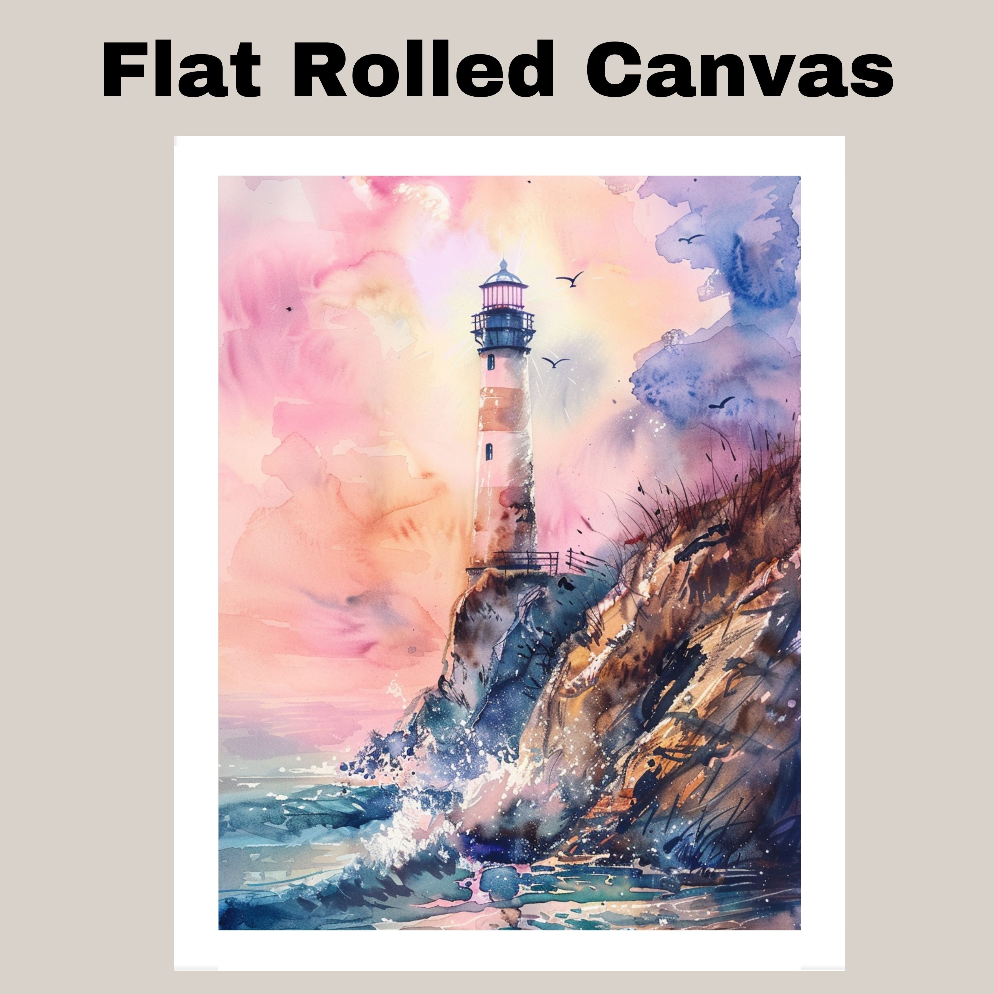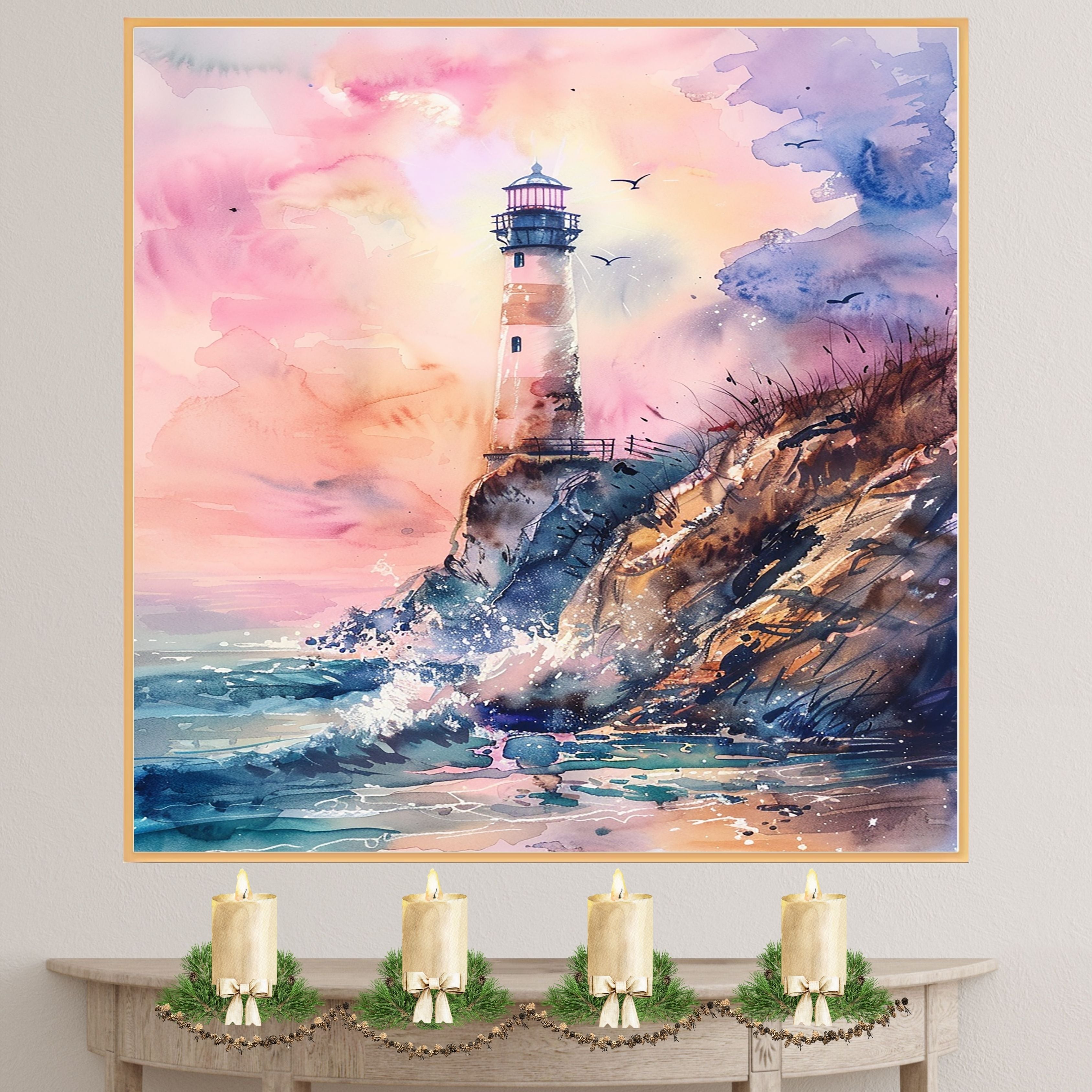 Immerse yourself in the beauty of this watercolor seascape featuring a lighthouse perched high on a rugged cliff, surrounded by crashing waves and soaring seabirds. The dreamy pastel sky and vivid brushwork evoke the power and peace of nature in perfect harmony.