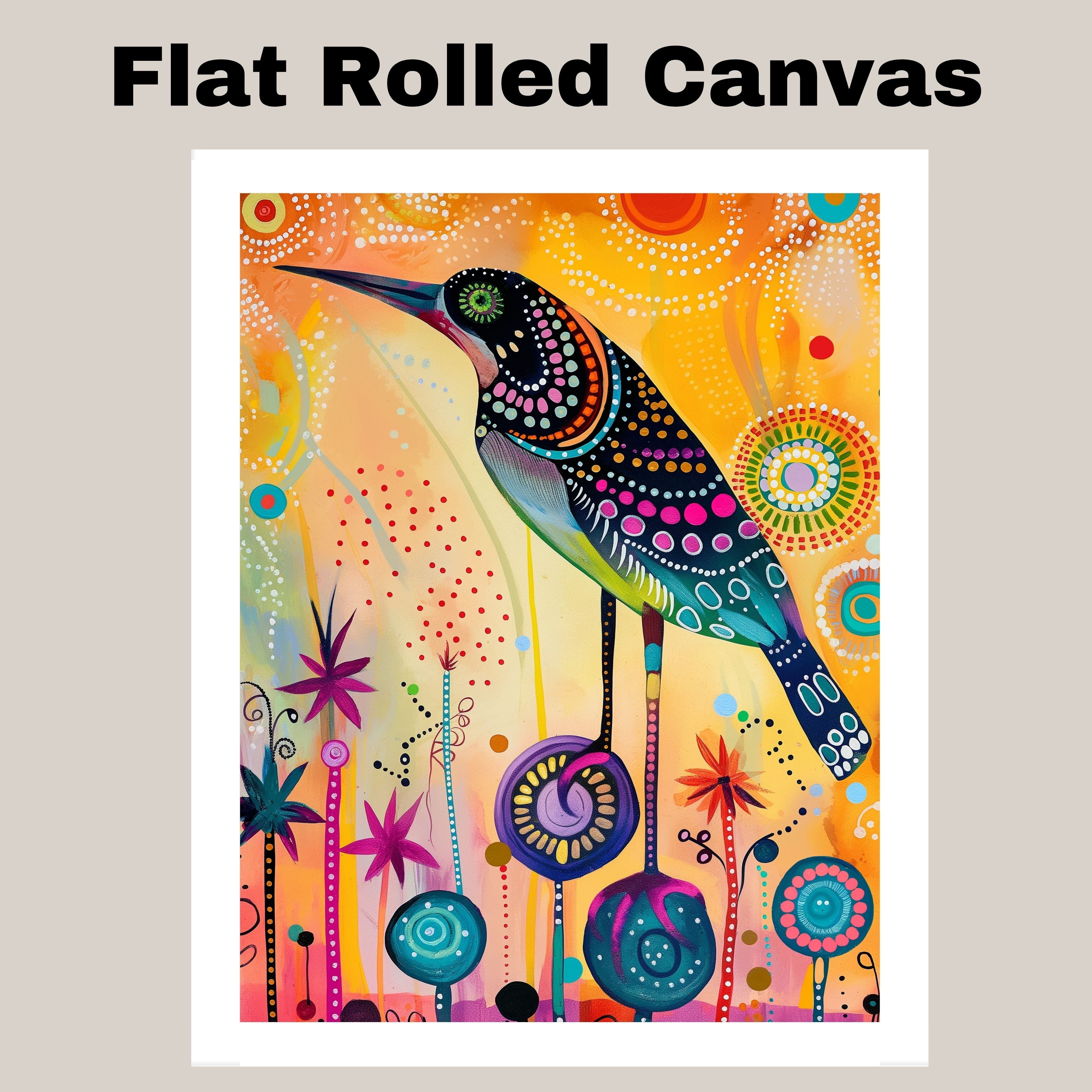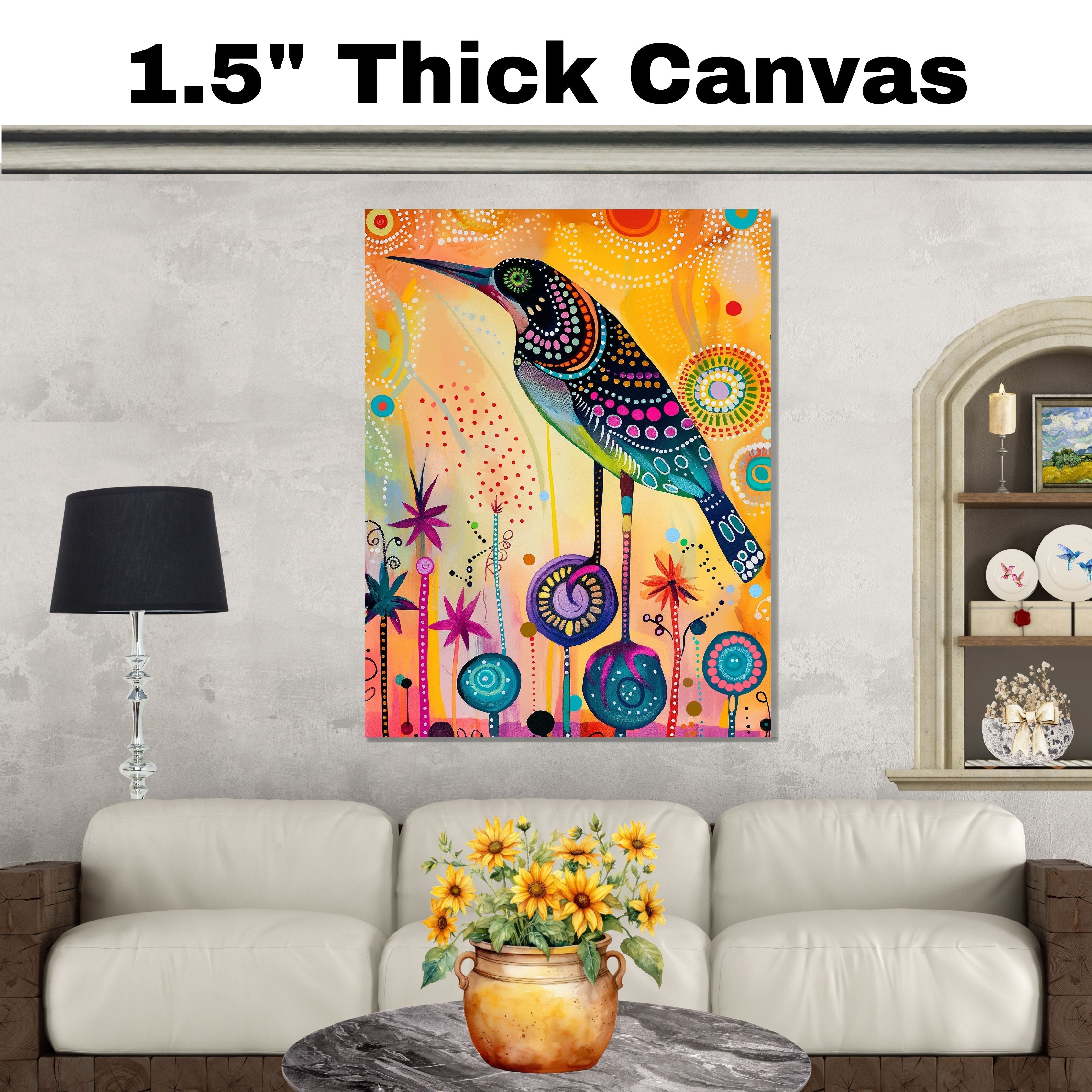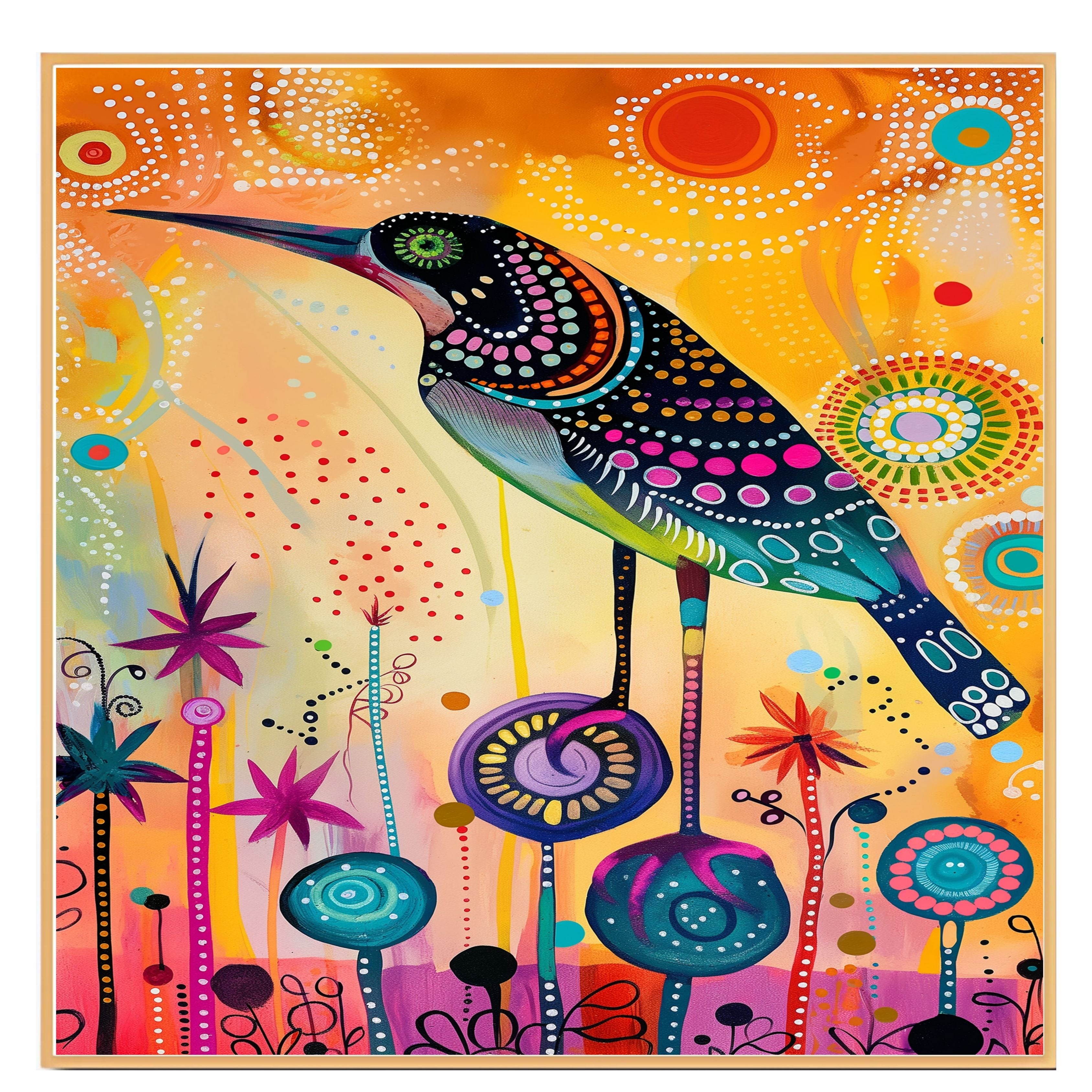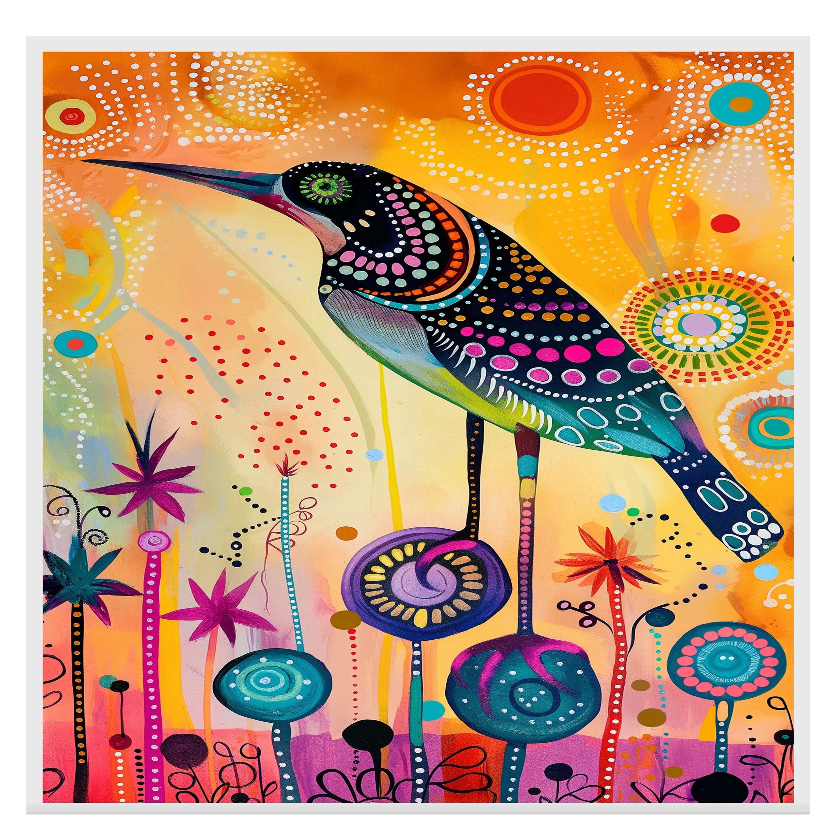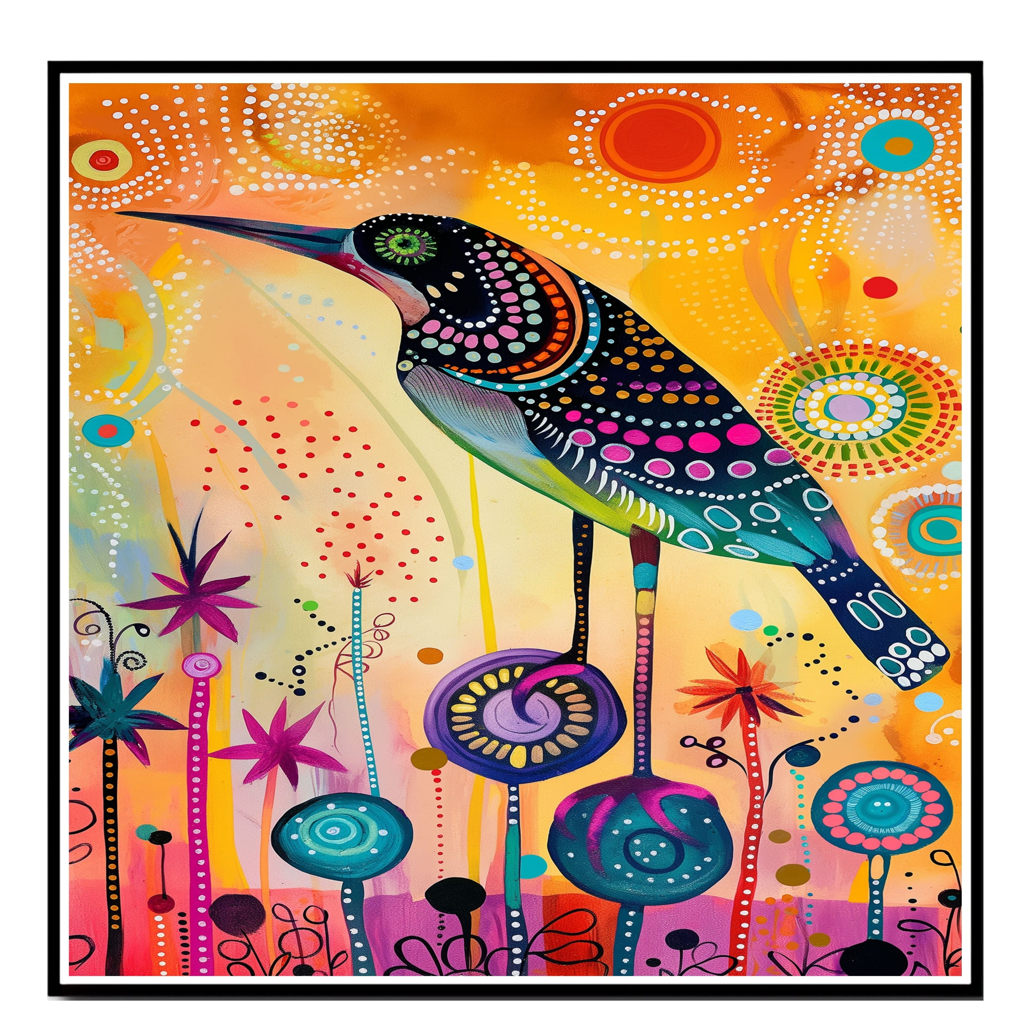 This dynamic painting features a whimsical bird adorned with vibrant dots and intricate patterns, perched amid surreal fantasy flora on a glowing orange-pink background. Perfect for those who love bold colors, imaginative art, and nature reimagined with a modern twist. Ideal for creative spaces, studios, or as a unique gift for art lovers.