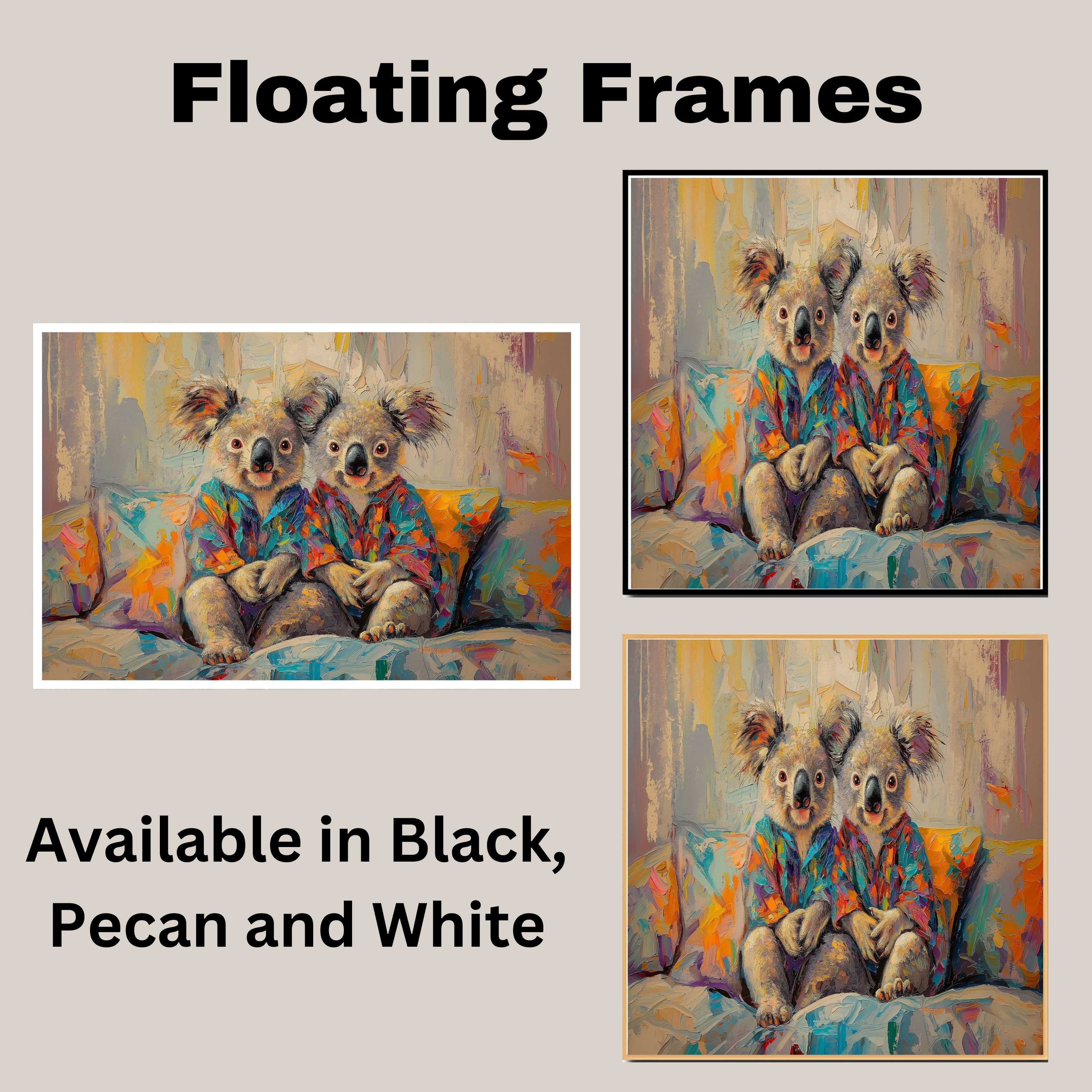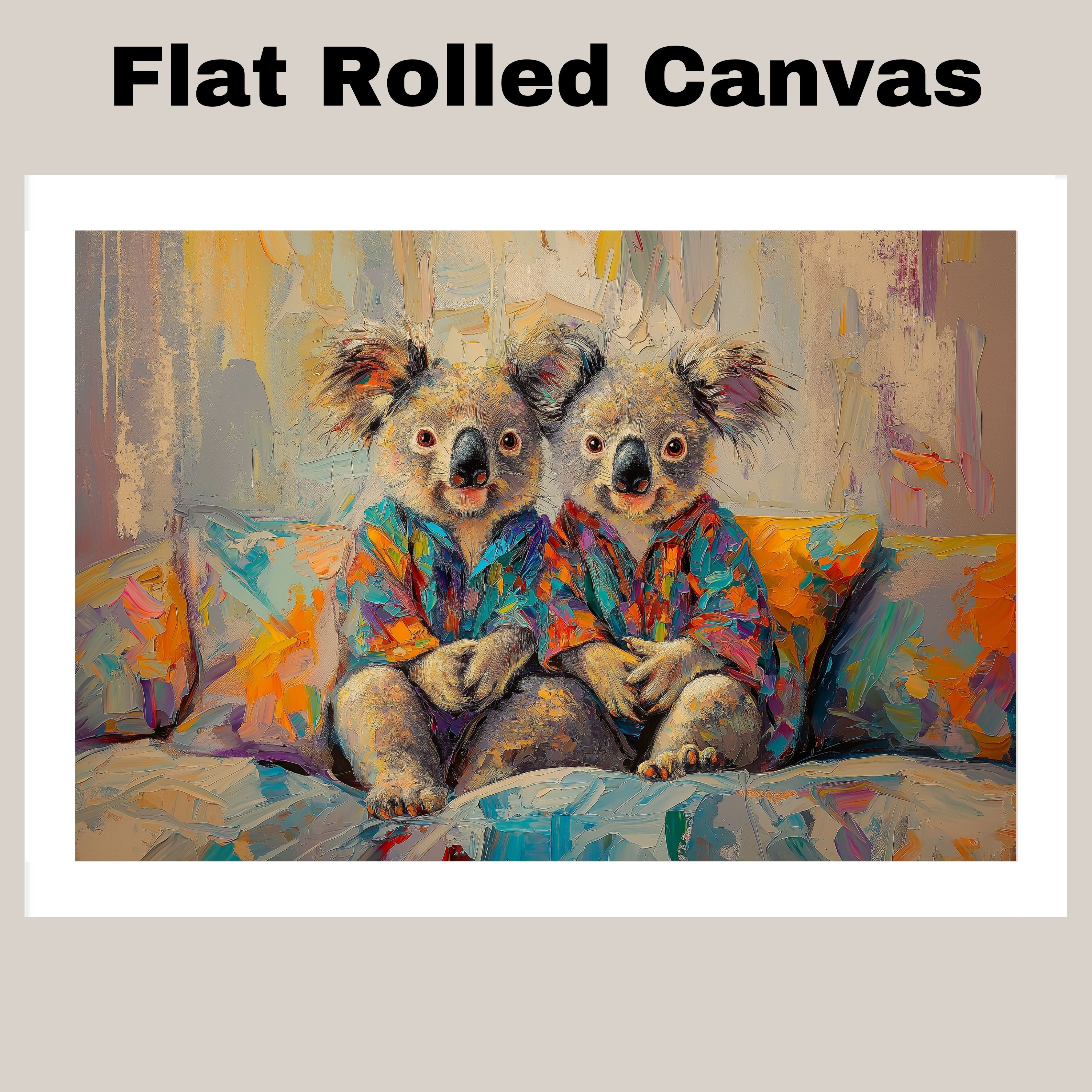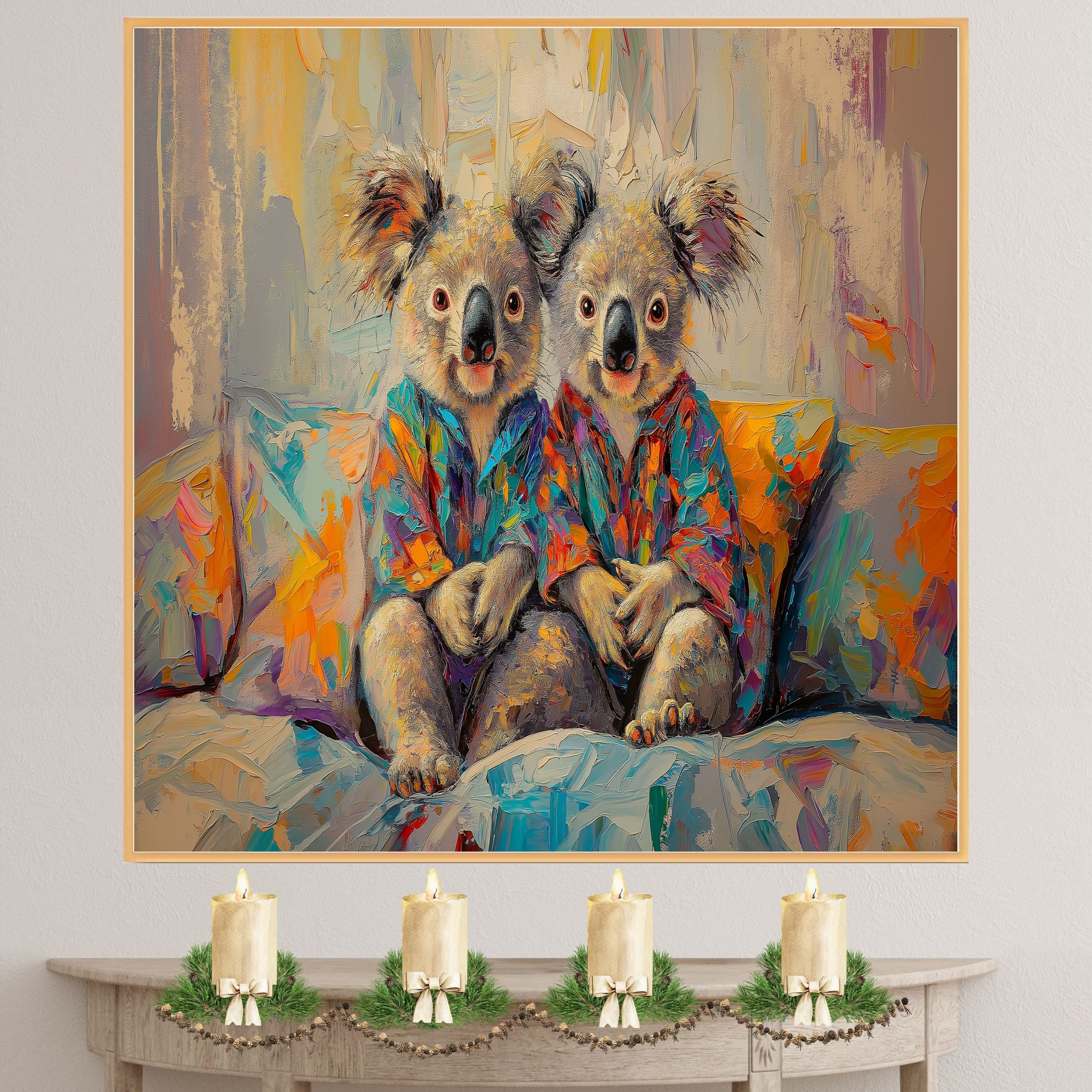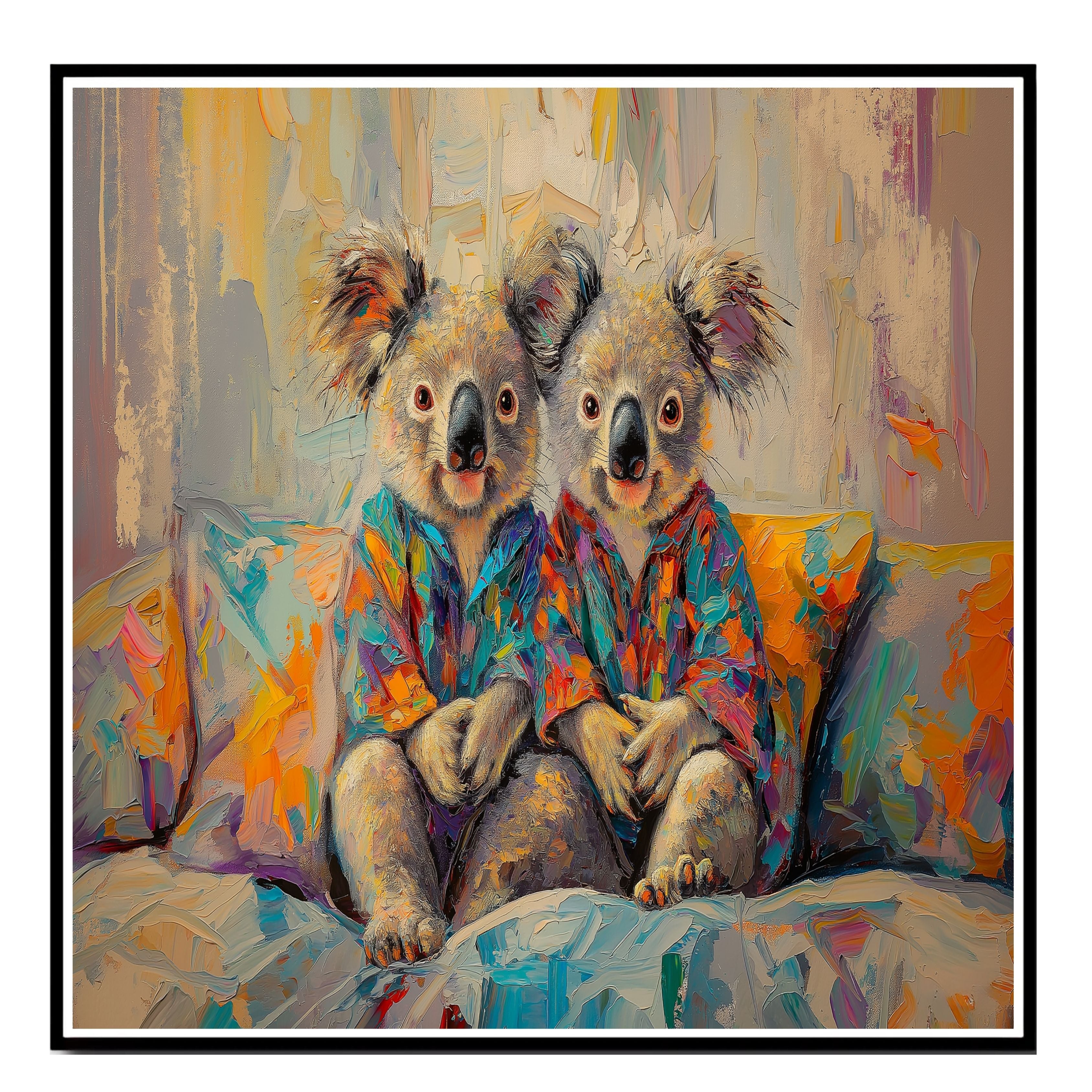 This bold and whimsical painting showcases two lovable koalas in brightly patterned pajamas, seated on a bed surrounded by vivid pillows and expressive textures. Their joyful expressions and the striking palette make this piece a standout choice for nurseries, playrooms, or eclectic home decor.