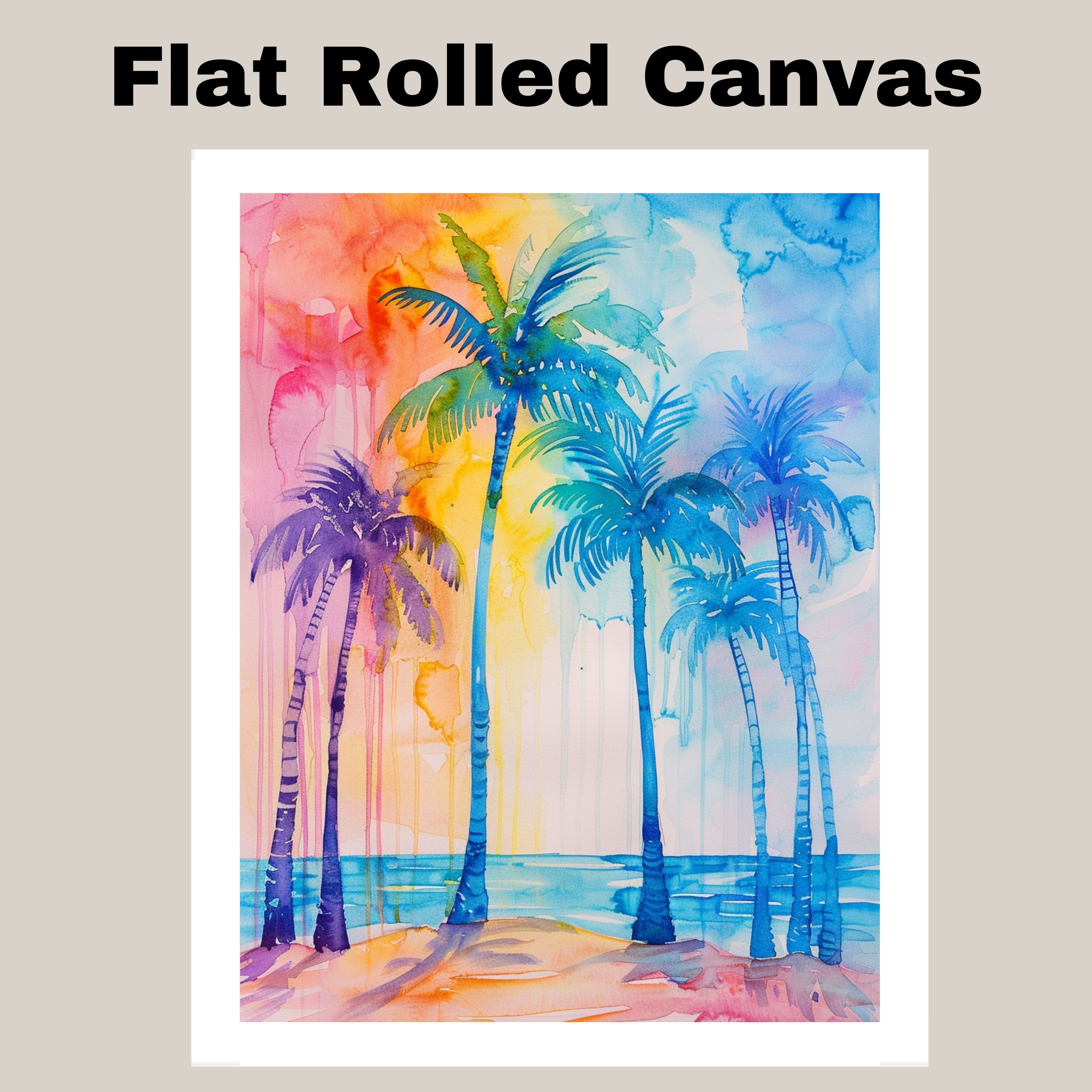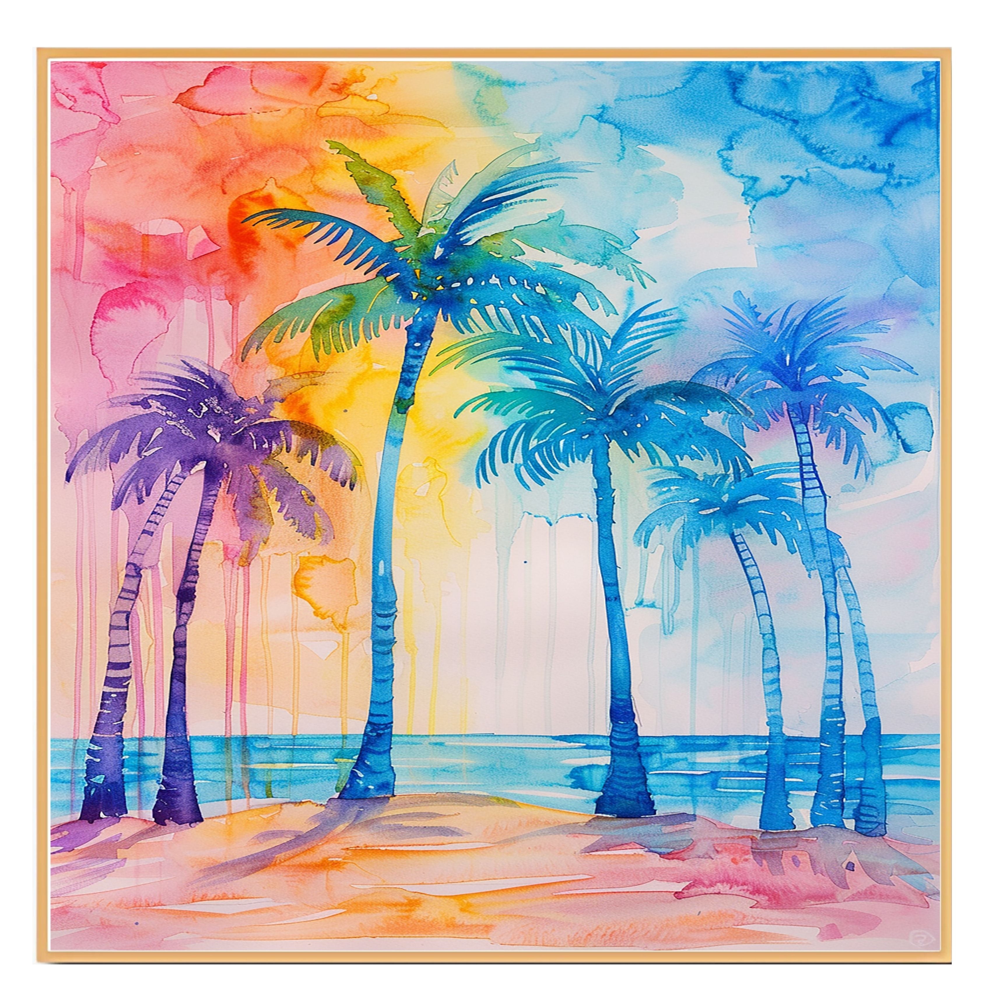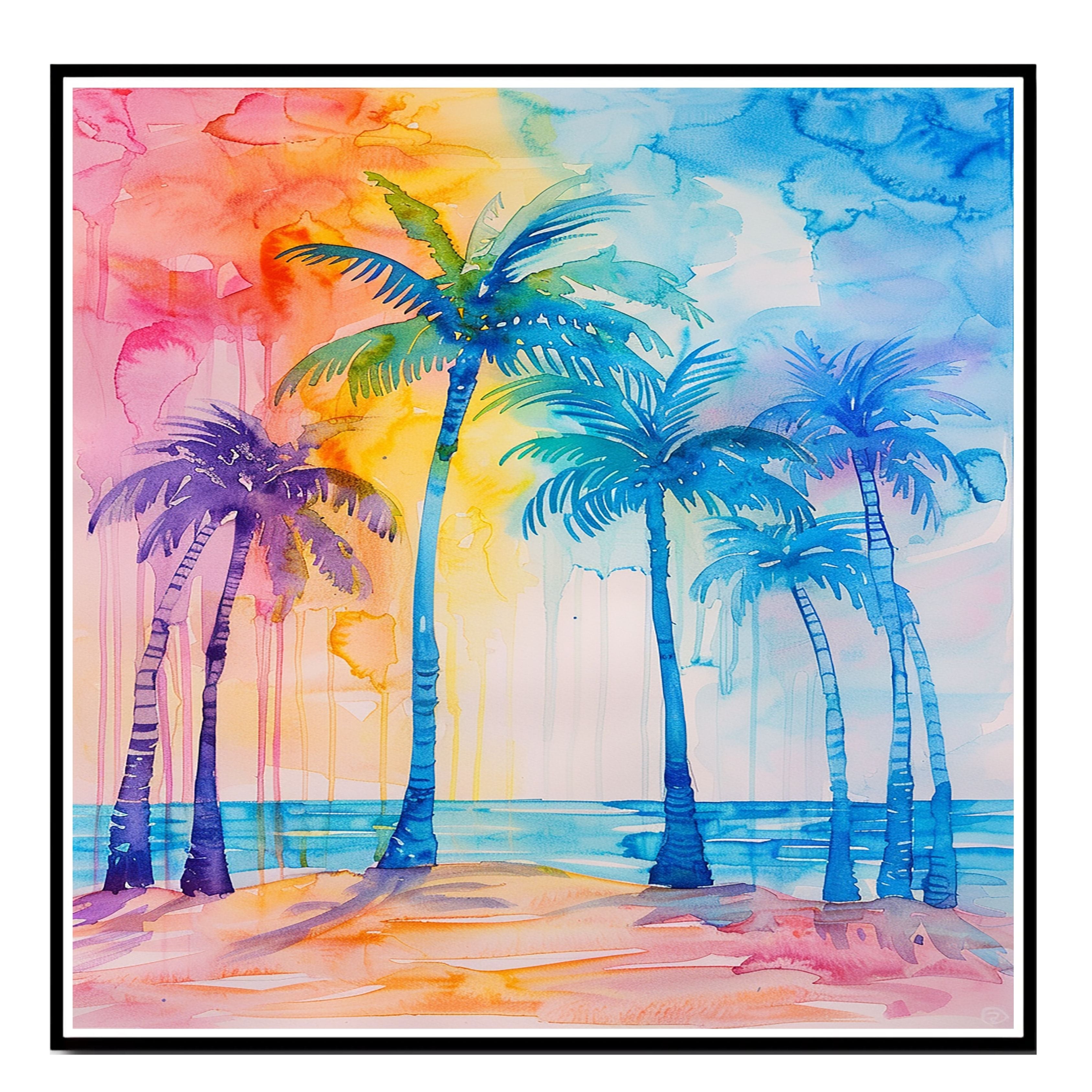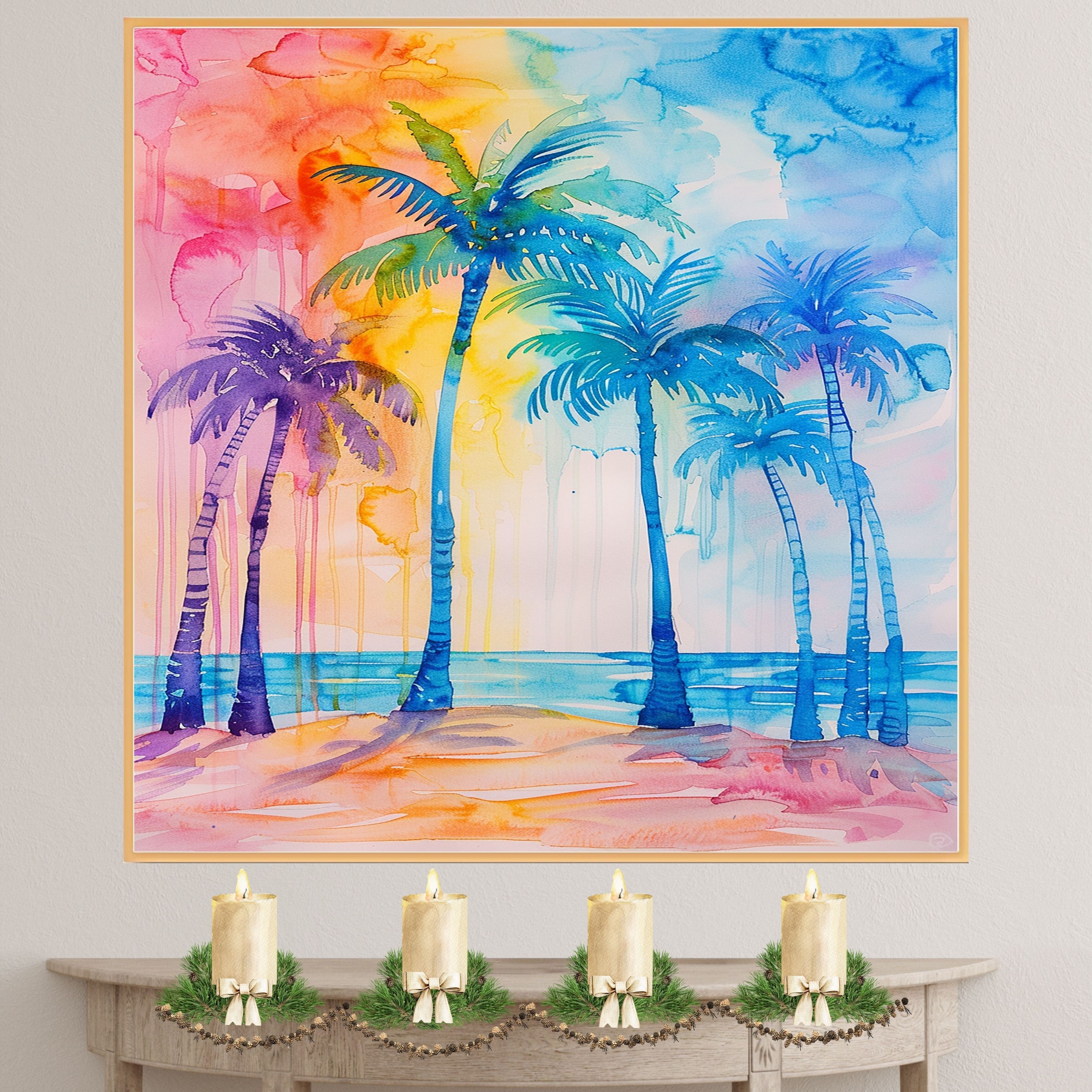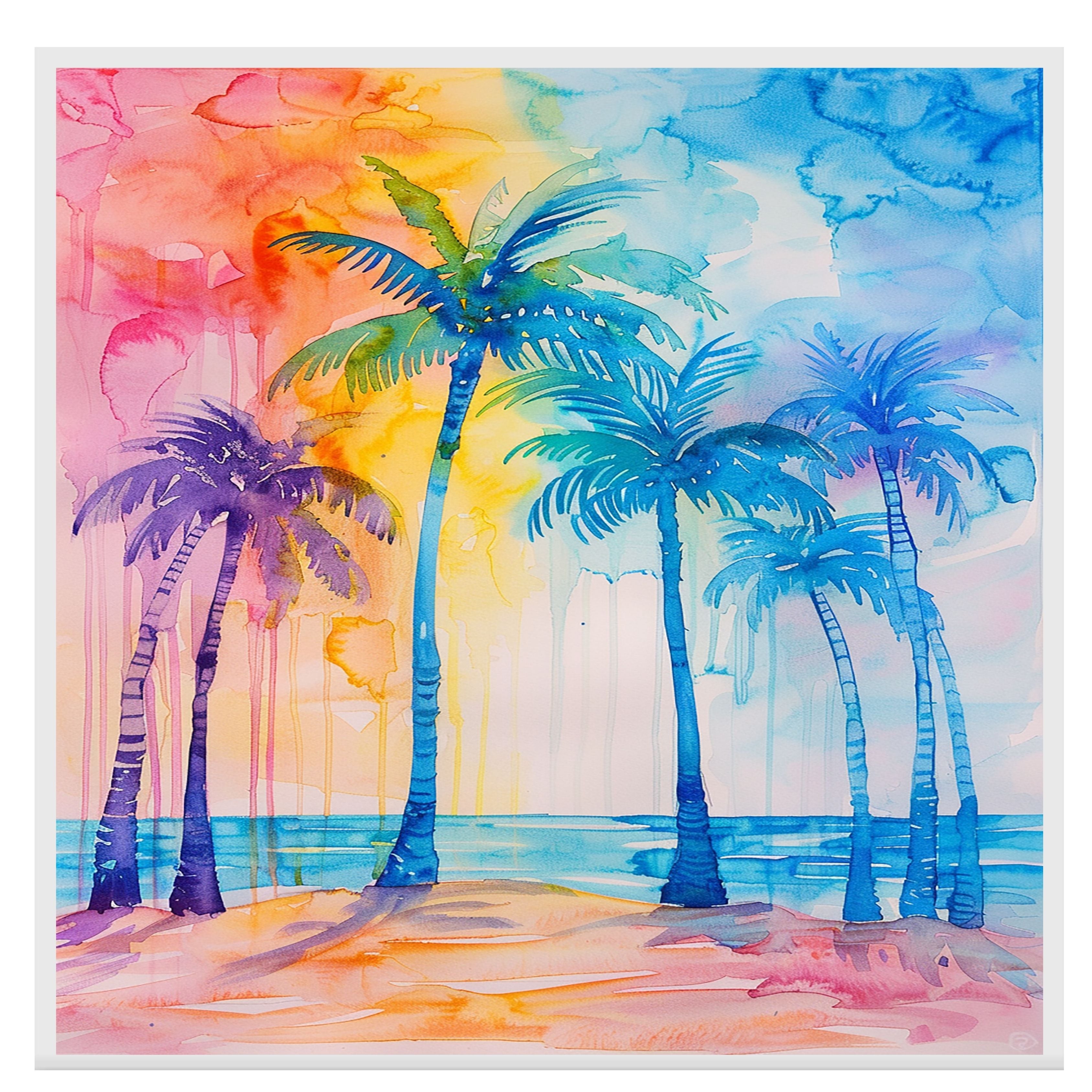 Bring the warmth of the tropics to your space with this stunning watercolor painting of rainbow-colored palm trees. With a vibrant blend of reds, blues, yellows, and purples, this piece captures the joy and serenity of a tropical beach scene, ideal for adding a lively splash of coastal charm.
