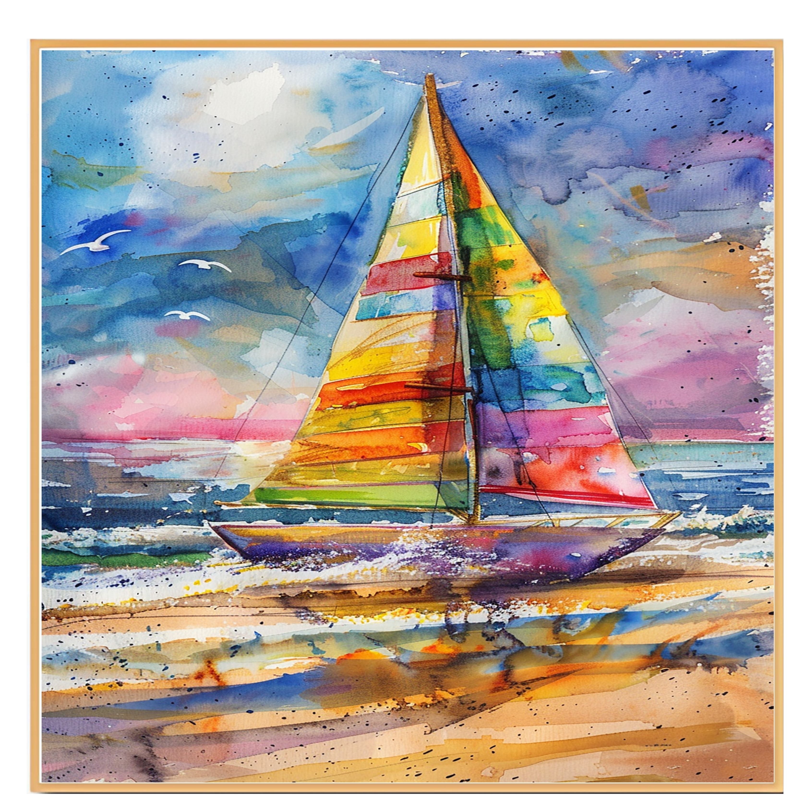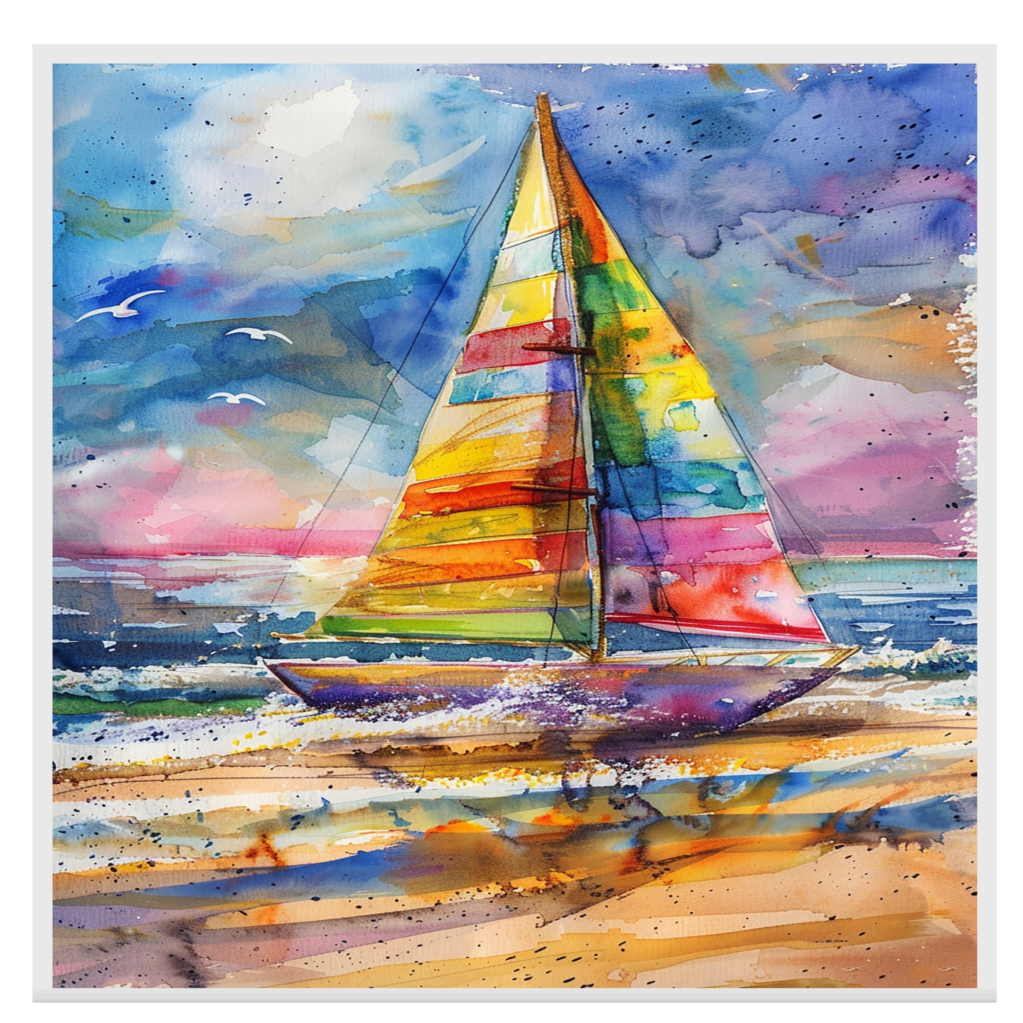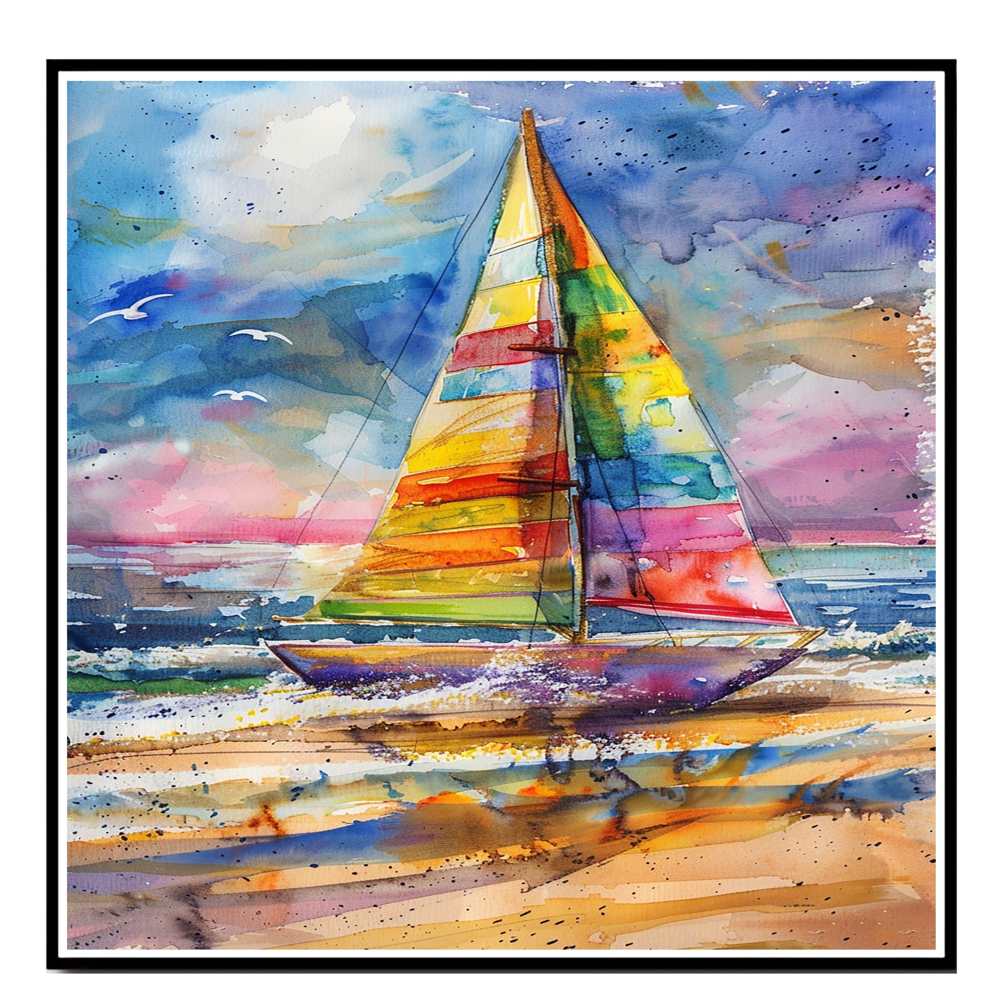 This dynamic watercolor painting showcases a multicolored sailboat riding ocean waves with splashes of vibrant light. The vivid sky and shoreline reflections create a striking scene of movement and color. Ideal for nautical, beach, and summer-themed decor, this piece brings energy and tropical spirit to any space.