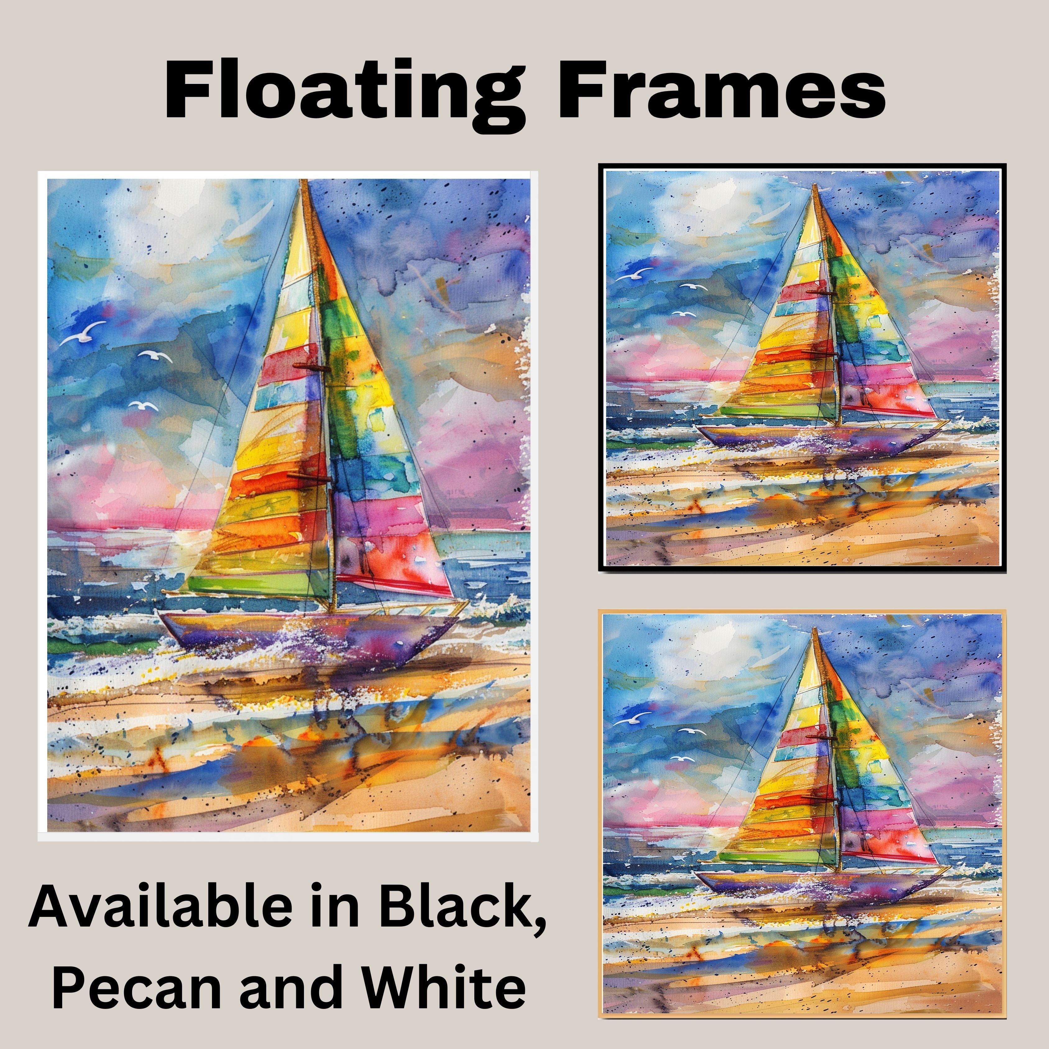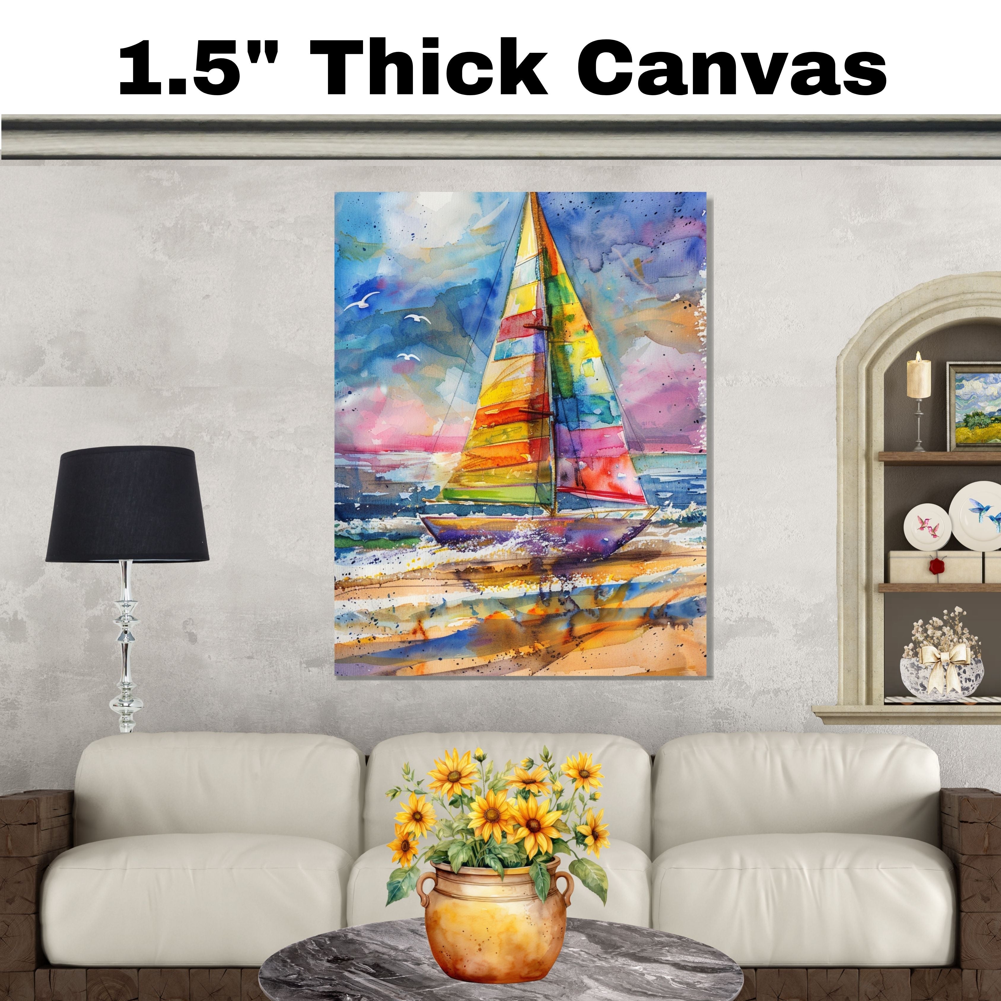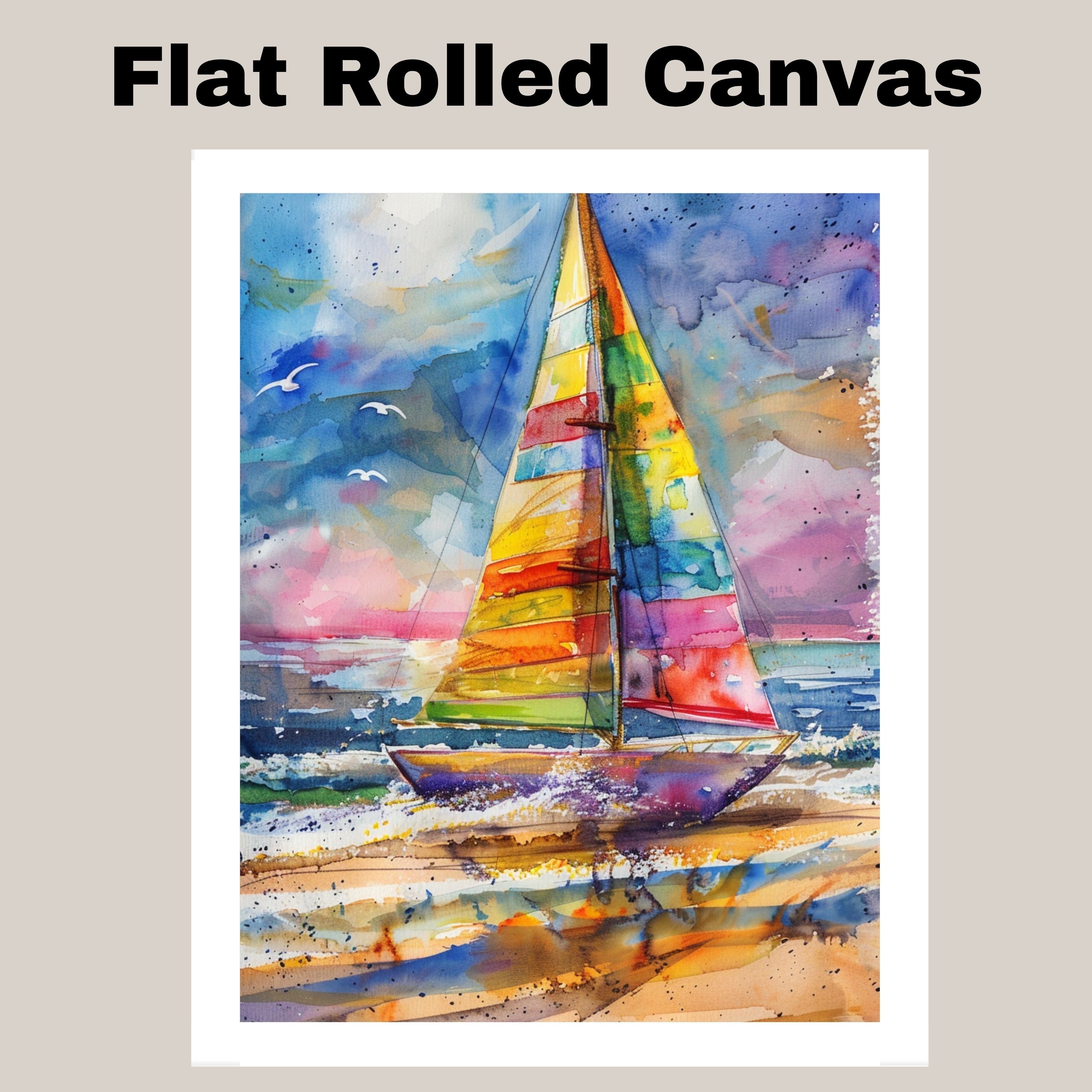 This dynamic watercolor painting showcases a multicolored sailboat riding ocean waves with splashes of vibrant light. The vivid sky and shoreline reflections create a striking scene of movement and color. Ideal for nautical, beach, and summer-themed decor, this piece brings energy and tropical spirit to any space.