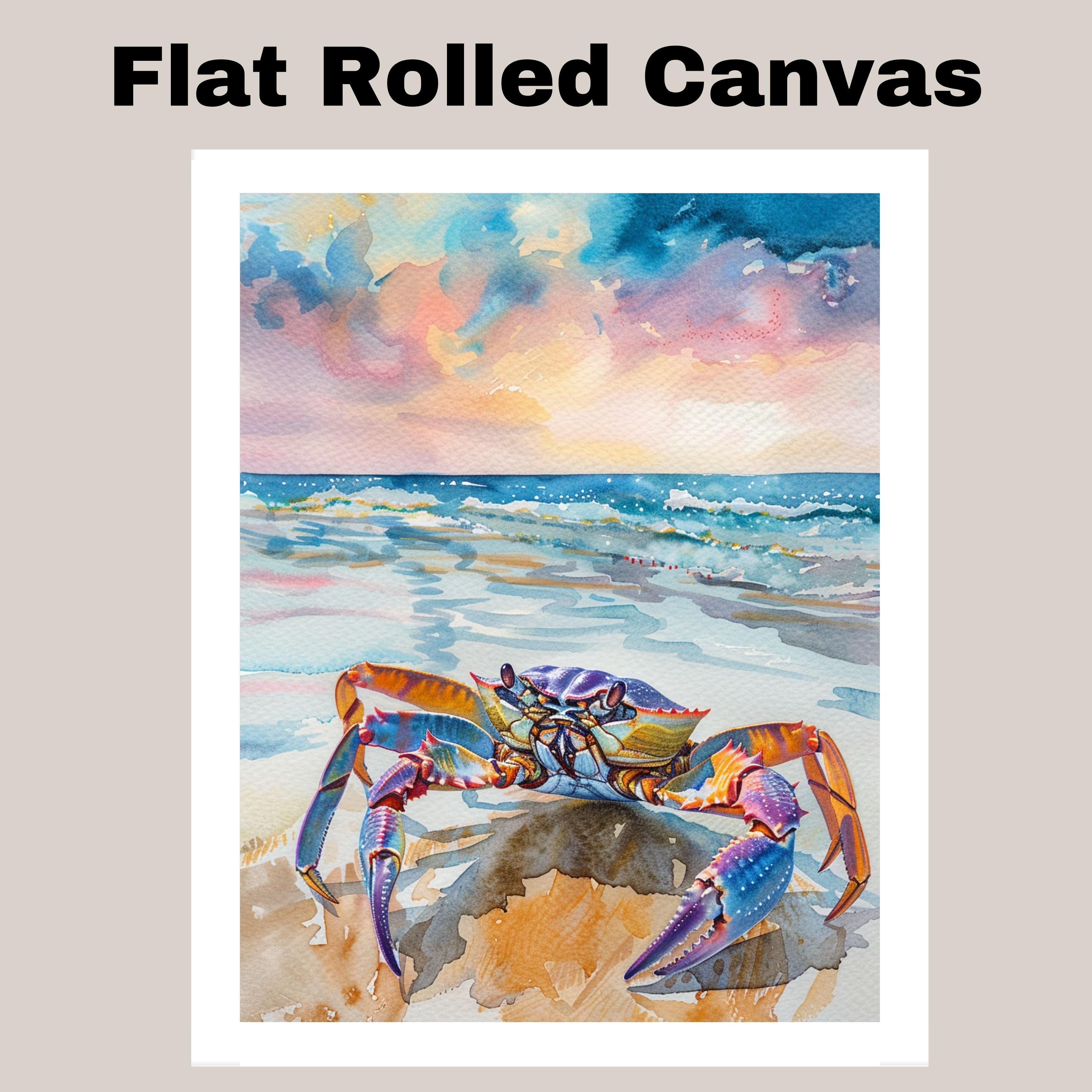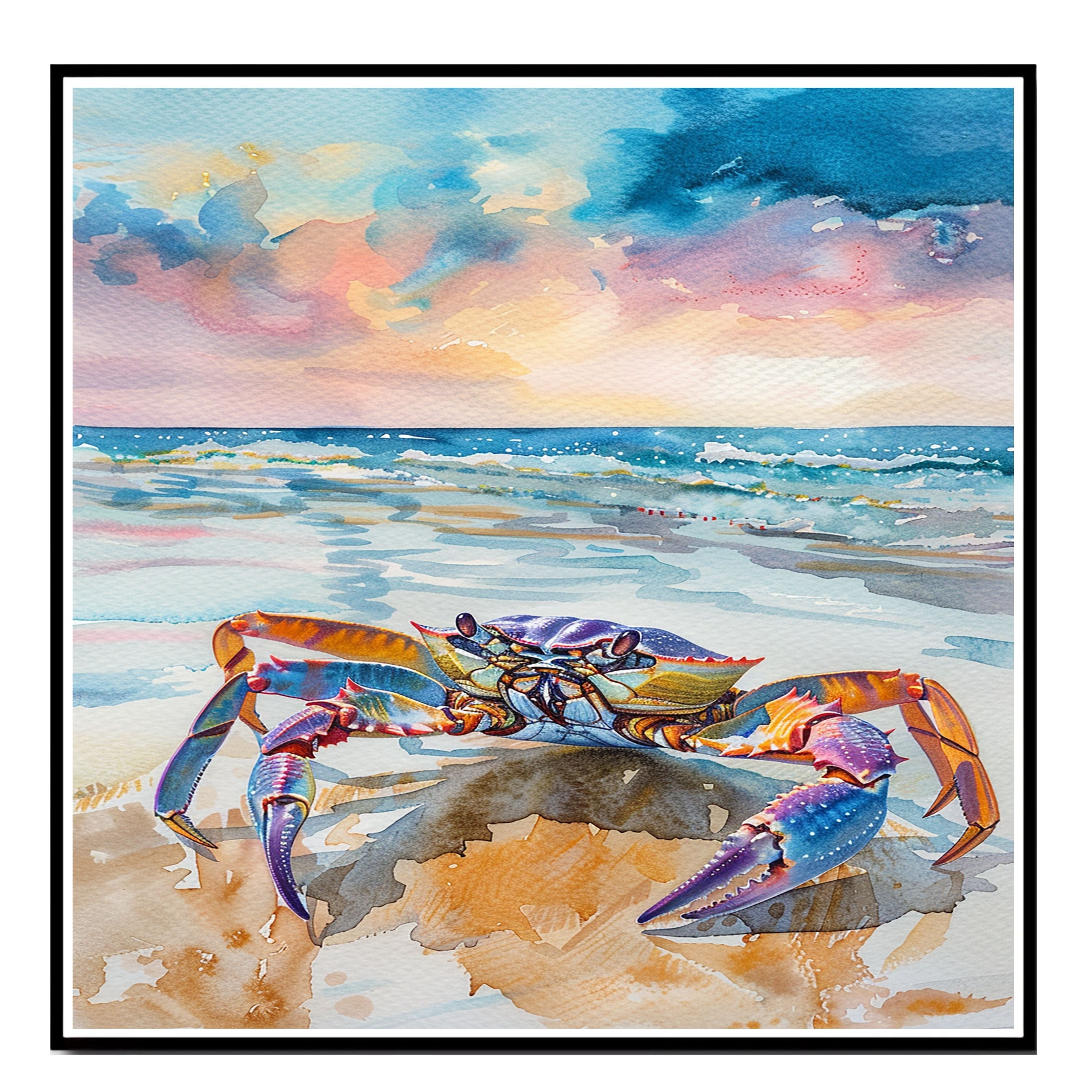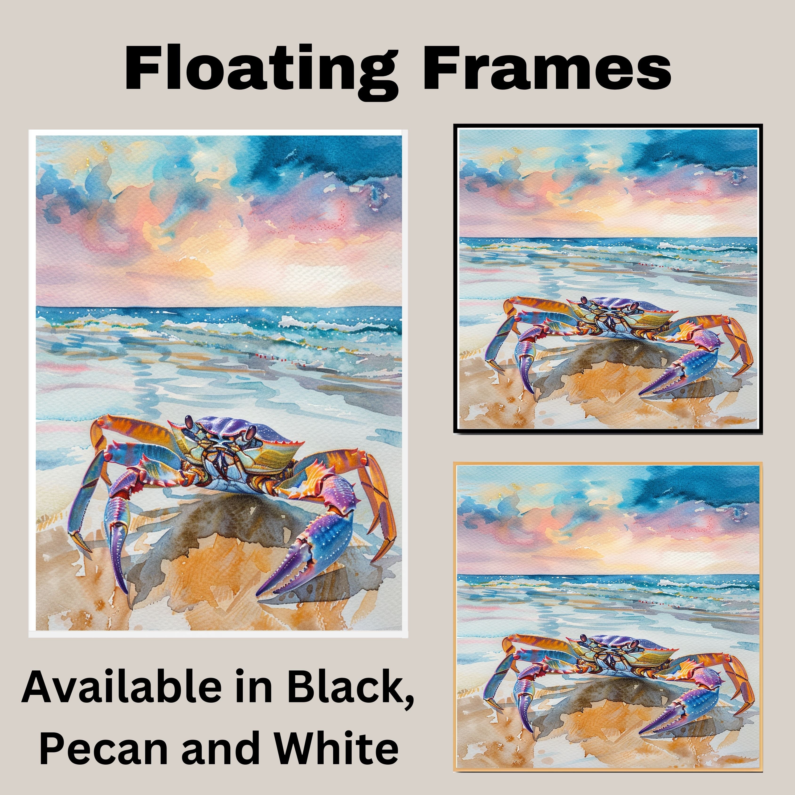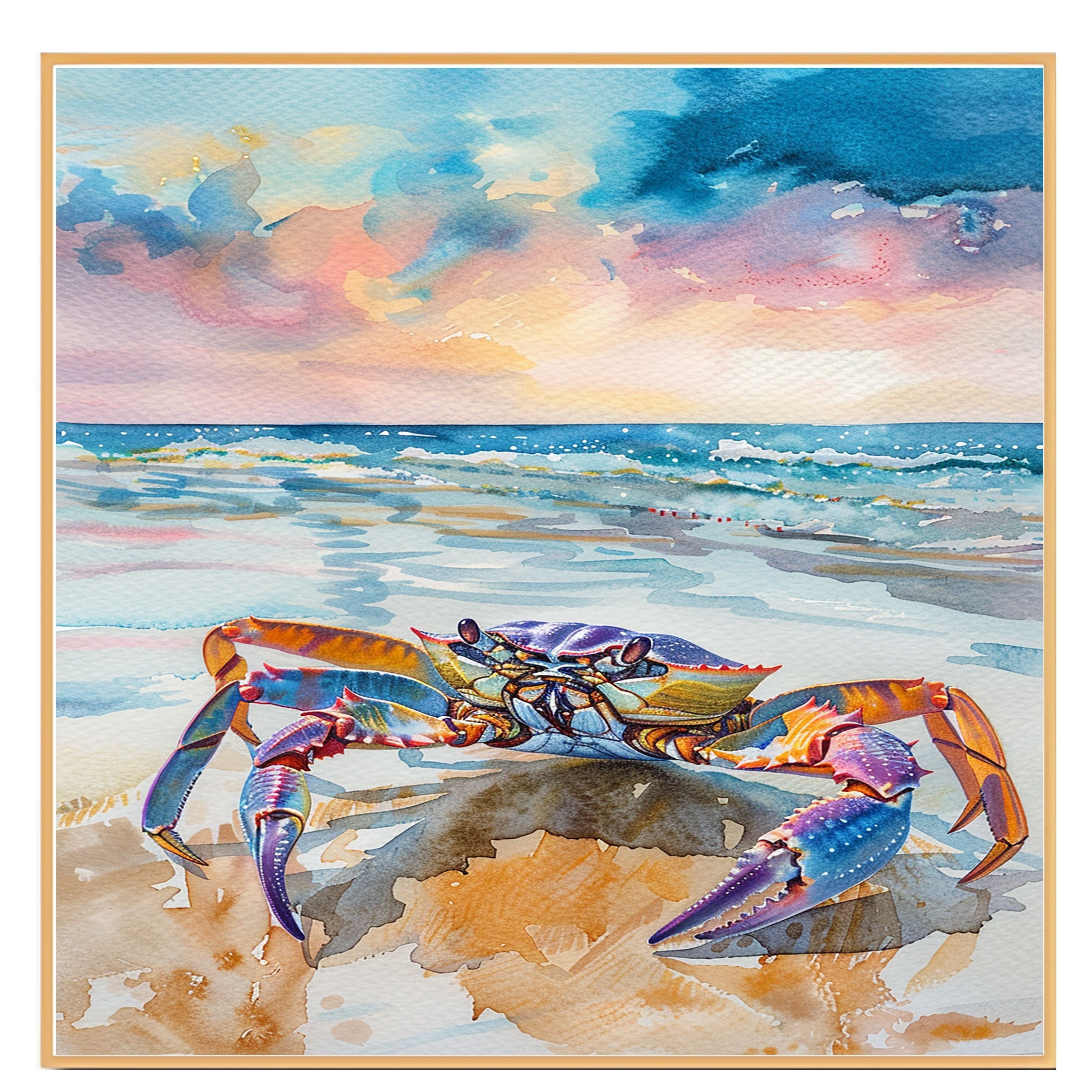 Vibrant Watercolor Crab Painting – Colorful Beach Crab with Sunset Sky and Ocean Waves Coastal Wall Art Print on Ready to Hang 1.5" Thick Canvas Wrap, Floating Framed Canvas, Flat Rolled Canvas