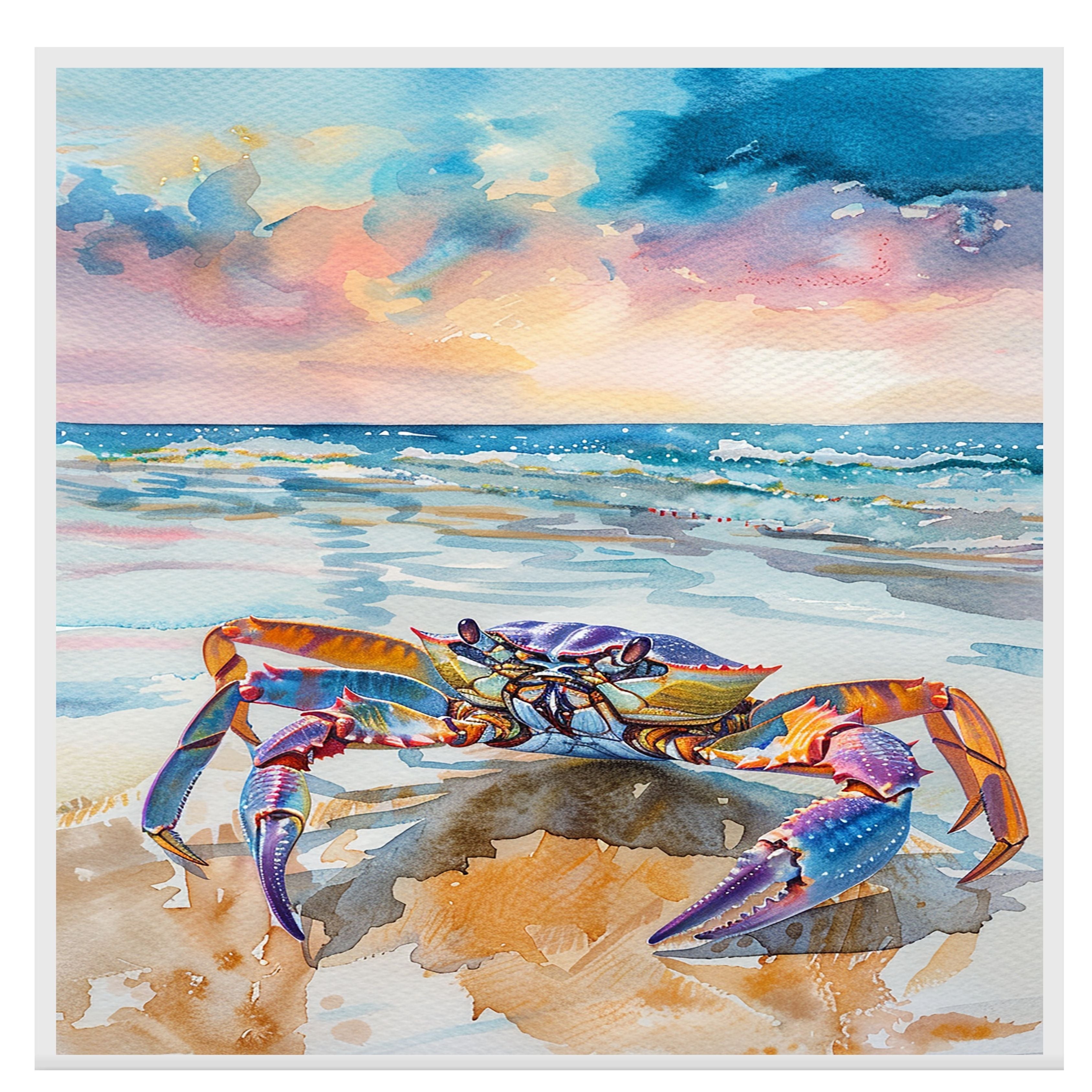 Capture the energy of the ocean with this dynamic watercolor painting of a multicolored crab on a...