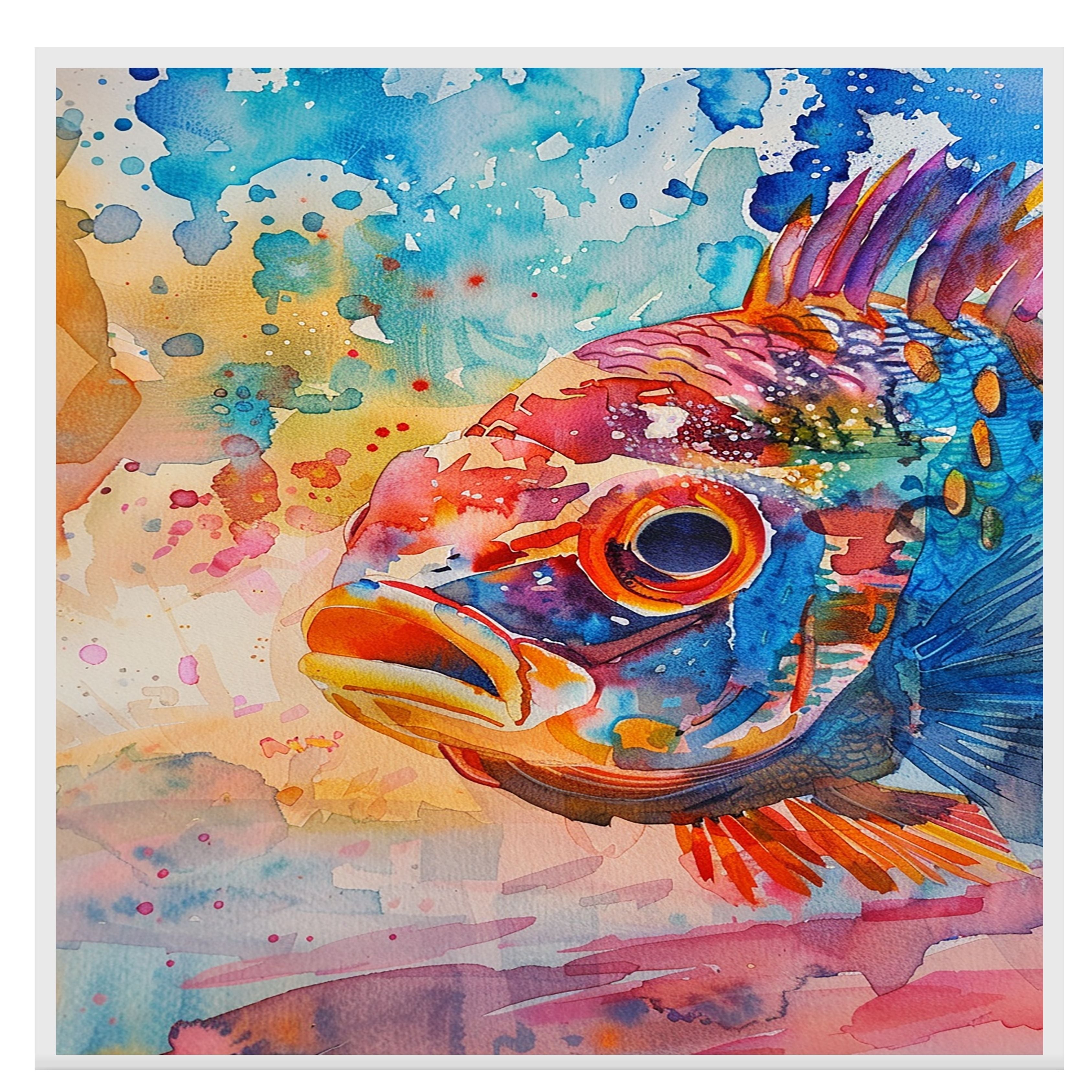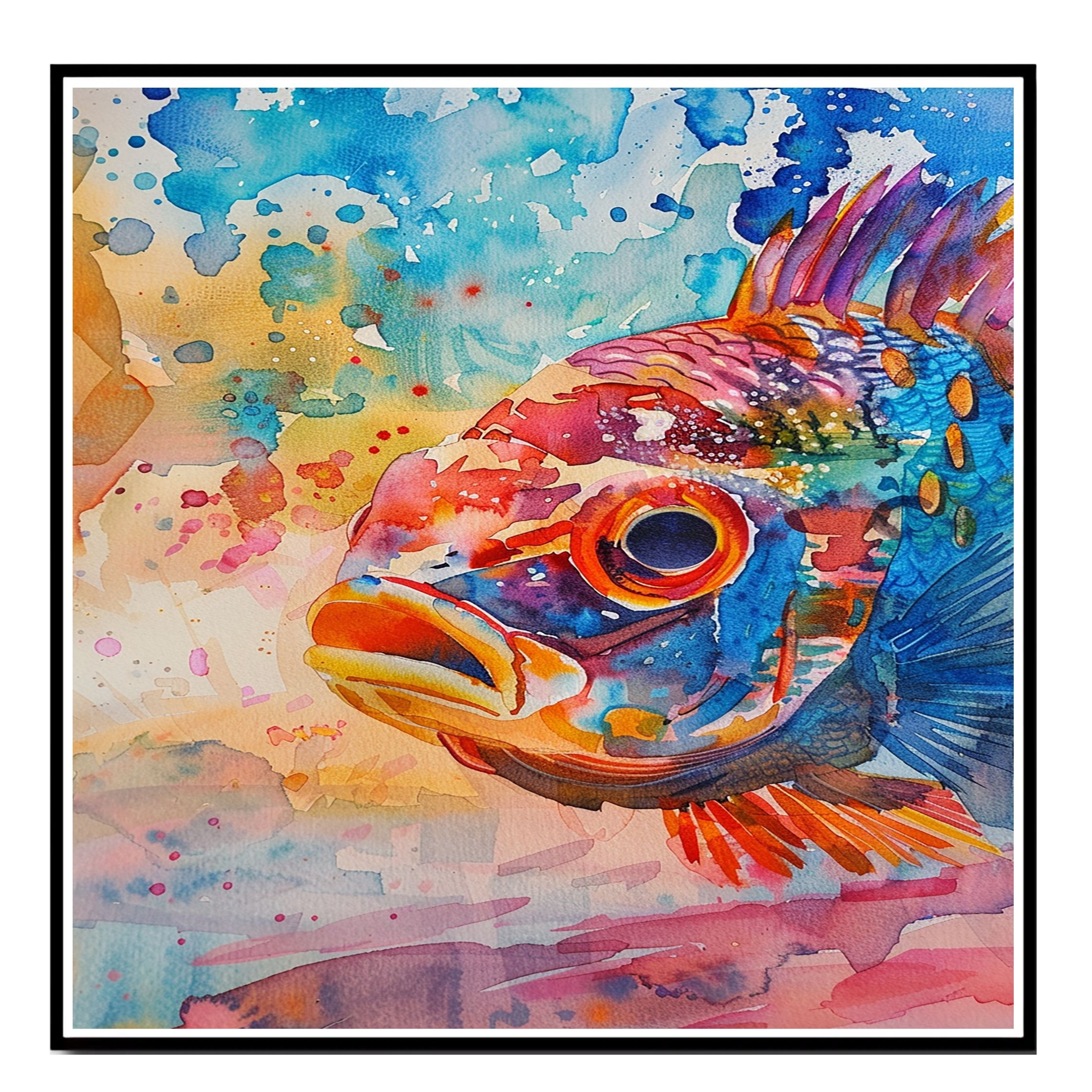 Dive into a burst of underwater color with this captivating watercolor painting of a tropical fish. Featuring bold splashes of orange, blue, and pink, this close-up marine life illustration brings dynamic energy and oceanic charm to any coastal or aquatic-themed space.