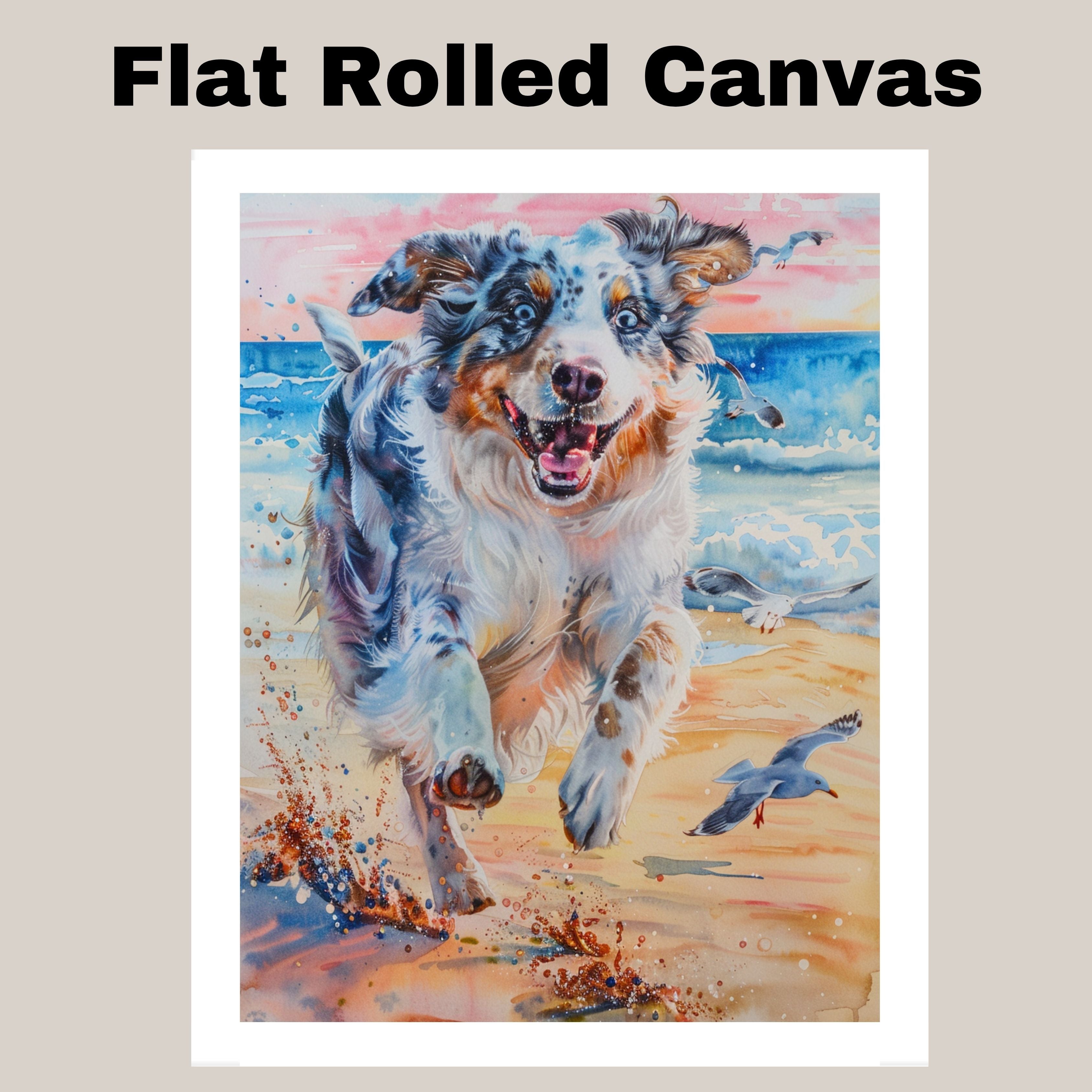 Vibrant Watercolor Painting of Fluffy Dog Running by the Ocean with Splashes and Seagulls in a Colorful Beach Scene on Ready to Hang 1.5" Thick Canvas Wrap, Floating Framed Canvas, Flat Rolled Canvas