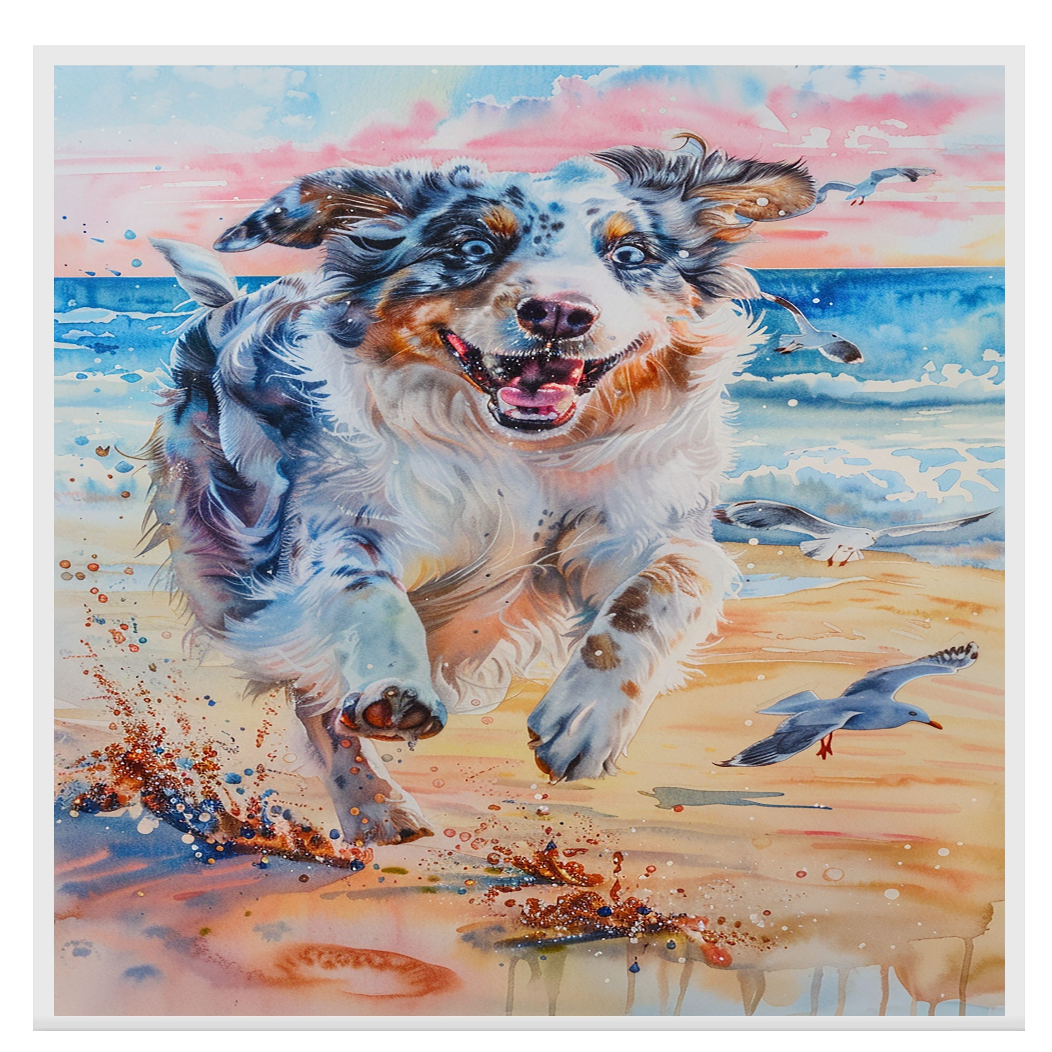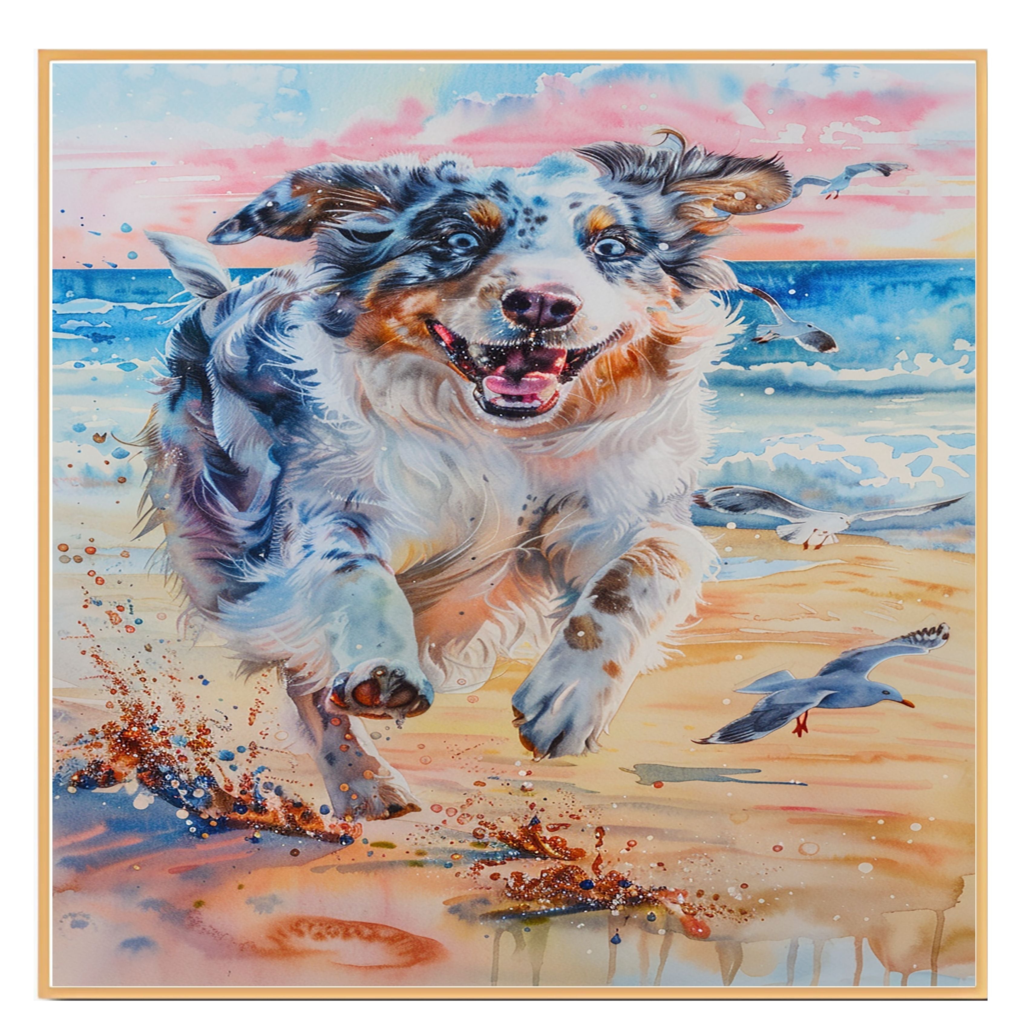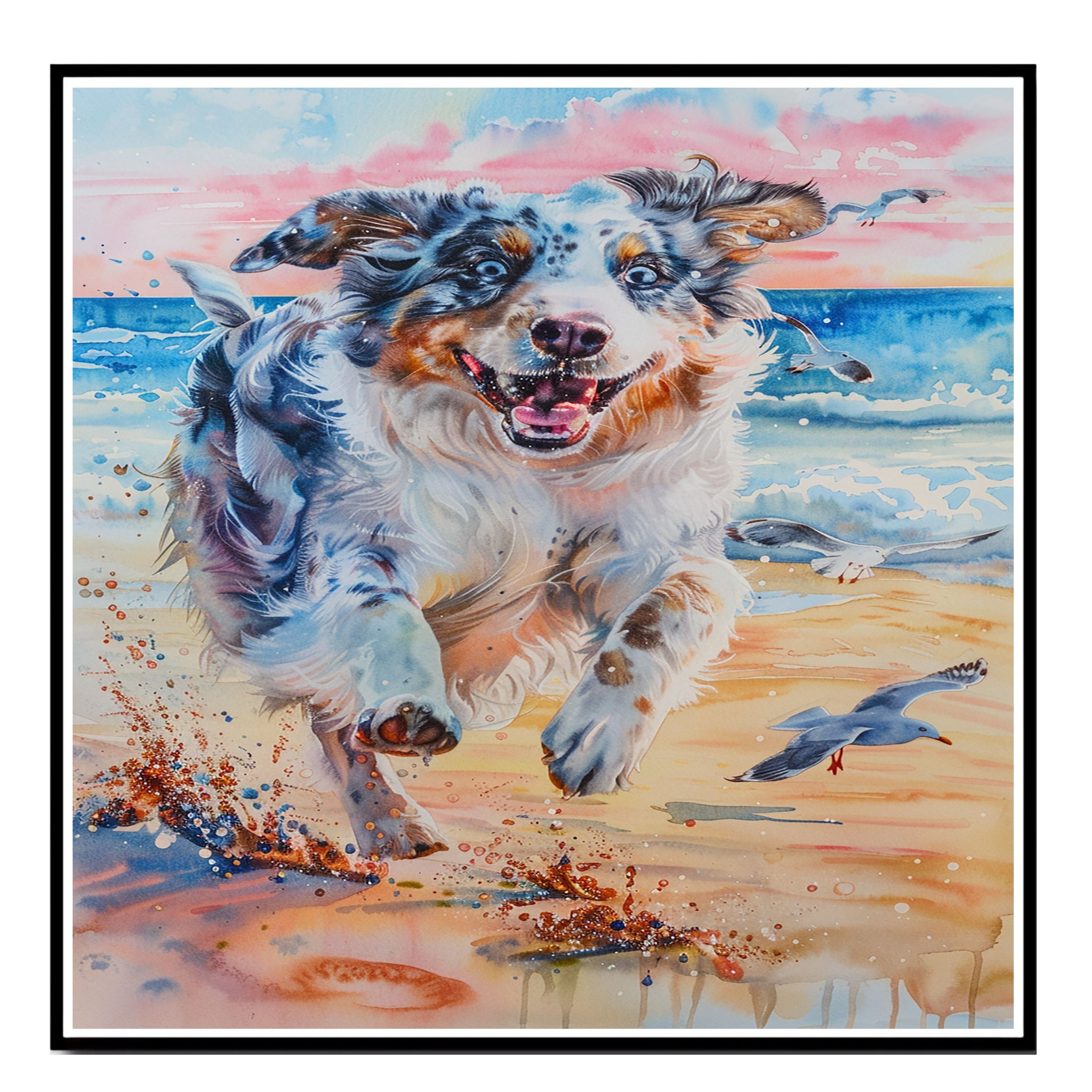 Capture the joy and freedom of a carefree beach day with this stunning watercolor painting. Featuring a fluffy, multicolored dog dashing along the shoreline with water splashing beneath its paws and seagulls soaring above, this artwork is full of life and color. A perfect addition for dog lovers and coastal decor fans alike, it brings motion, emotion, and vibrant energy into any space.