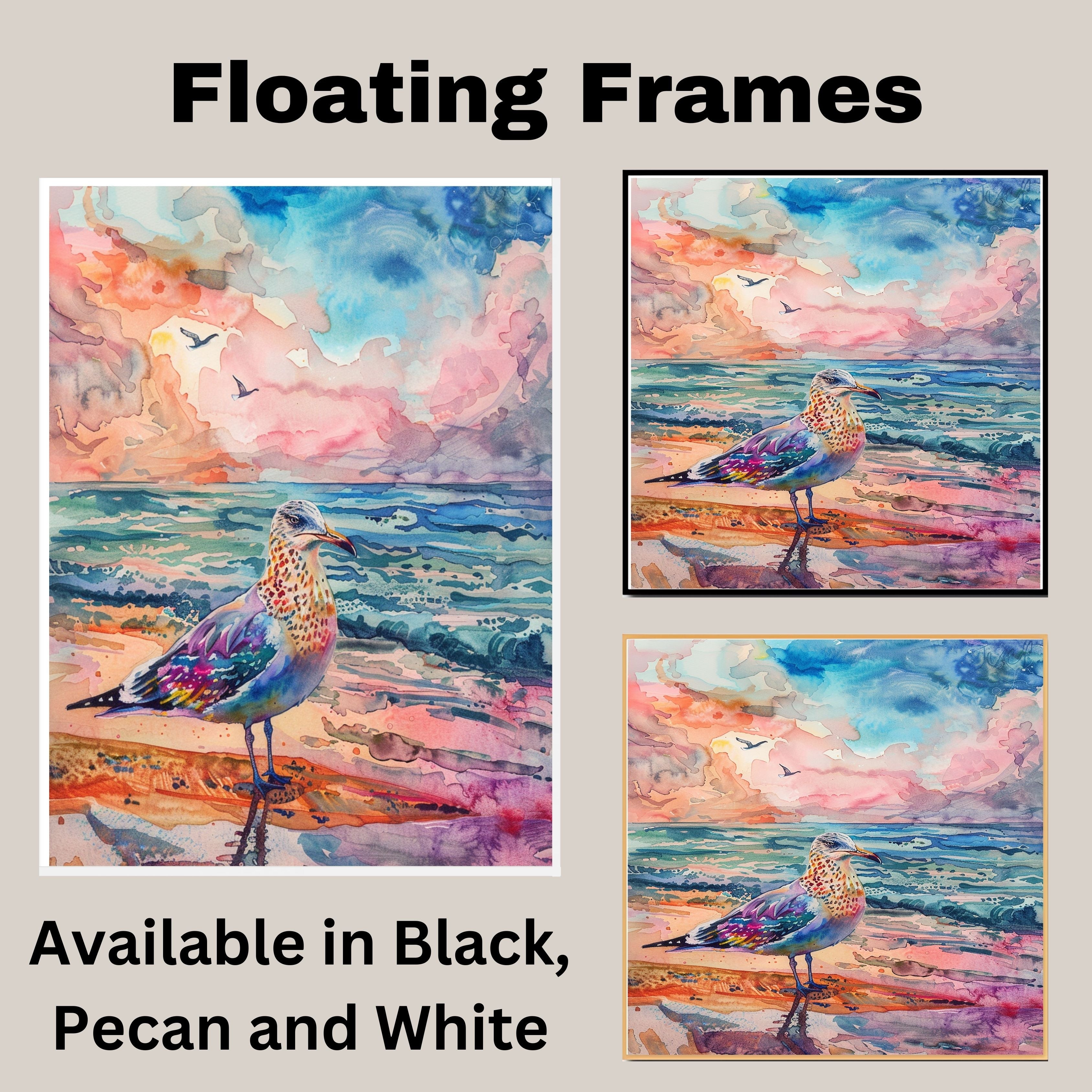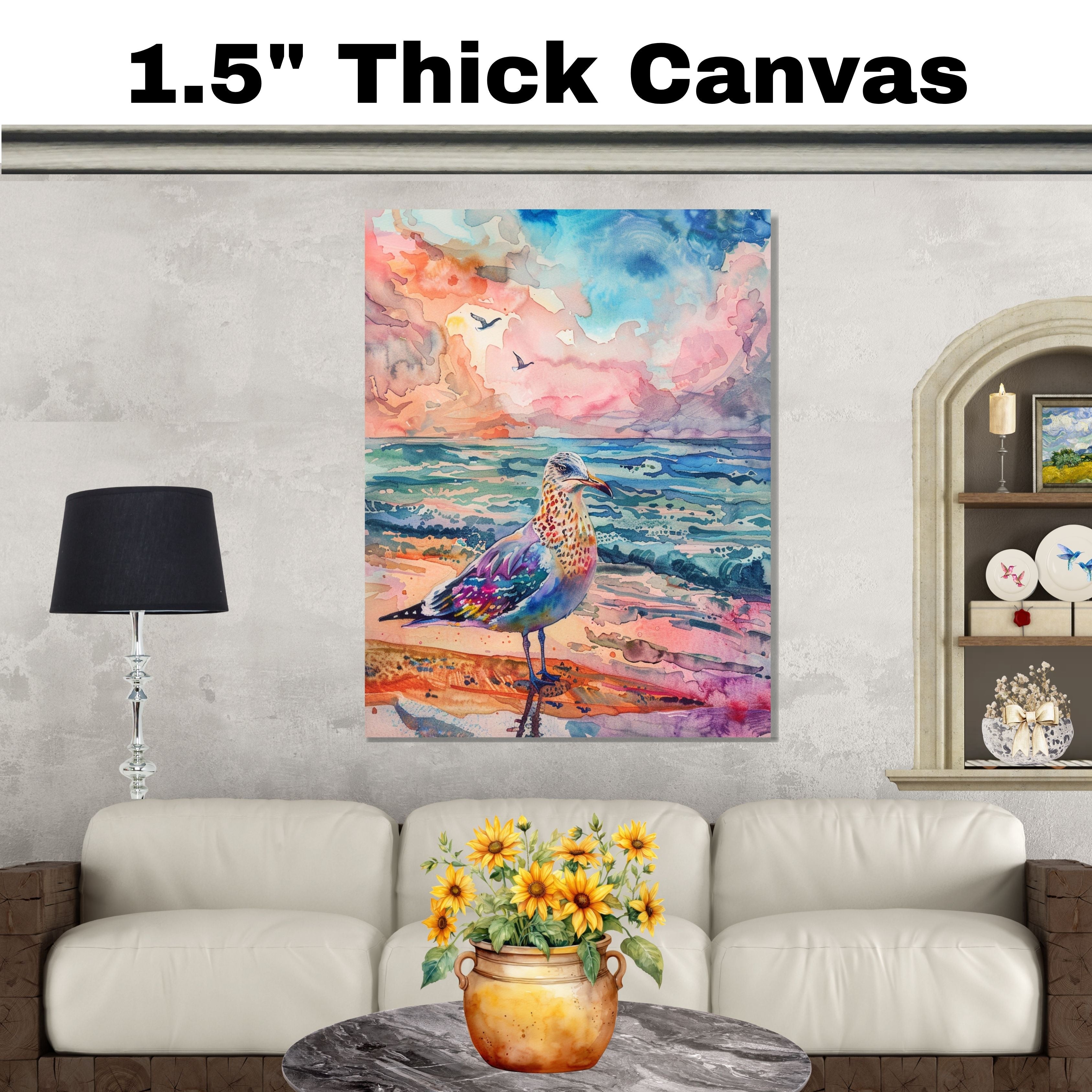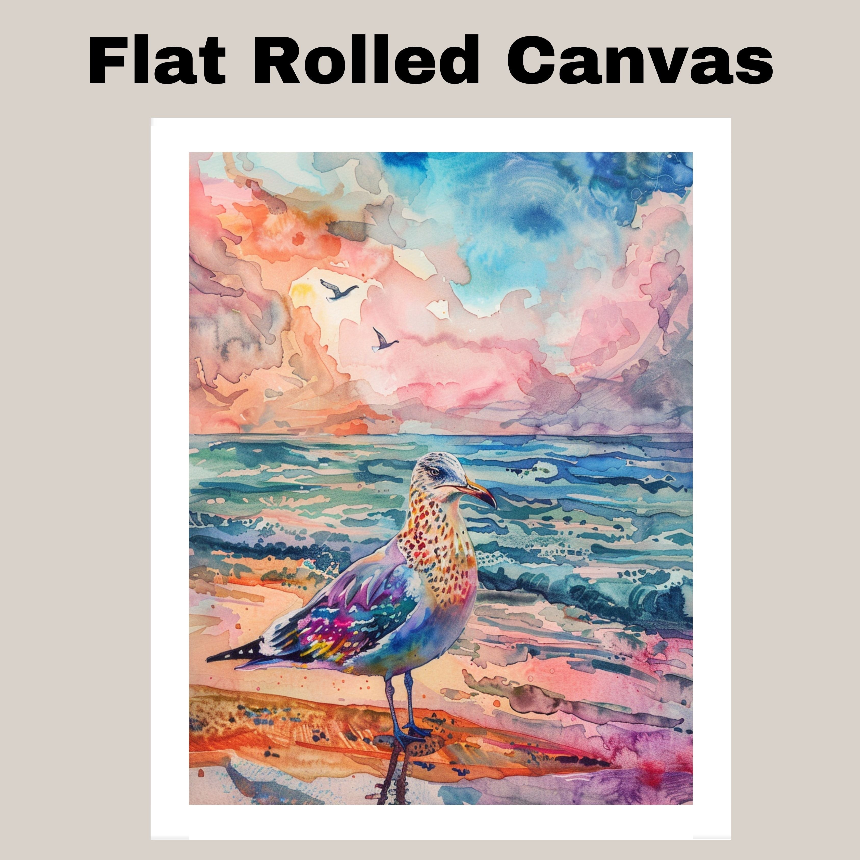 Vibrant Watercolor Seagull by Ocean with Colorful Sky and Waves in a Lively Coastal Beach Scene on Ready to Hang 1.5" Thick Canvas Wrap, Floating Framed Canvas, Flat Rolled Canvas