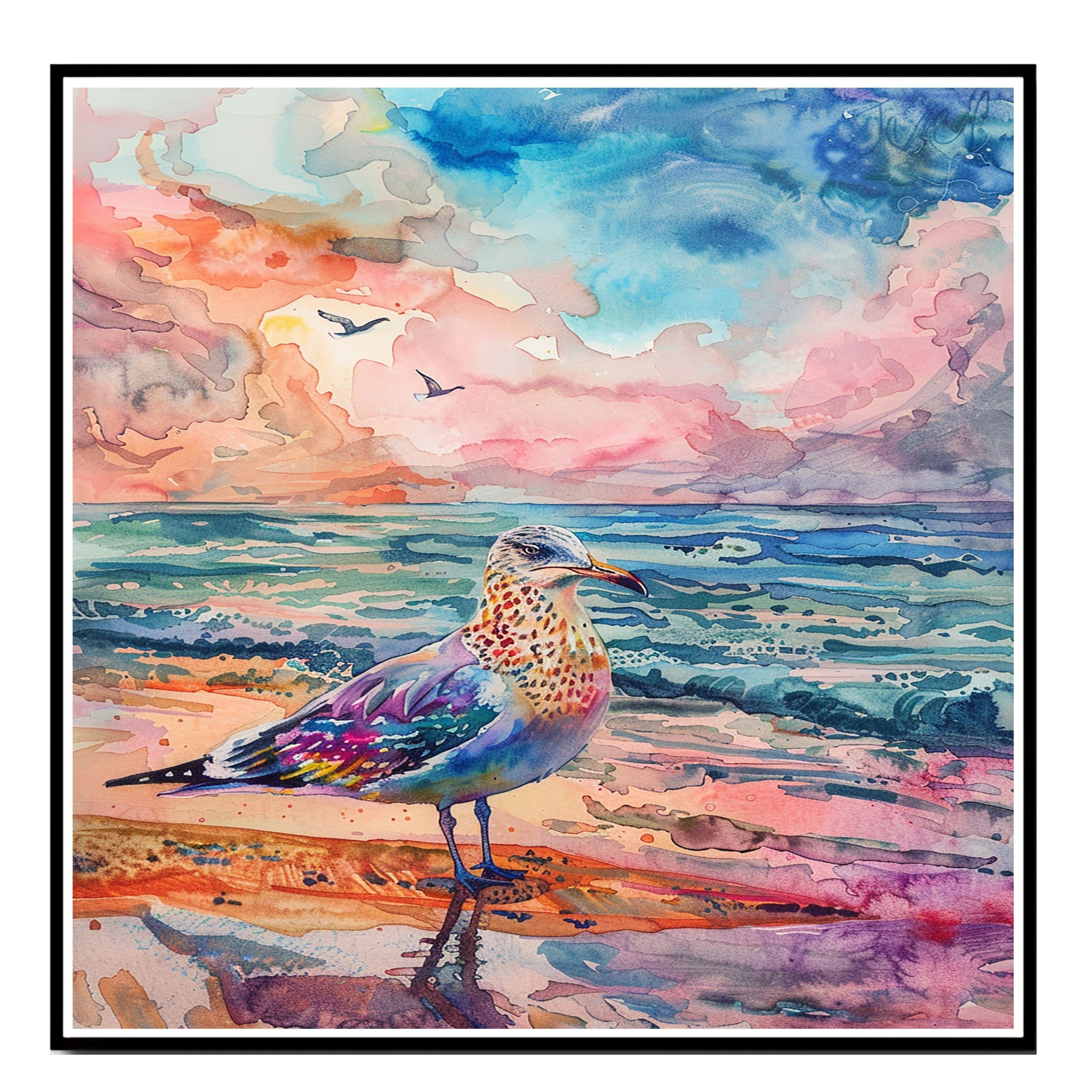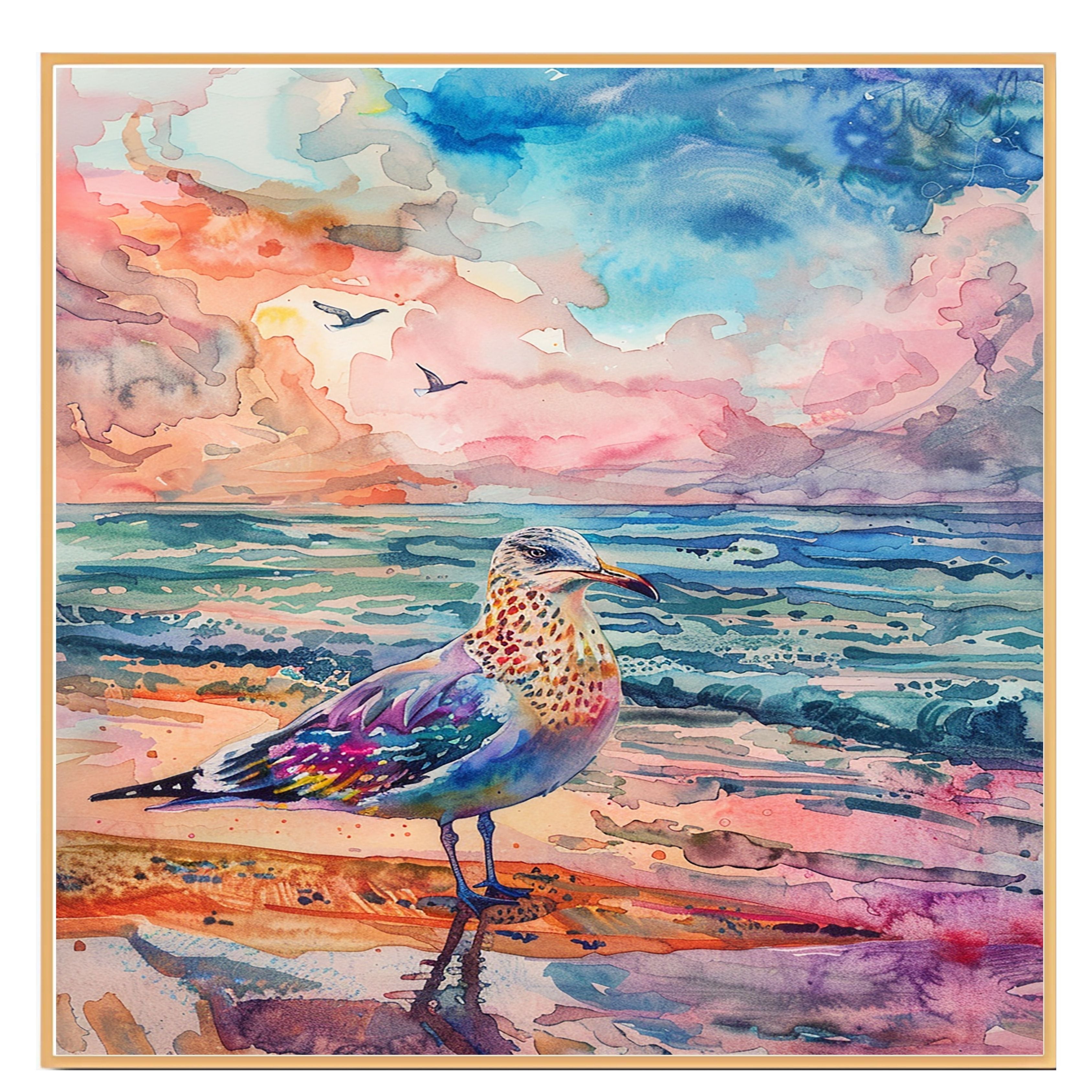 This vibrant watercolor artwork features a multicolored seagull standing proudly on the shore with dramatic skies and vivid ocean waves. A lively, coastal masterpiece that captures the beauty of nature in bold and expressive tones—ideal for ocean and bird lovers alike.