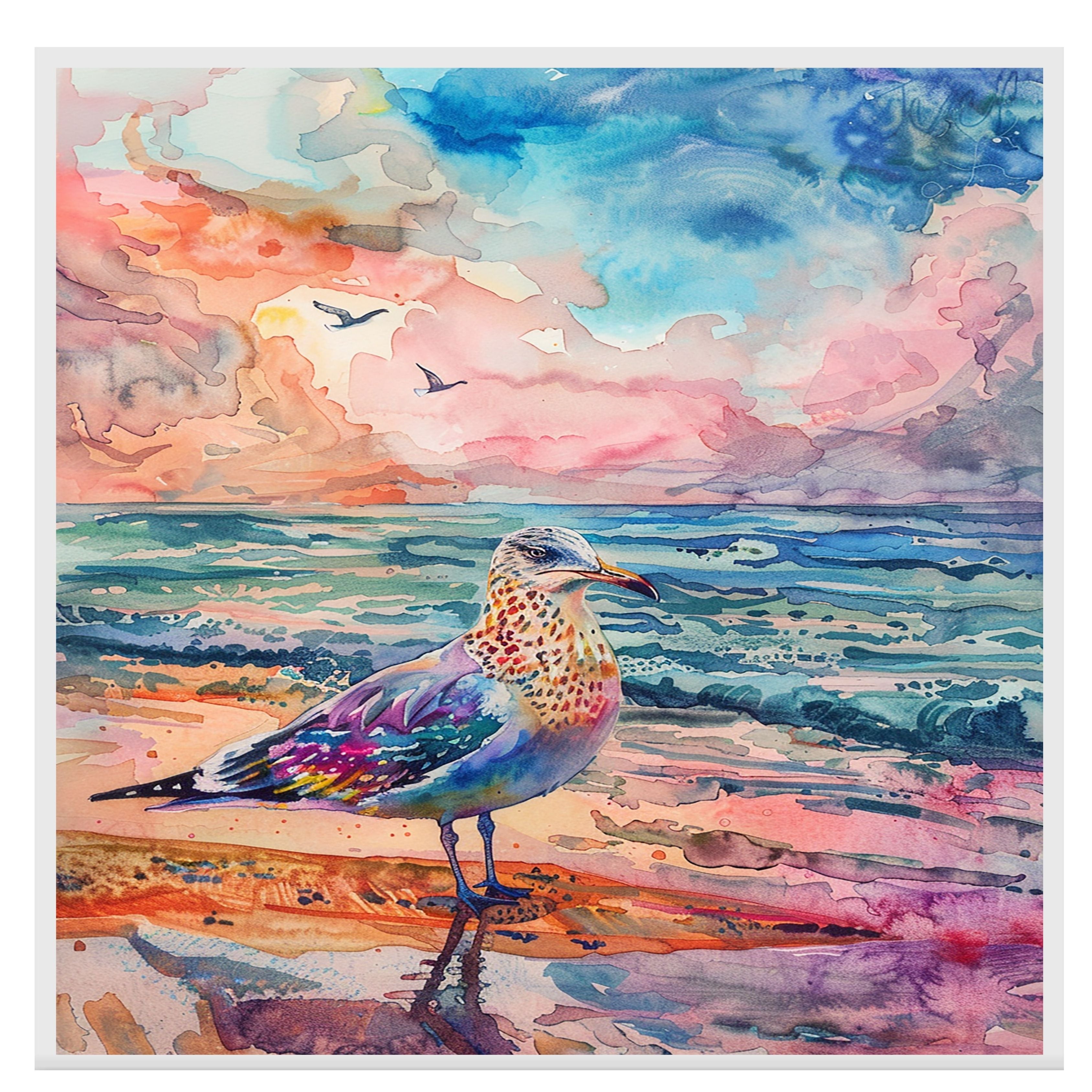 This vibrant watercolor artwork features a multicolored seagull standing proudly on the shore with dramatic skies and...