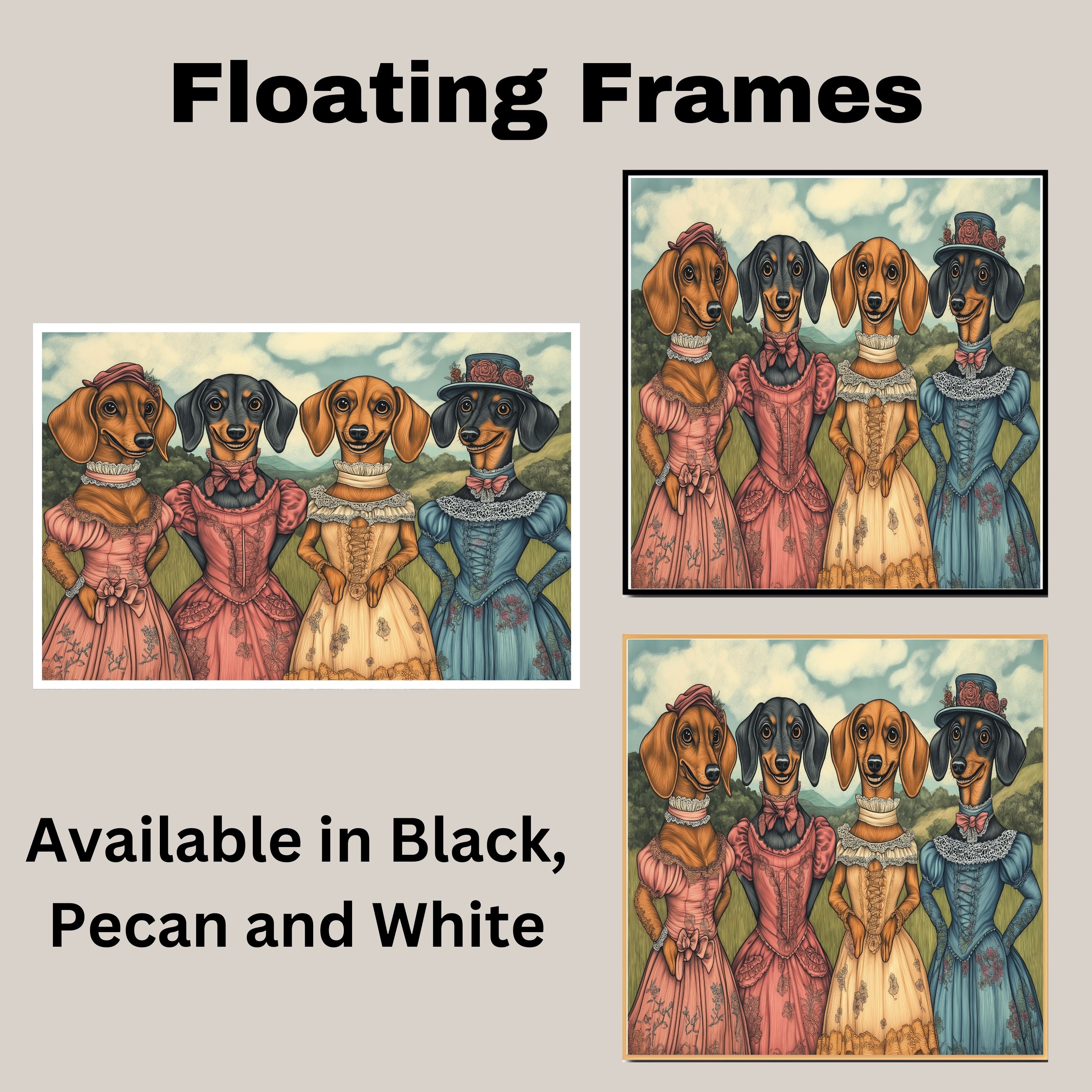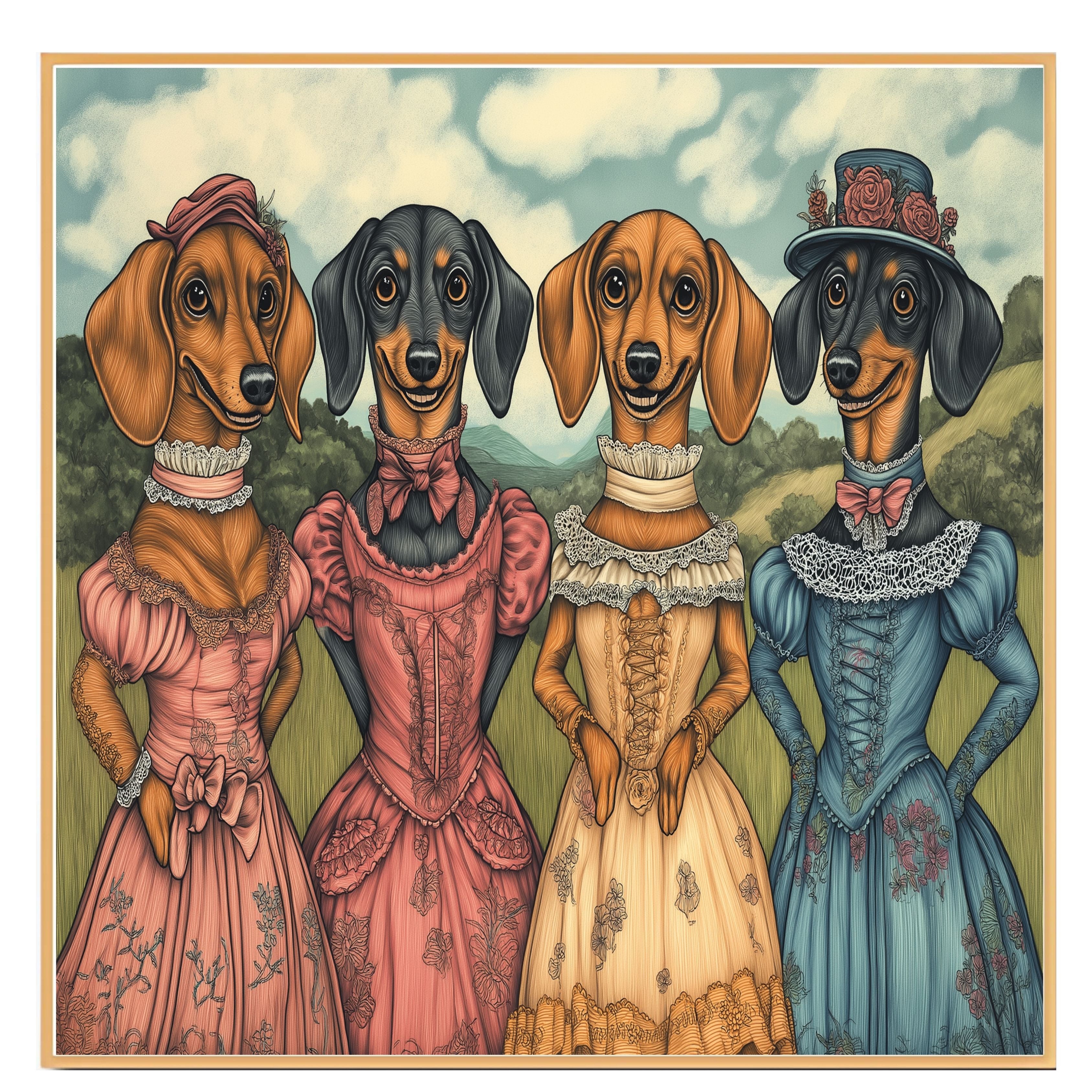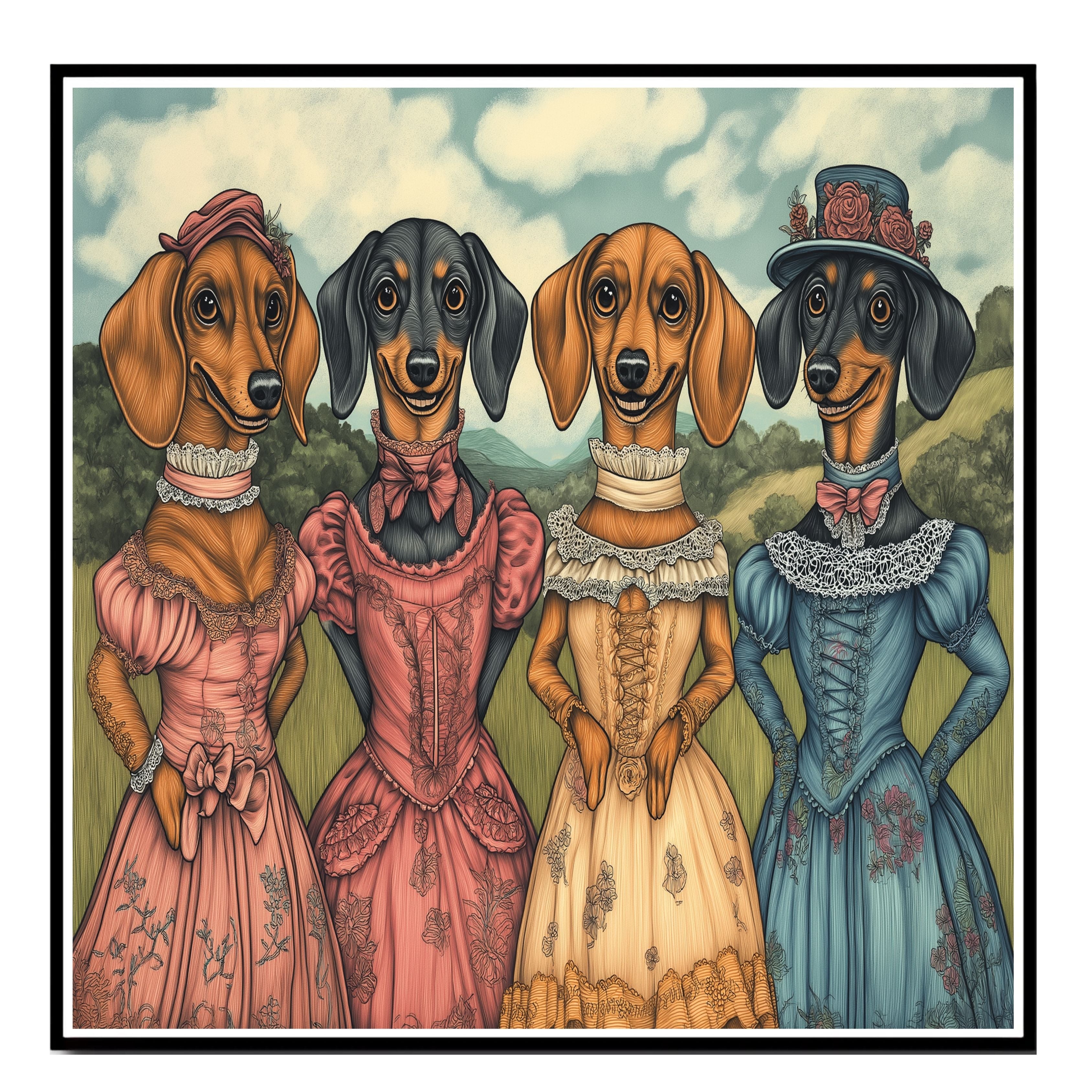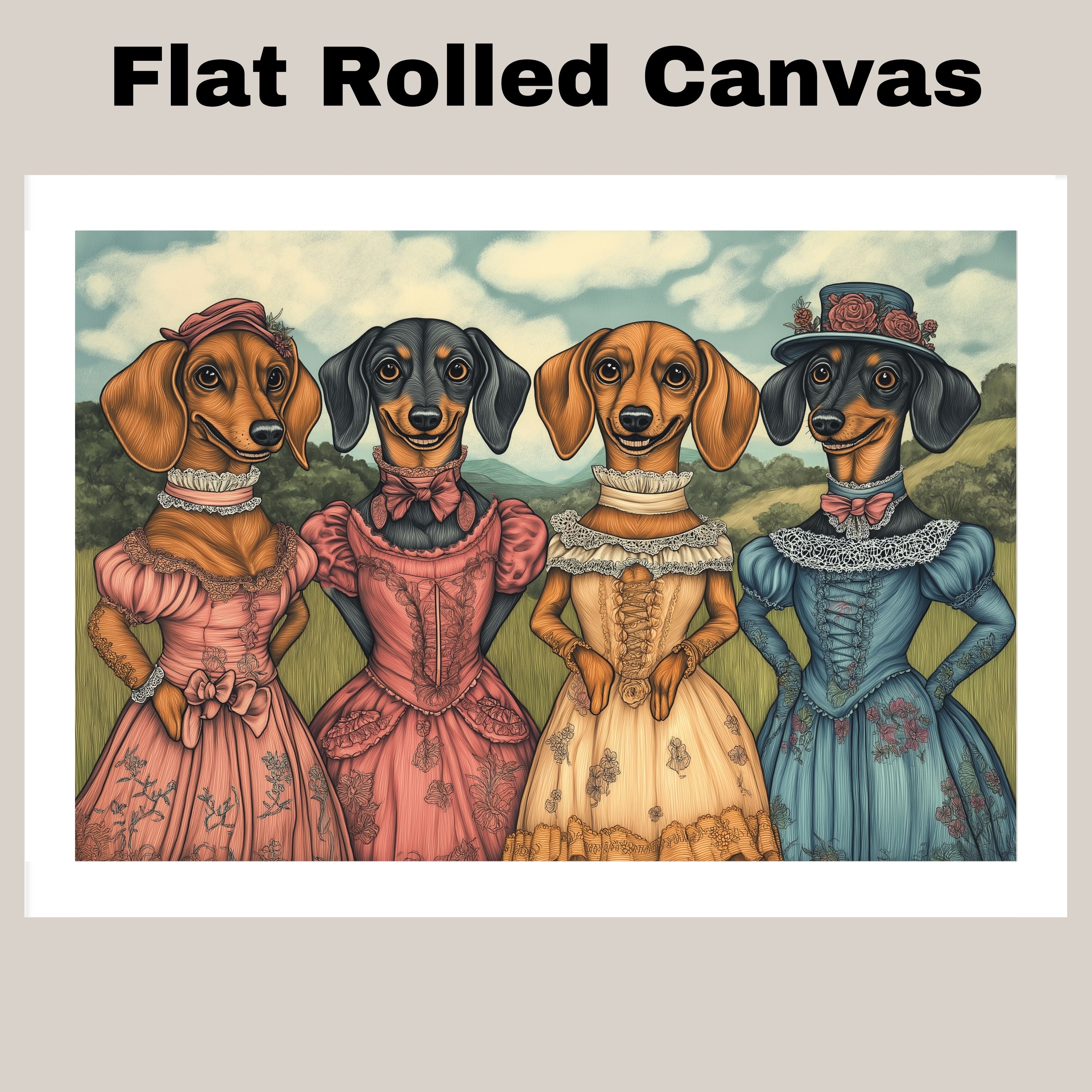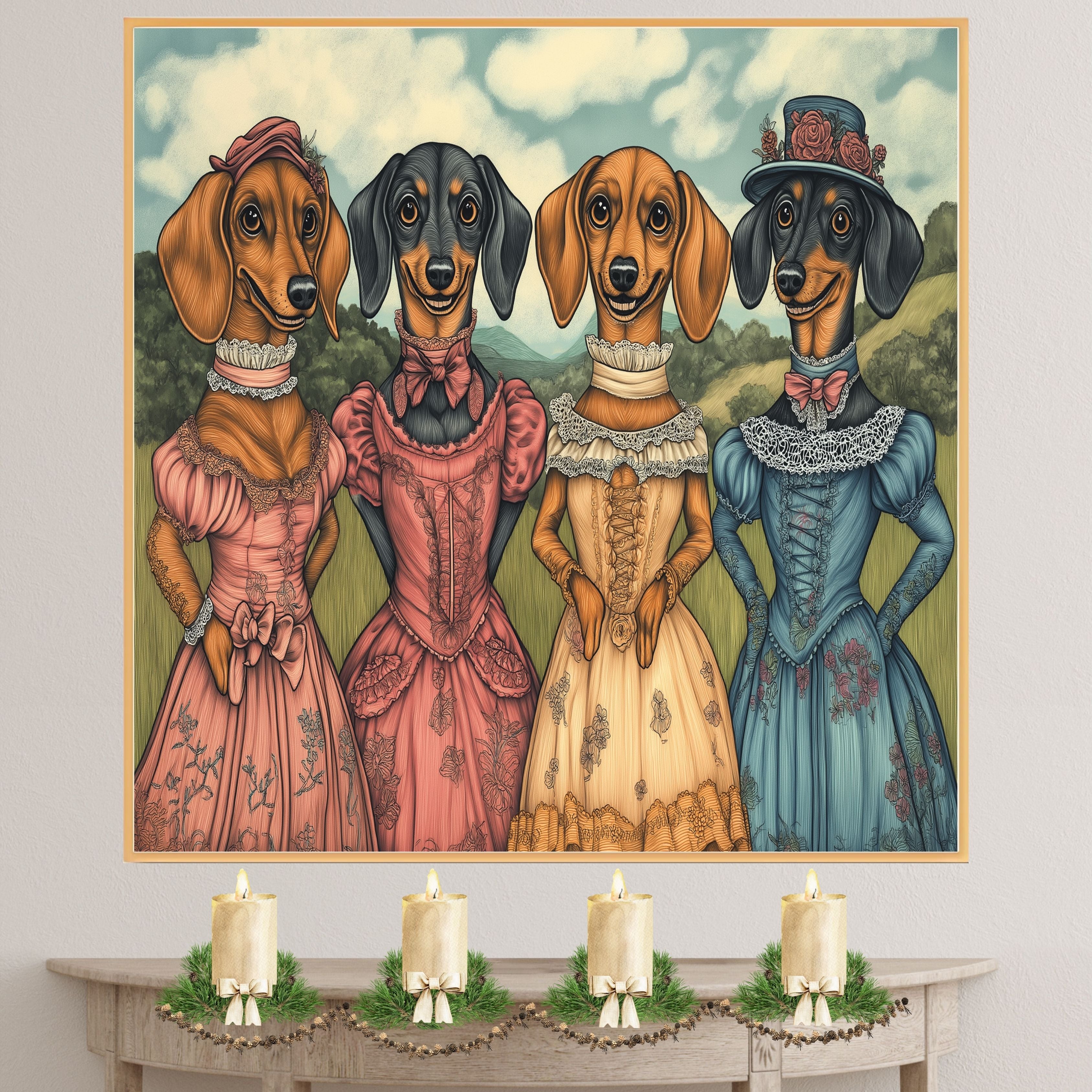 Victorian Dachshund Art Print with Four Sausage Dogs in Elegant Dresses A Whimsical Hand Drawn Dog Illustration Perfect for Unique Home or Gift Decor on Ready to Hang 1.5" Thick Canvas Wrap, Floating Framed Canvas, Flat Rolled Canvas