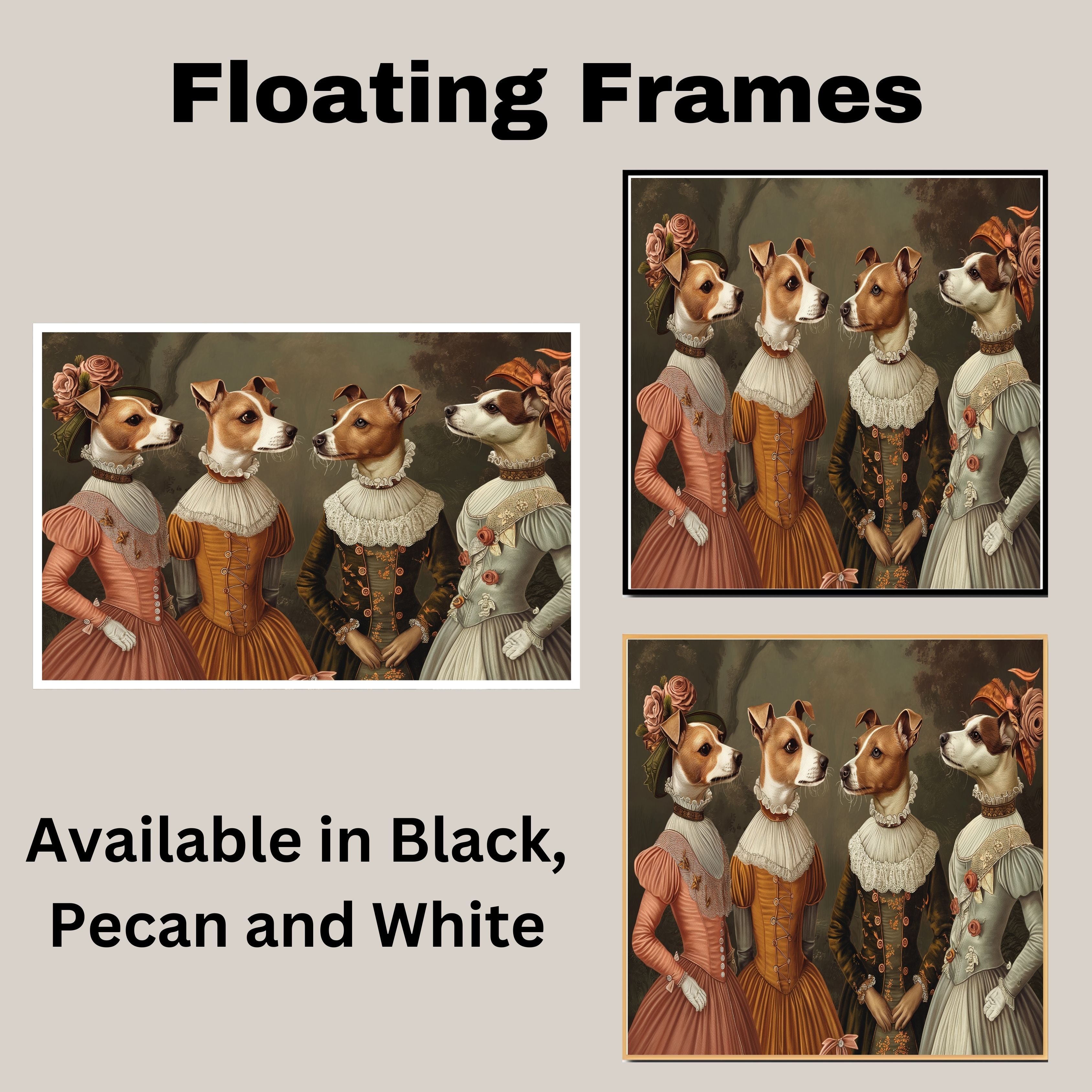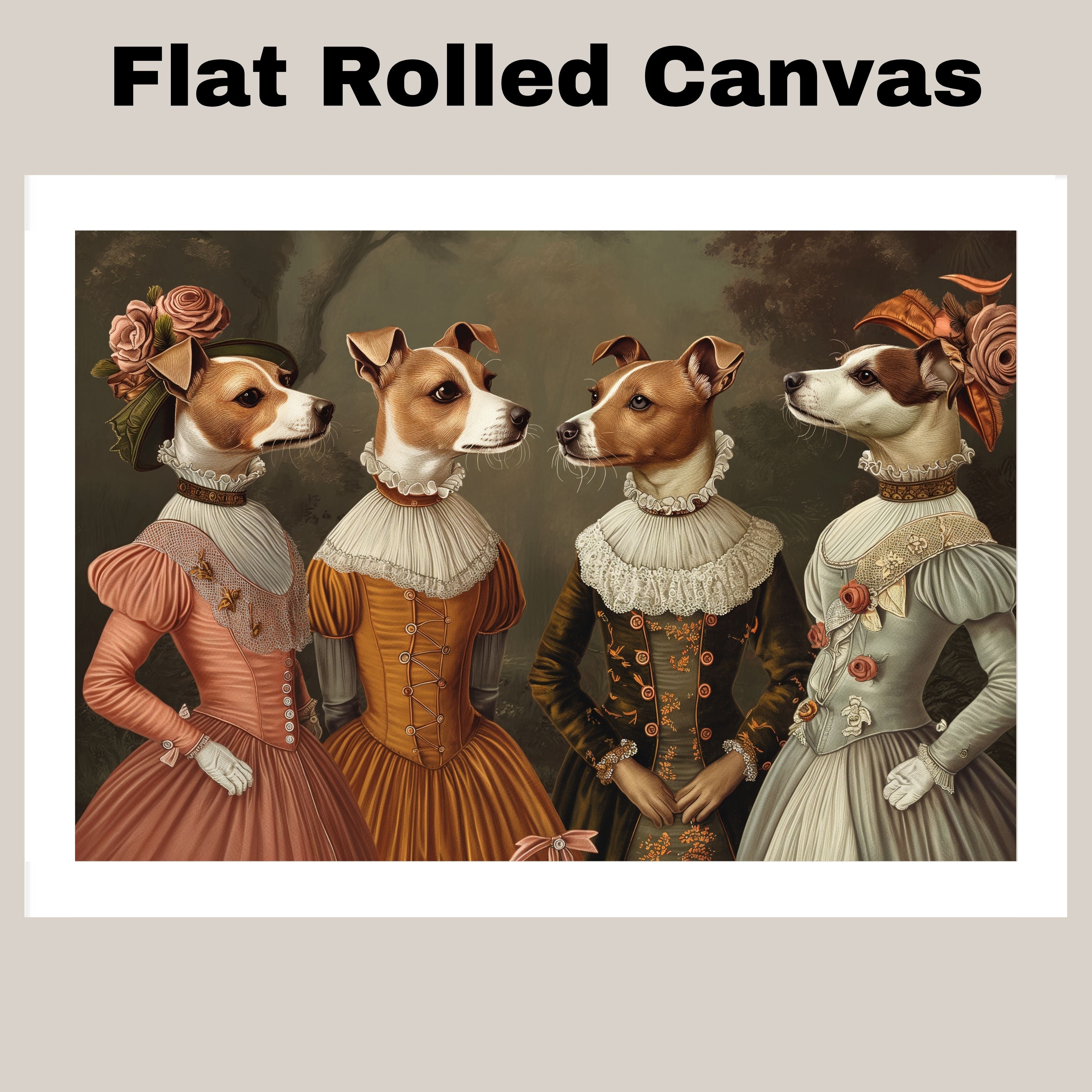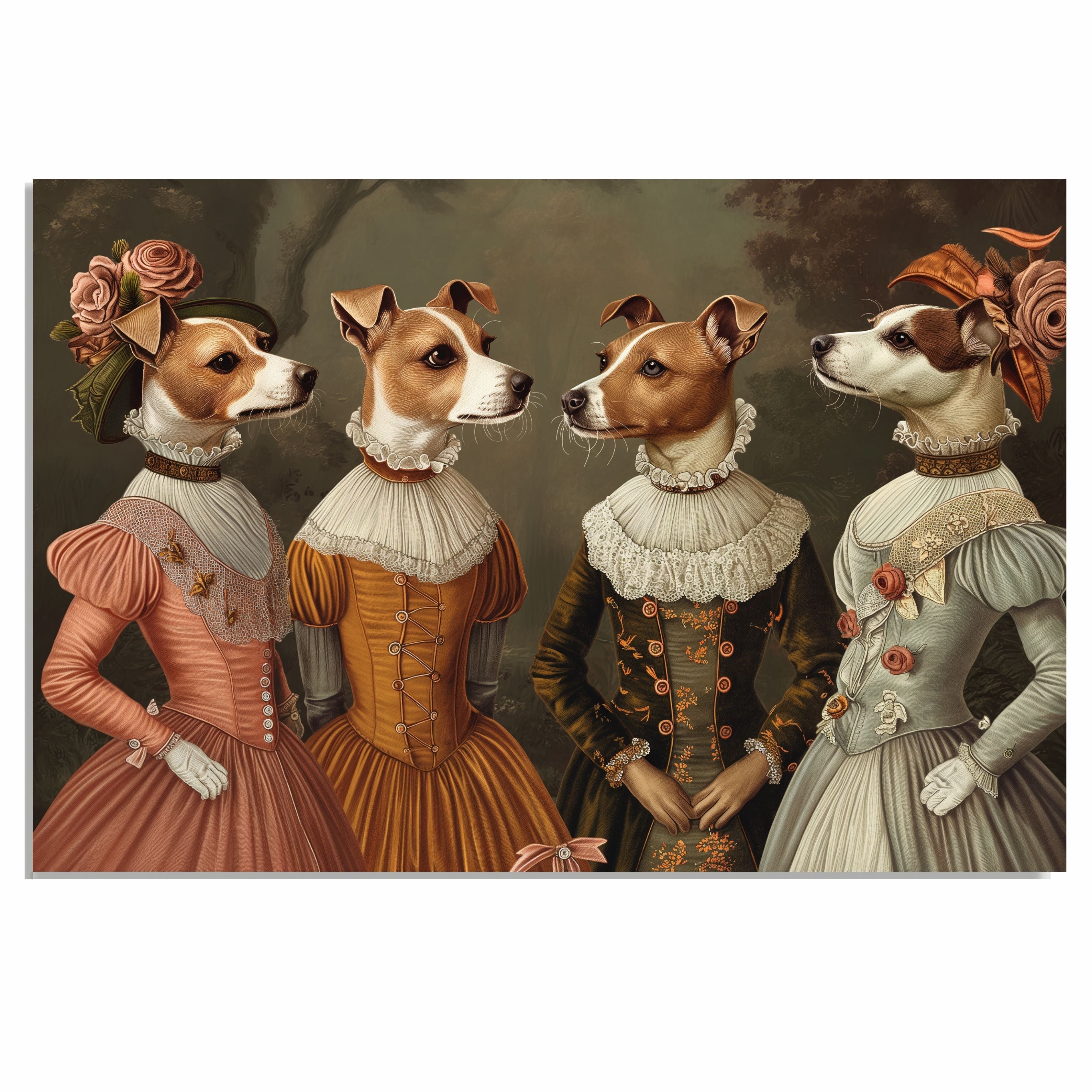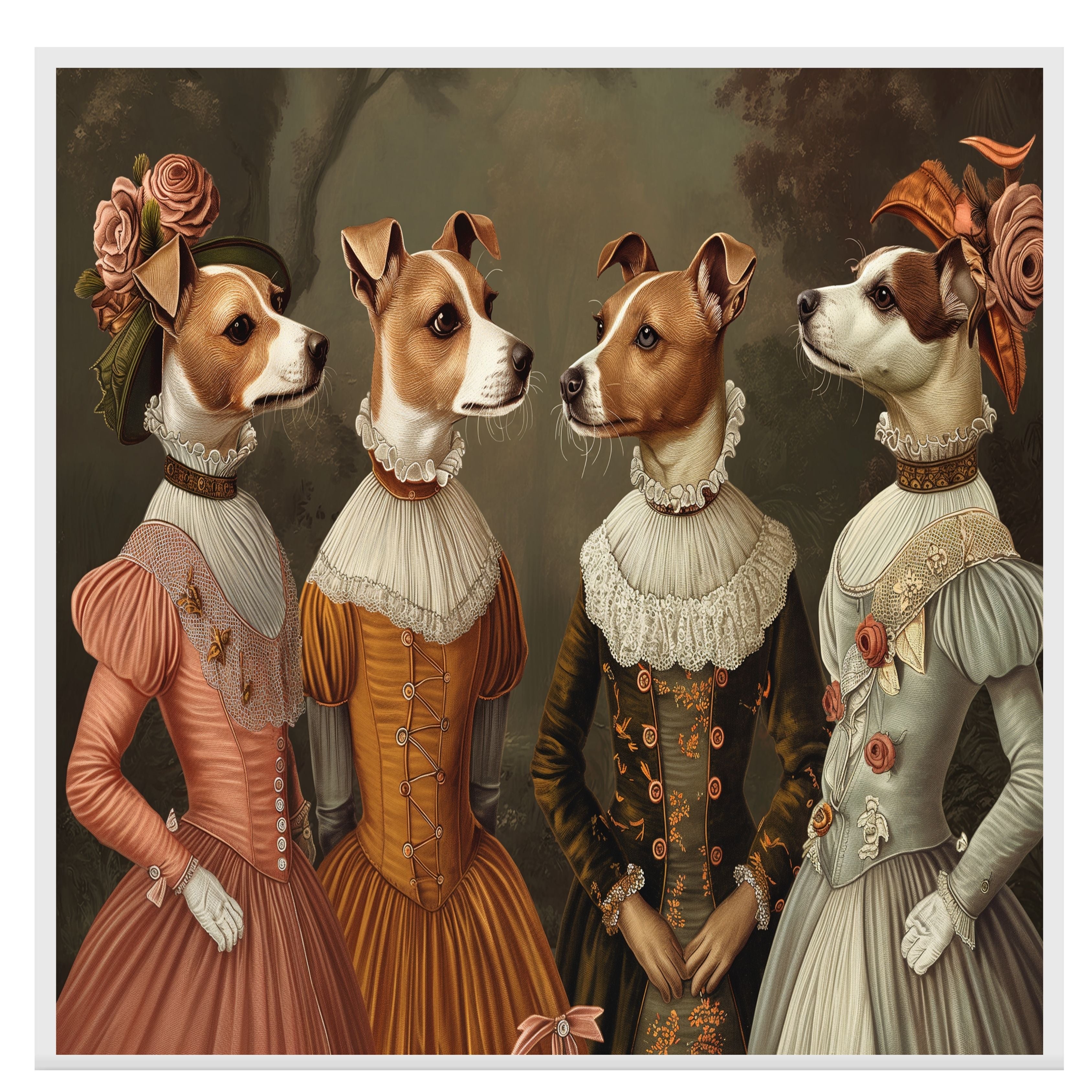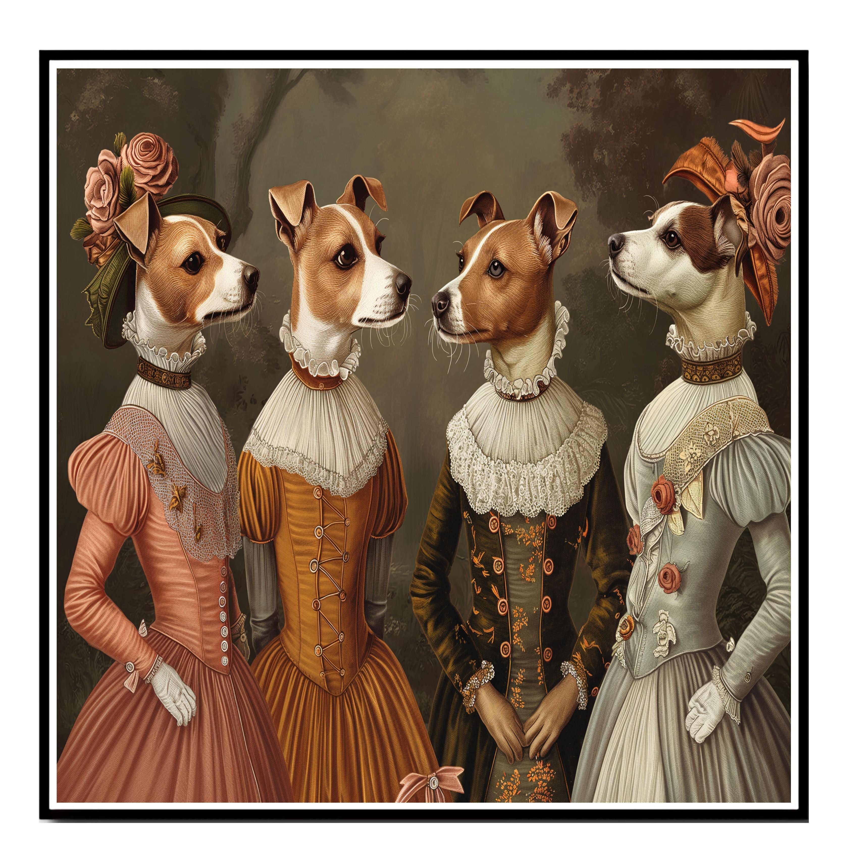 Add a royal touch to your décor with this beautifully illustrated Victorian dog art print. Featuring four refined Jack Russell dogs dressed in elegant historical gowns, this detailed artwork is both charming and humorous. A perfect blend of sophistication and whimsy, it’s great for eclectic galleries, pet lovers’ spaces, or vintage-themed rooms. Makes a memorable gift for dog moms, art lovers, or anyone who enjoys unique animal wall art.