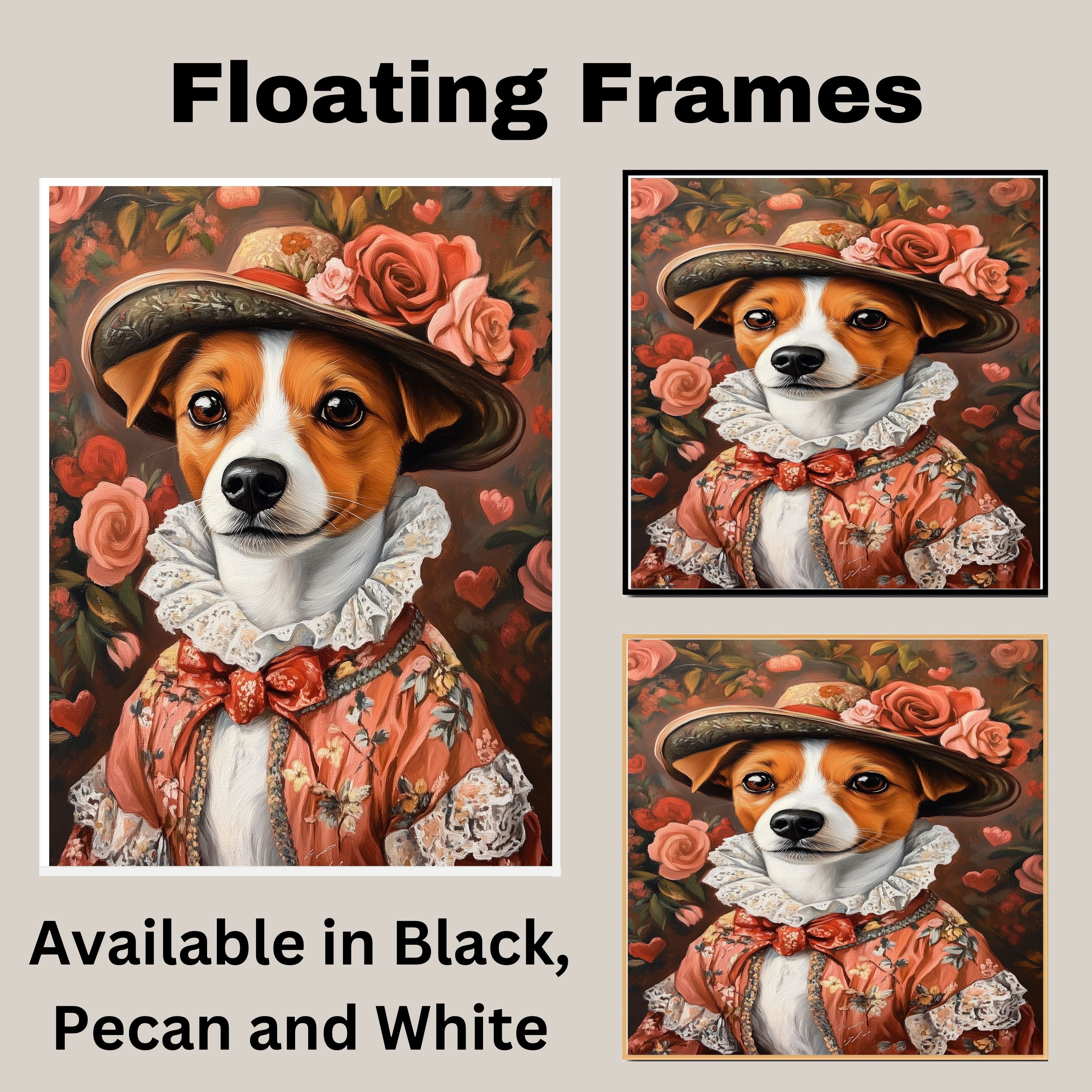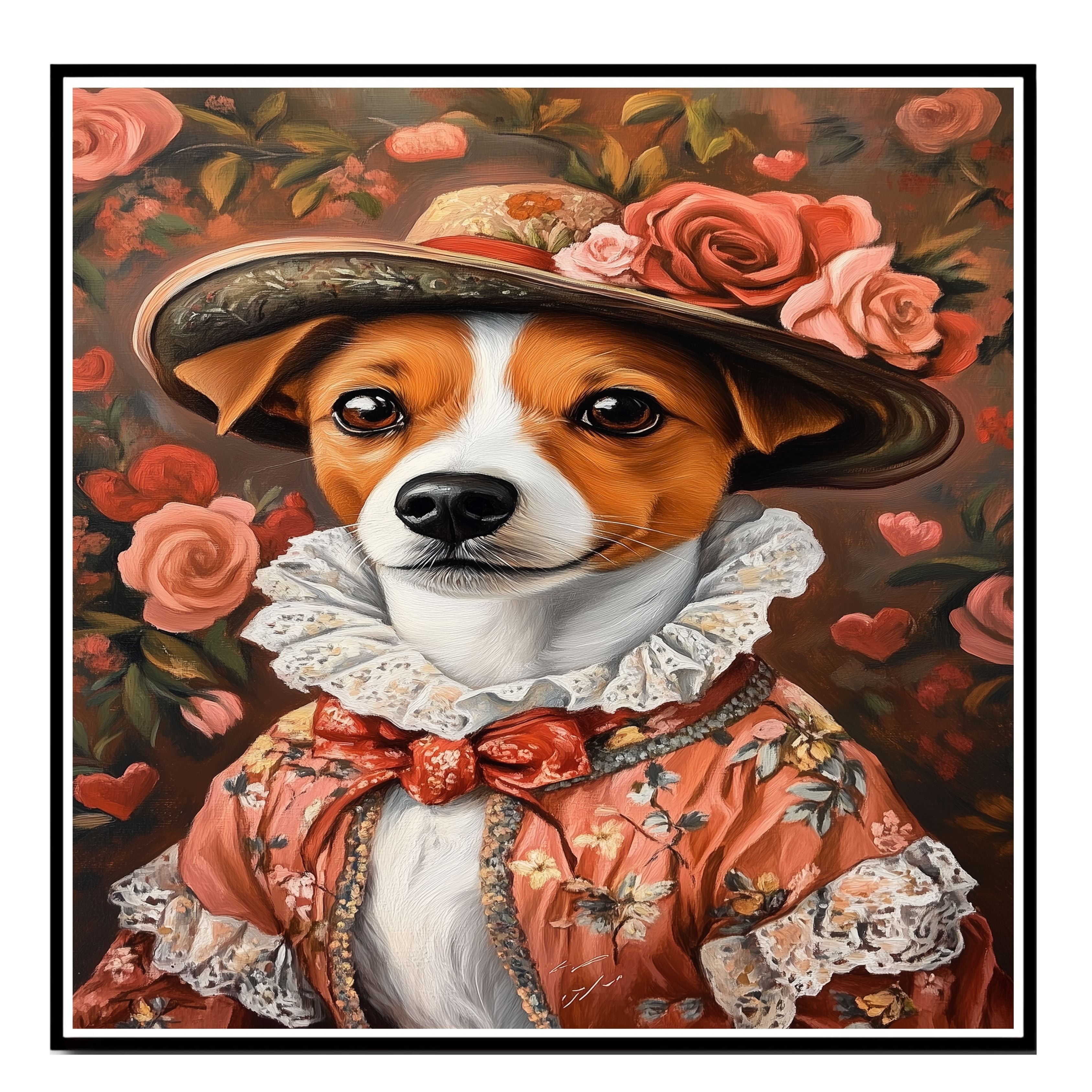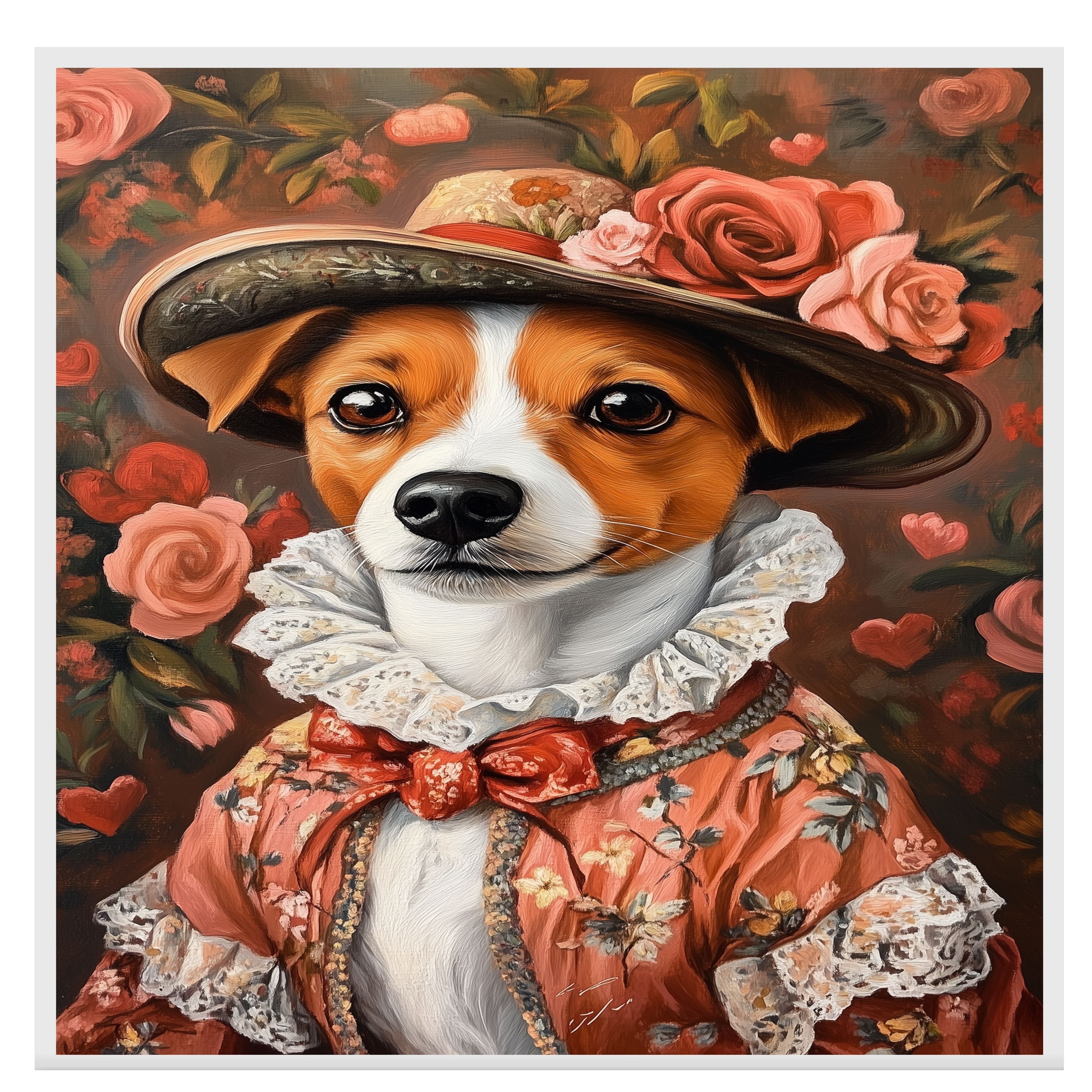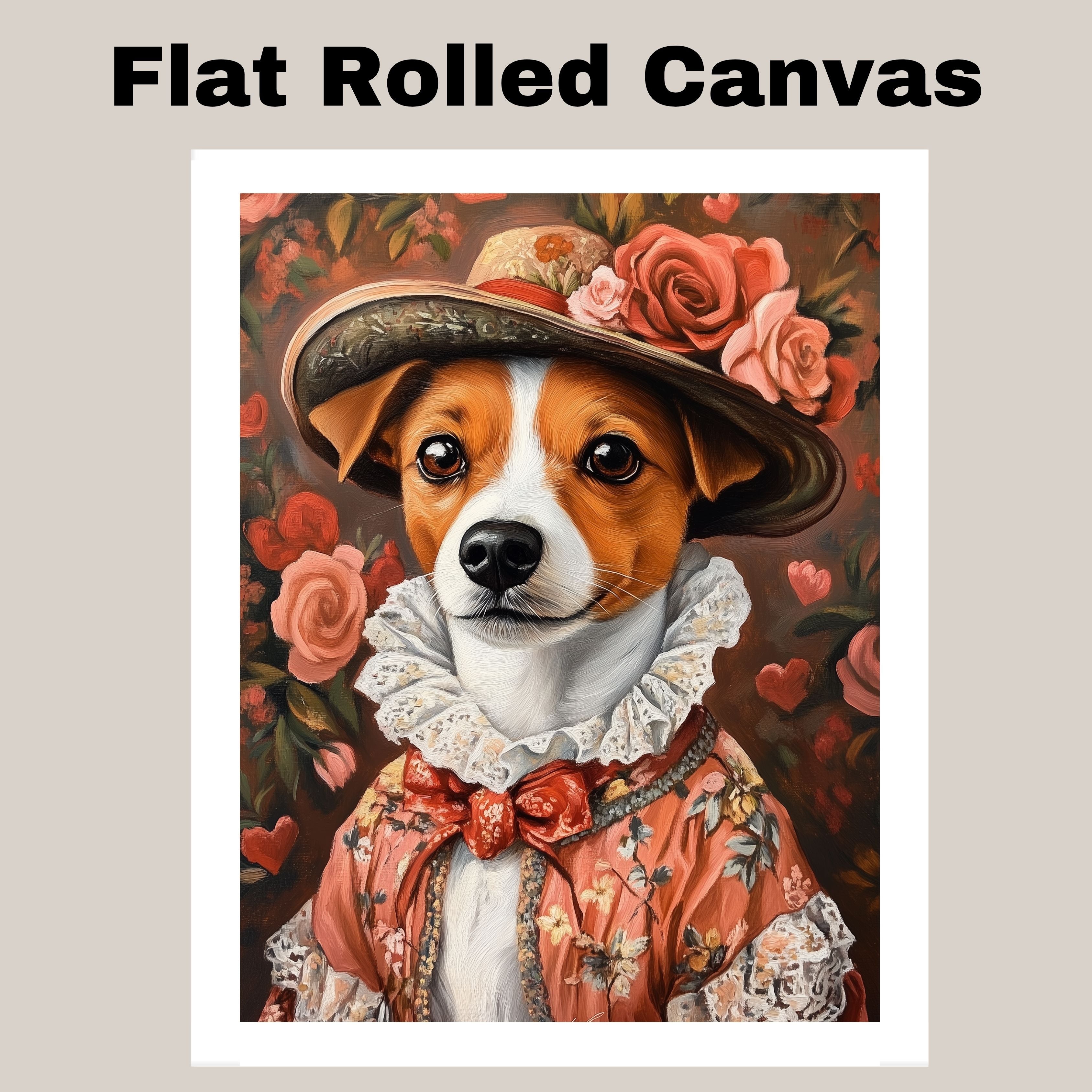 Our "Victorian Grace" Canvas features a charming Jack Russell Terrier adorned in a beautifully detailed European dress and hat, embellished with delicate floral patterns. This whimsical artwork captures the breeds lively spirit while embracing the refined elegance of the Victorian era. With intricate textures and soft, timeless hues, this piece brings warmth, sophistication, and a touch of playfulness to any space. Available on a 1.5" thick canvas wrap, floating framed canvas, or flat rolled canvas, its a perfect gift for Jack Russell lovers and those who appreciate vintage-inspired artistry with a heartfelt touch.